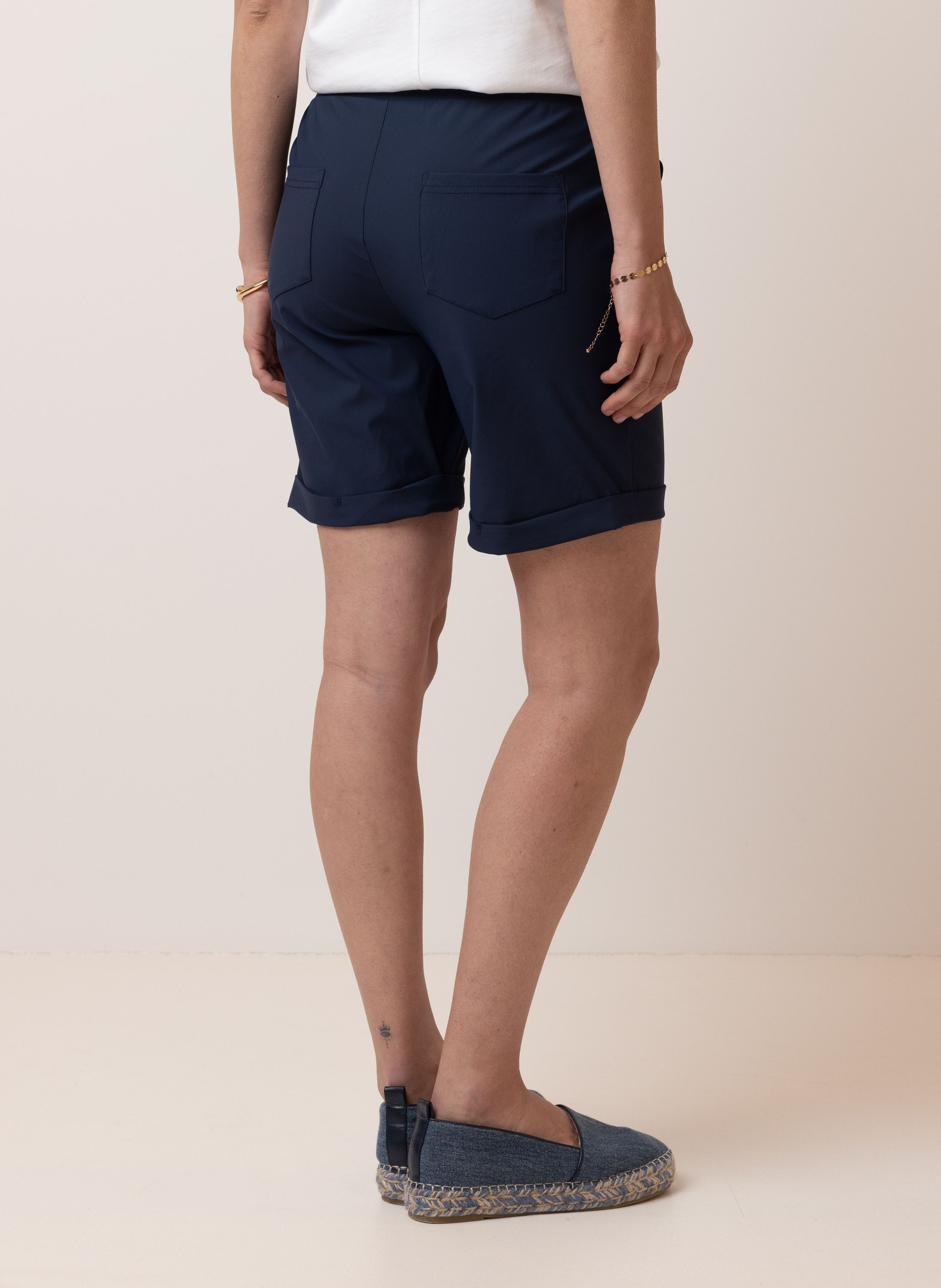 Deze korte broek met hoge taille is voorzien van een trekkoord, steekzakken en omslag aan de broekspijpen. De stretchy stof zorgt voor extra draagcomfort.
