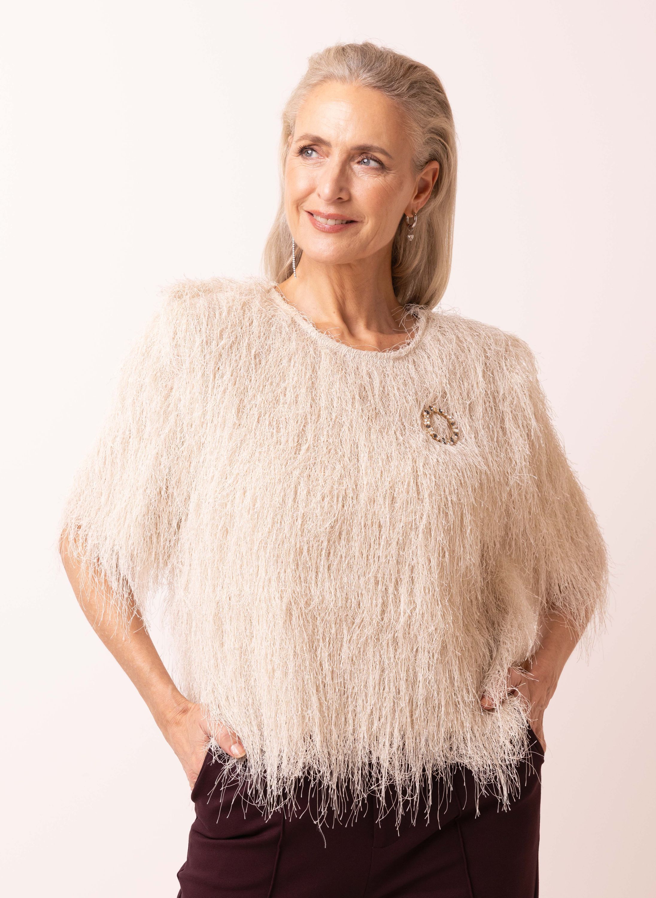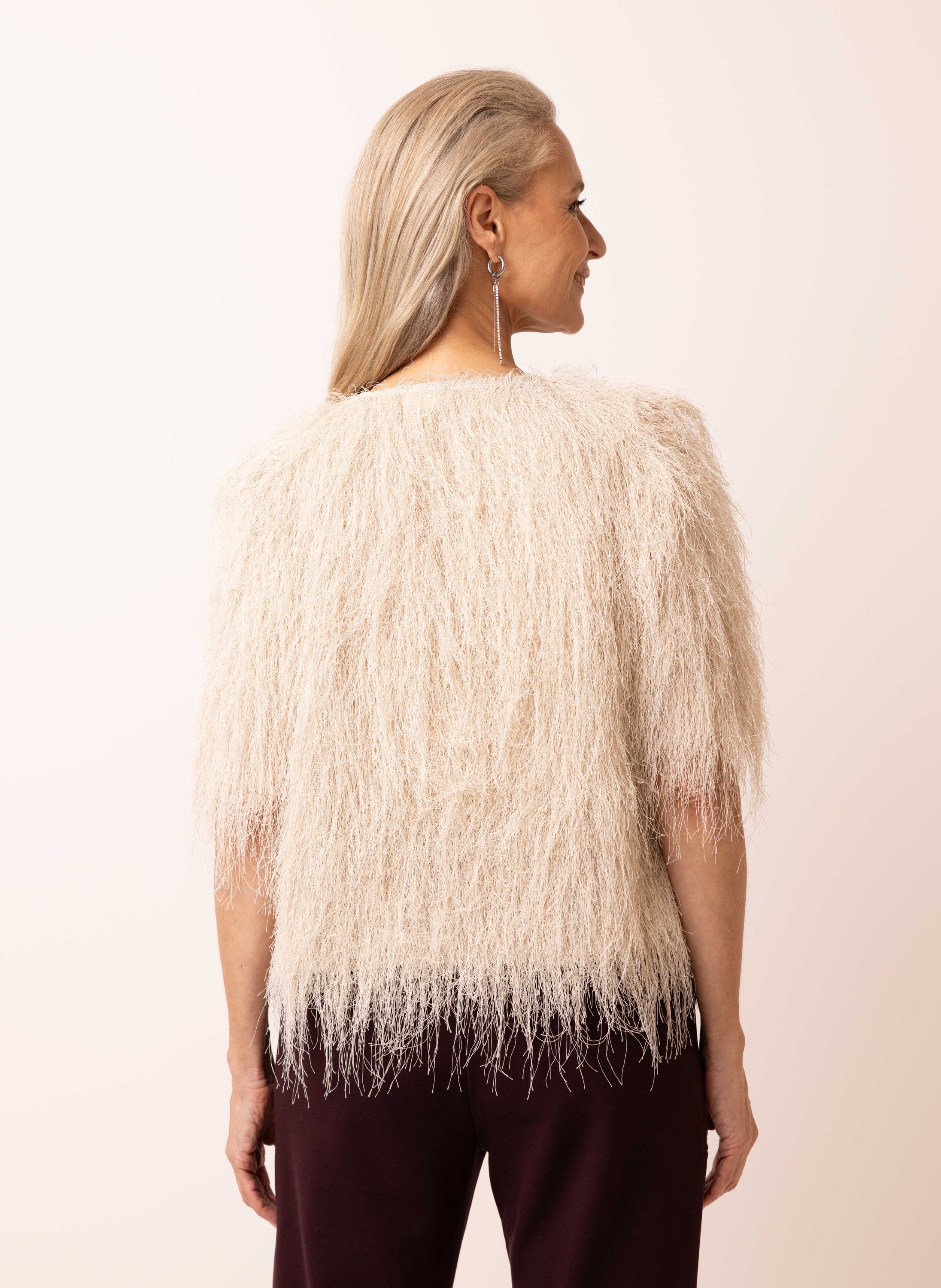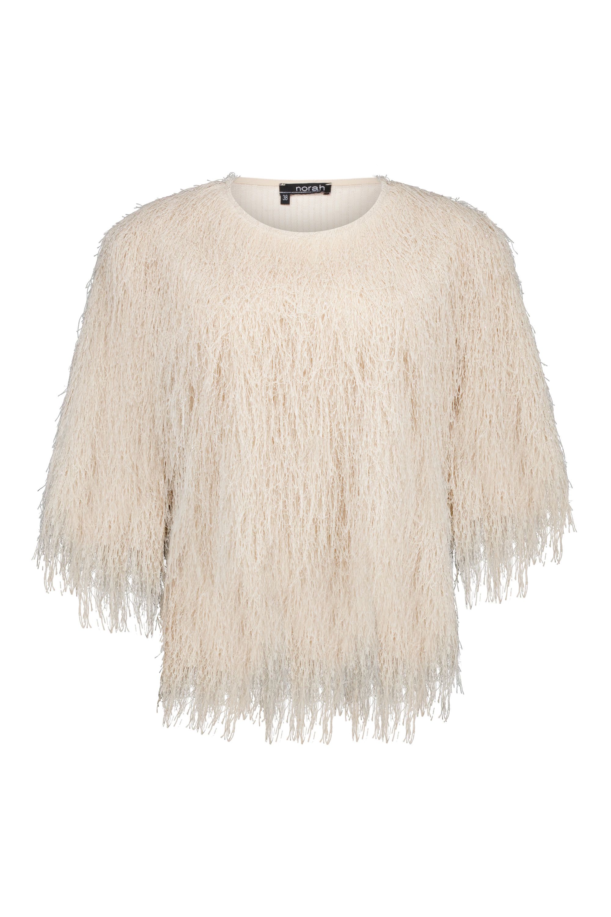 Deze feestelijke top met ronde hals, halflange mouwen, franjes en zilverkleurige lurex zorgt voor een sprankelende uitstraling. Let op: het waslabel in de top is niet correct. Wij adviseren de volgende wasinstructies: Doe het item binnsnste buiten in een waszakje. Was hem vervolgens p een fijn wasprogreamma van maximaal 30 graden en 600 toeren. Hang het item na het wassen op om hem te laten drogen. Strijk het item niet.