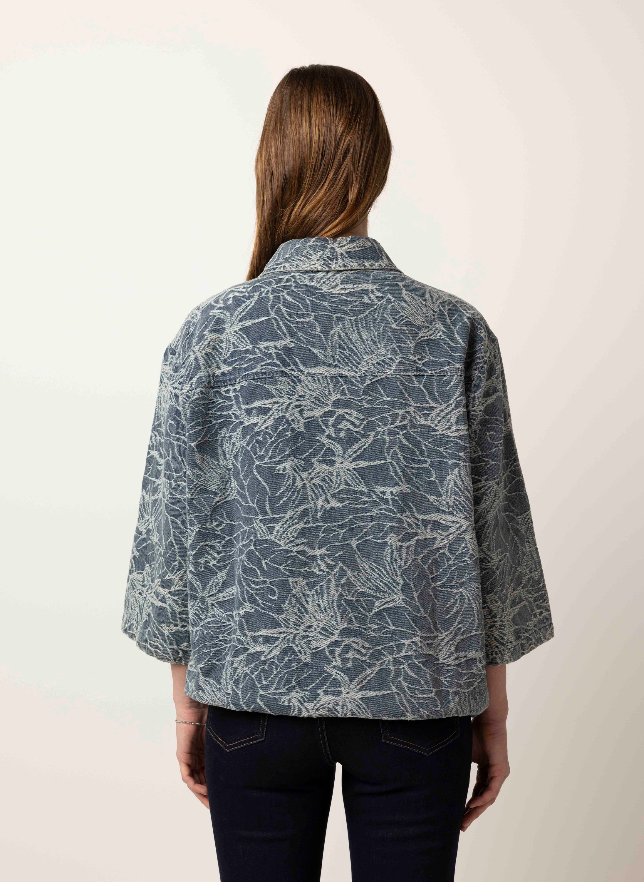 Dit denim jasje met klassieke kraag heeft een knoopsluiting, driekwart mouwen en een trekkoord aan de onderzijde.
