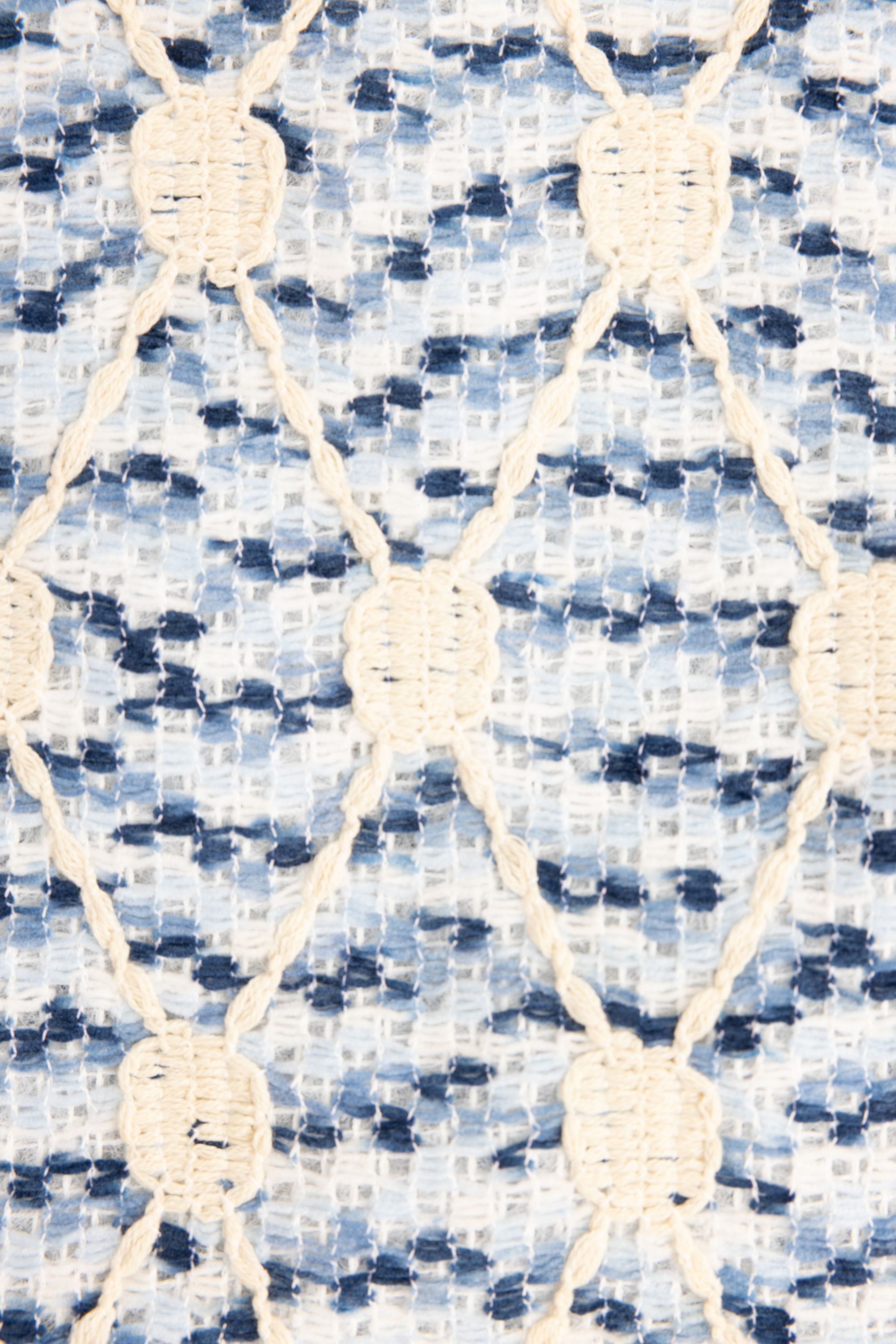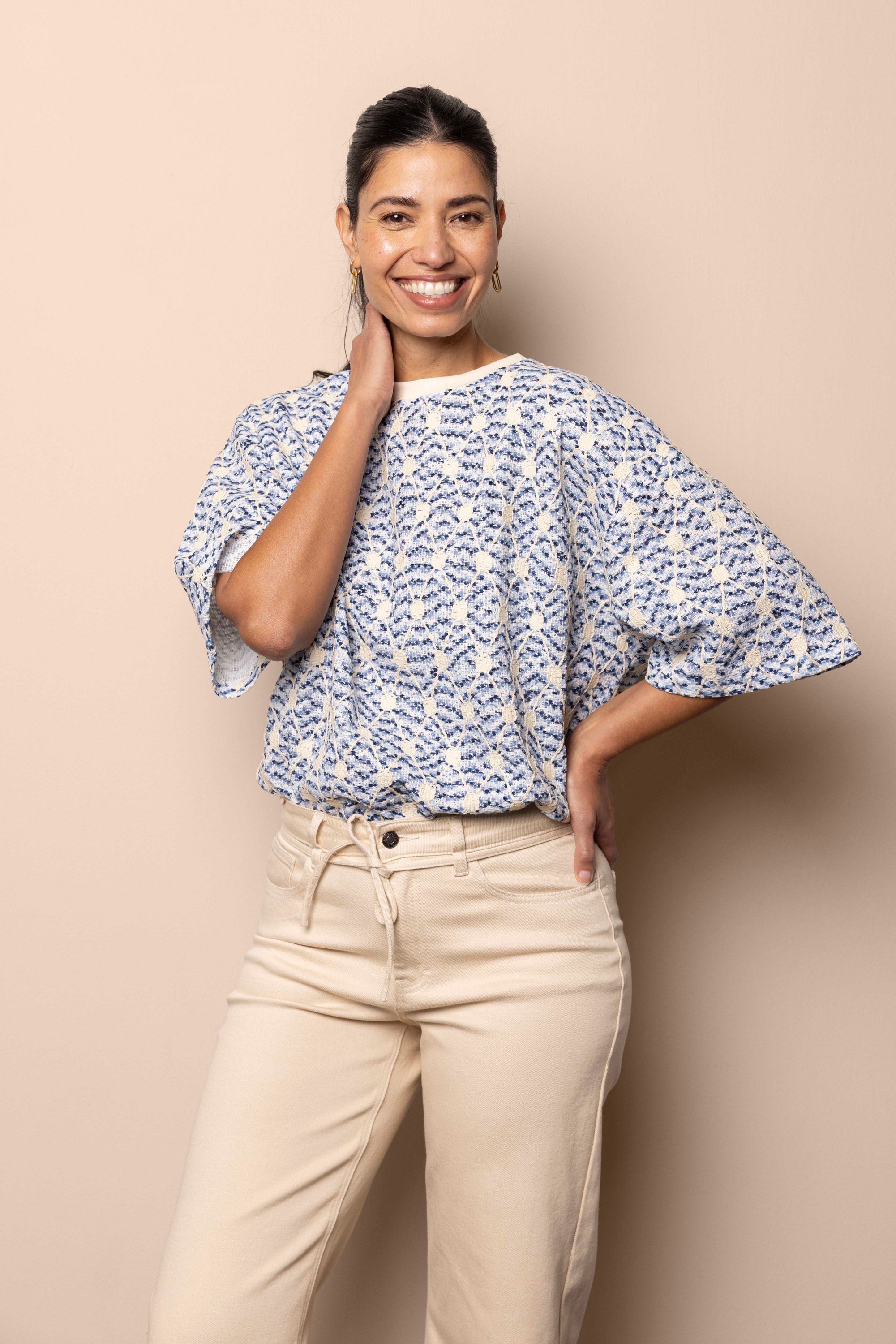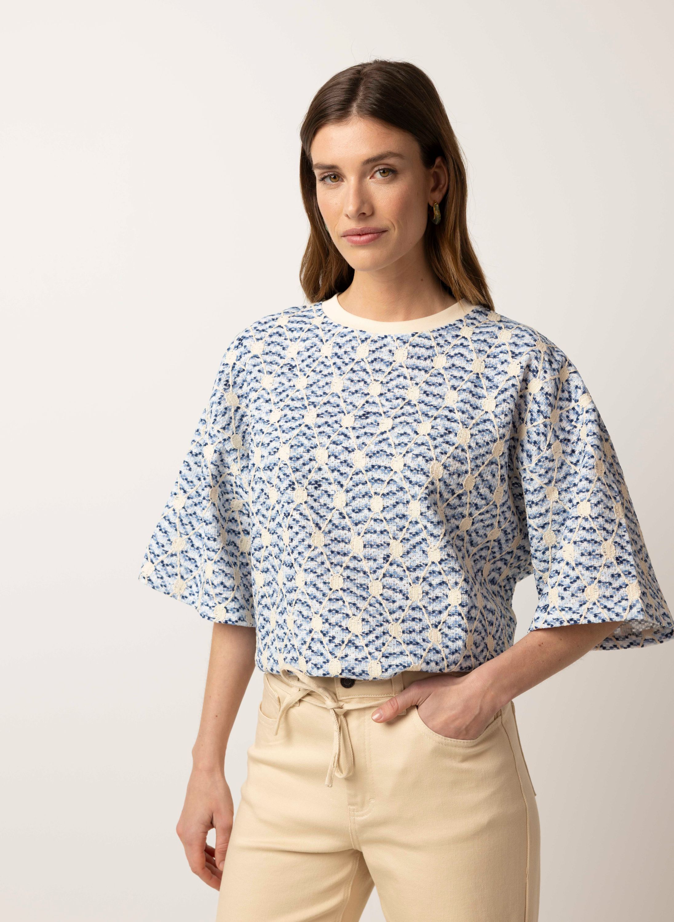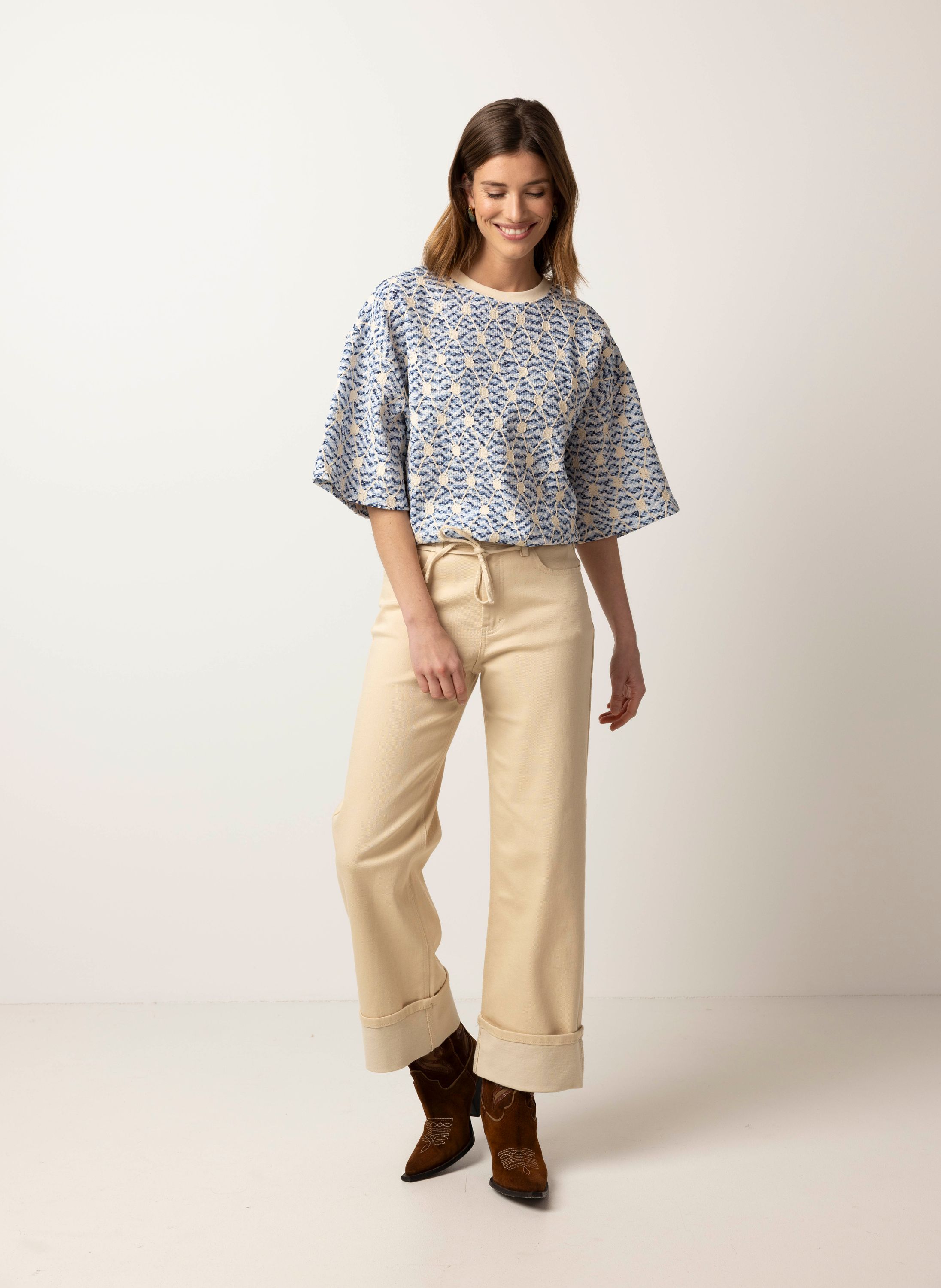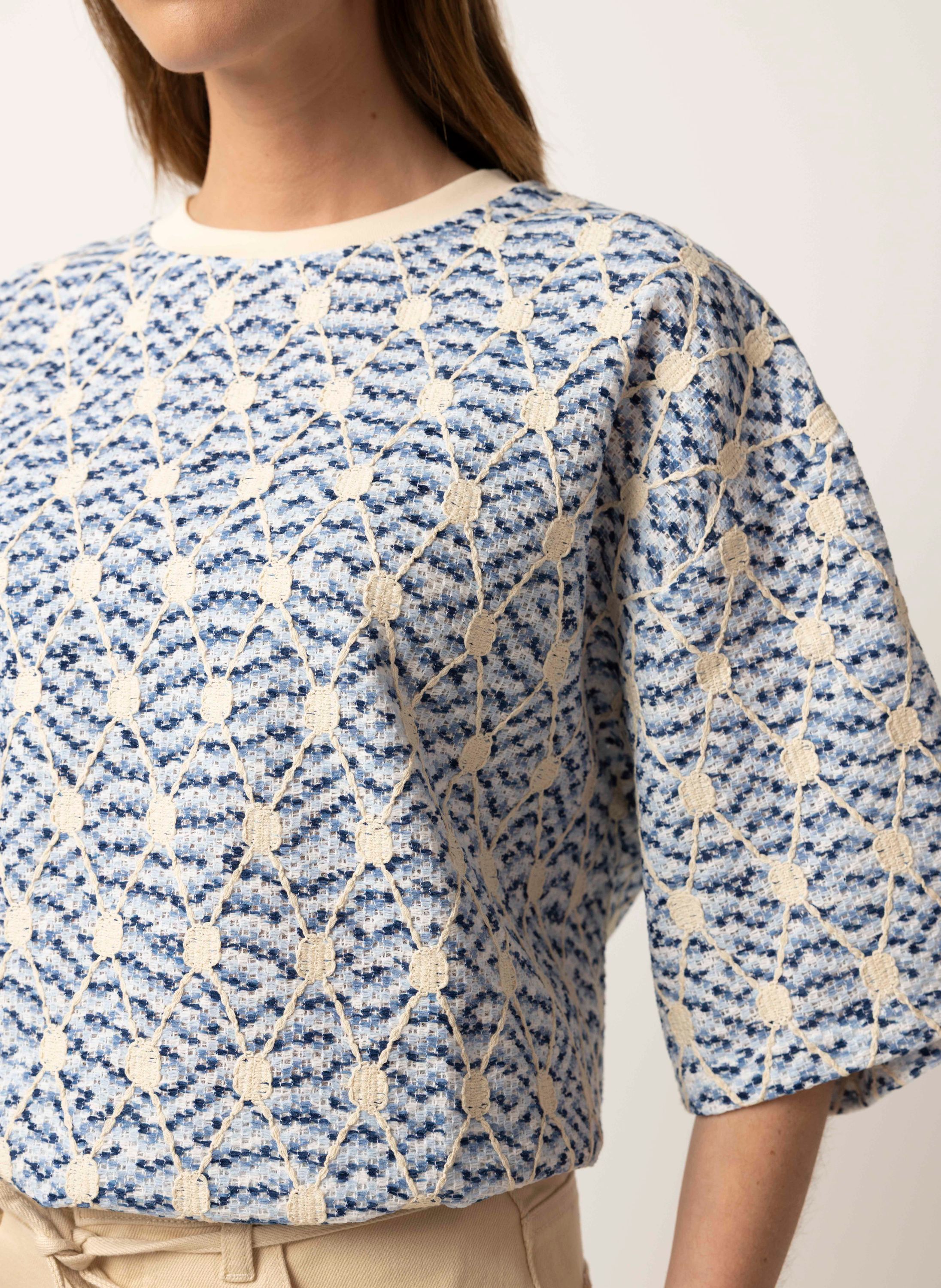 Deze gebreide trui met ronde hals heeft korte mouwen en een tricot boord aan de onderzijde.