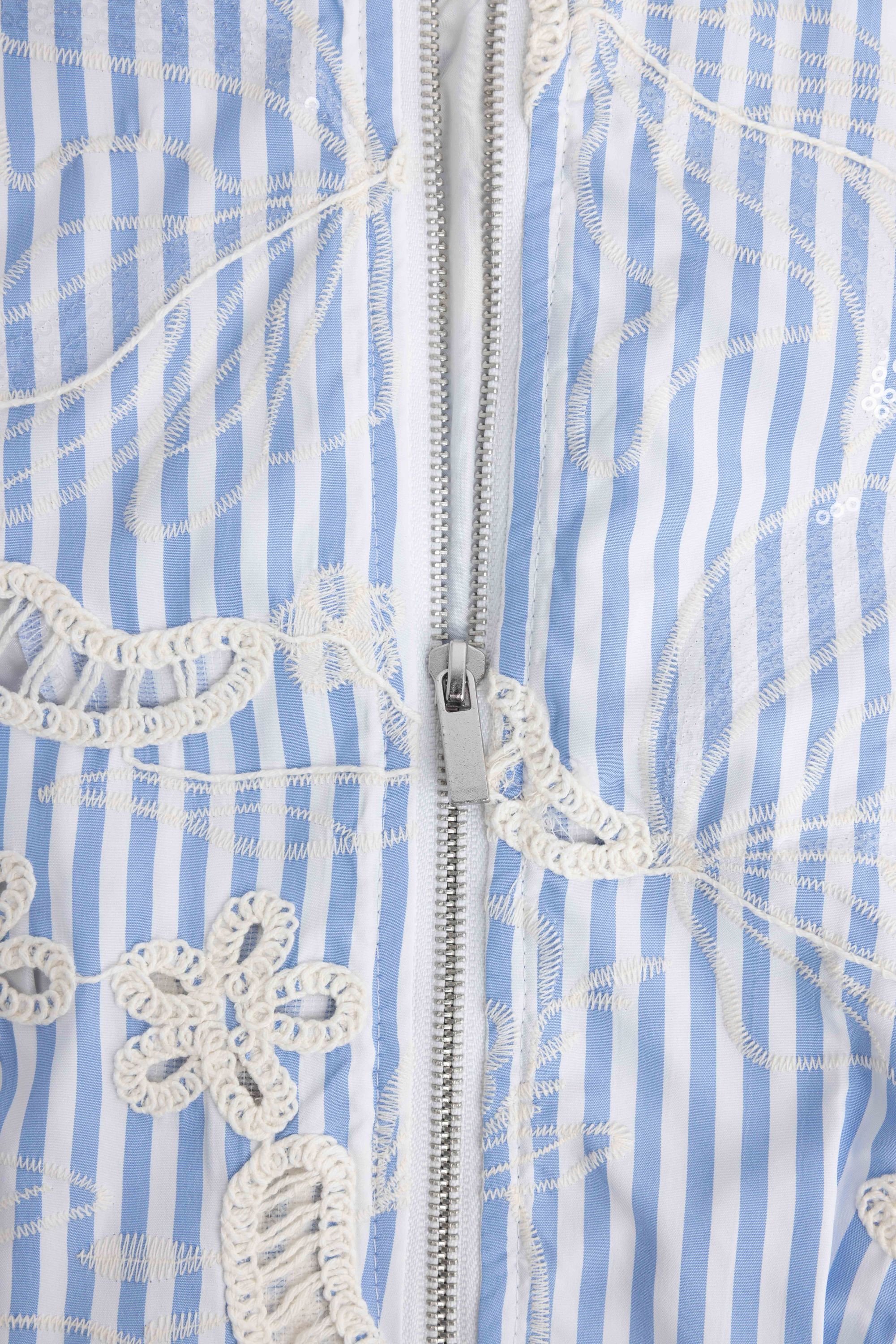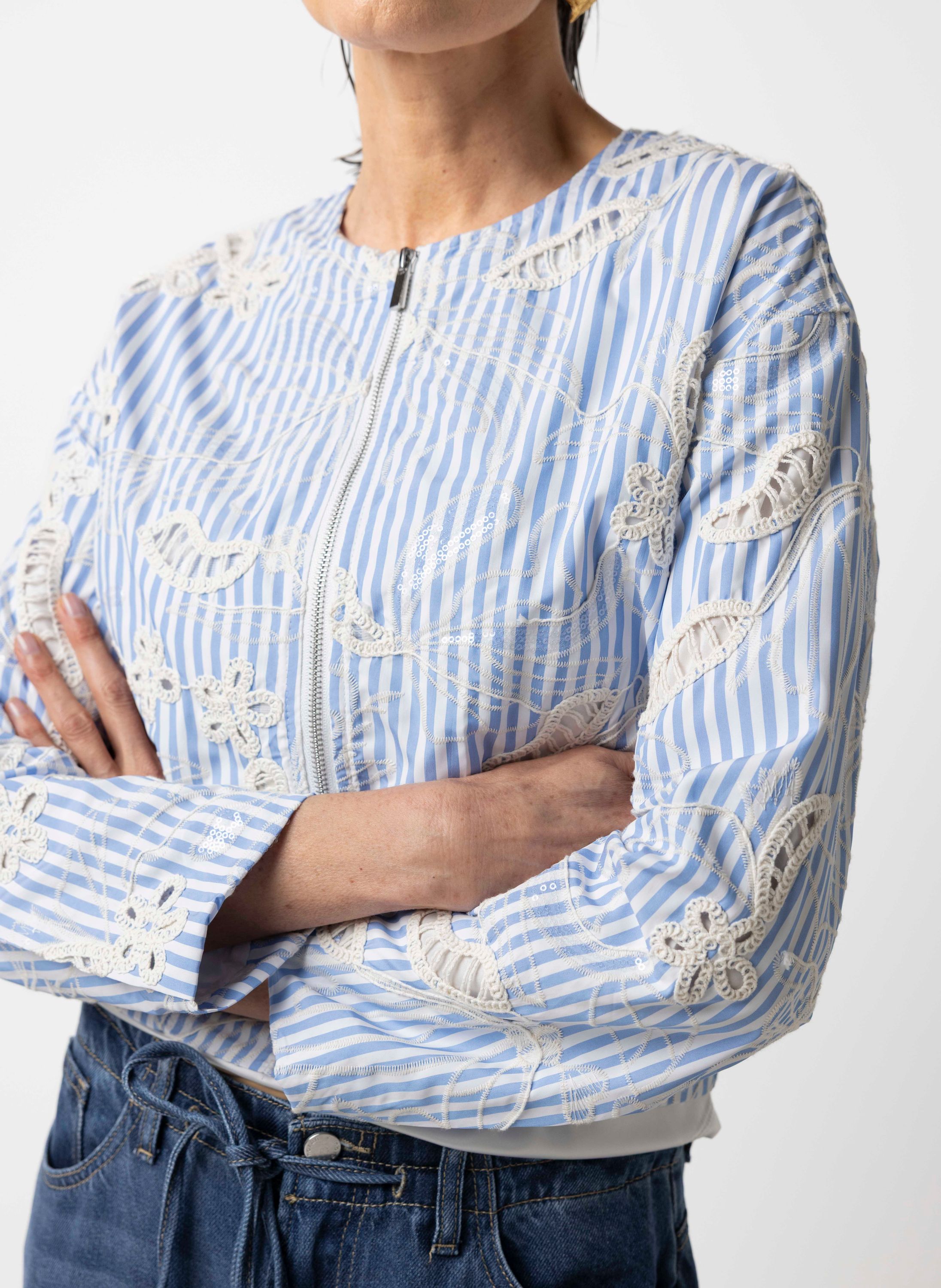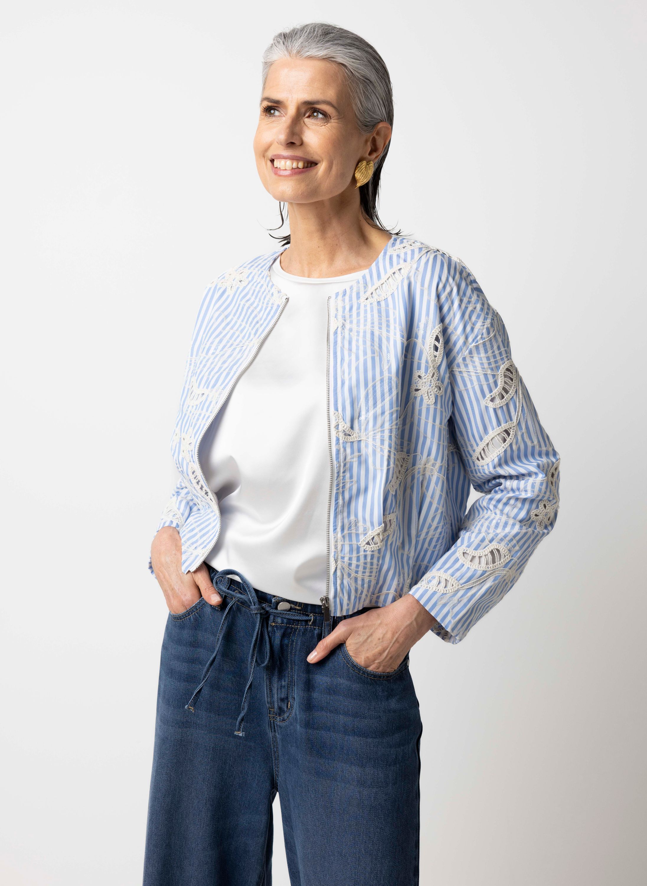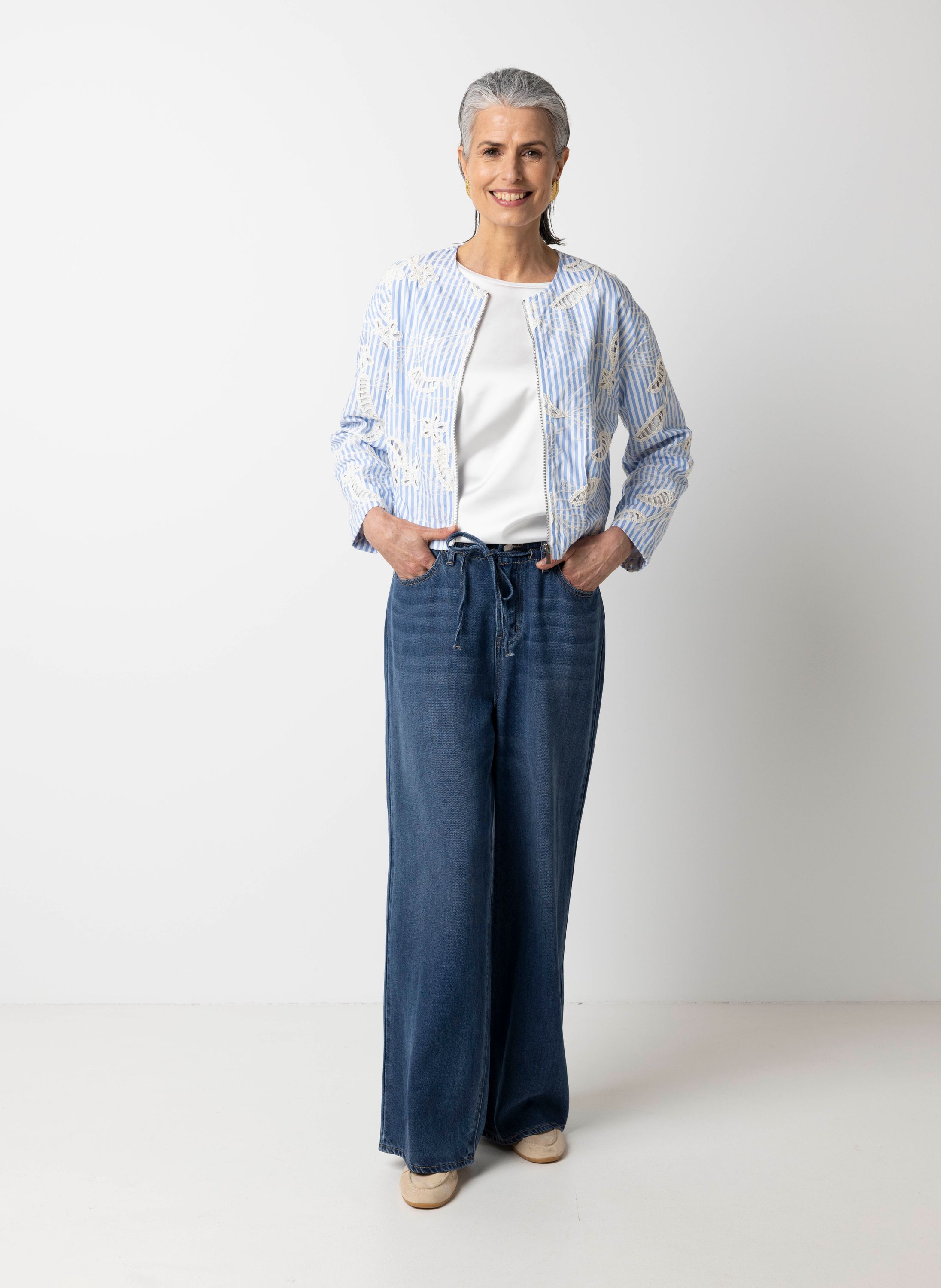 Dit korte open jasje met ronde hals, knoopsluiting en driekwart mouwen heeft een elegante uitstraling.