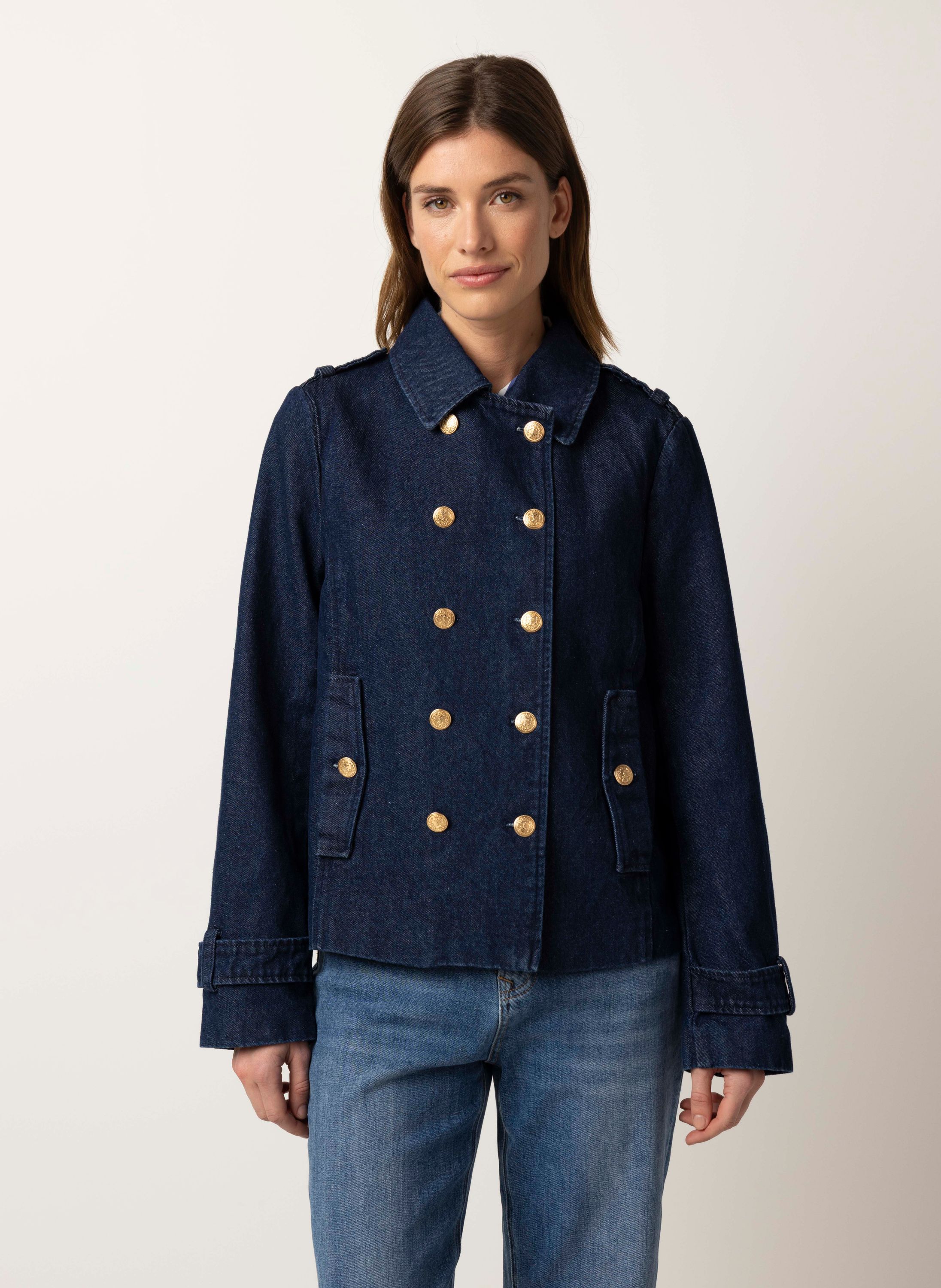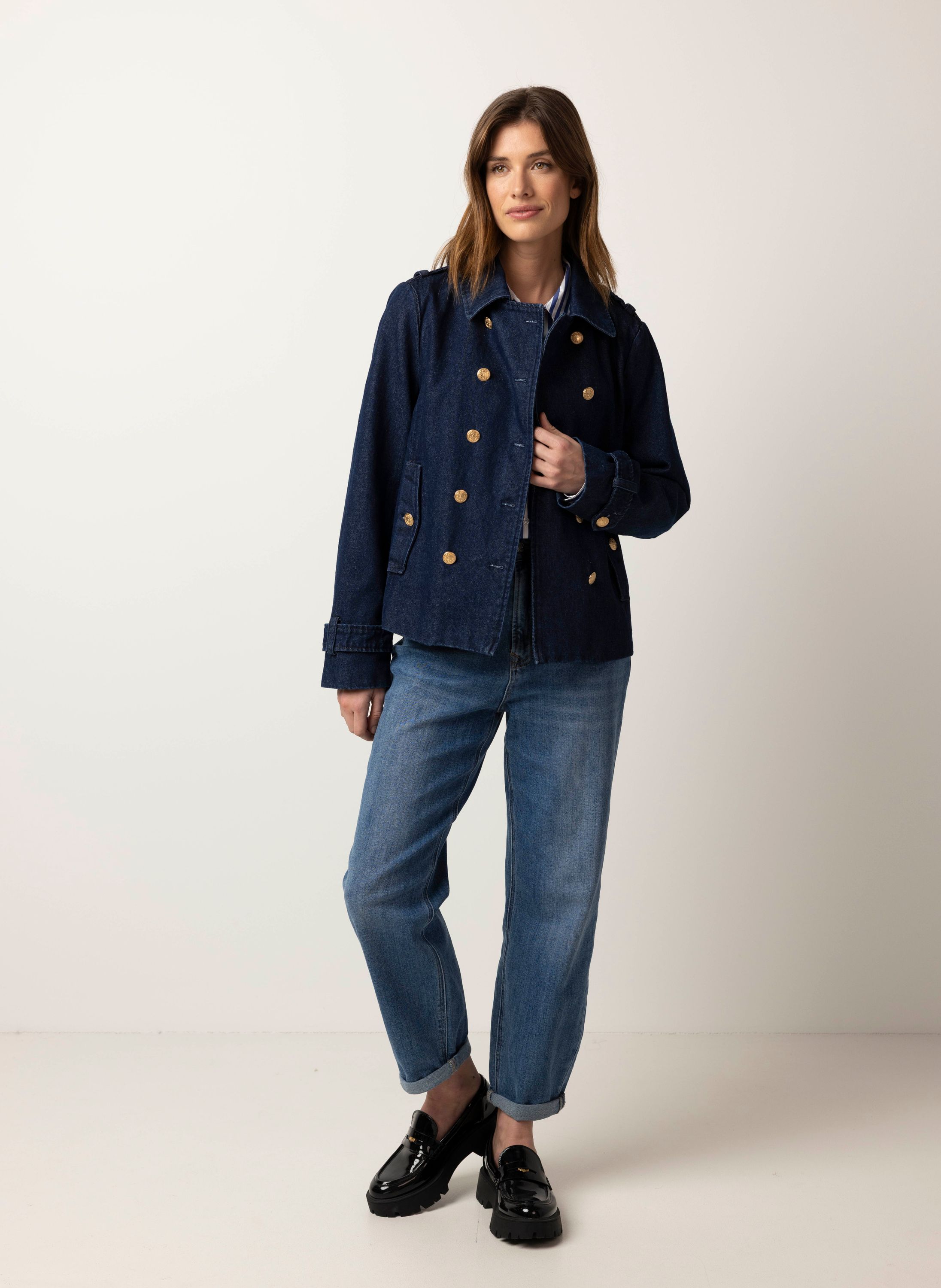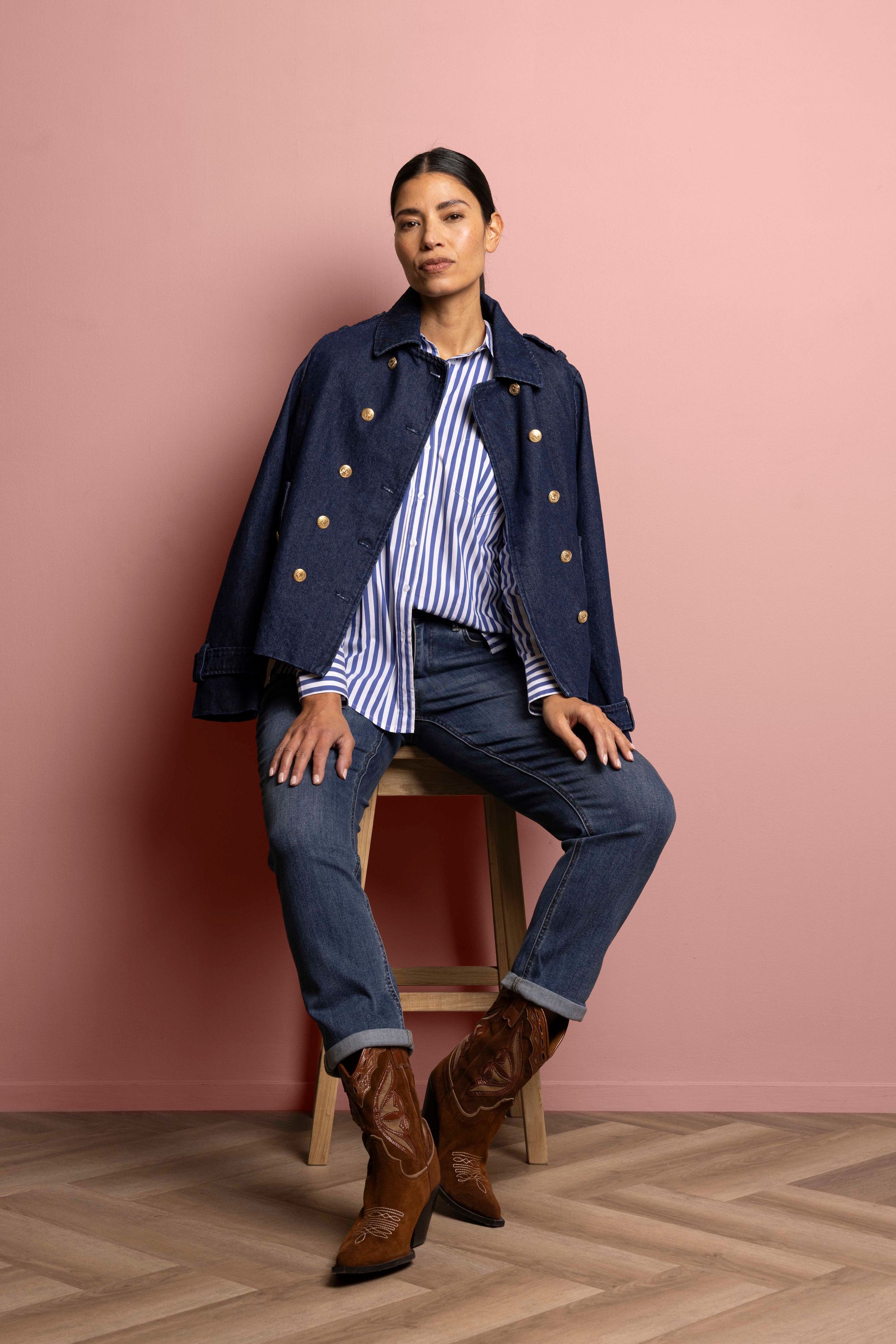 Deze jas is uitgevoerd in stevig denim en heeft een dubbele knoopsluiting met goudkleurige knopen voor een stijlvolle uitstraling. De reverskraag en steekzakken aan de voorzijde geven het ontwerp een klassieke touch, terwijl de pasvorm zorgt voor een vrouwelijke look. Ideaal om als jas te dragen in het voor- en najaar. Dit item is exclusief verkrijgbaar in geselecteerde winkels en online. Controleer de winkelvoorraad om de beschikbaarheid in een winkel bij jou in de buurt te bekijken.