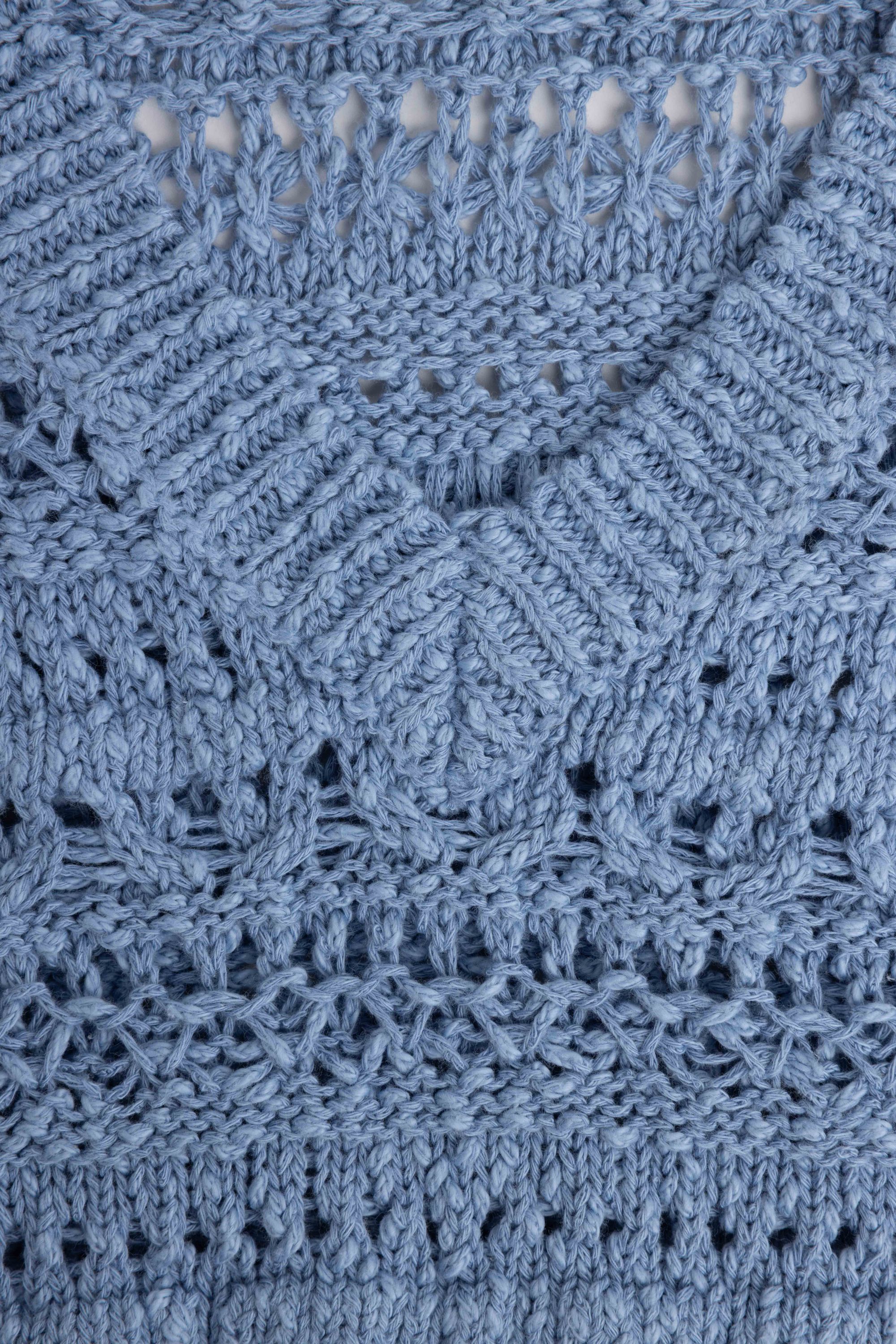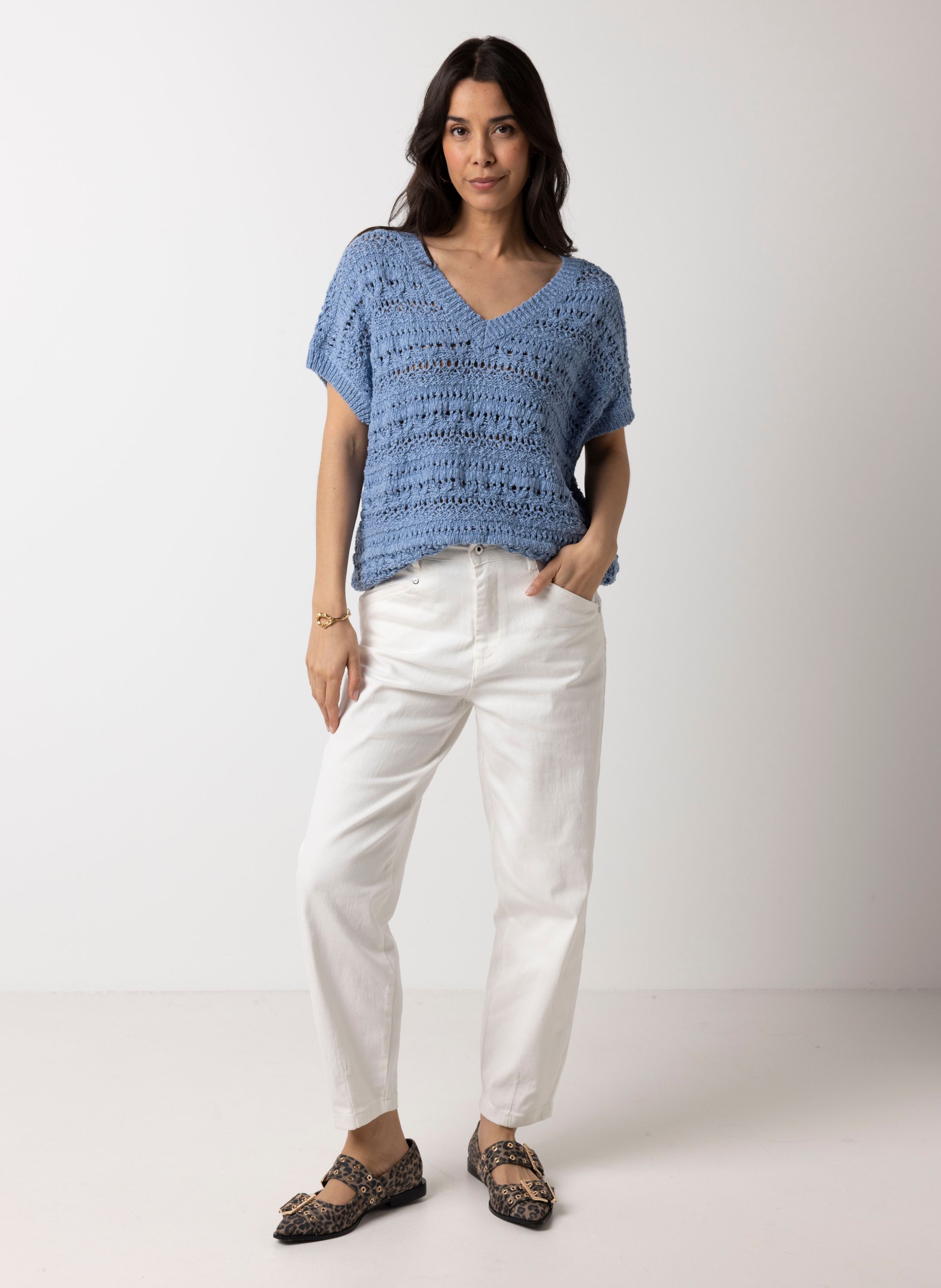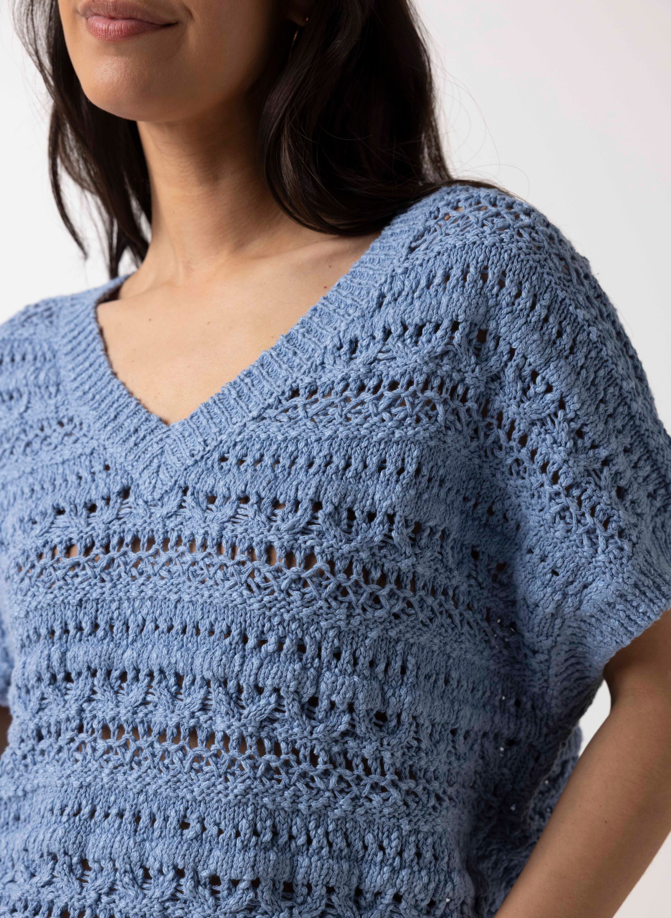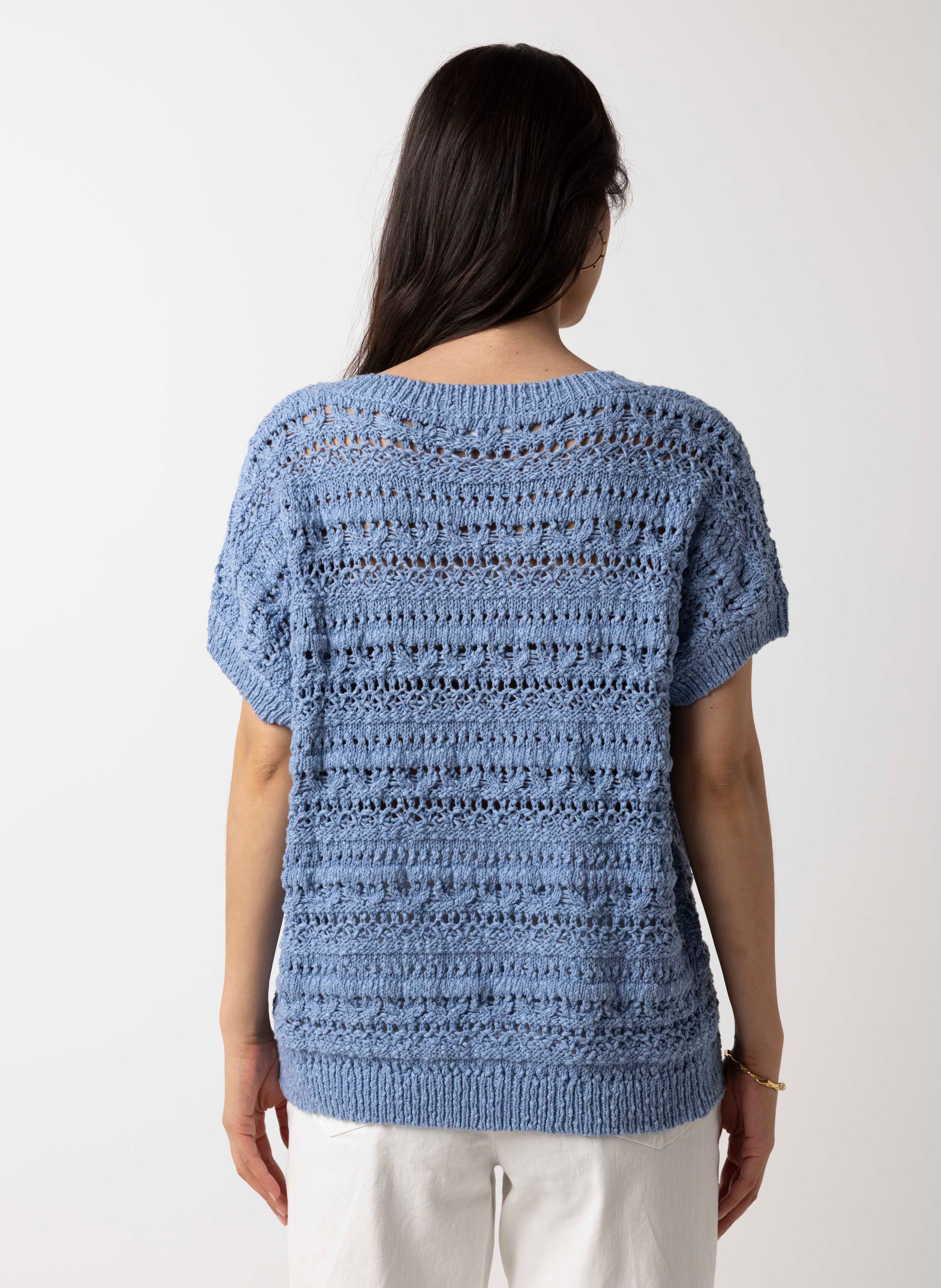 Deze gebreide trui met V-hals en korte mouwen heeft een opengewerkt patroon voor een luchtige uitstraling.