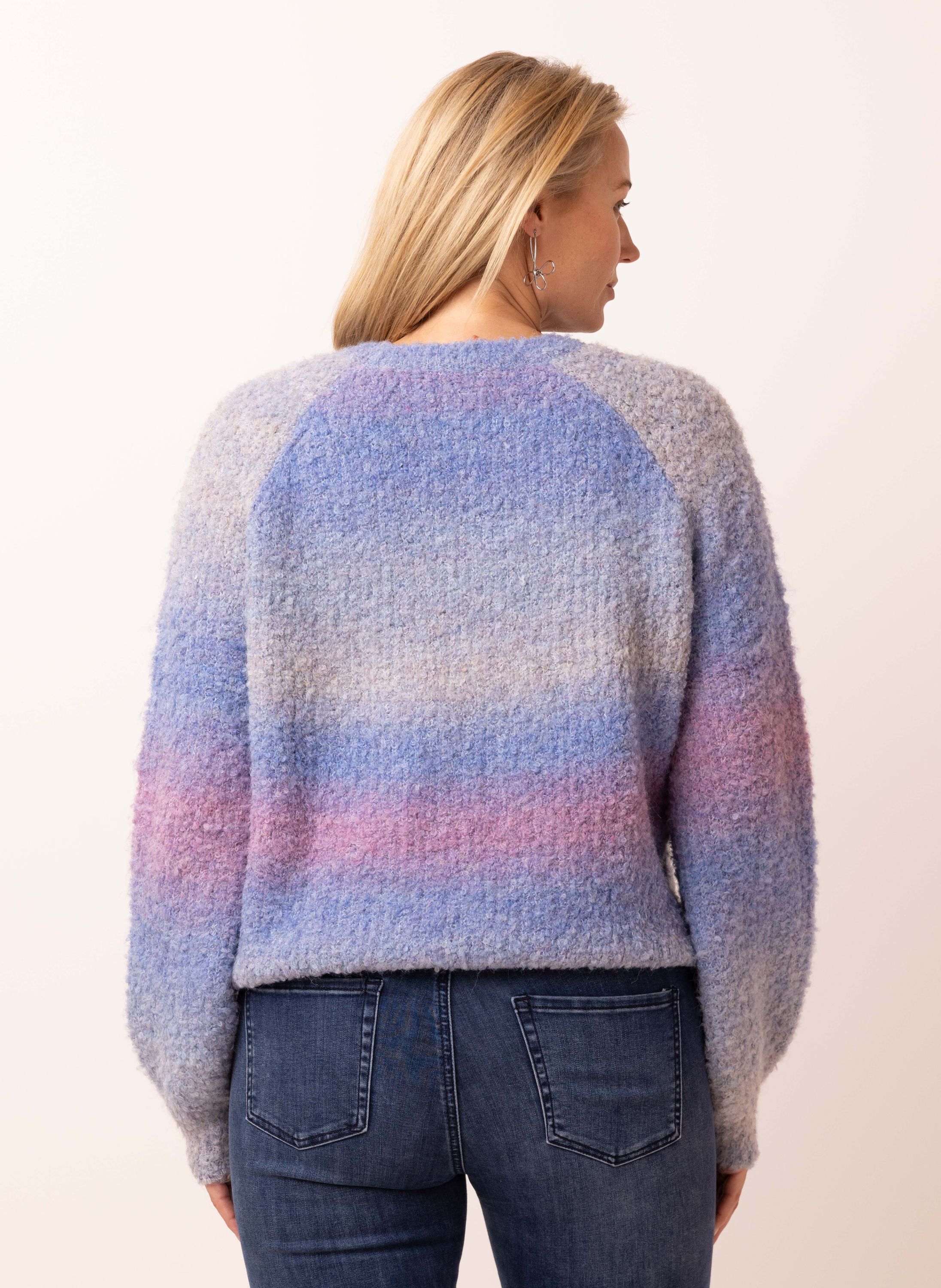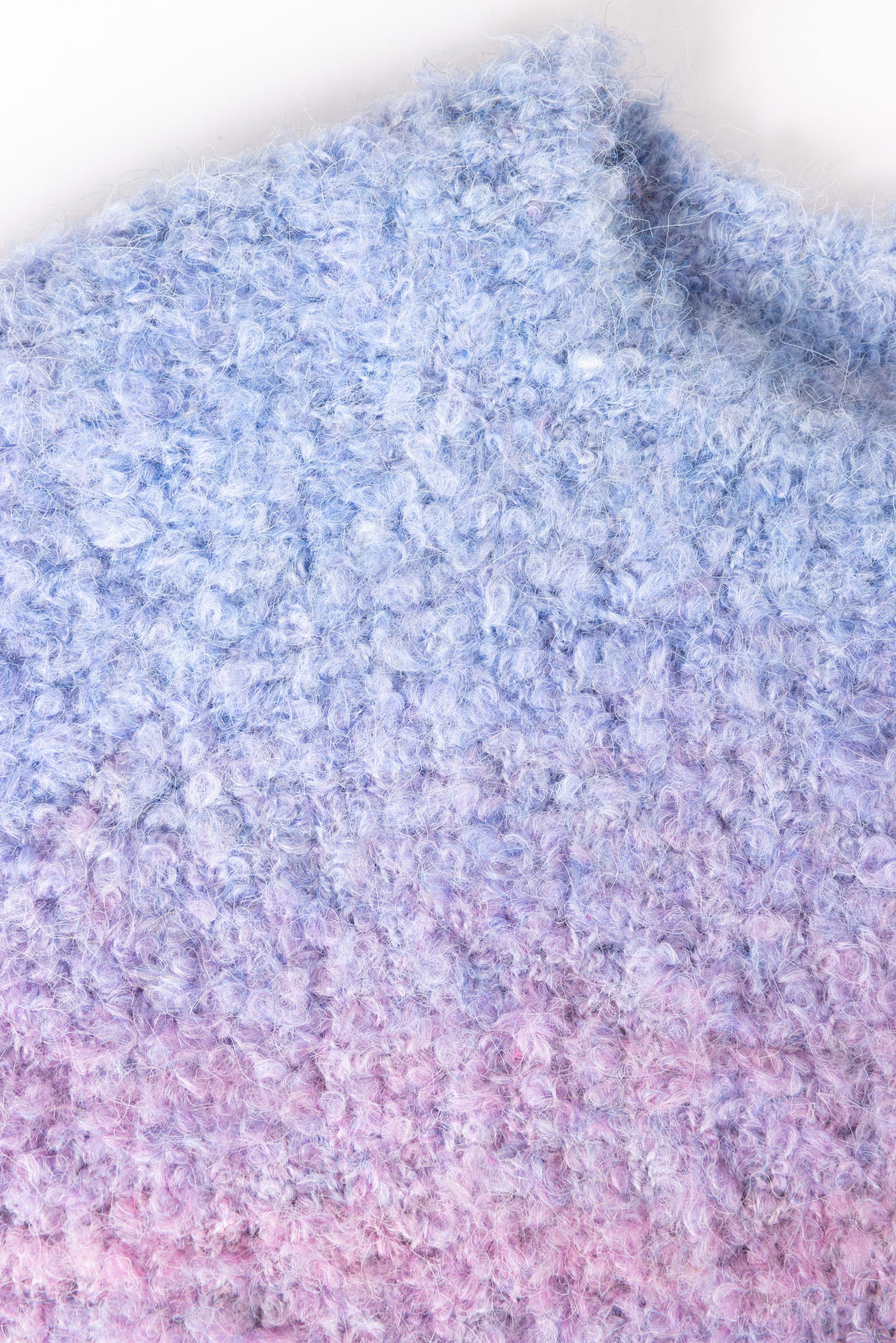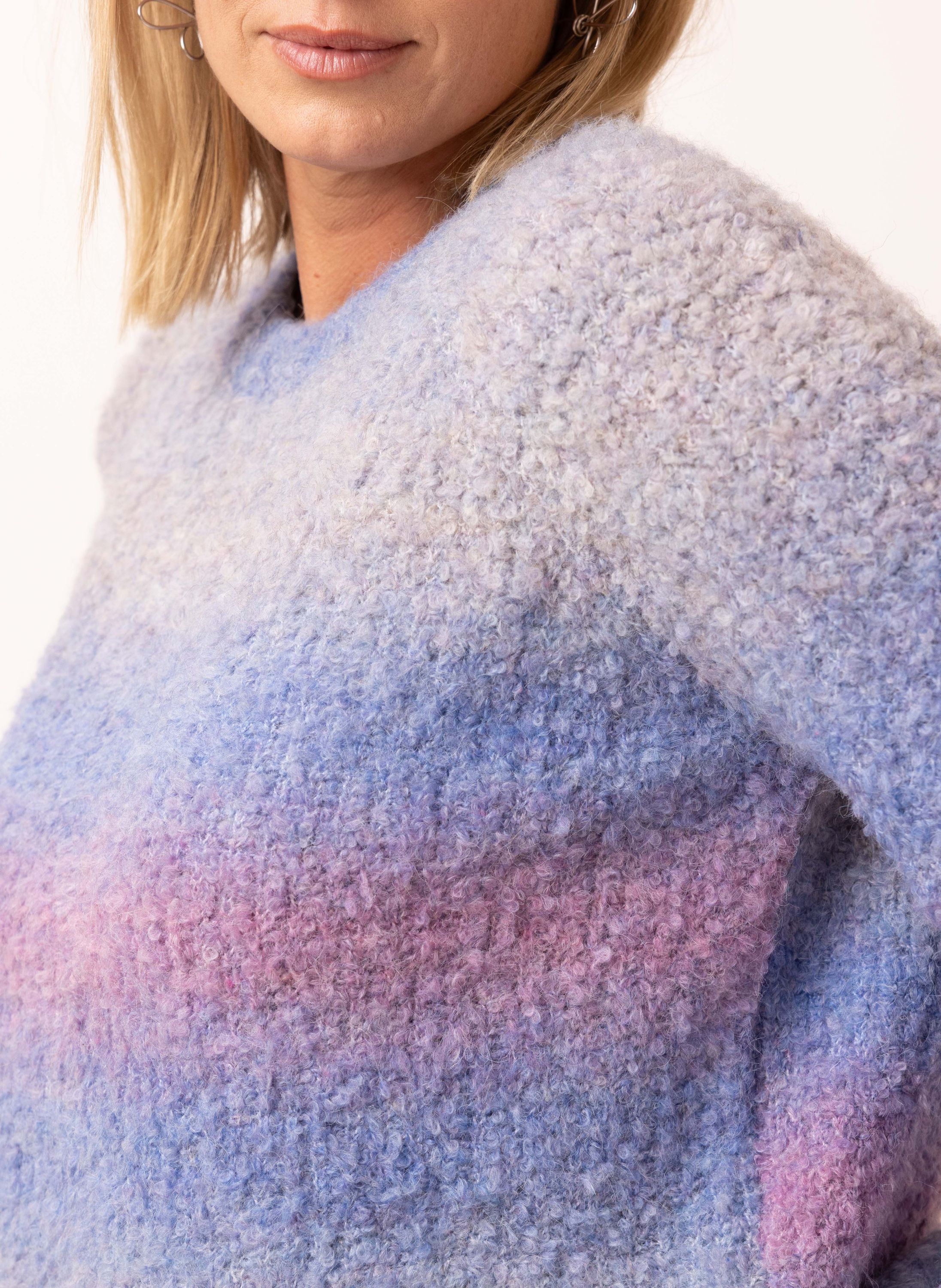 Deze gebreide trui heeft een ronde hals en lange mouwen. Let op: elke trui is anders door deze overlopende stof.