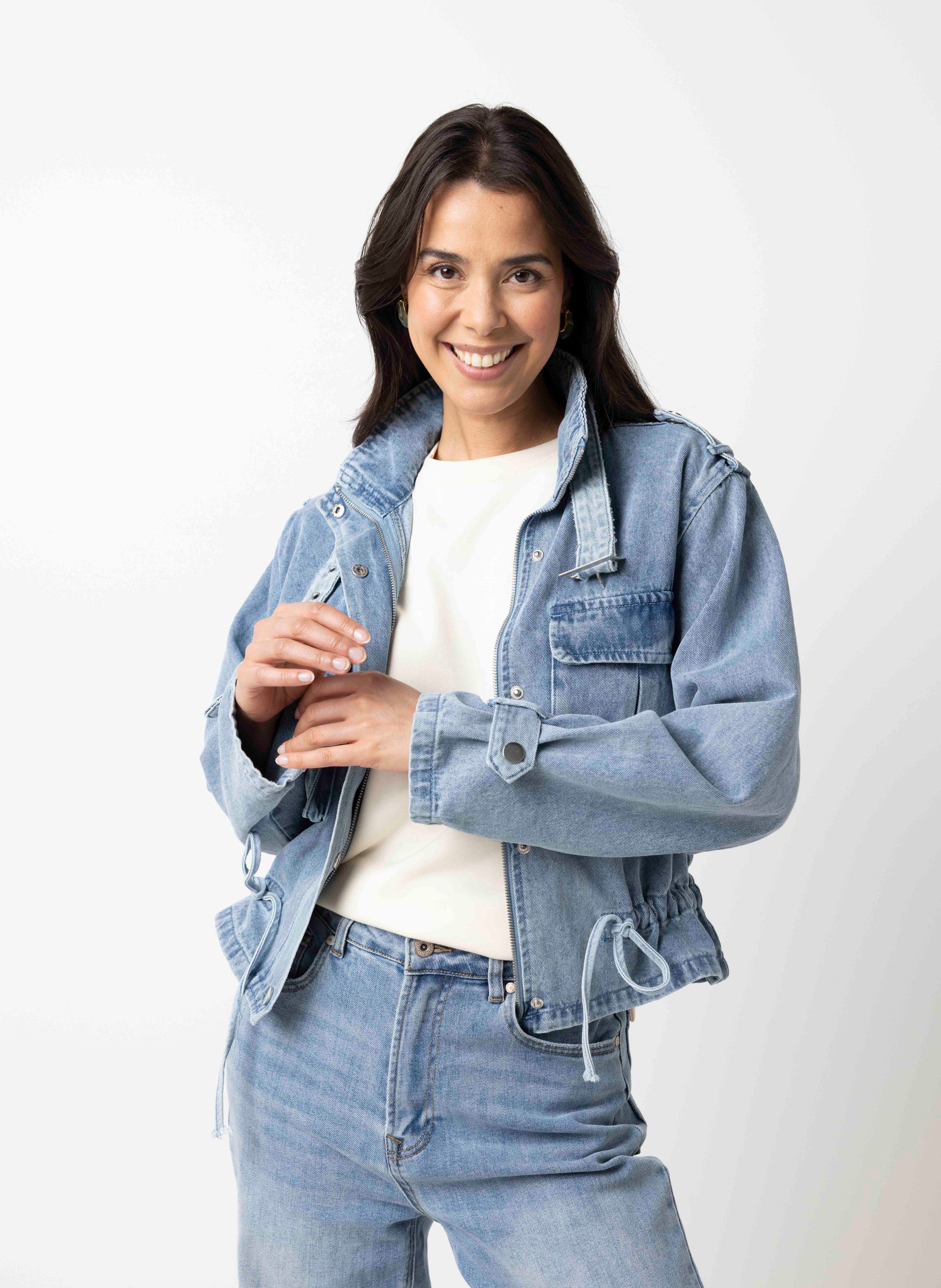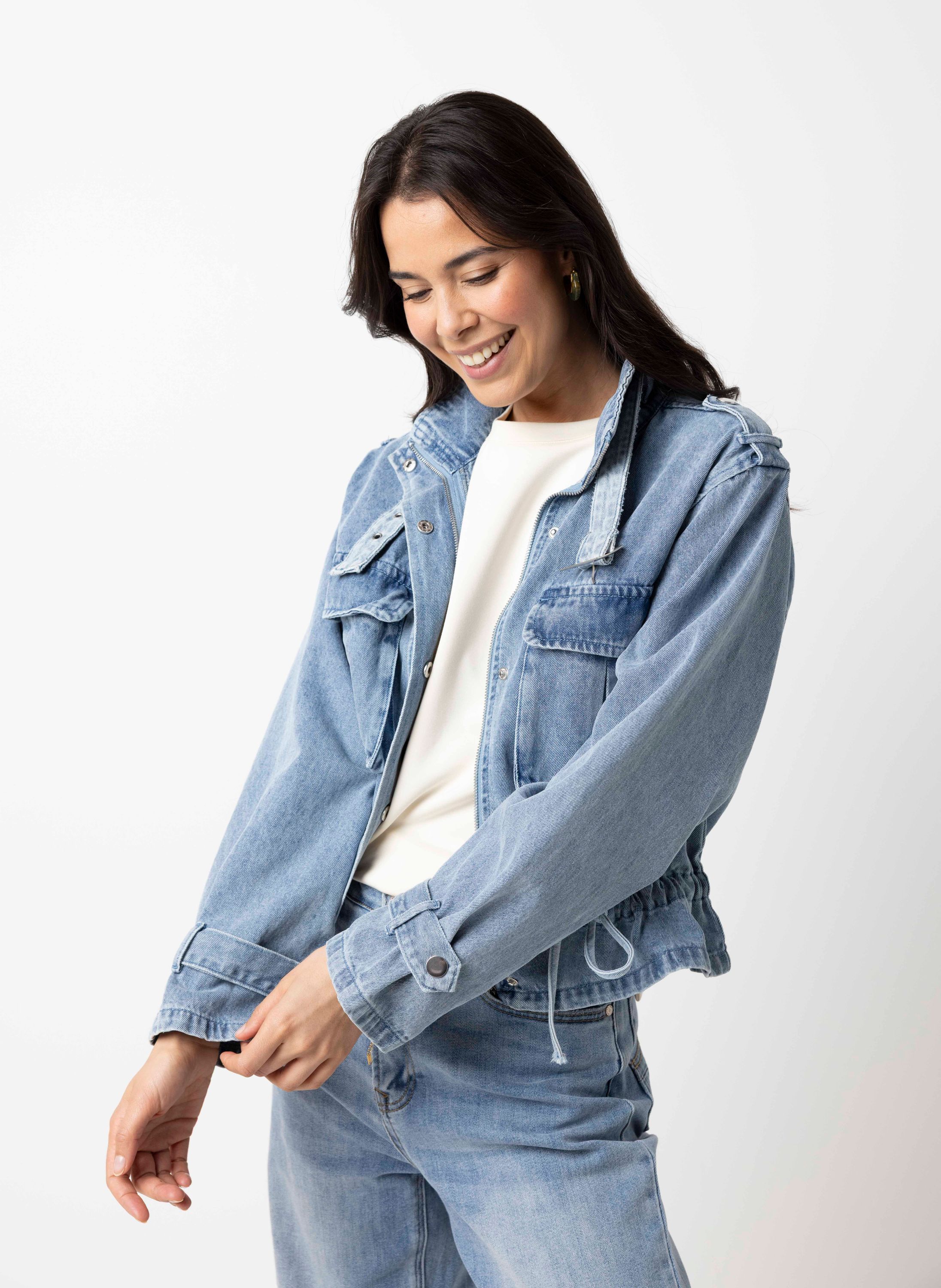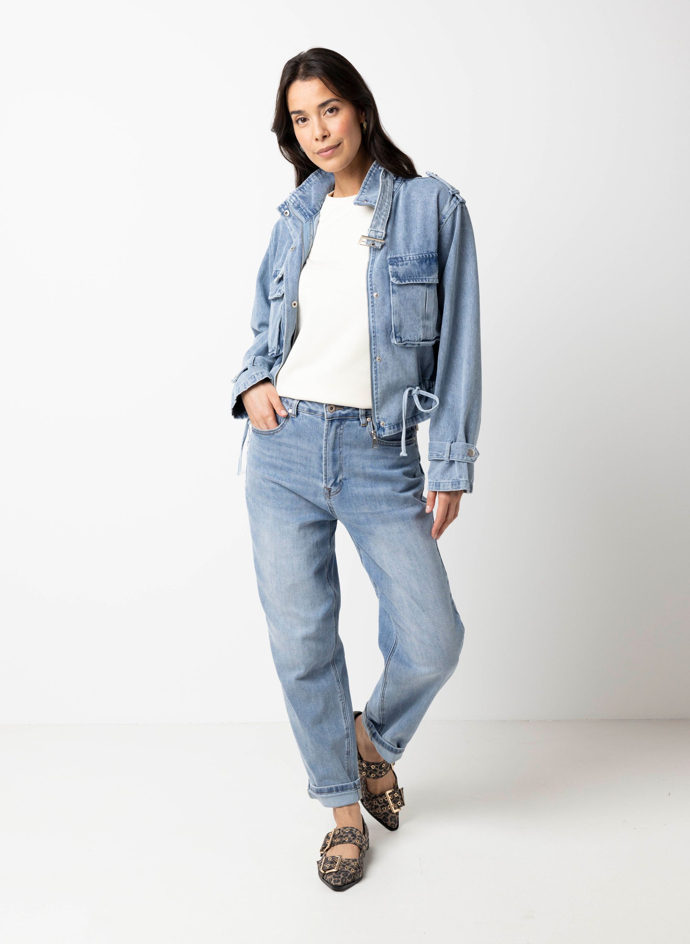 Deze denim jas heeft een klassieke kraag, knoopsluiting en twee borstzakken. De rechte pasvorm en stevige denim geven het item een stoere uitstraling, terwijl de cropped lengte zorgt voor een moderne twist. Het trekkoord maakt het mogelijk om het model te tailleren voor een vrouwelijke look. Perfect om open te dragen als jasje of gesloten als blouse.