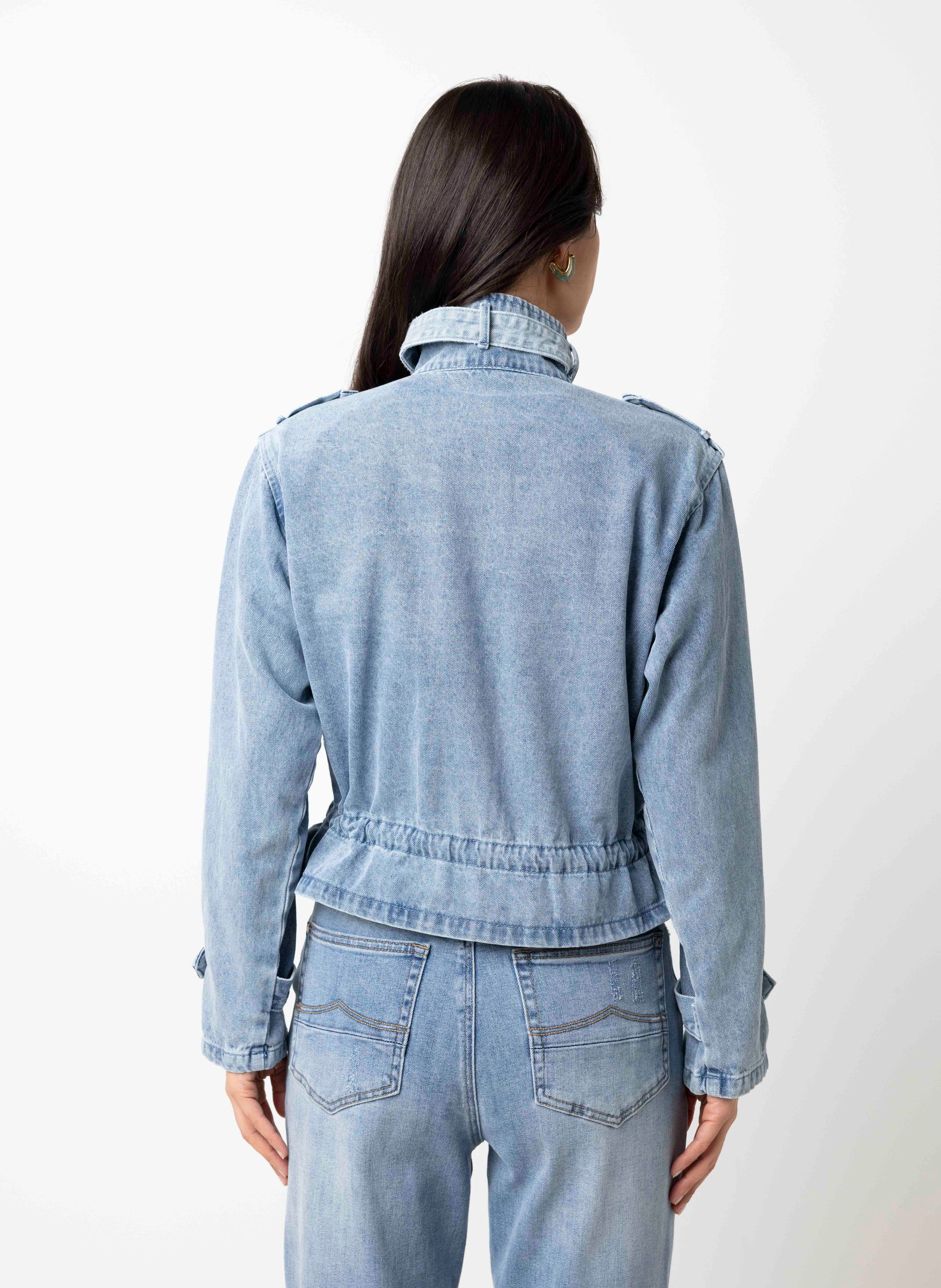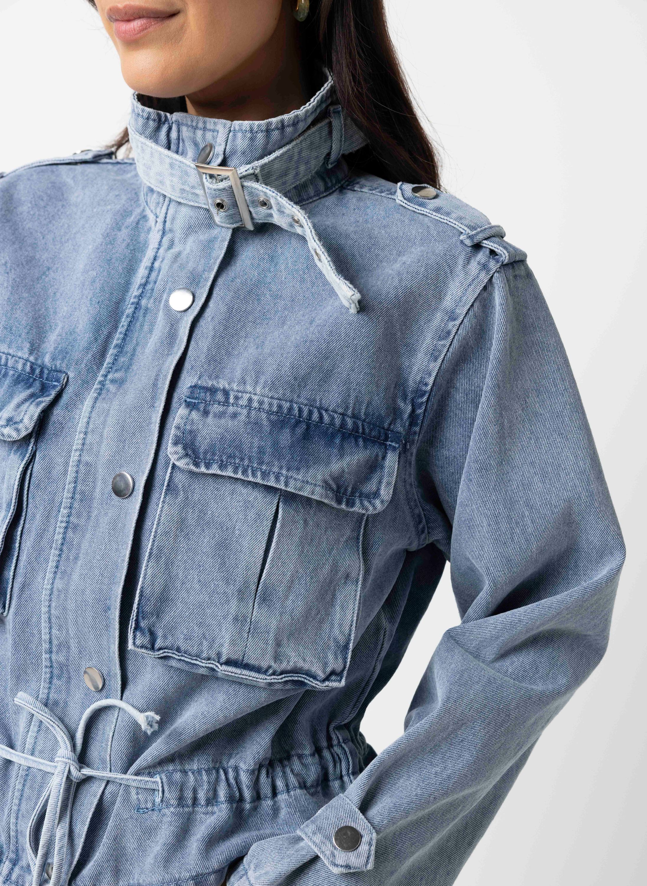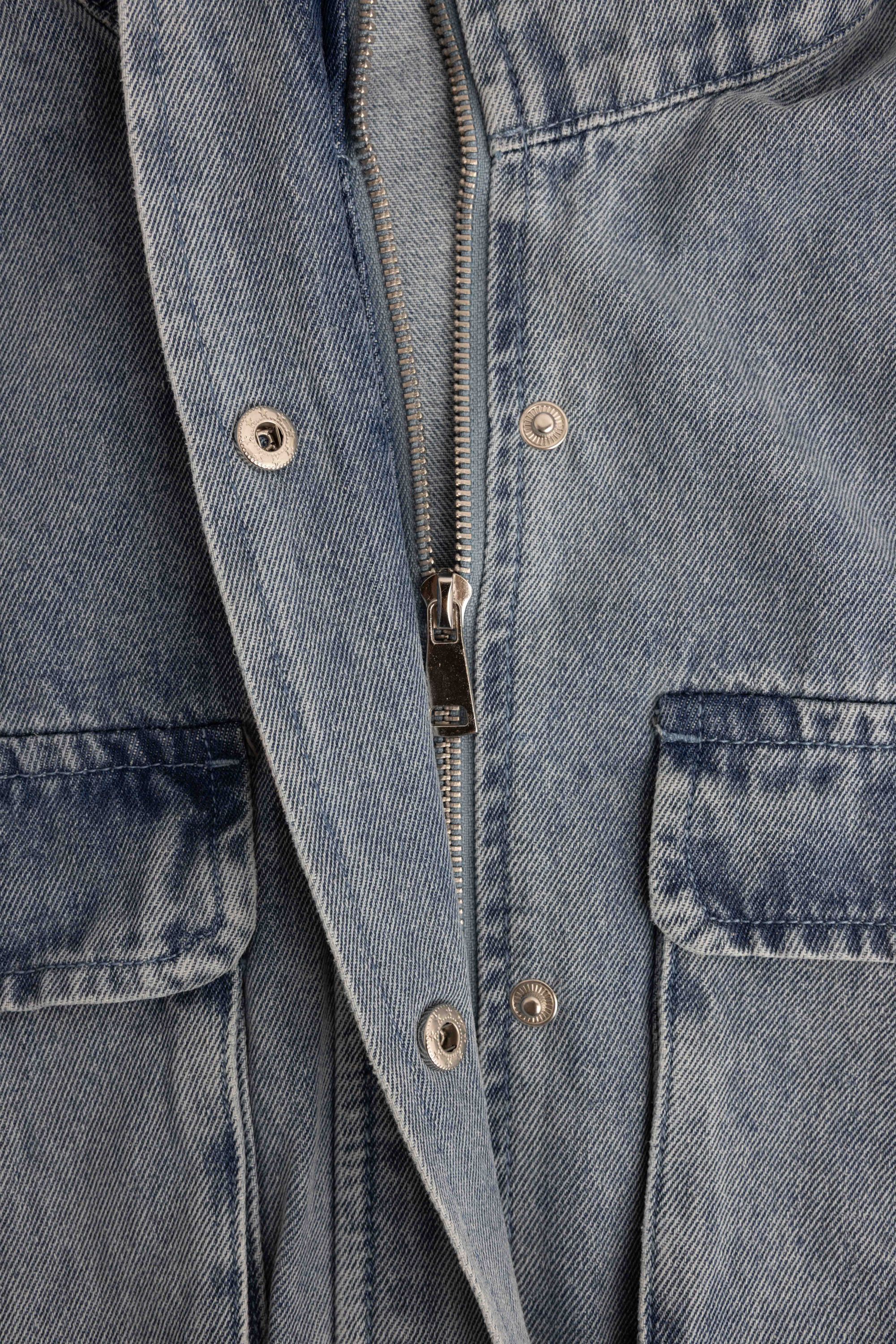 Deze denim jas heeft een klassieke kraag, knoopsluiting en twee borstzakken. De rechte pasvorm en stevige denim geven het item een stoere uitstraling, terwijl de cropped lengte zorgt voor een moderne twist. Het trekkoord maakt het mogelijk om het model te tailleren voor een vrouwelijke look. Perfect om open te dragen als jasje of gesloten als blouse.