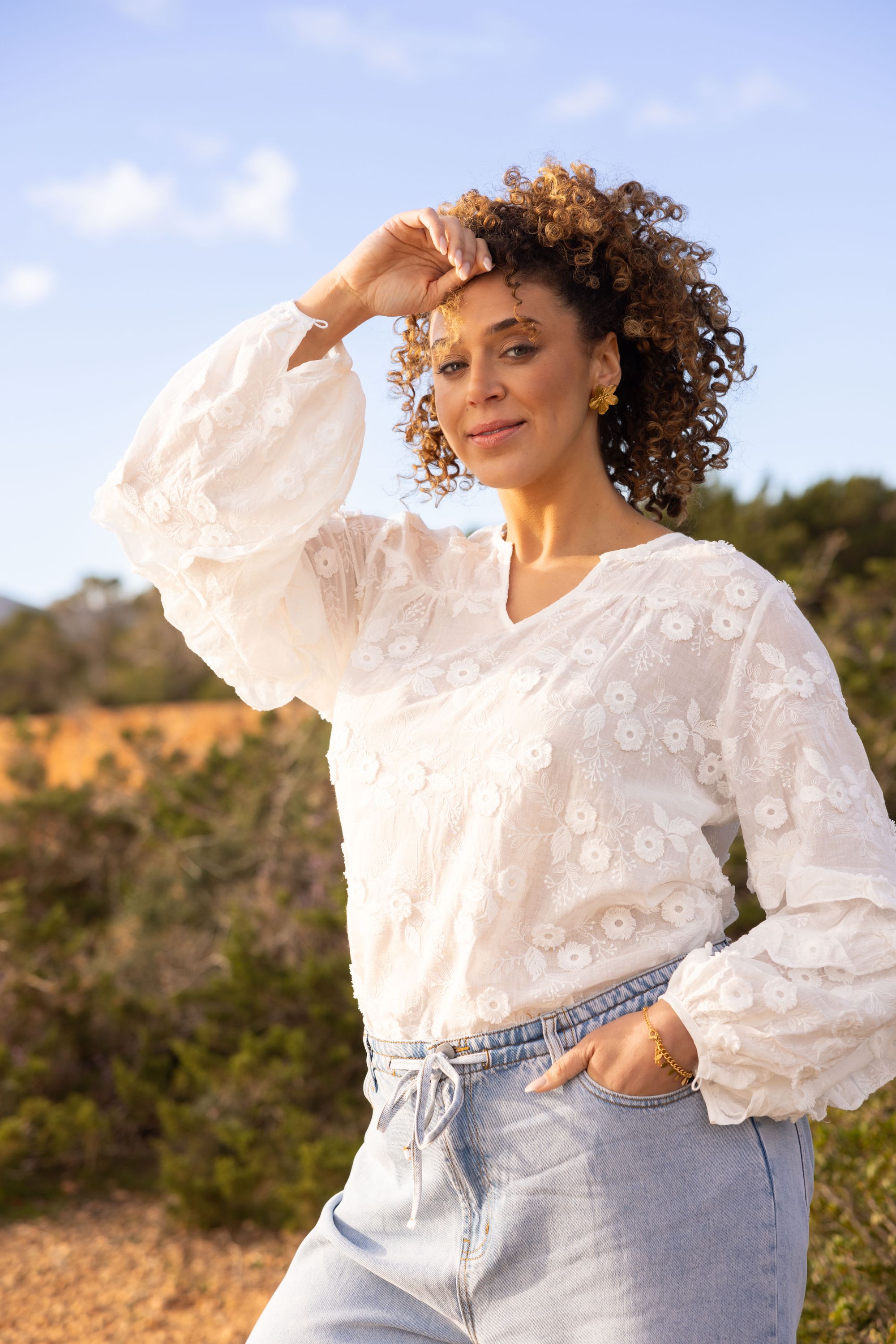 In de natuur draaide het om een combinatie van elegantie en casual stijl. Yoëlle droeg een witte blouse met geborduurde bloemen en een denim broek met een strikceintuur. Deze look was fris en makkelijk te dragen, perfect voor een lentedag buiten.Â