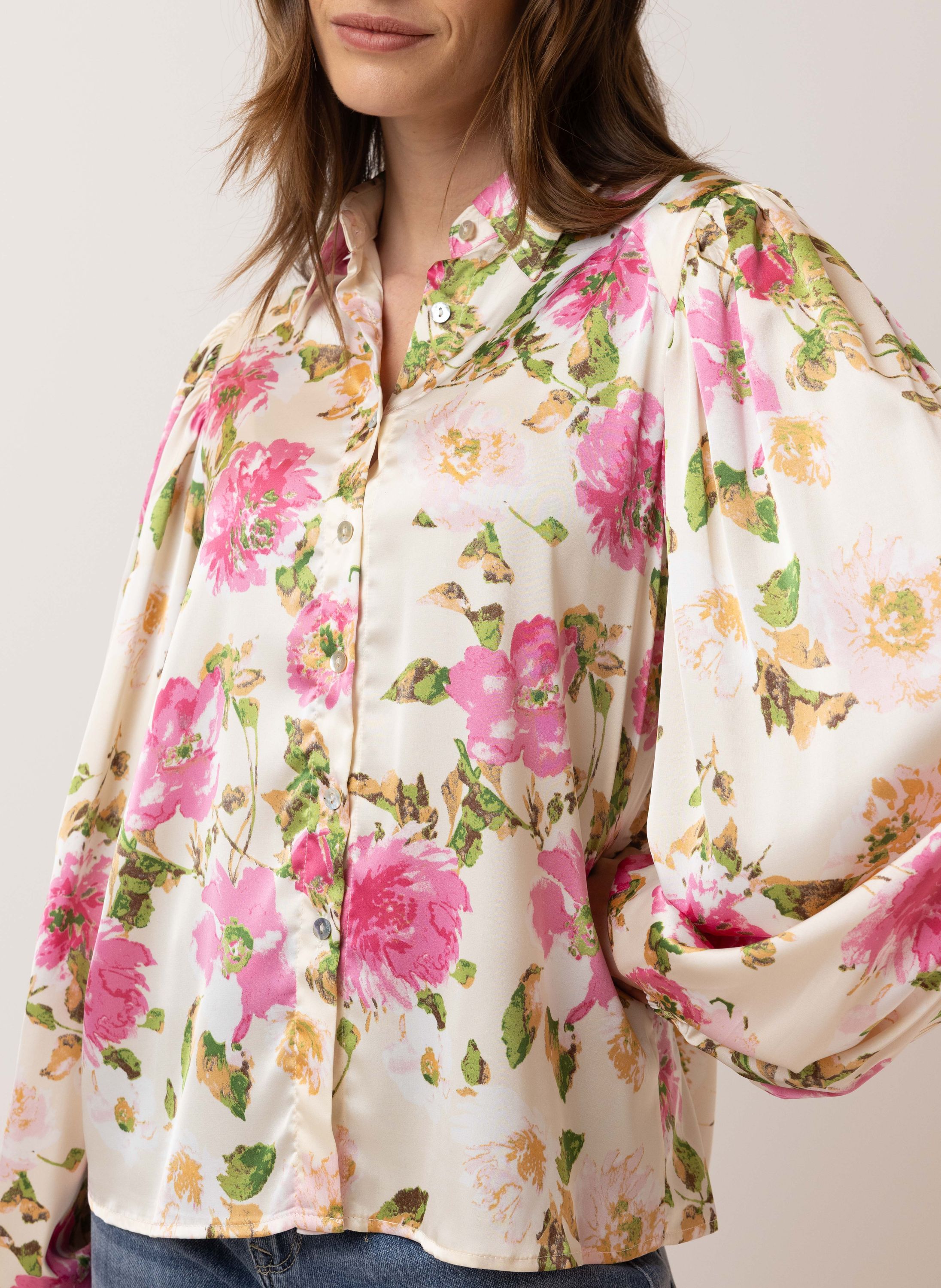 Een luchtige blouse met een speelse bloemenprint gemaakt van een glanzende, zachte stof die luxe uitstraalt. De blouse heeft een klassieke kraag en lange pofmouwen, wat zorgt voor een stijlvolle en vrouwelijke uitstraling. Combineer hem met een denim jeans voor een casual look, of draag hem met een pantalon om een chique outfit te creëren. Perfect voor zowel dagelijkse uitstapjes als feestelijke gelegenheden.