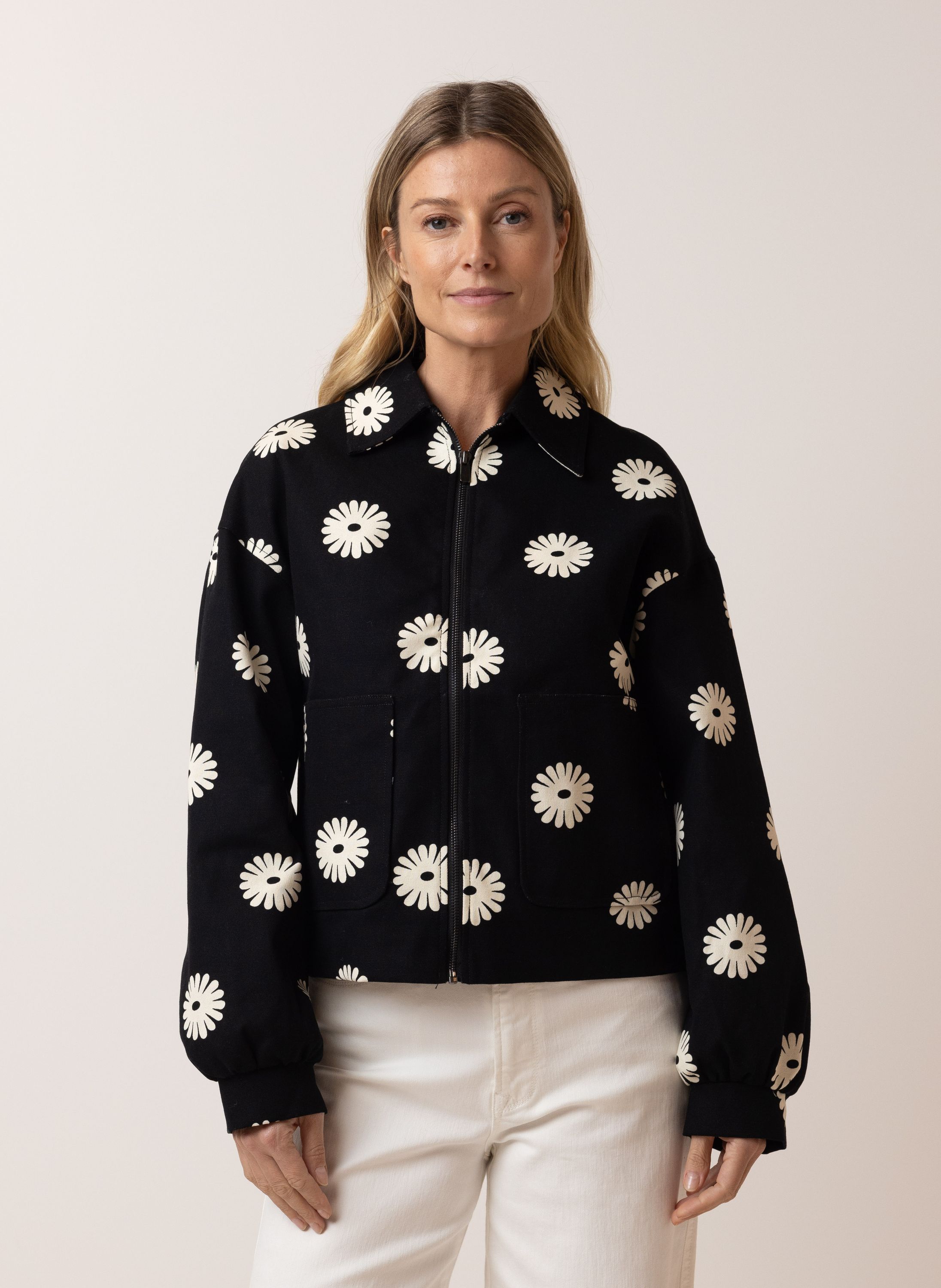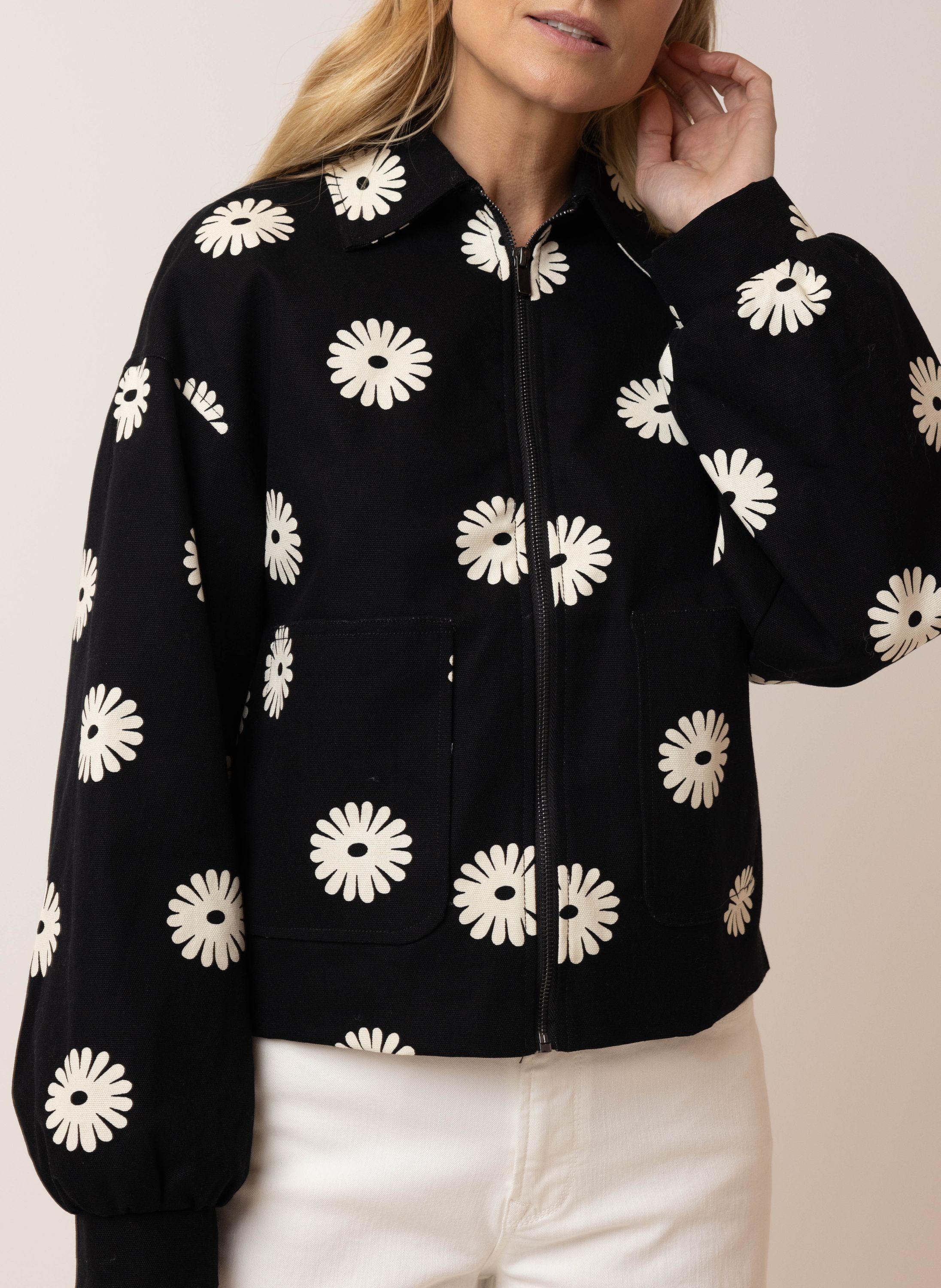 Een speels jasje met een opvallende bloemenprint in contrasterend zwart en wit. Gemaakt van een stevige stof met een comfortabele pasvorm, ideaal om elke outfit een trendy look te geven. De ritssluiting en open zakken zorgen voor een stoere, casual uitstraling, terwijl de ballonmouwen het geheel een vleugje vrouwelijkheid meegeven. Combineer met een witte jeans voor een frisse zwart-wit look of met een denim jeans om iets meer kleur toe te voegen aan je outfit.