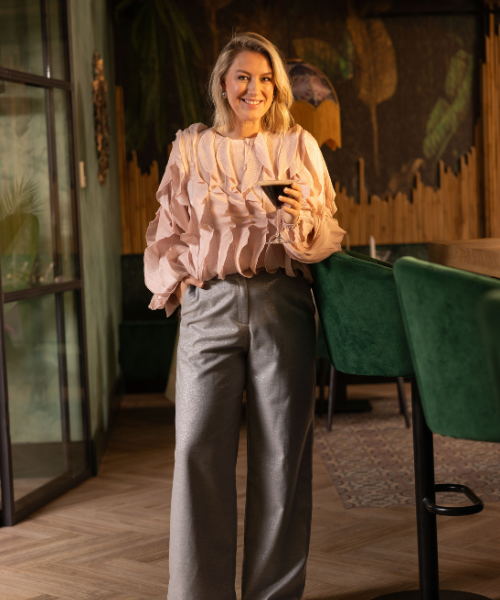 Jeltje zegt over deze look: Met deze look straal je tijdens de feestdagen! De blouse met golvende details is een echte eye catcher, terwijl de subtiele glitter in de broek je outfit nét iets extra's geeft.