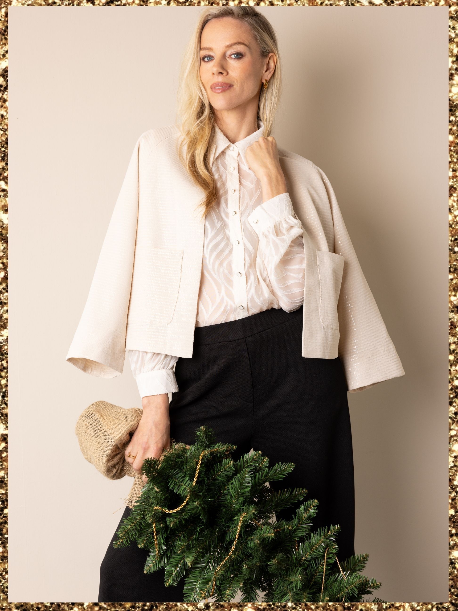 Voor wie houdt van een subtielere kerstoutfit is deze look ideaal. Een lichte blazer over een transparante blouse met structuur, gecombineerd met een zwarte pantalon, zorgt voor een stijlvolle en moderne uitstraling. Perfect voor een kerstborrel op kantoor of een diner met familie.