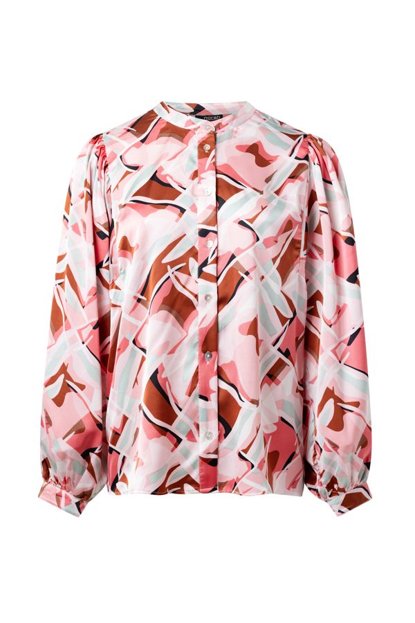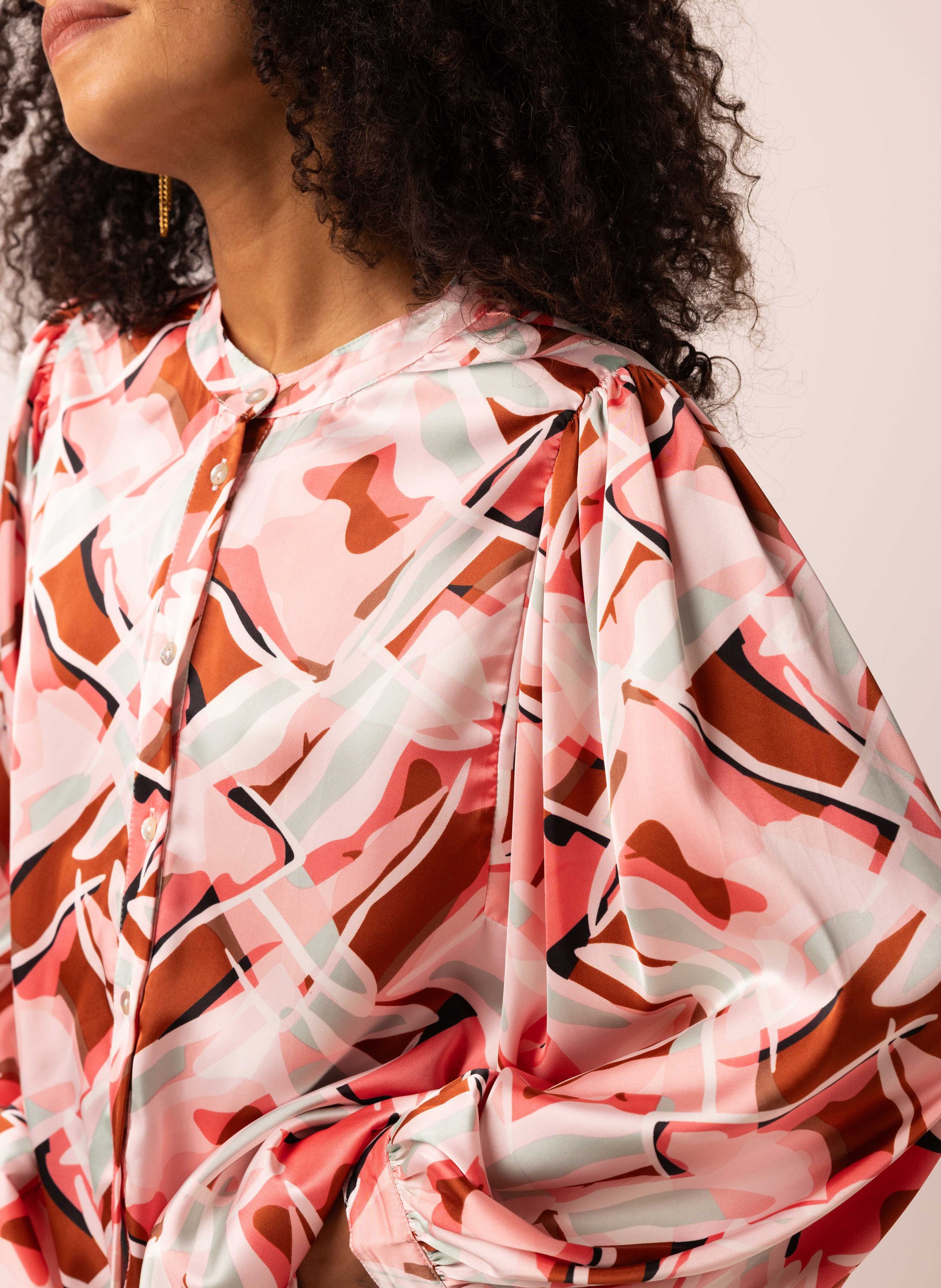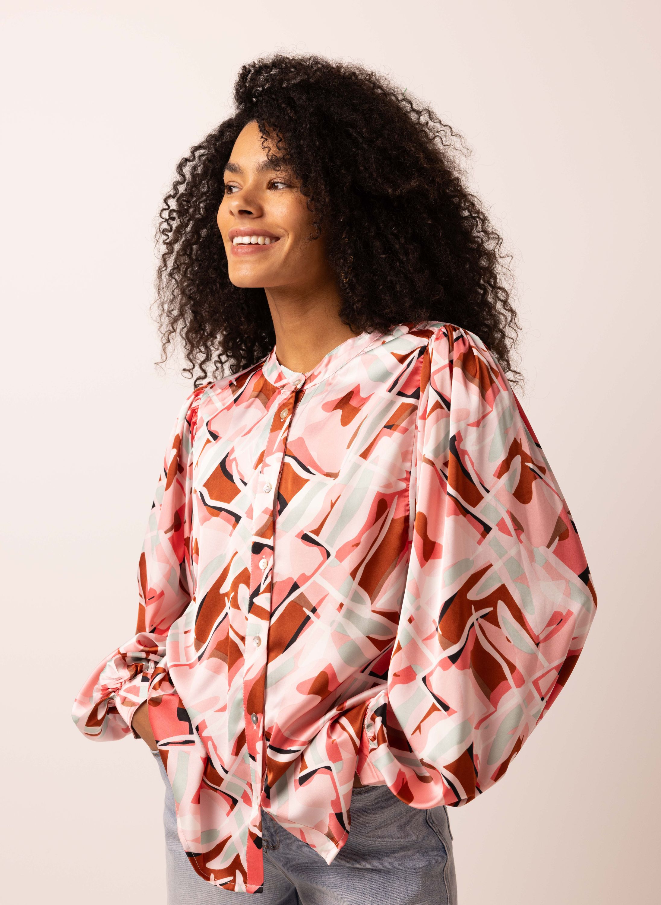 Deze glanzende blouse heeft een ronde hals, lange pofmouwen en een knoopsluiting. Dit item is exclusief verkrijgbaar in geselecteerde winkels en online. Controleer de winkelvoorraad om de beschikbaarheid in een winkel bij jou in de buurt te bekijken.