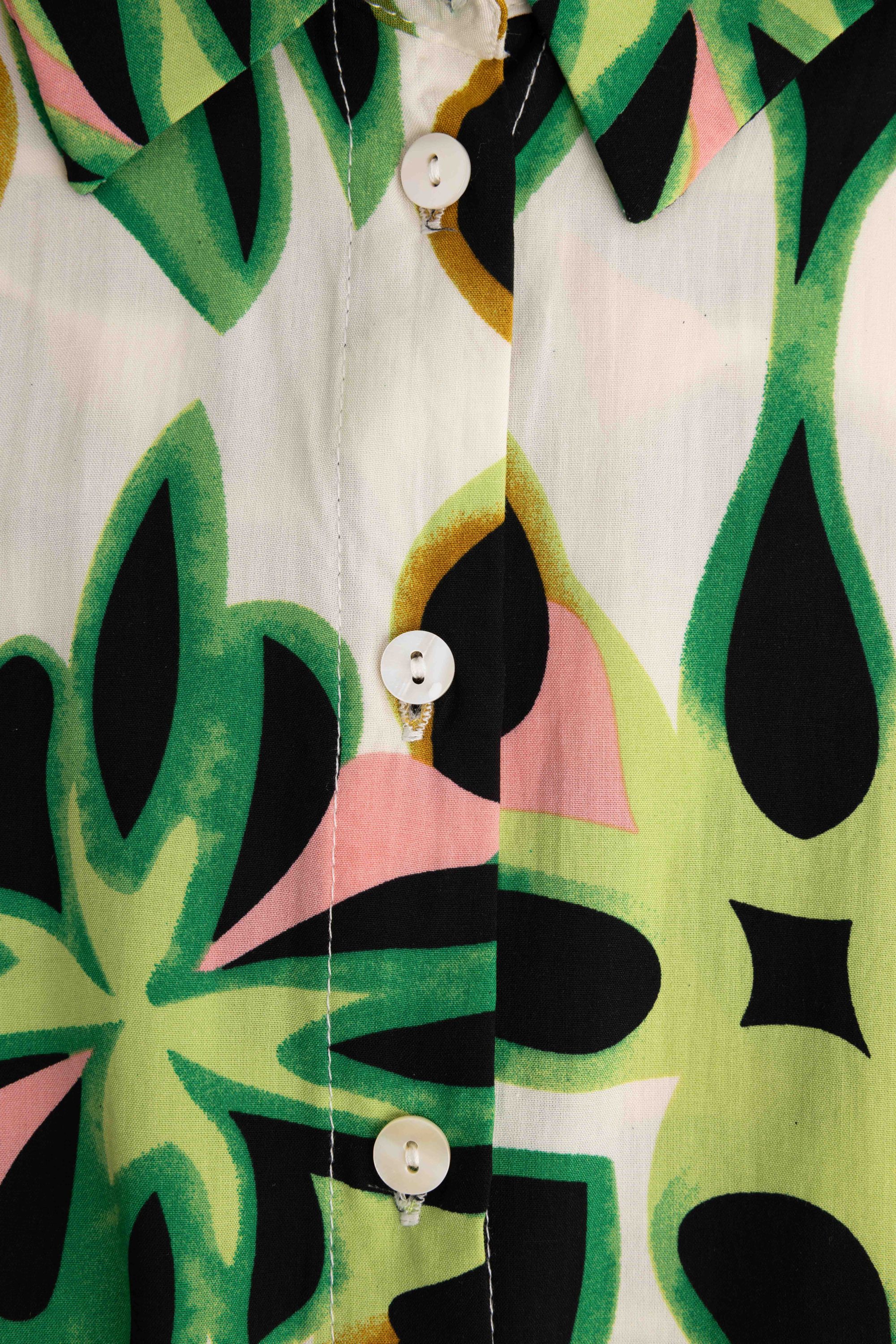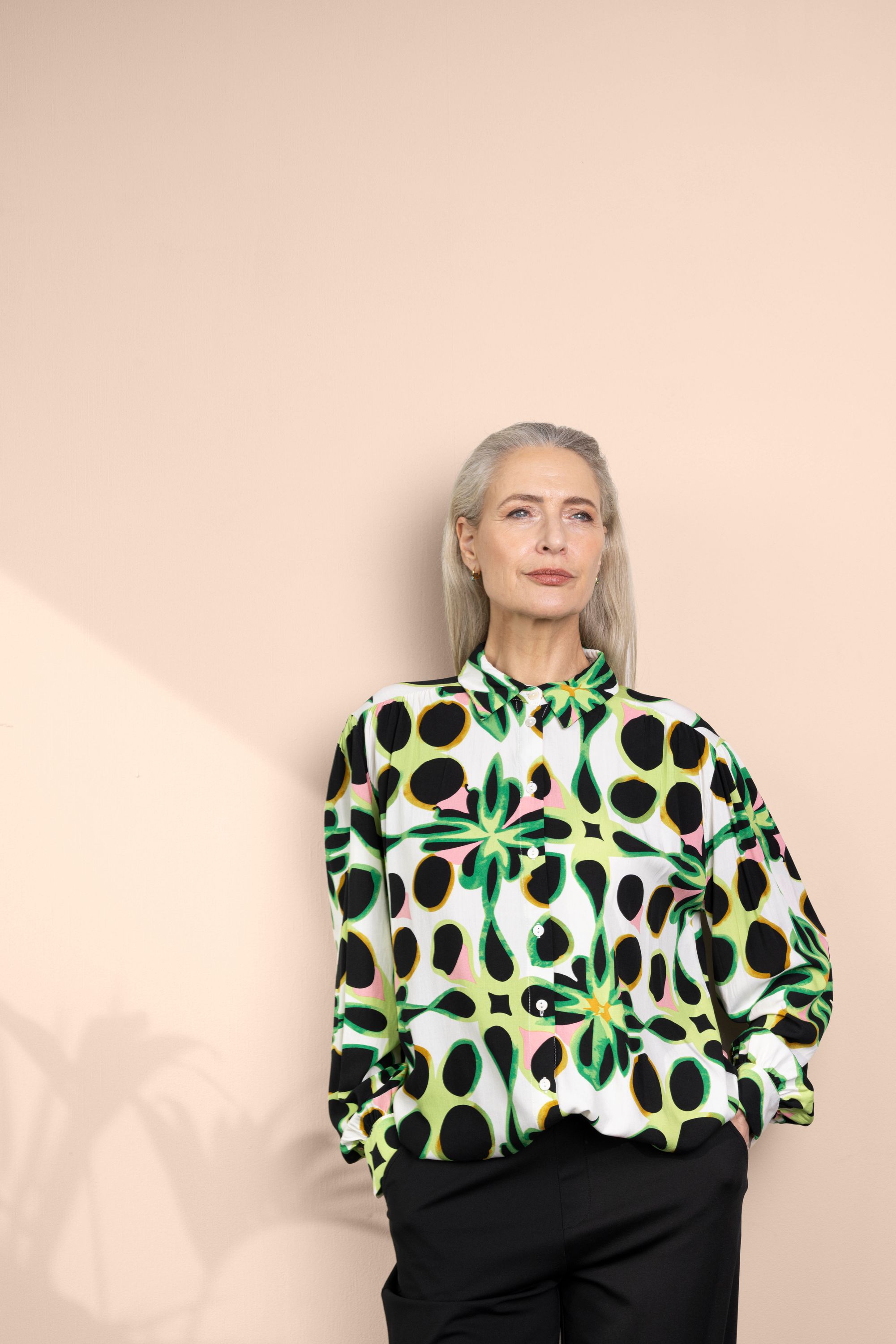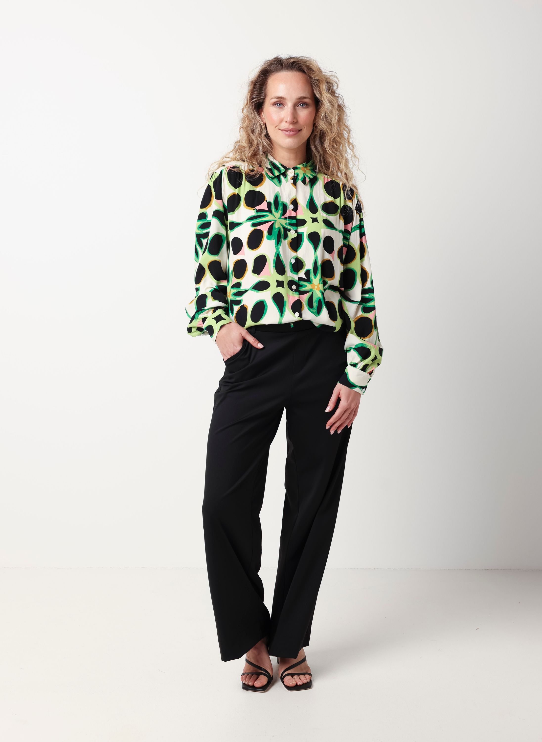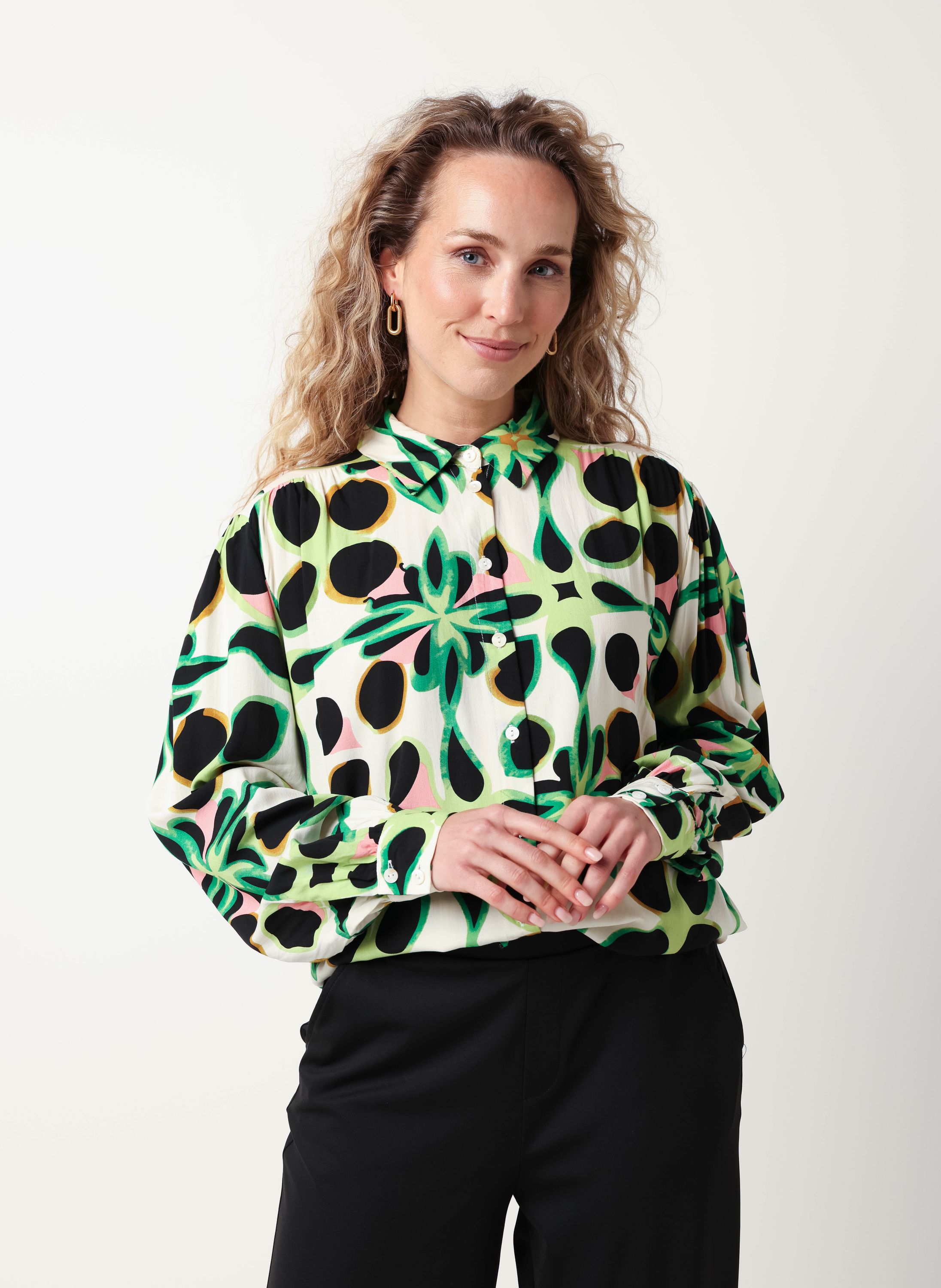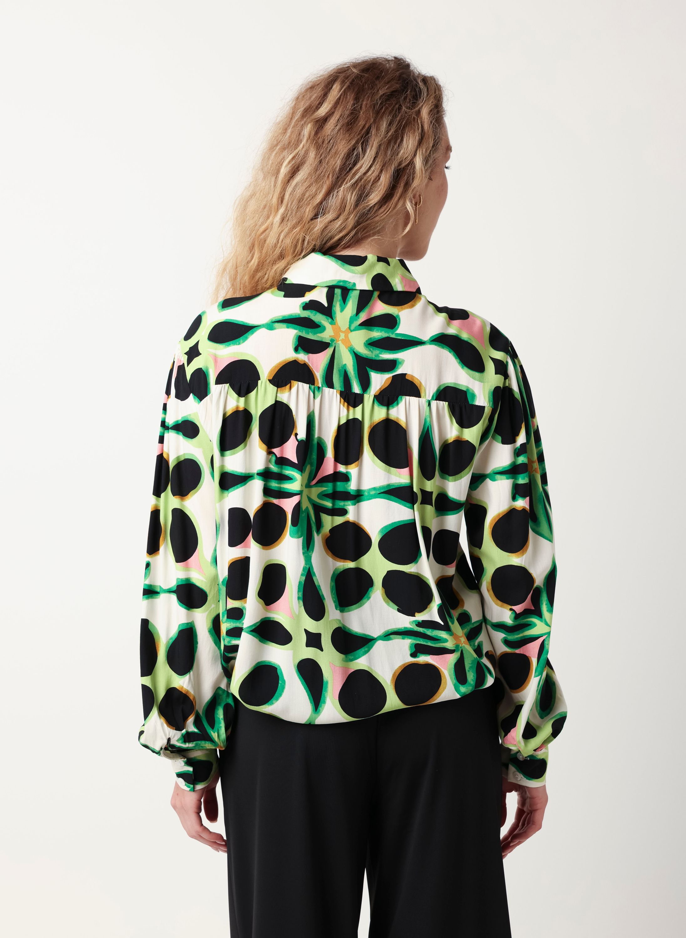 Deze blouse met klassieke kraag heeft lange mouwen, een knoopsluiting en een trekkoord aan de onderzijde voor een speels effect.