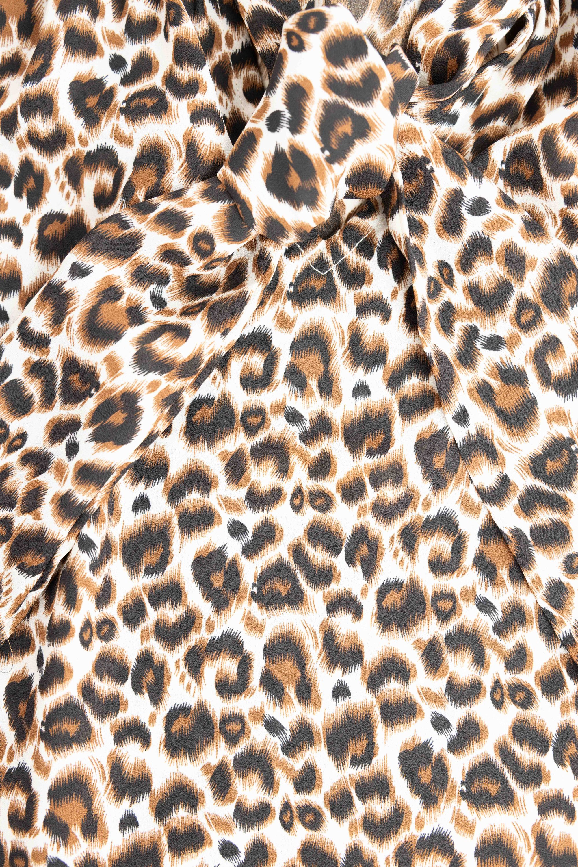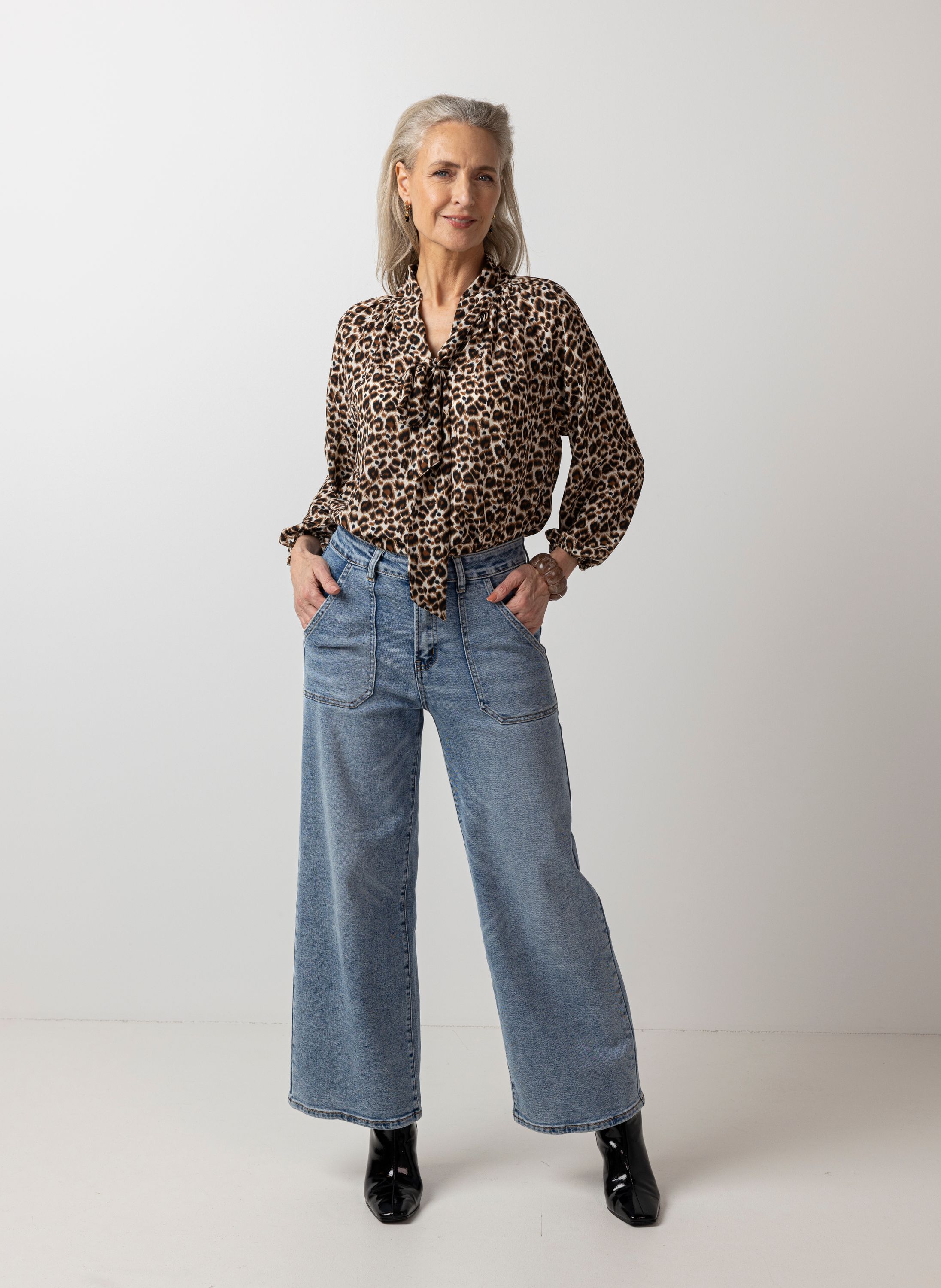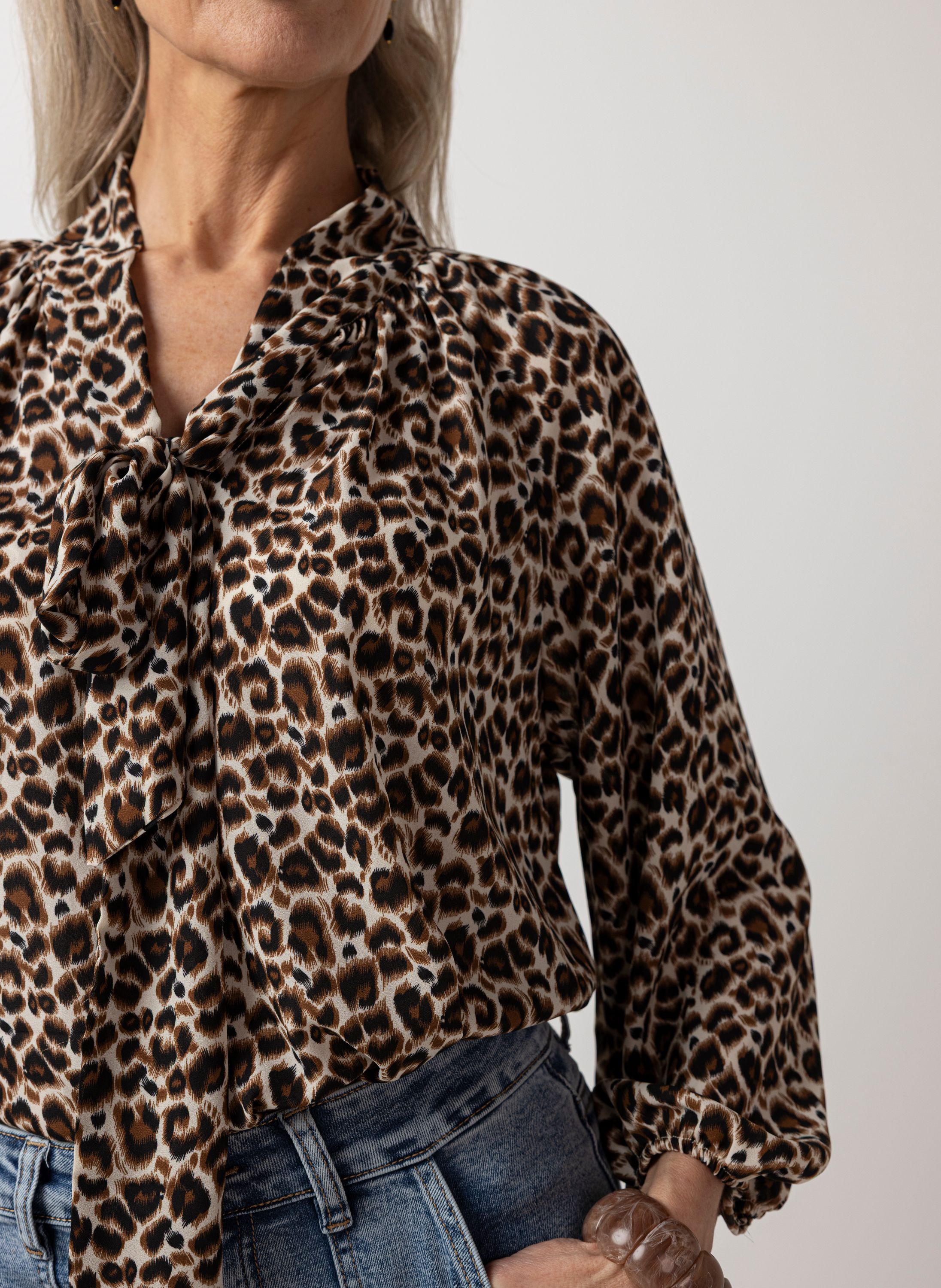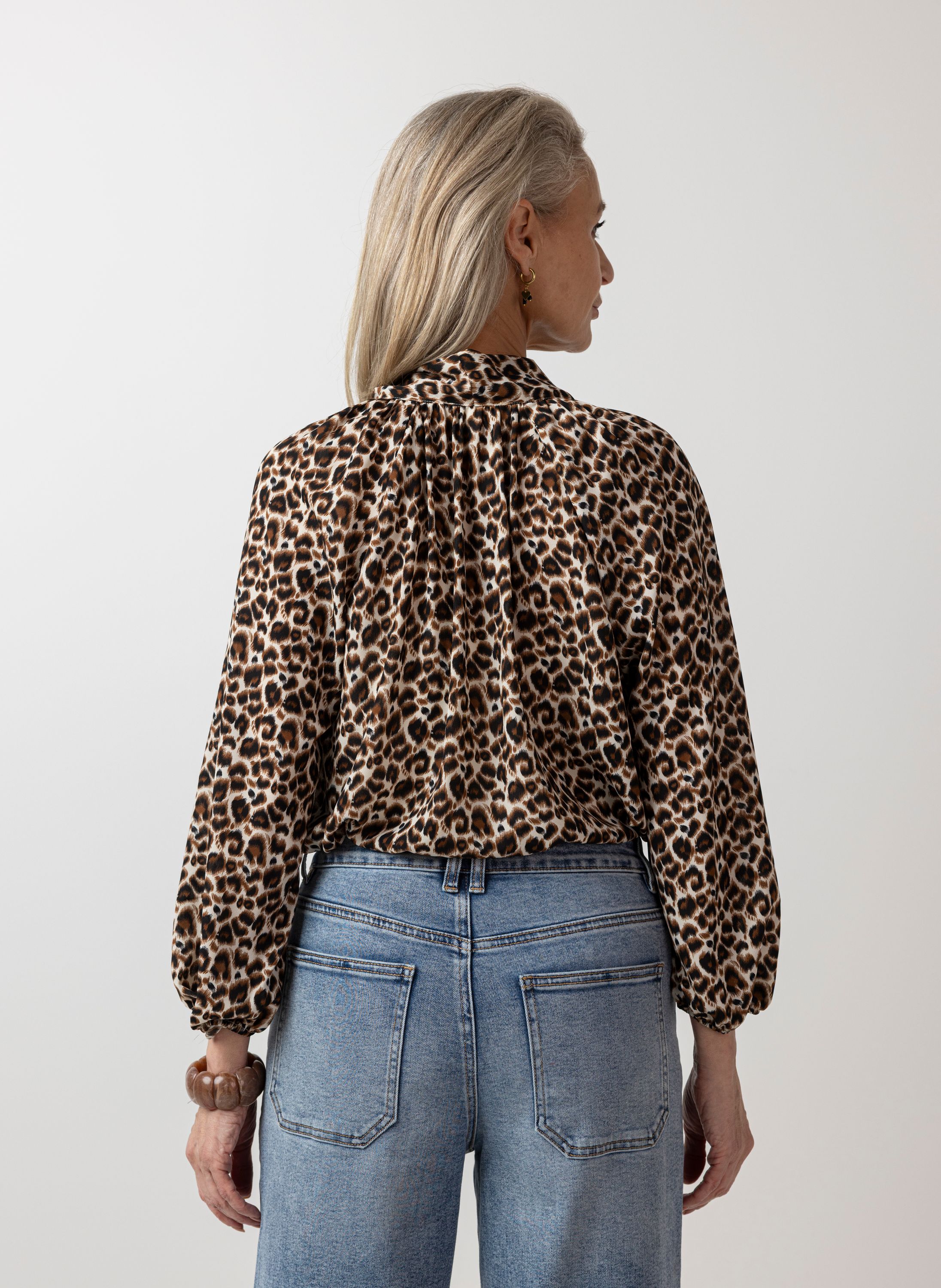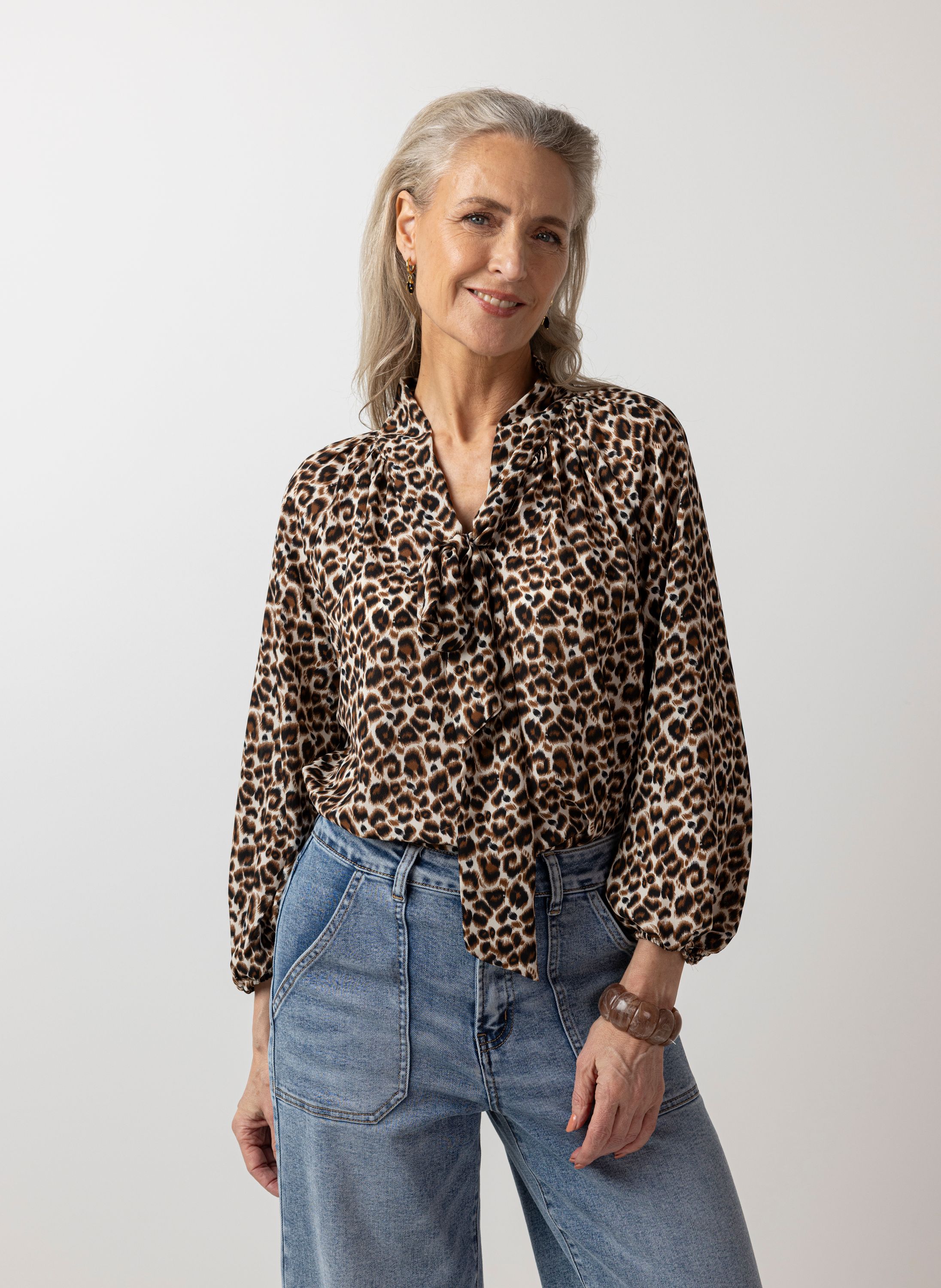 Deze blouse met V-hals heeft een strikkoord en lange mouwen met elastische boorden.