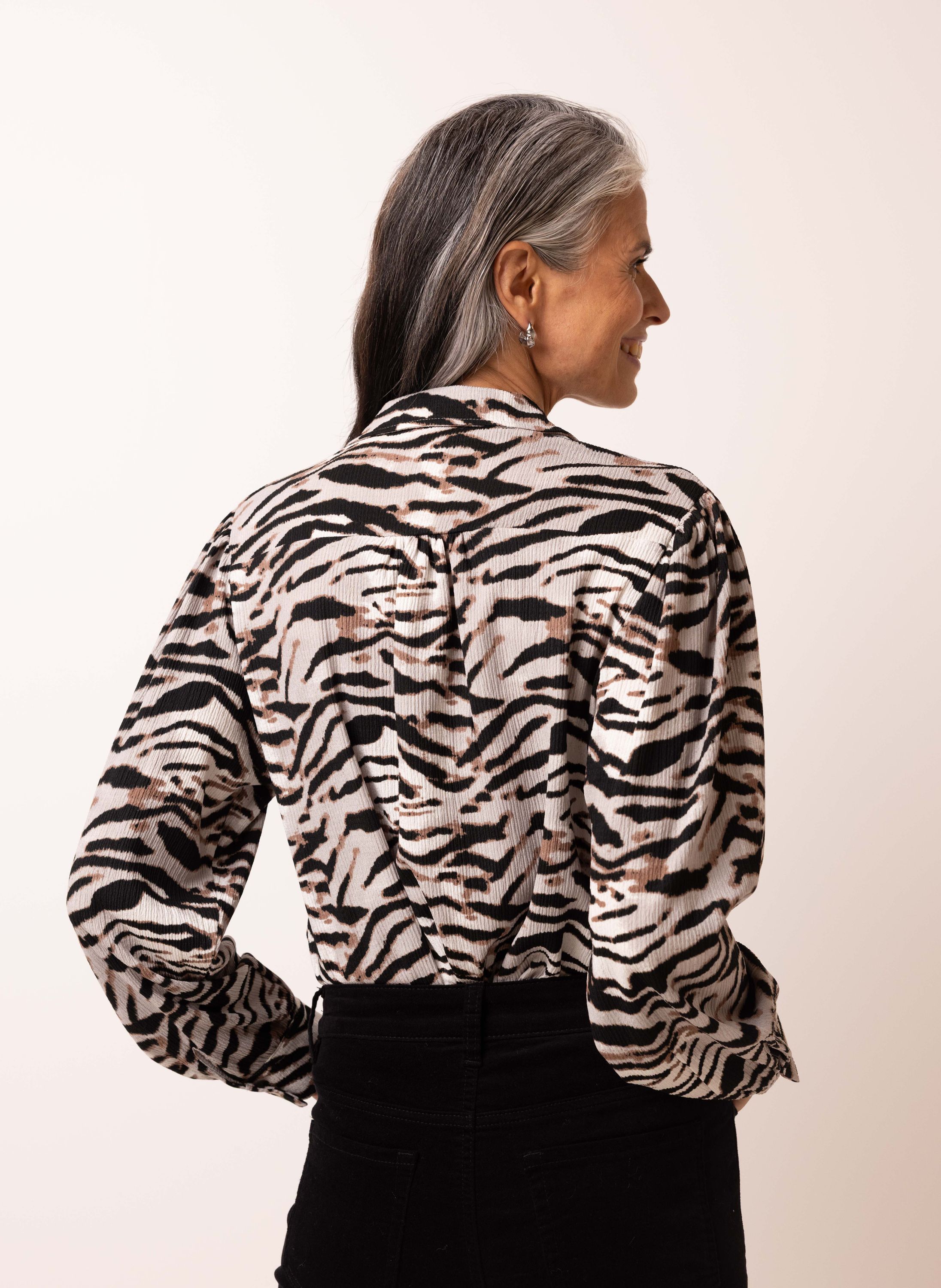 Deze blouse heeft een klassieke kraag, knoopsluiting en lange pofmouwen.