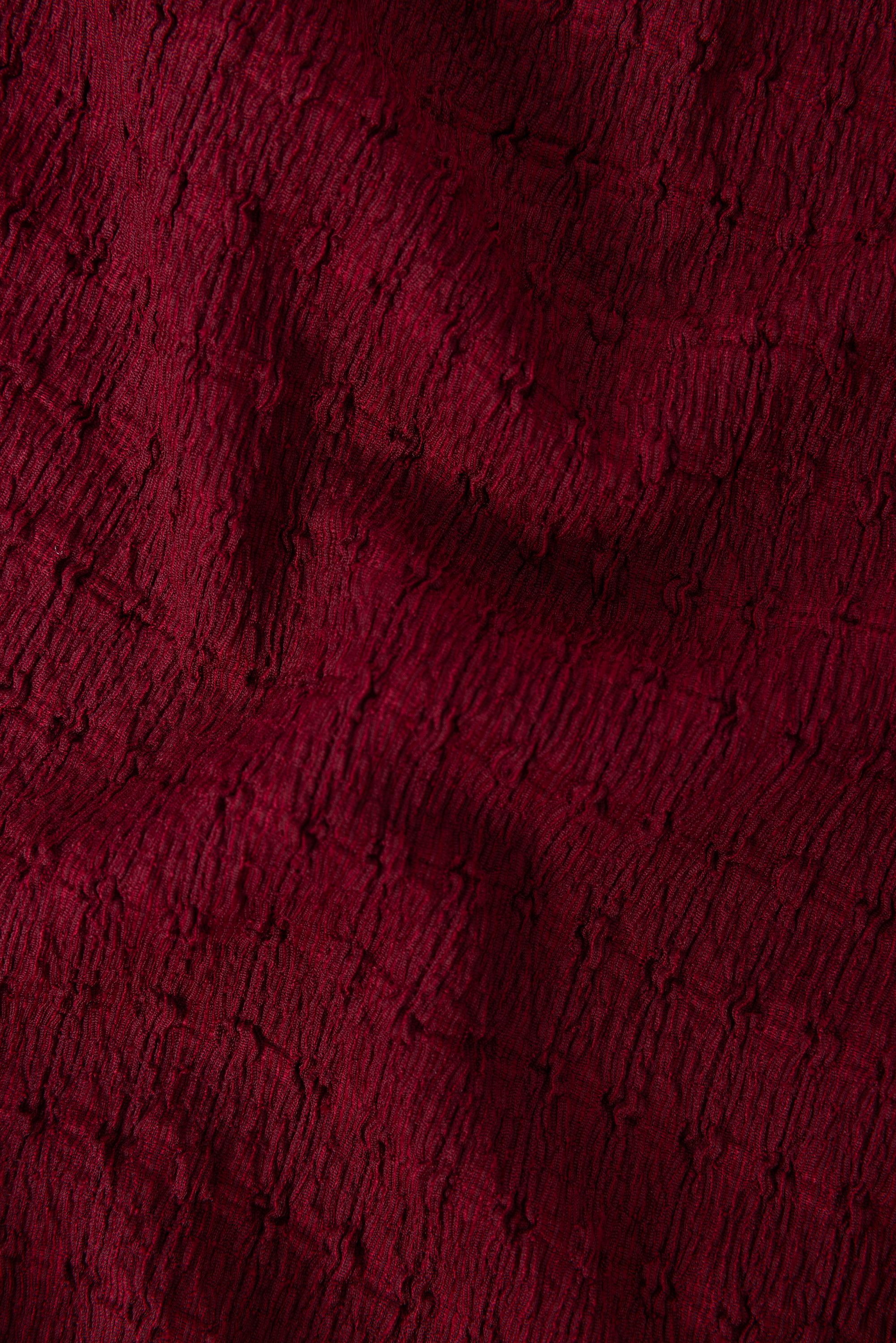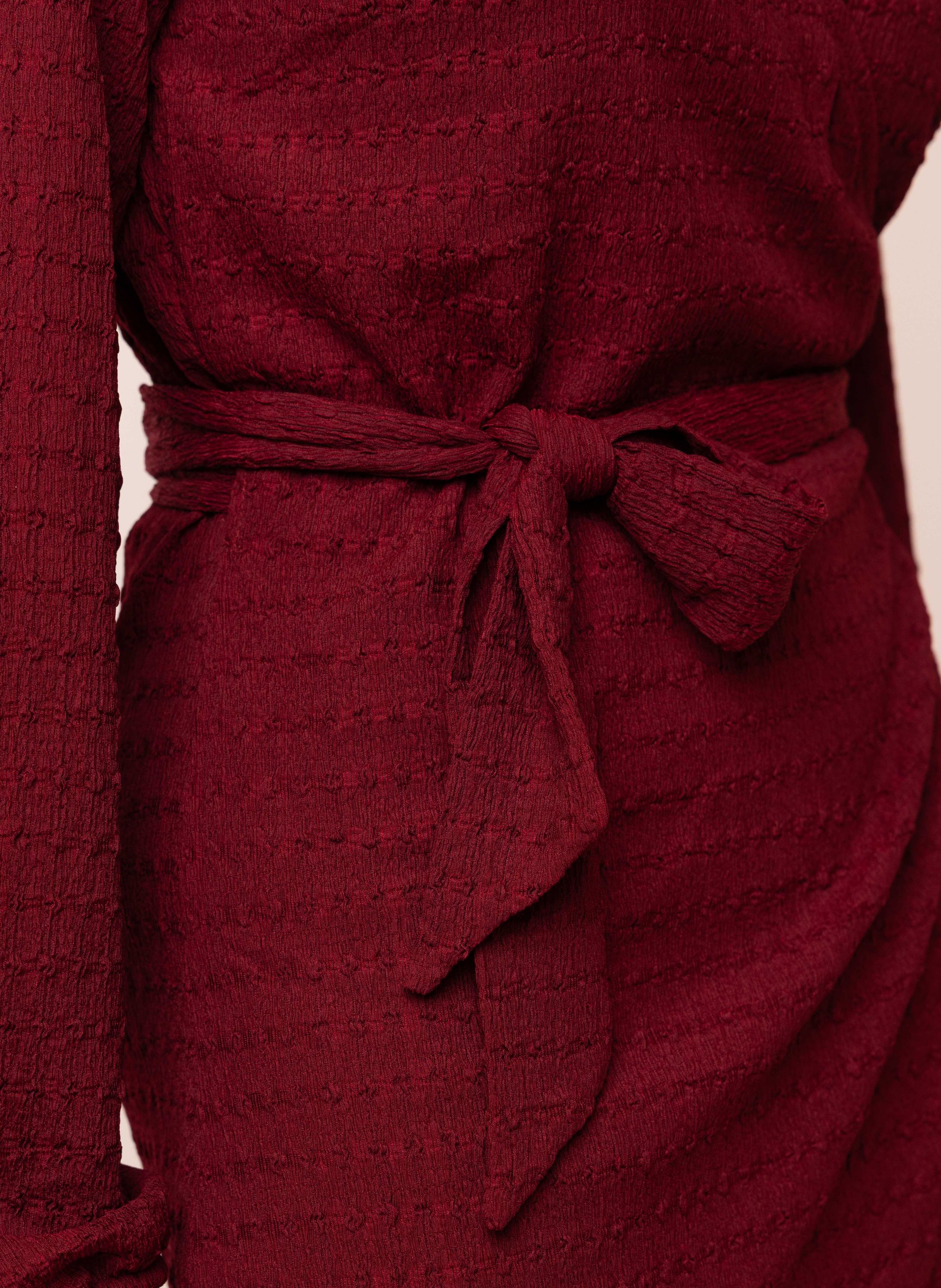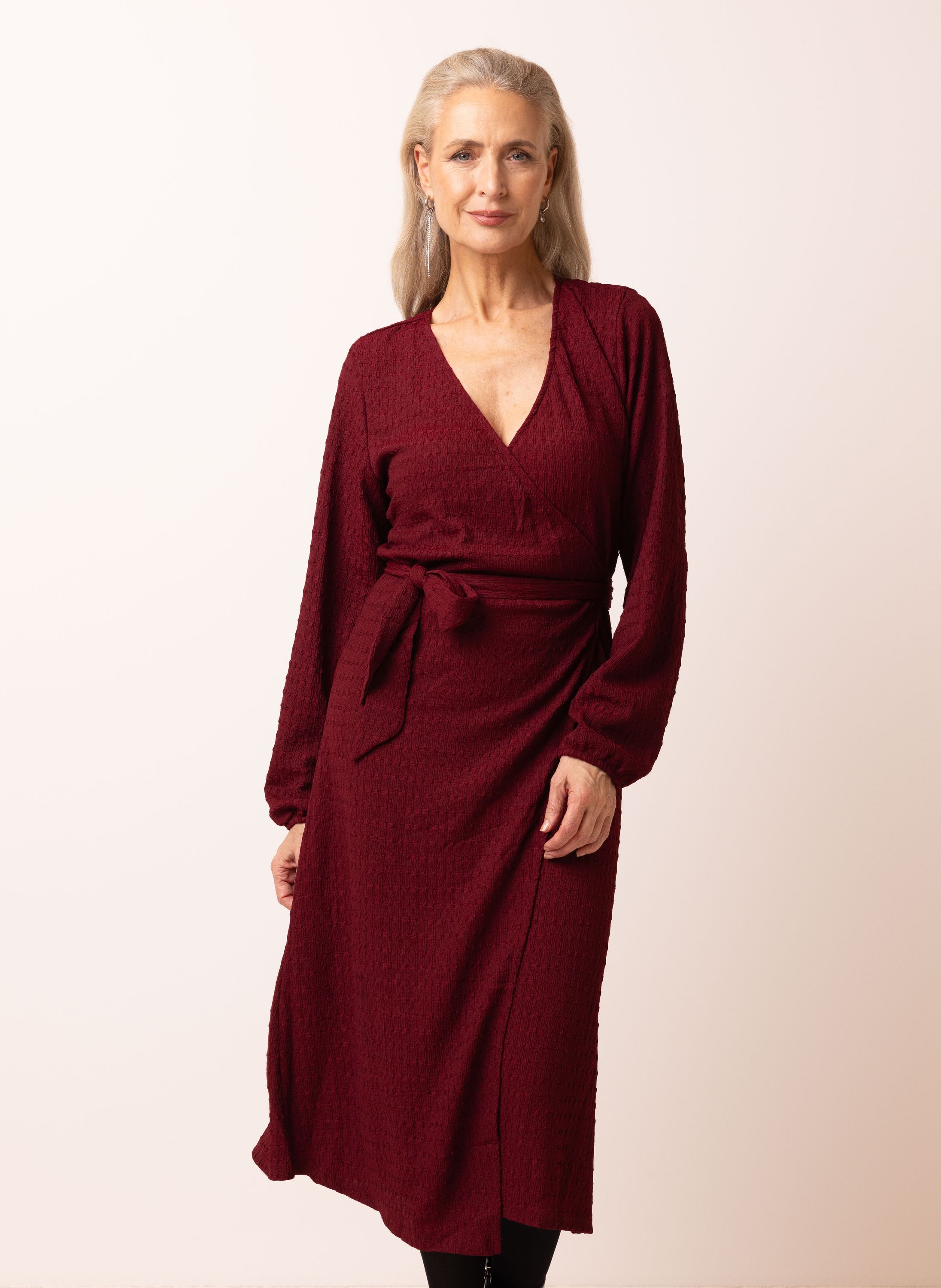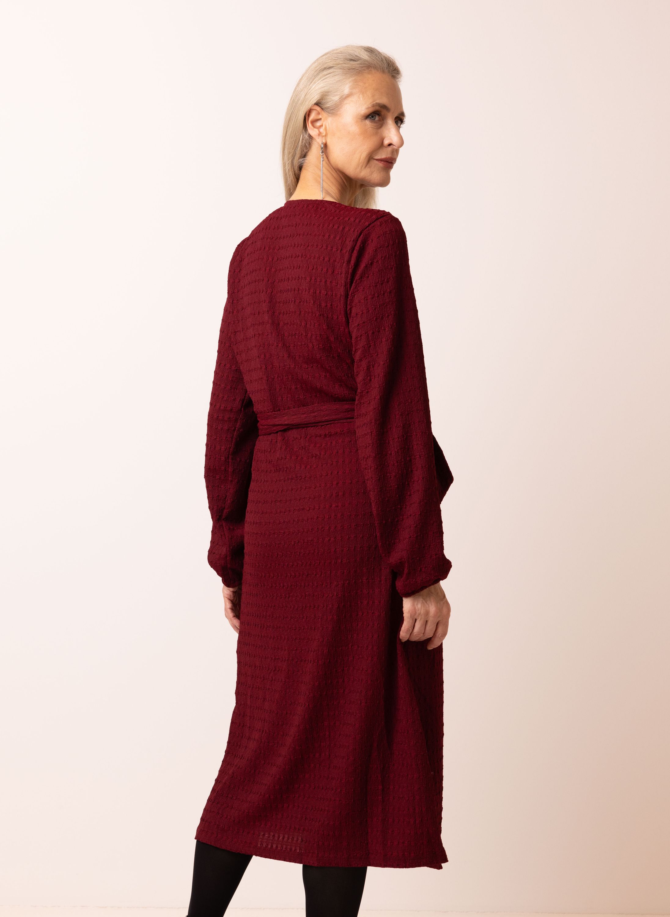 Deze jurk met V-hals, lange mouwen met elastische boorden en overslag met strik zorgt voor een vrouwelijke uitstraling.