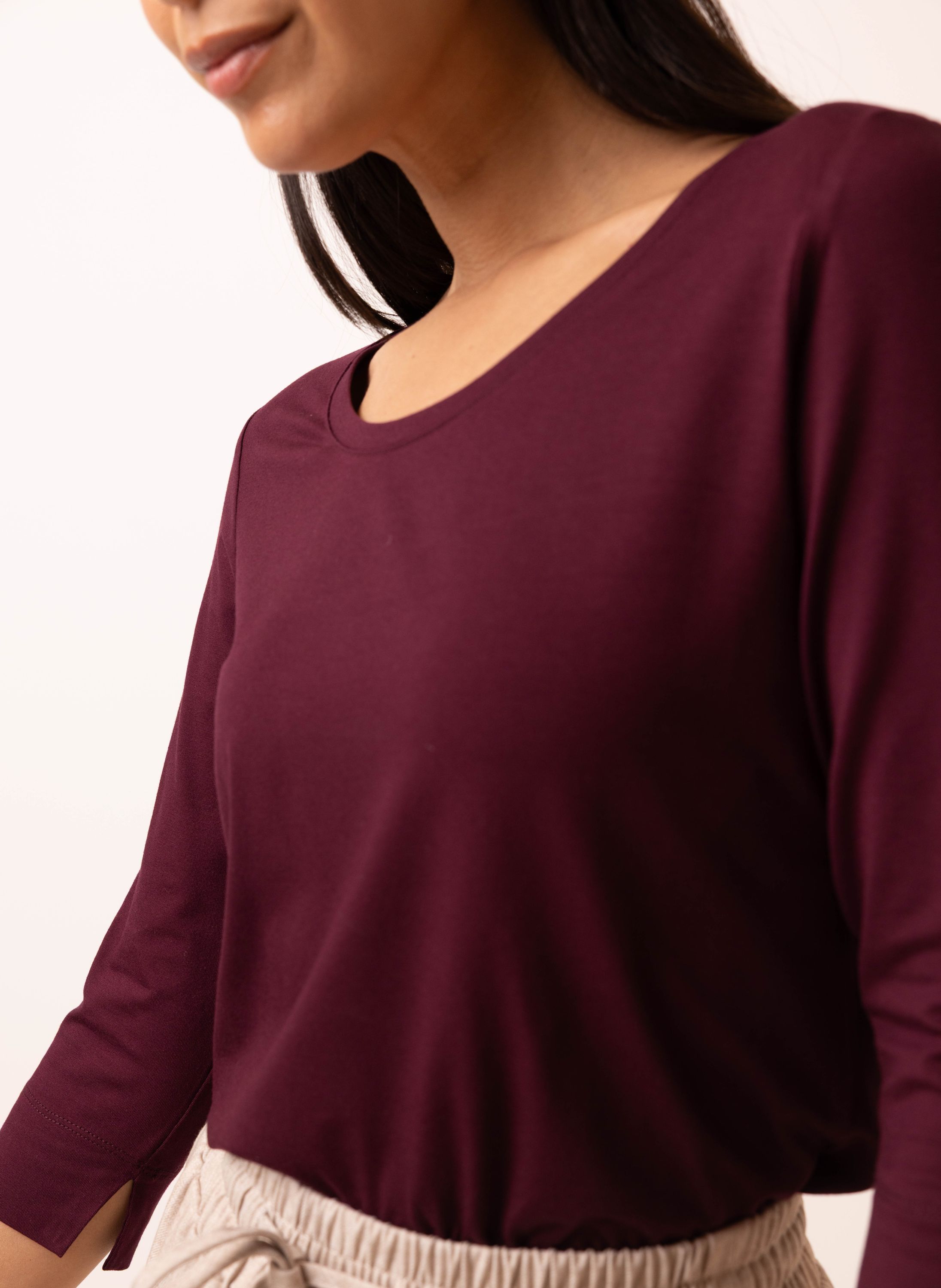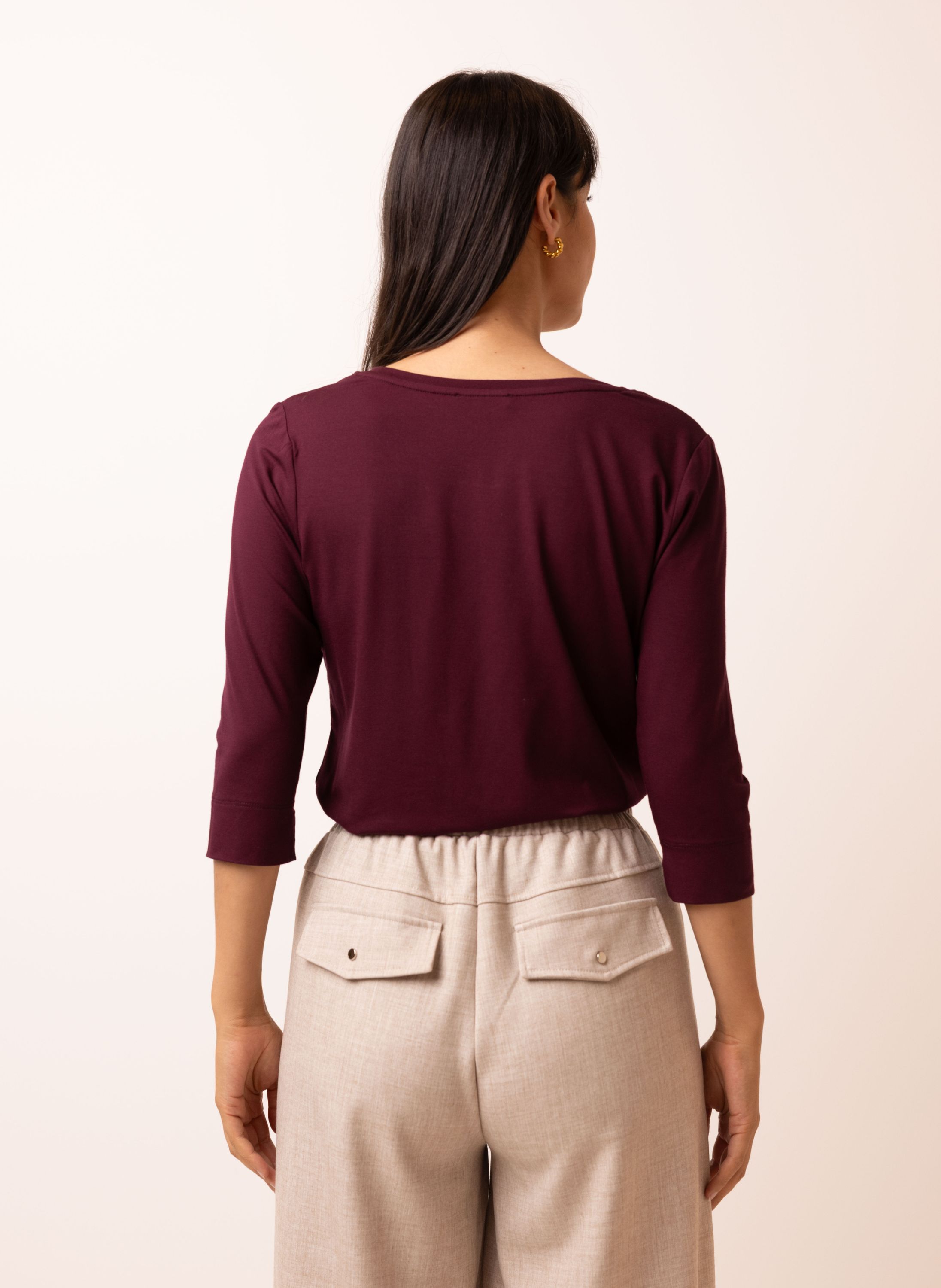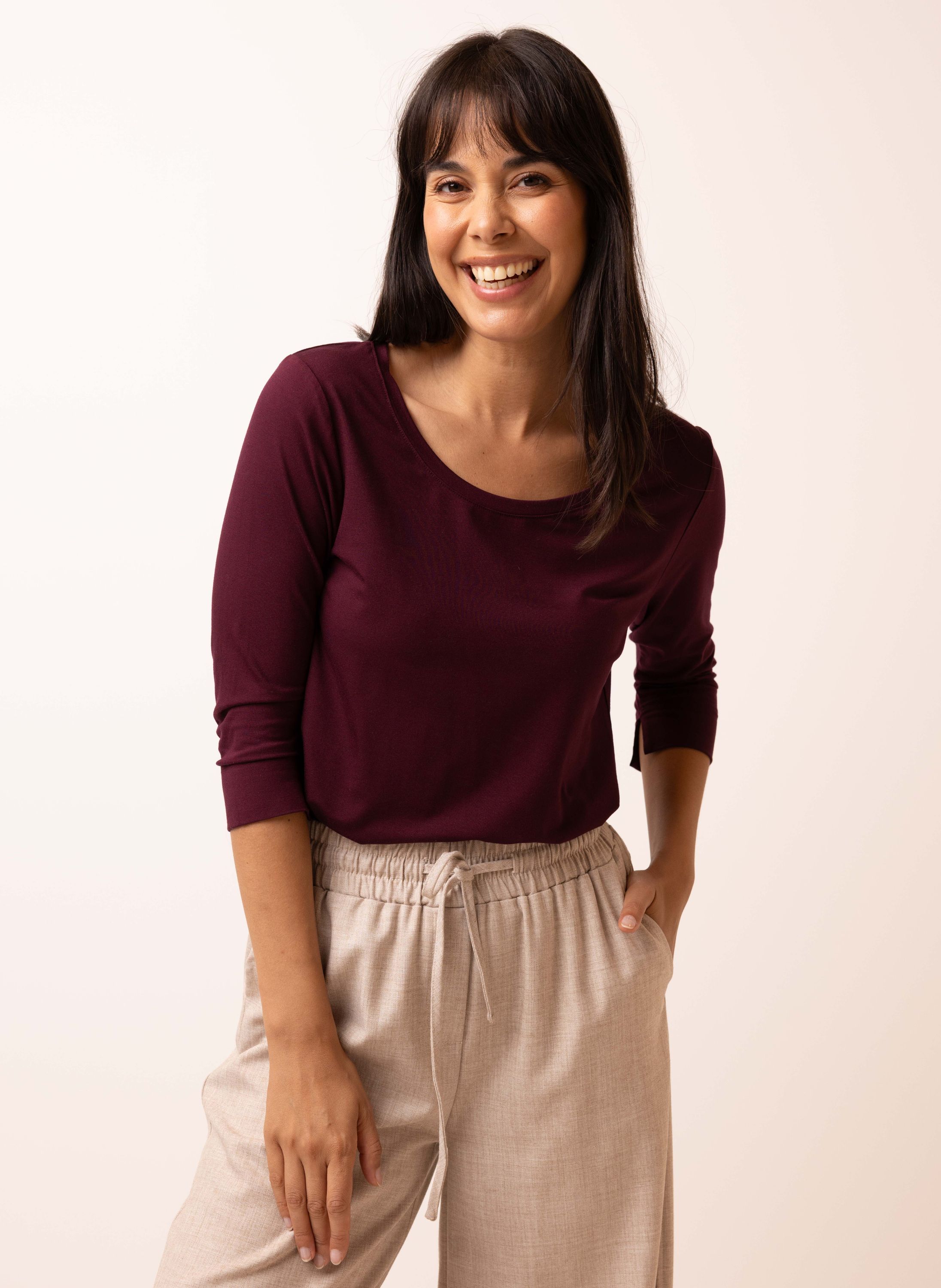 Dit shirt met wijde ronde hals heeft driekwart mouwen met splitjes.