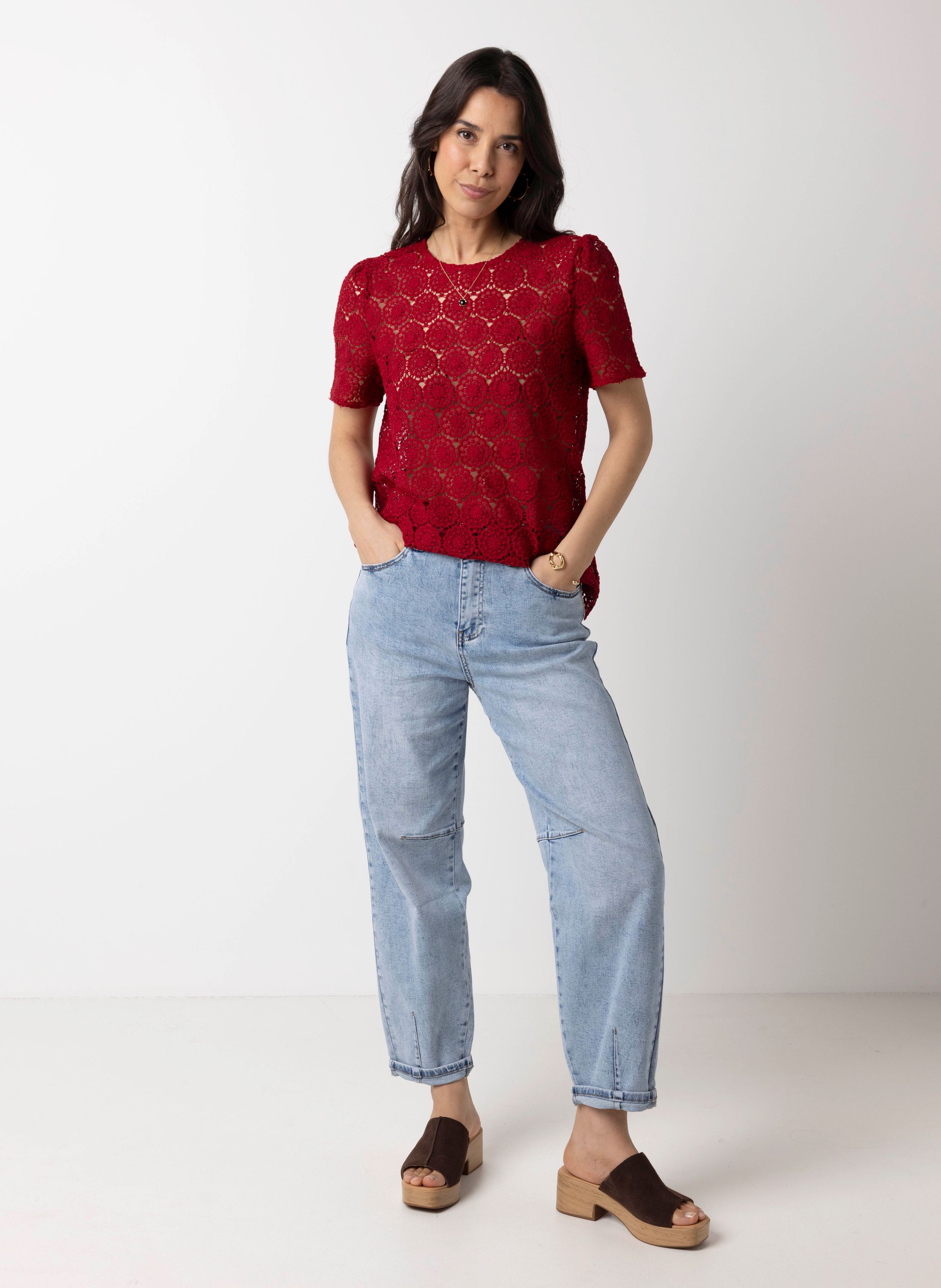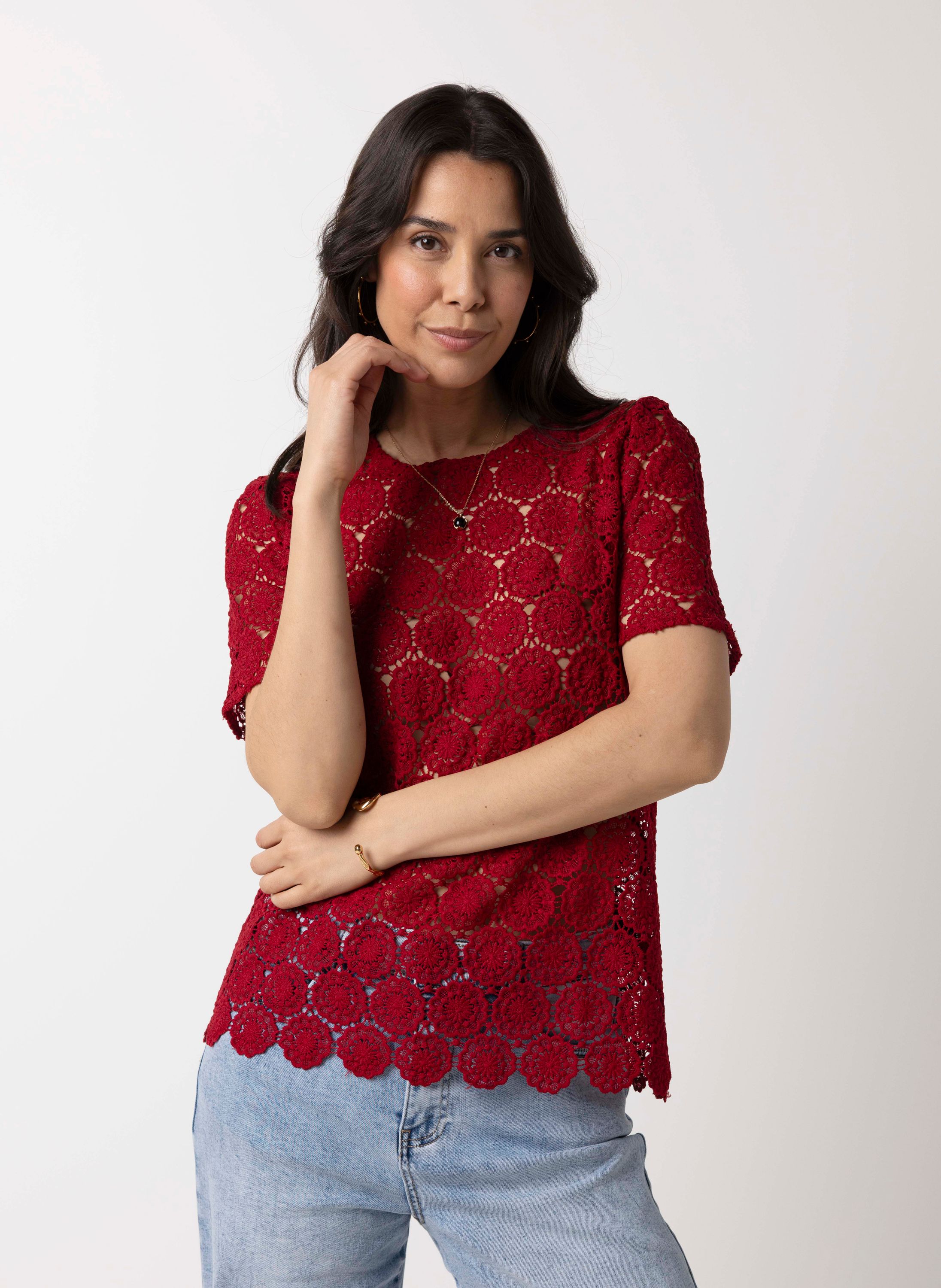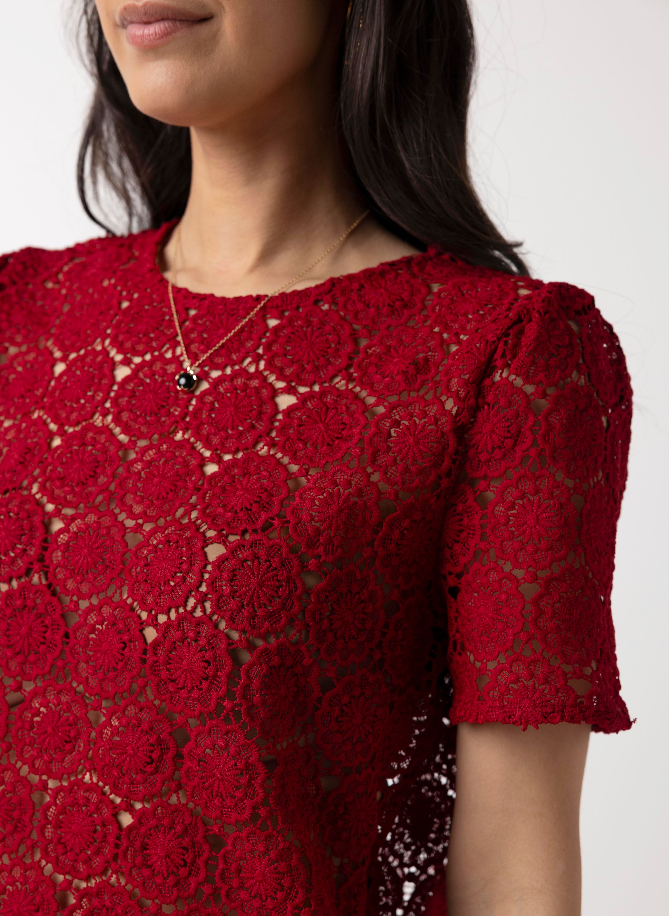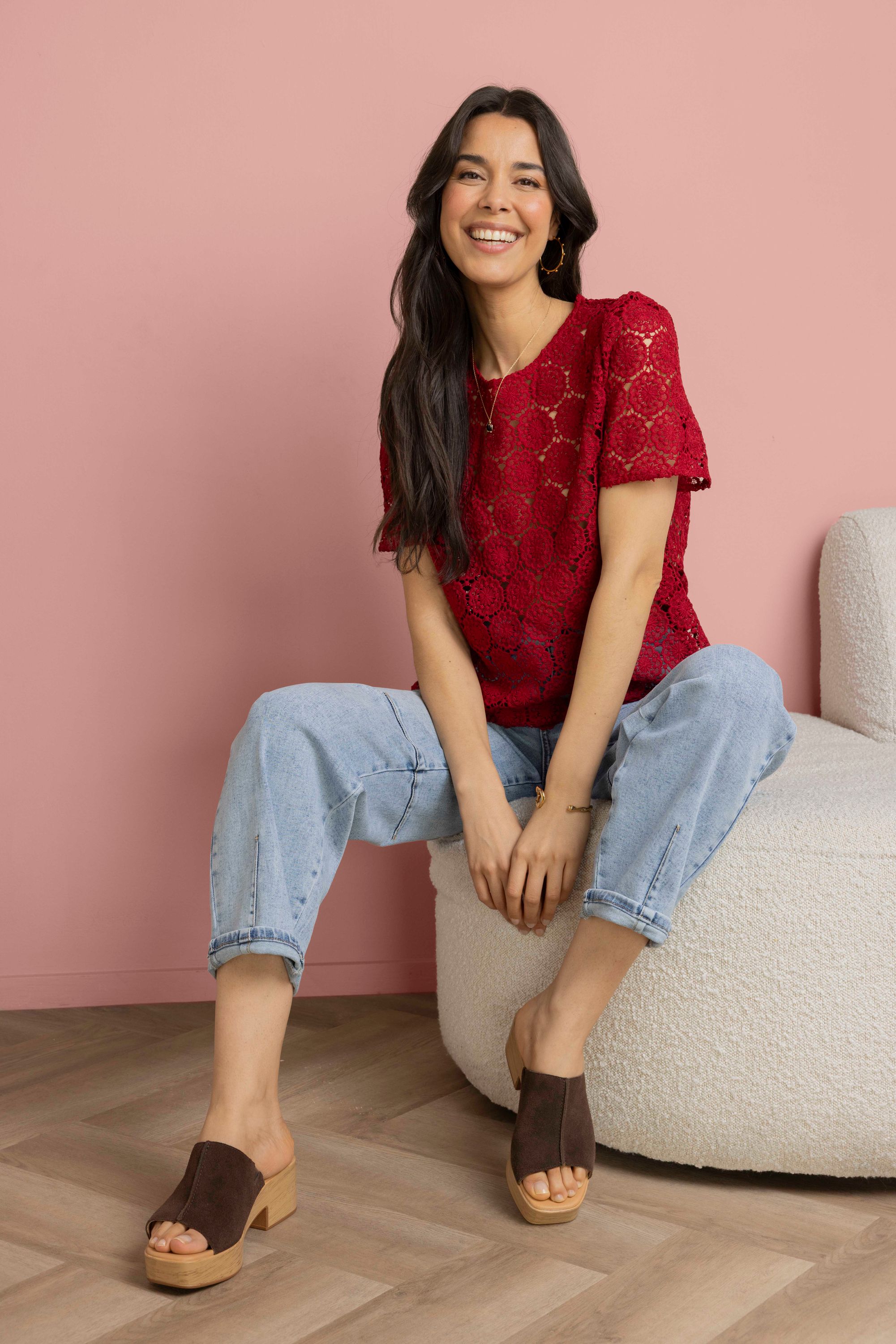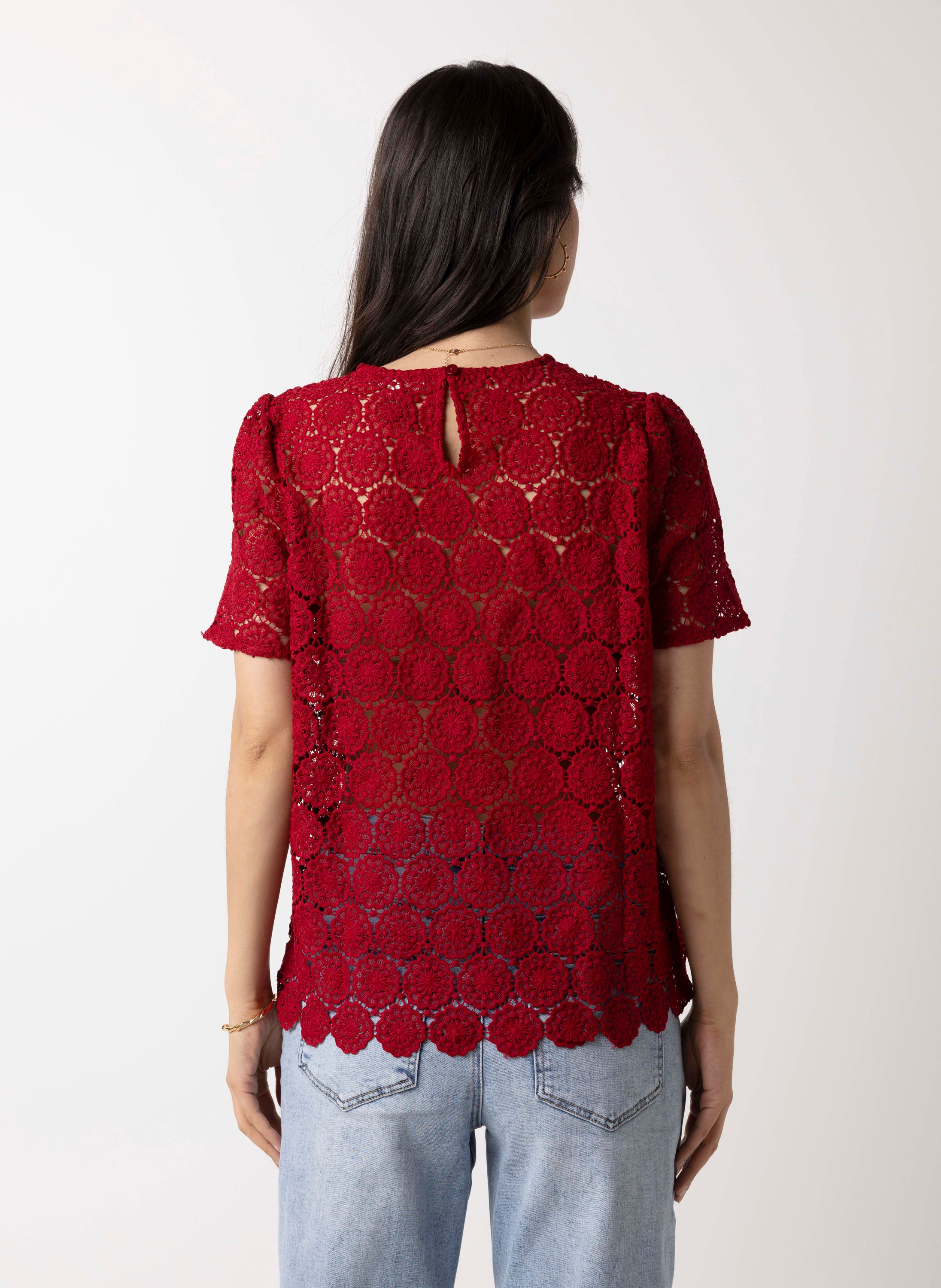 Dit kanten shirt met ronde hals en korte mouwen schijnt licht door. We adviseren je er een Marianne top onder te dragen.