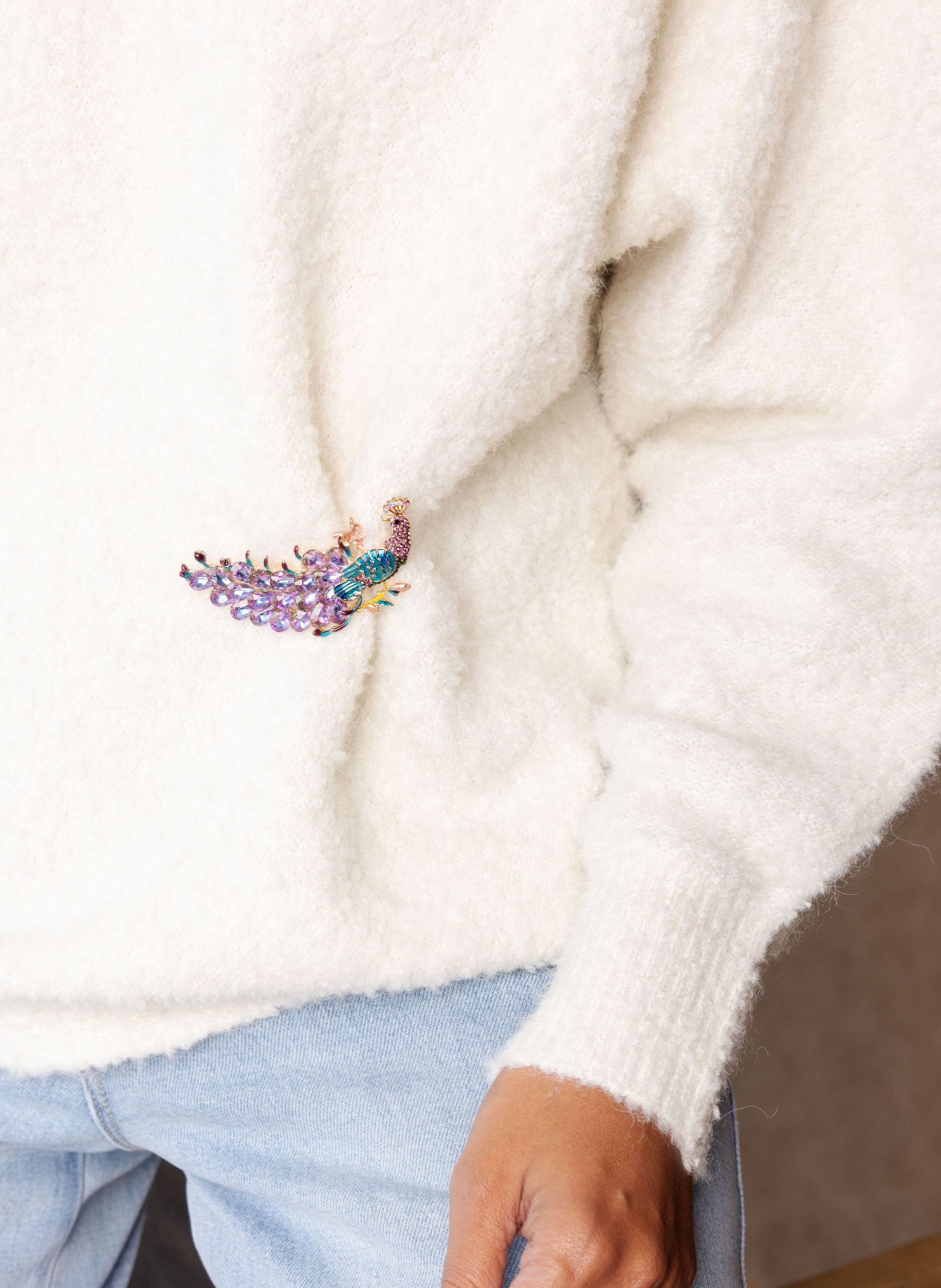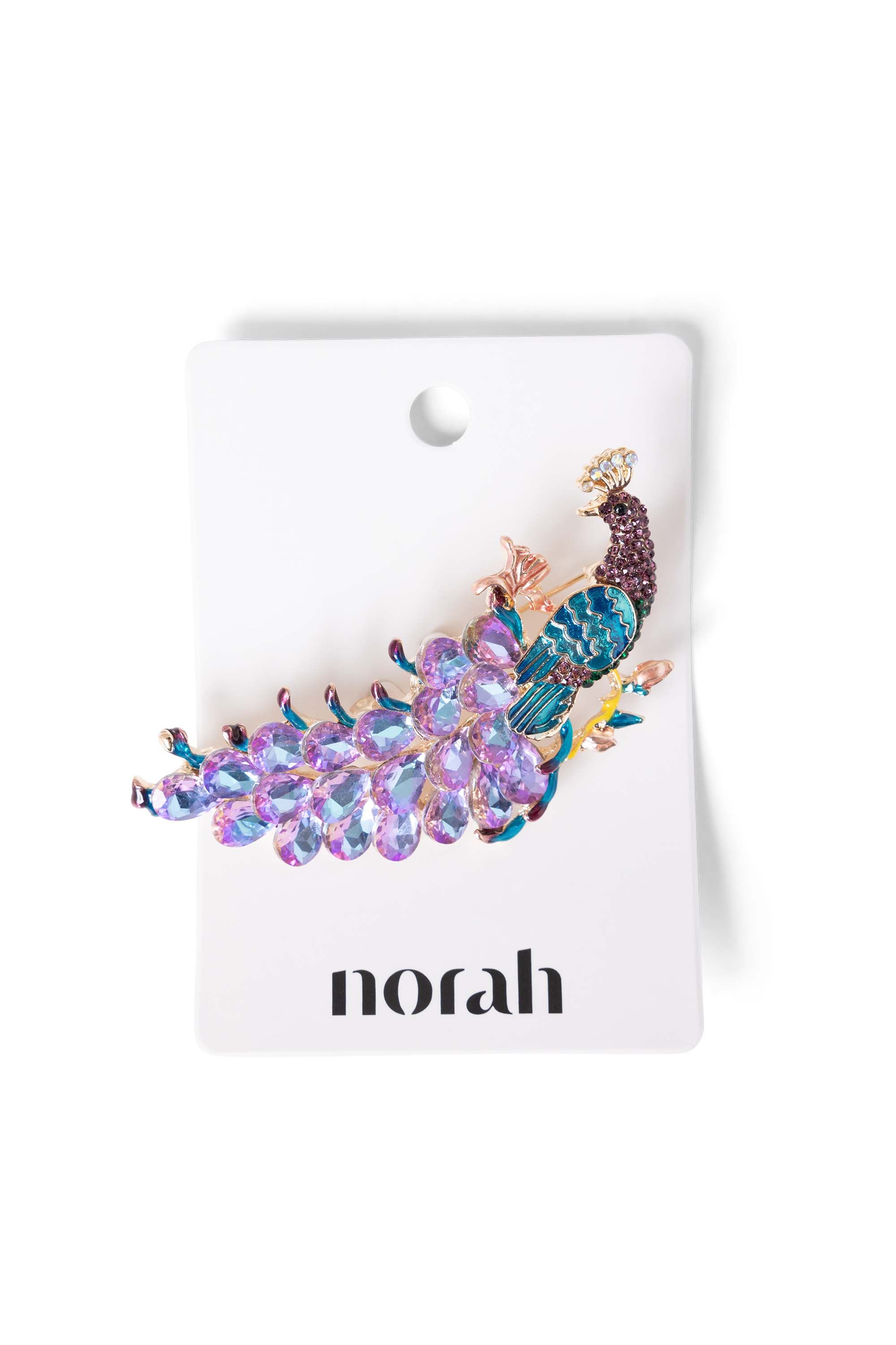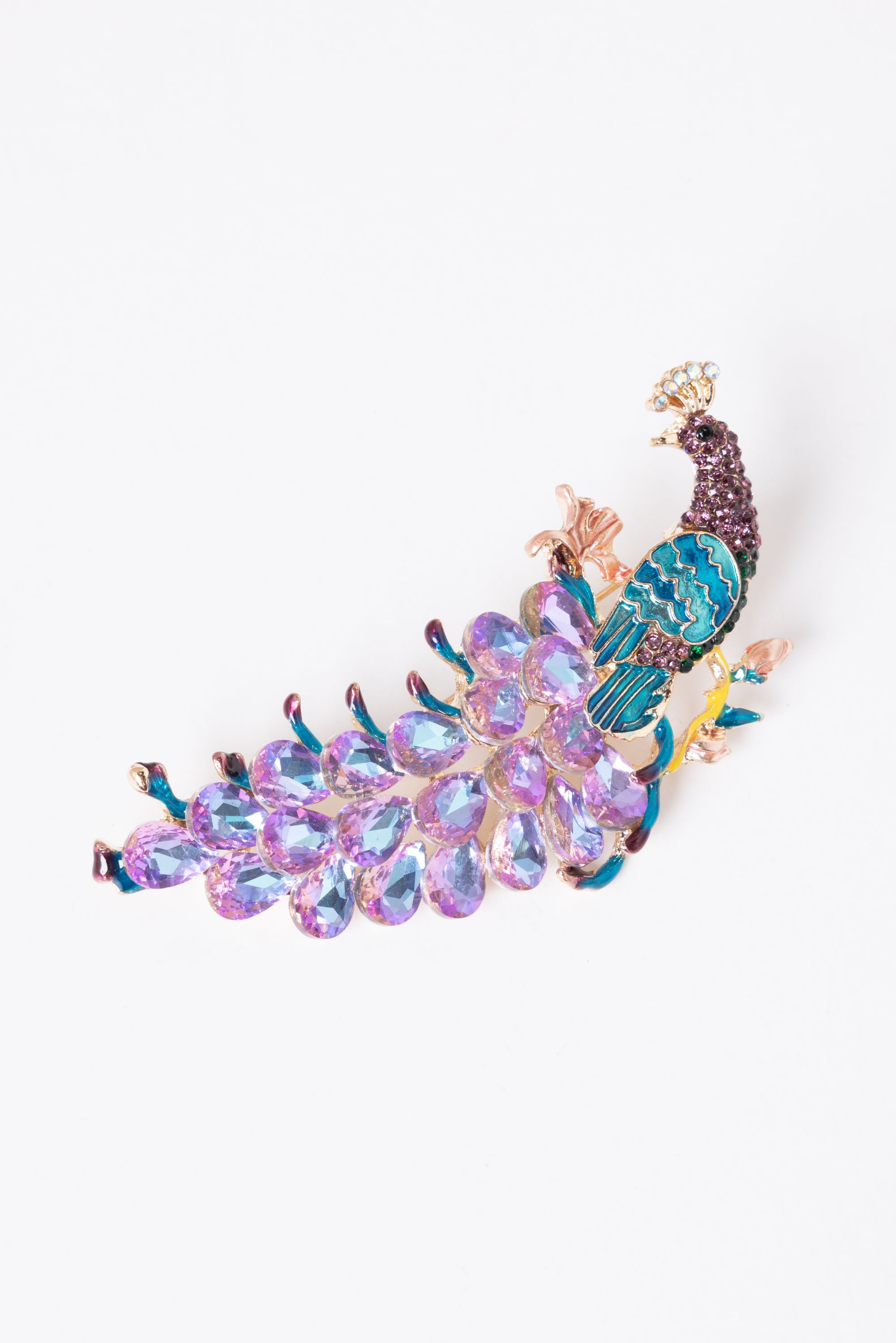 Deze broche met gekleurde steentjes in de vorm van een pauw is een kleurrijk detail.
