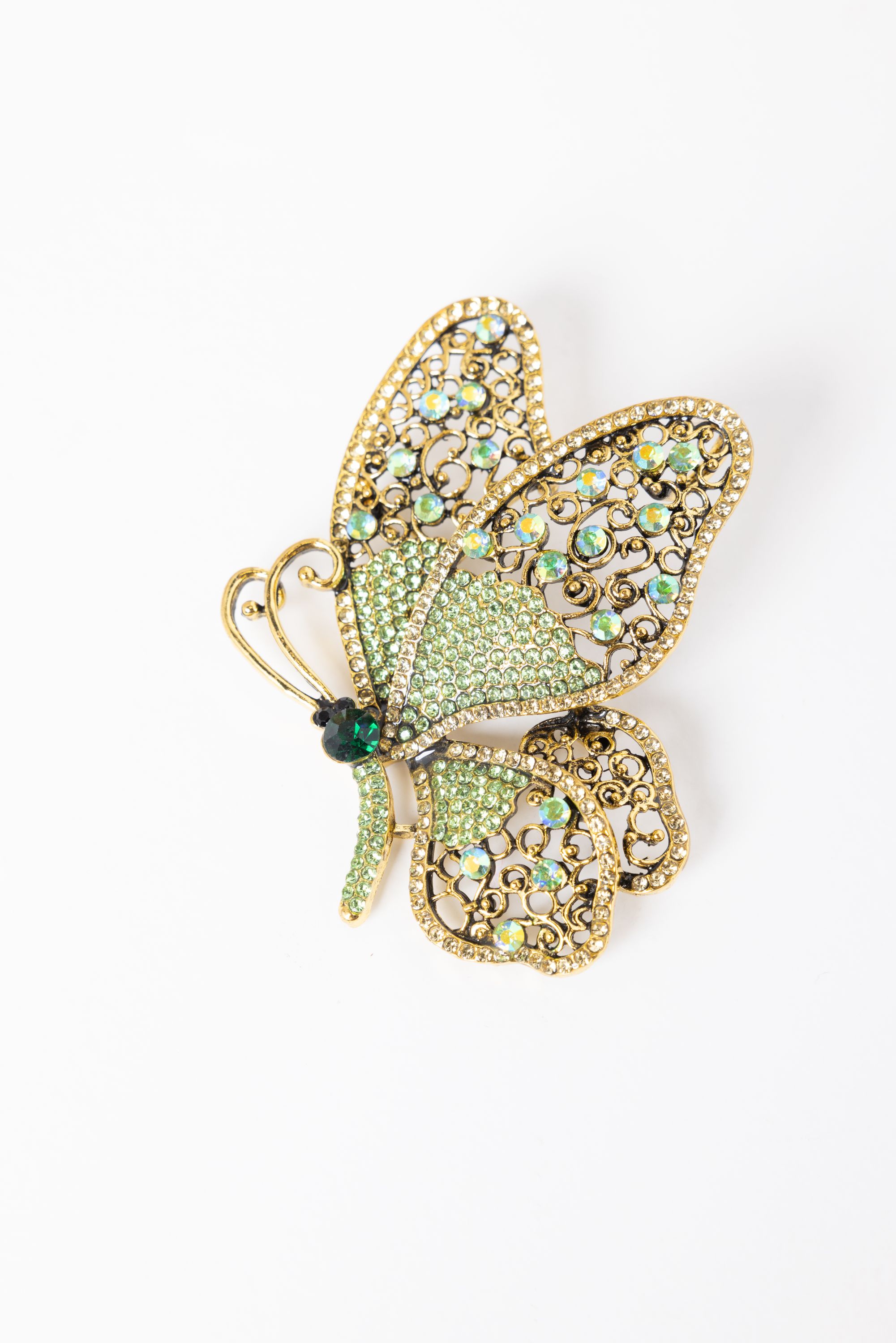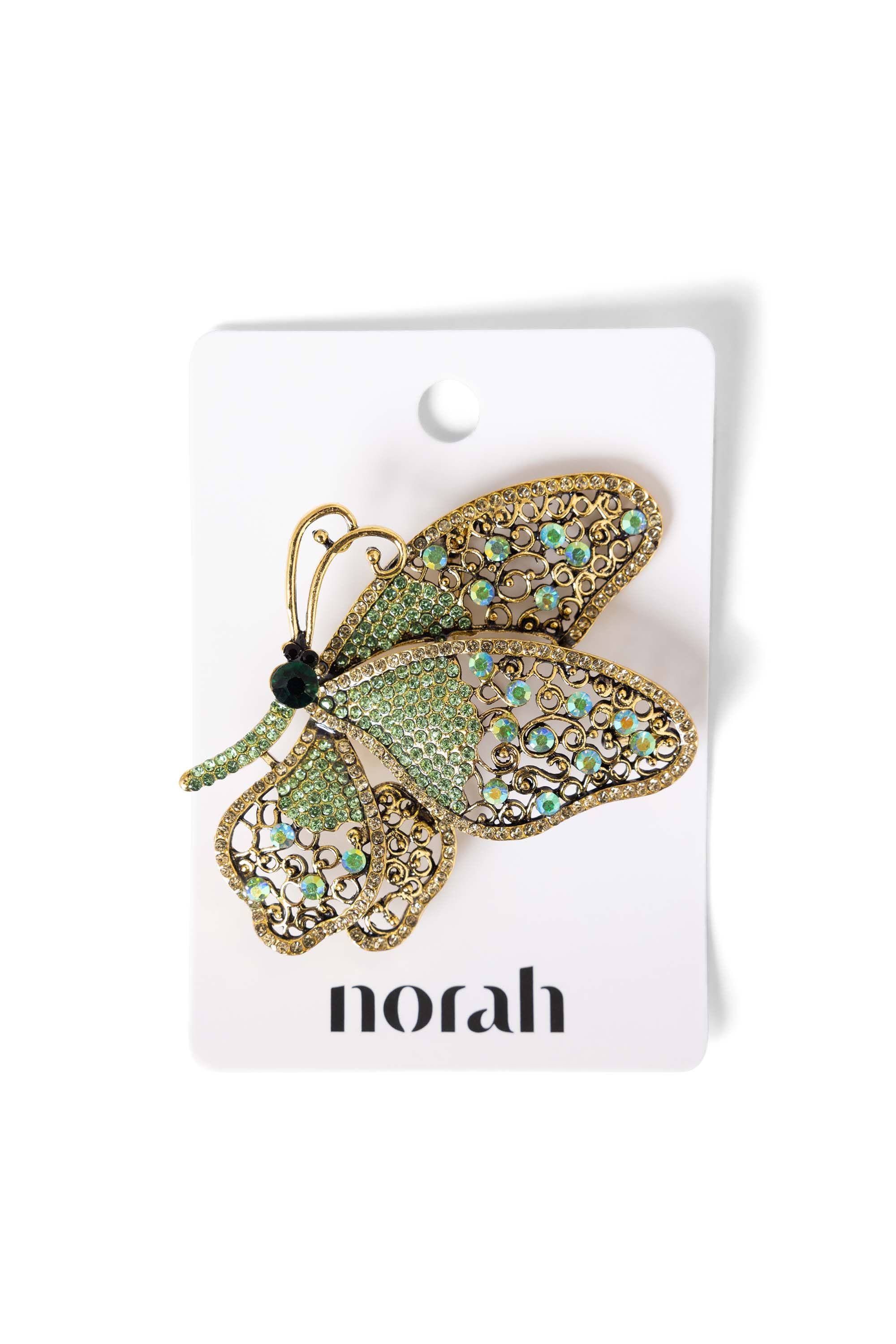 Deze broche met gekleurde steentjes in de vorm van een vlinder is een elegant detail.