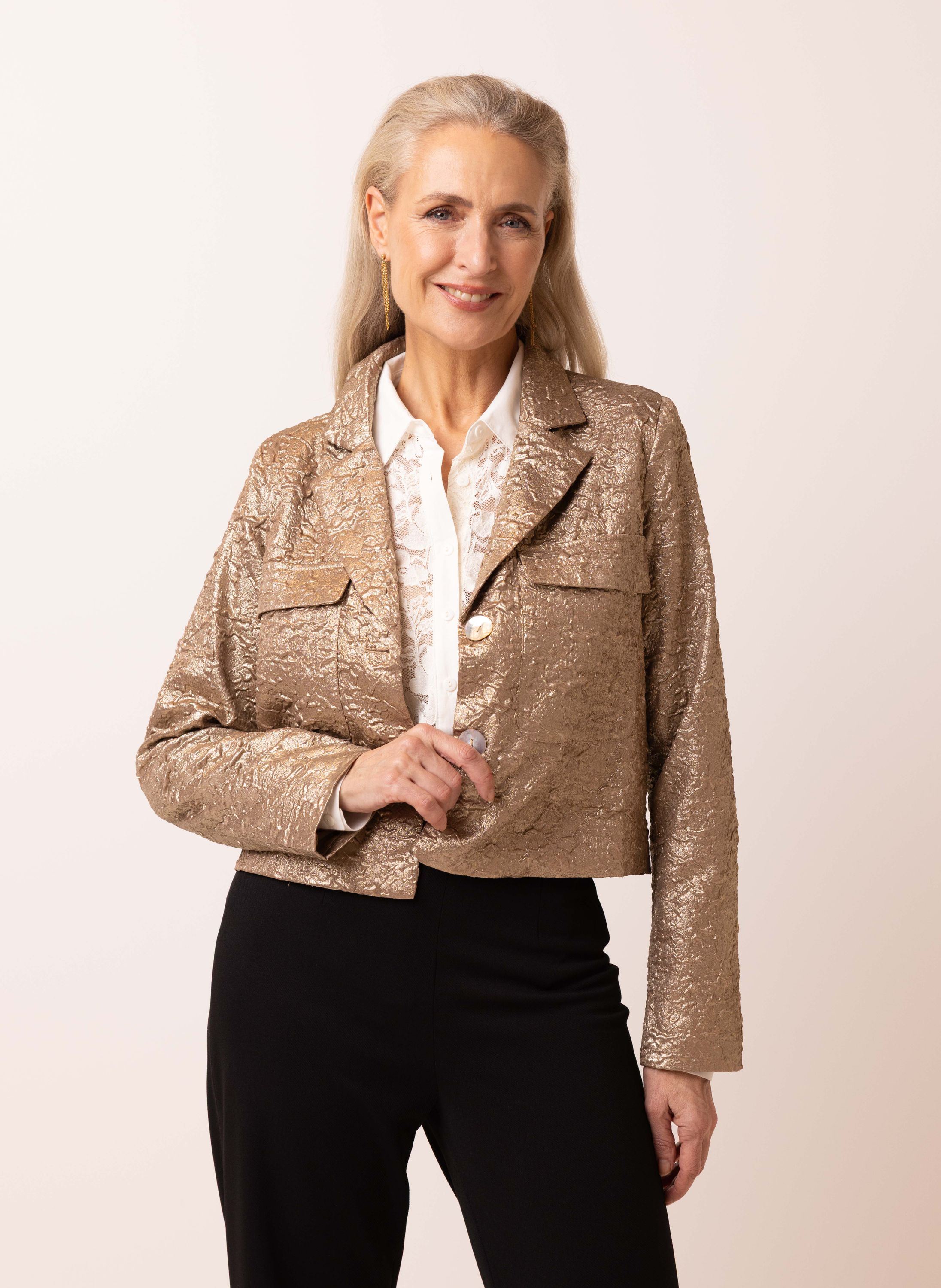Deze korte blazer met reverskraag, knoopsluiting, lange mouwen en decoratieve zakken is een veelzijdig item dat elke look compleet maakt.