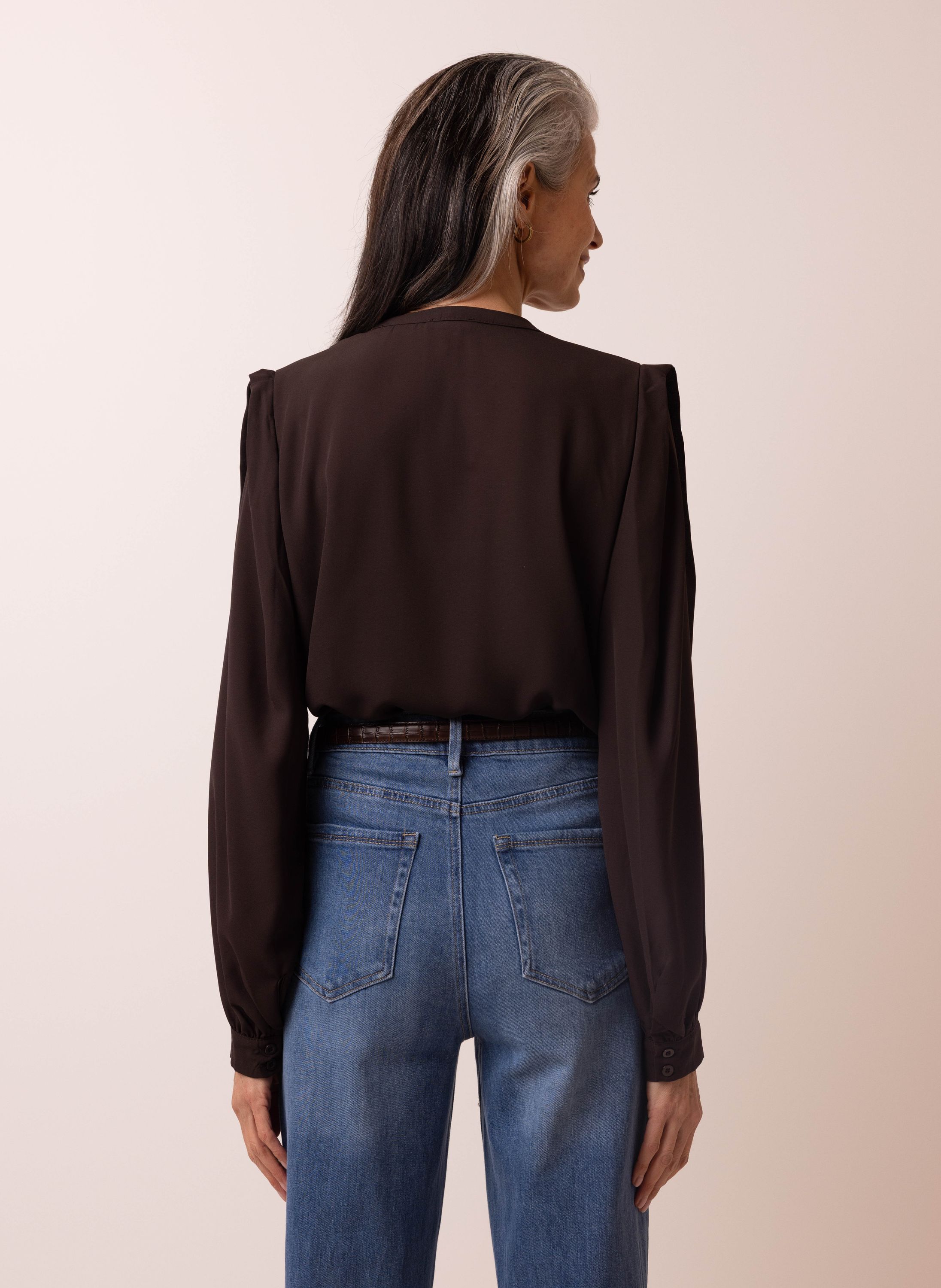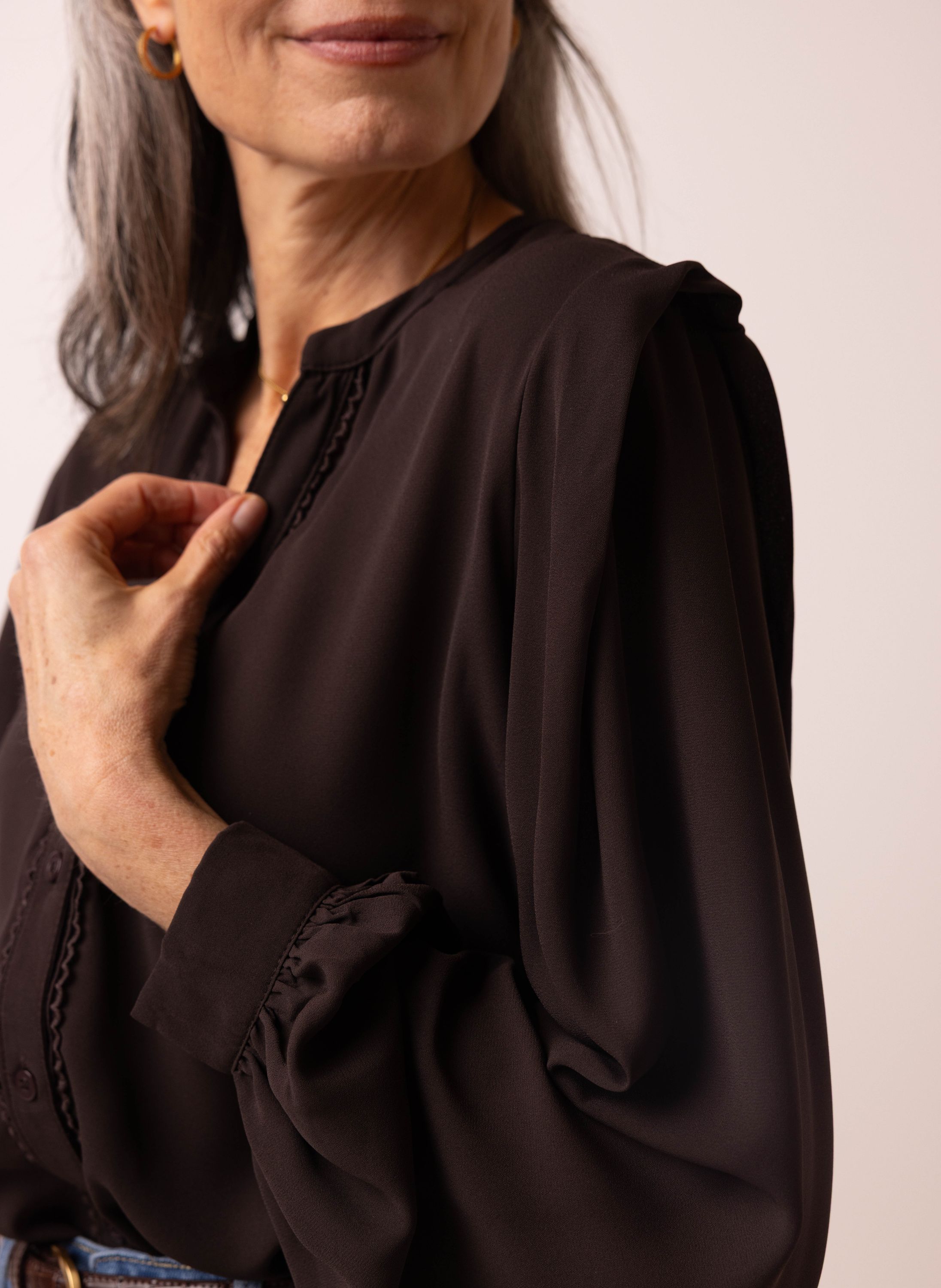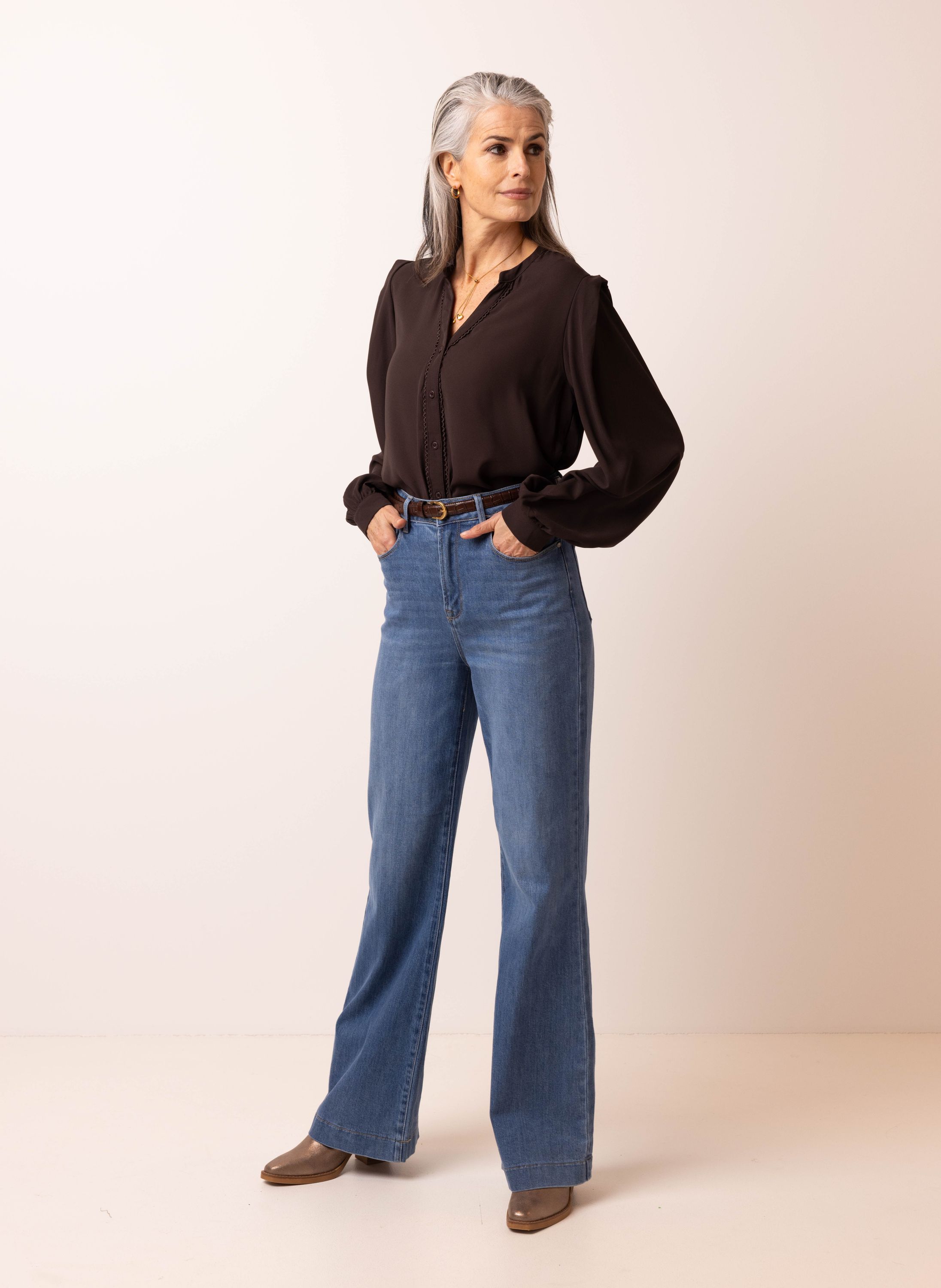 Deze blouse heeft een V-hals, knoopsluiting met kanten details en lange pofmouwen. Dit item is exclusief verkrijgbaar in geselecteerde winkels en online. Controleer de winkelvoorraad om de beschikbaarheid in een winkel bij jou in de buurt te bekijken.