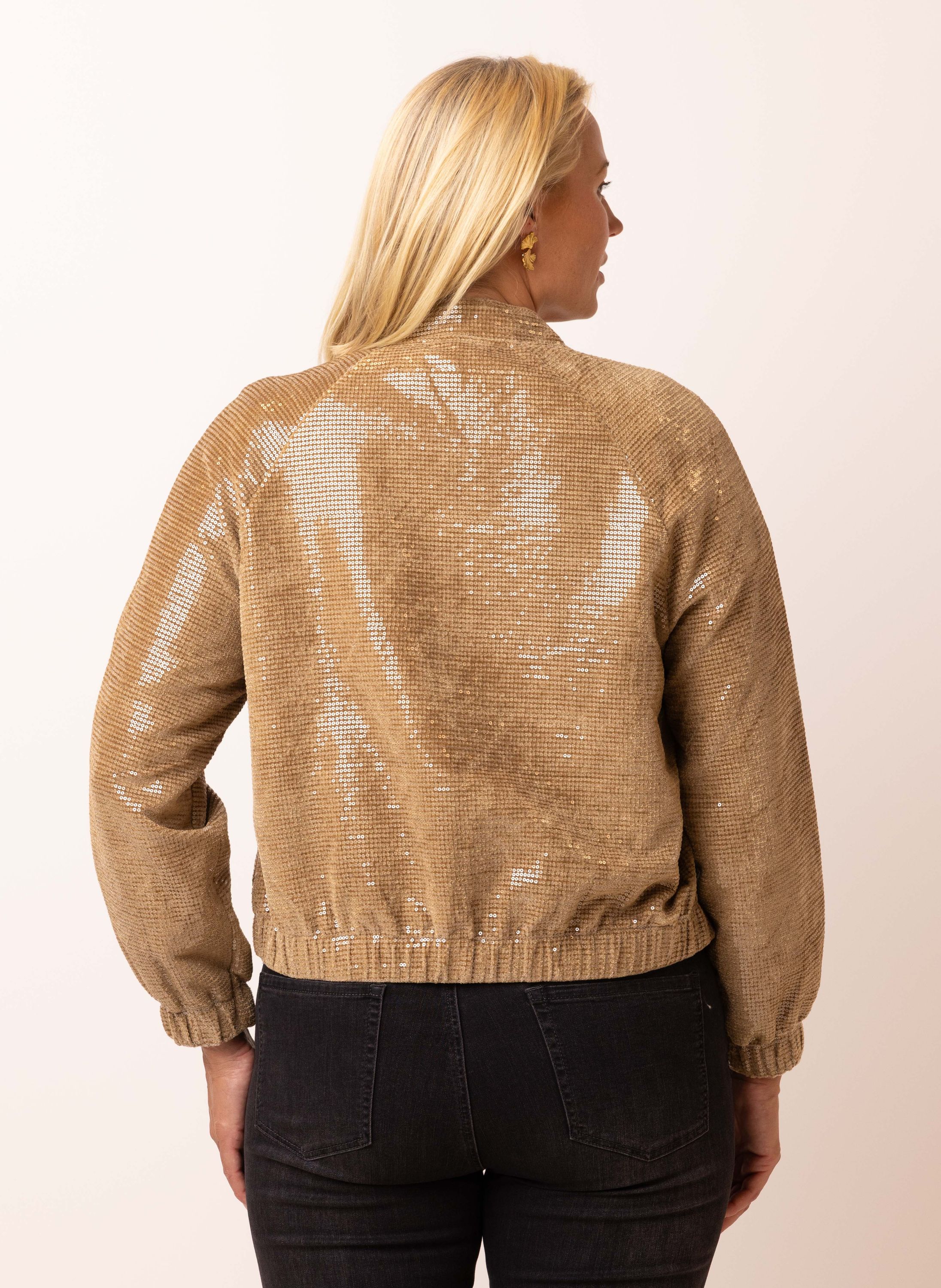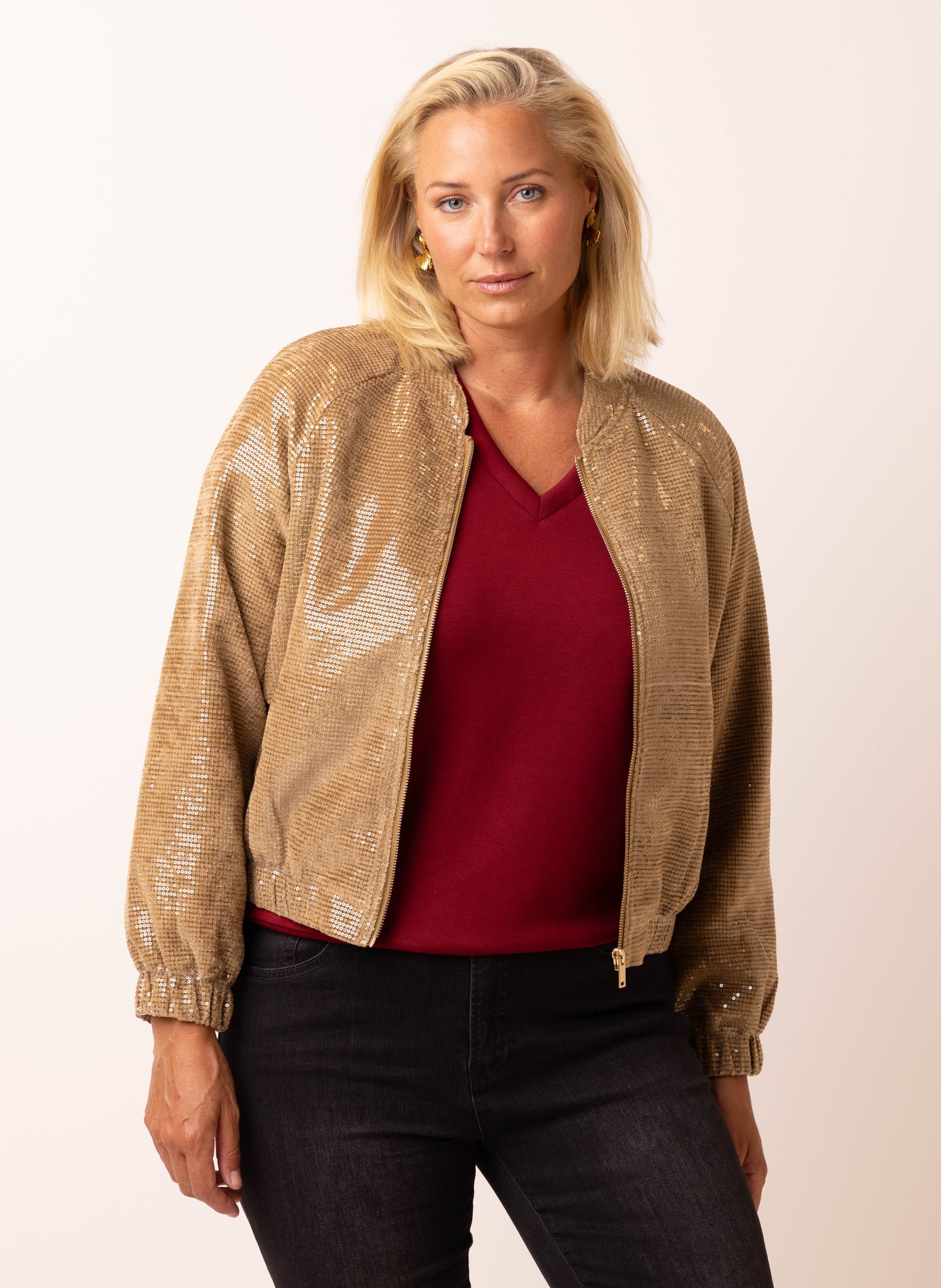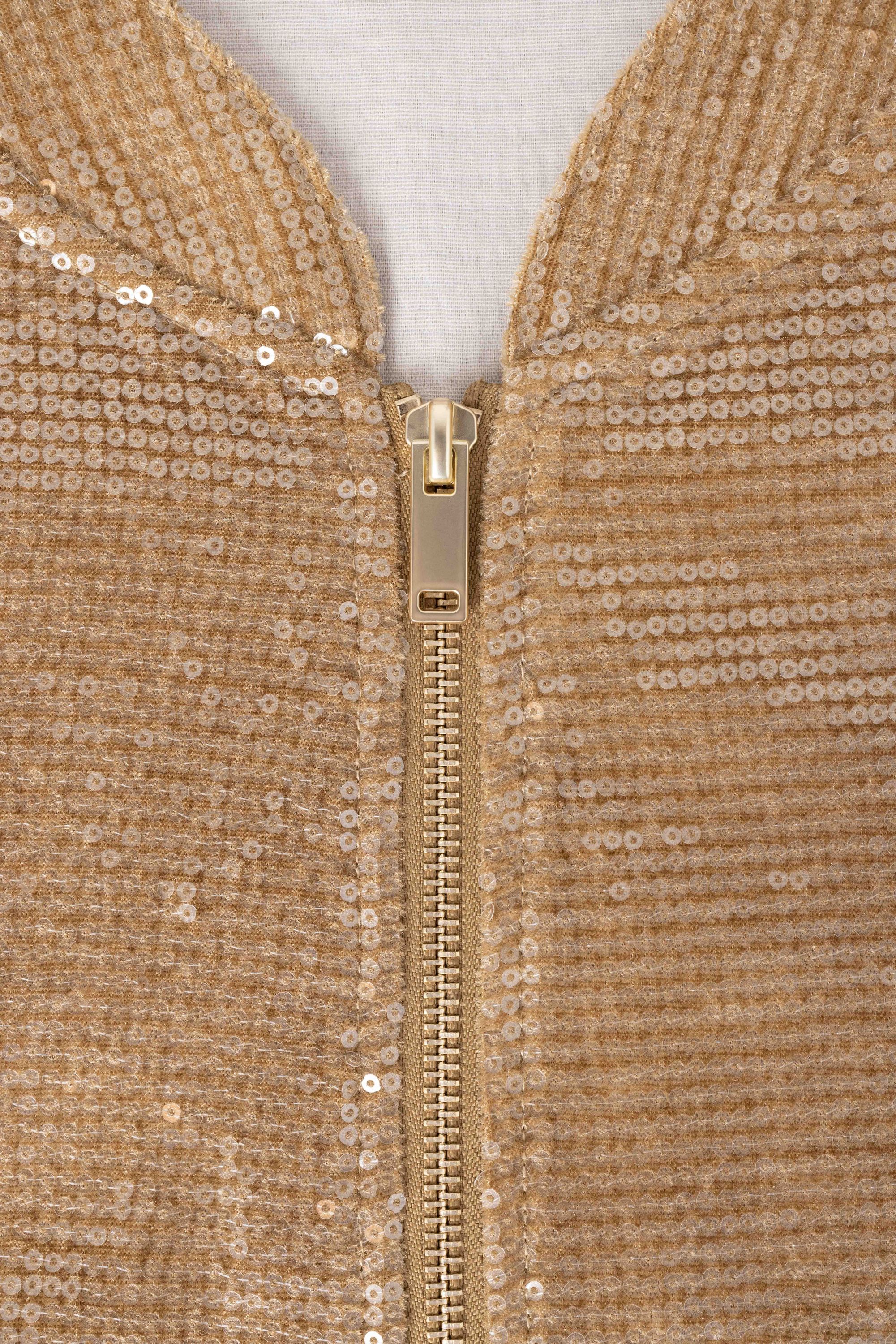 Dit jasje met ronde hals, ritssluiting, lange mouwen en steekzakken is versierd met pailletten over de gehele jas.