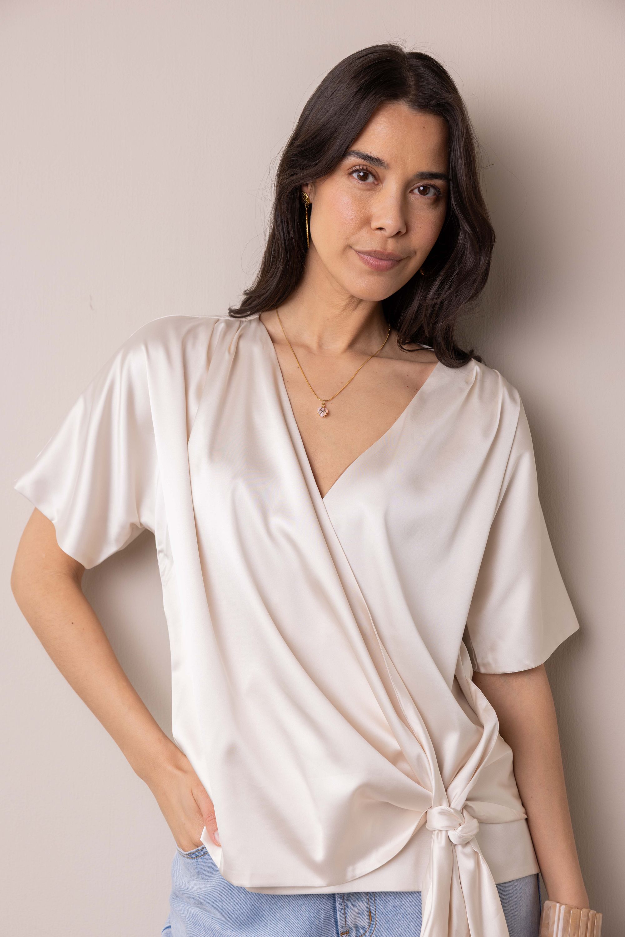Deze blouse met V-hals en aangeknipte korte mouwen heeft een strikdetail en een subtiele glans voor een vrouwelijke look.