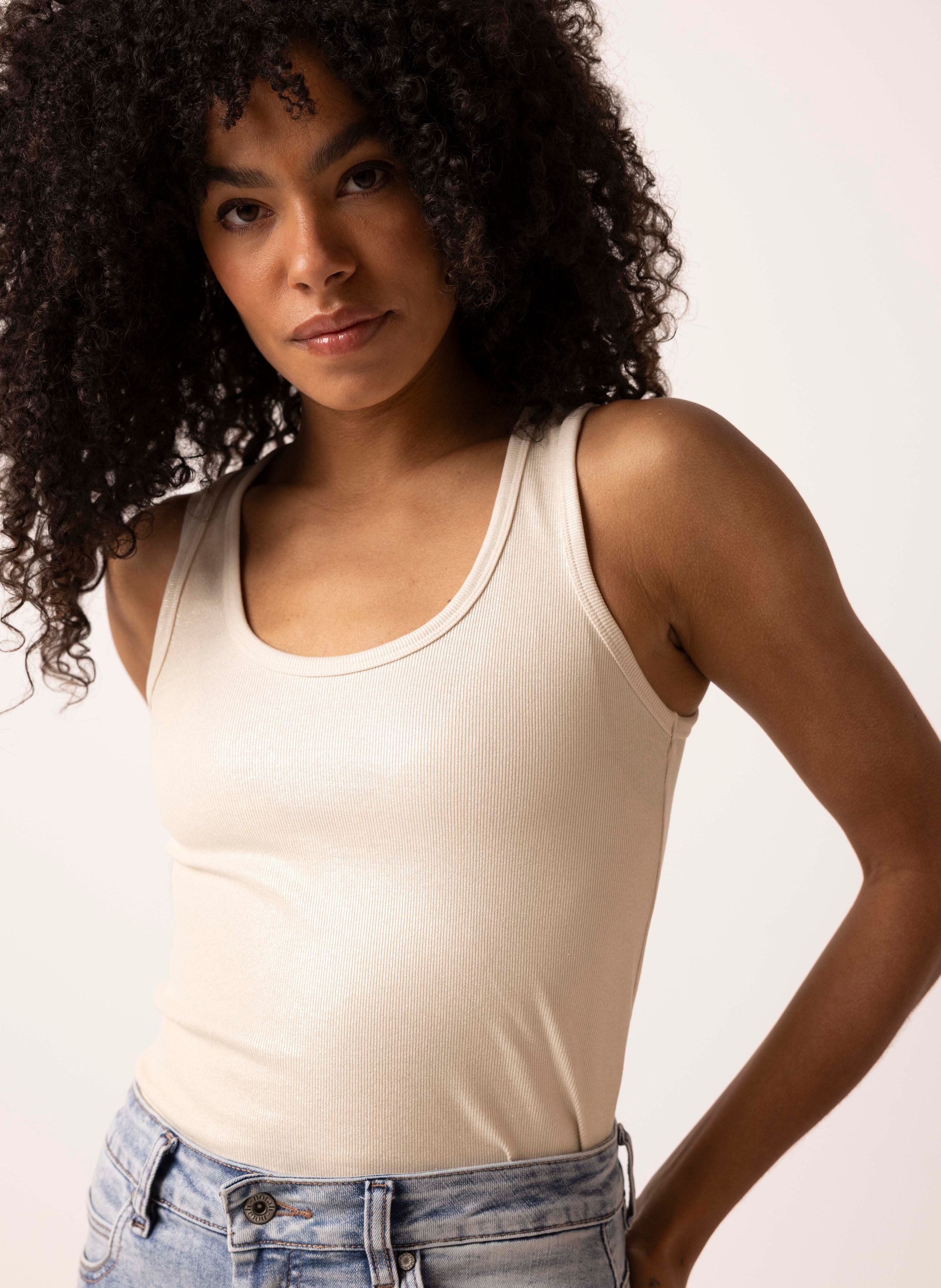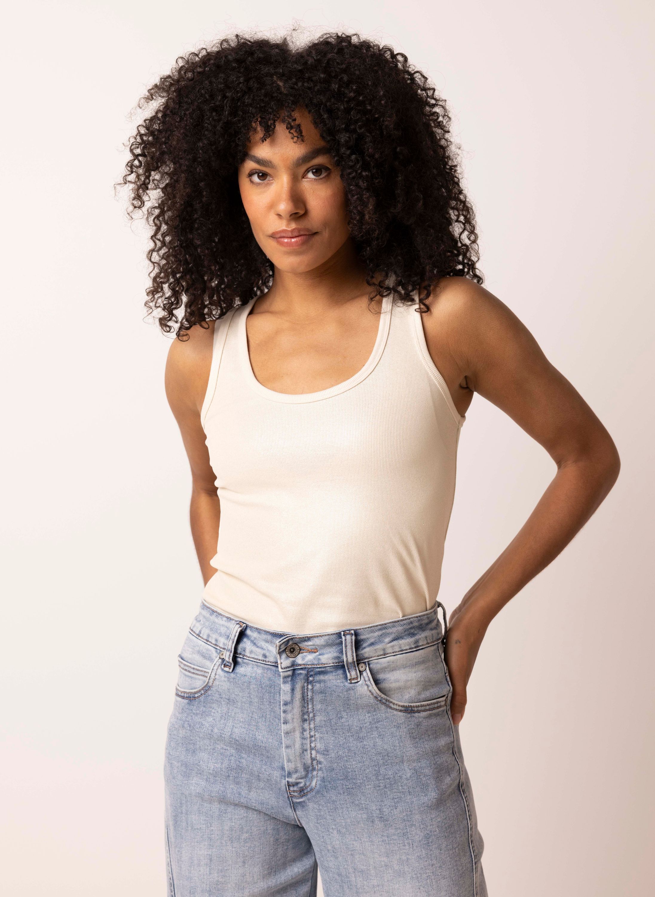 Deze mouwloze aansluitende top met lurexdraad heeft een subtiele glans voor een elegante uitstraling.