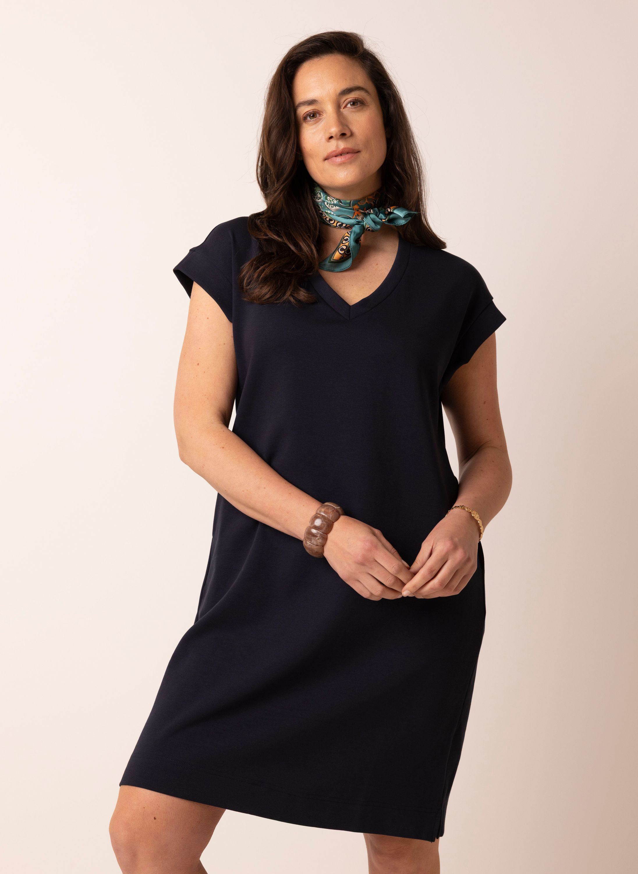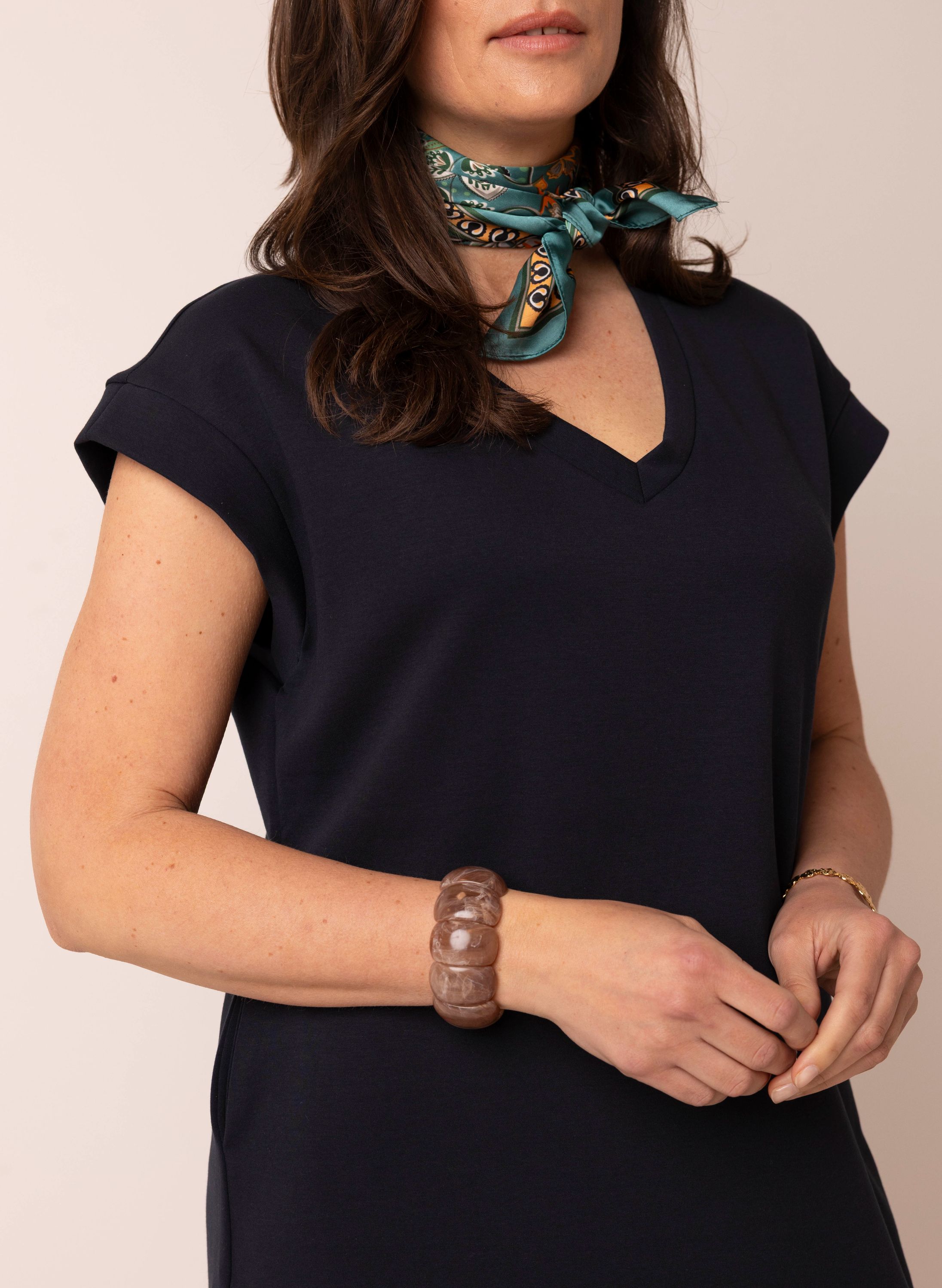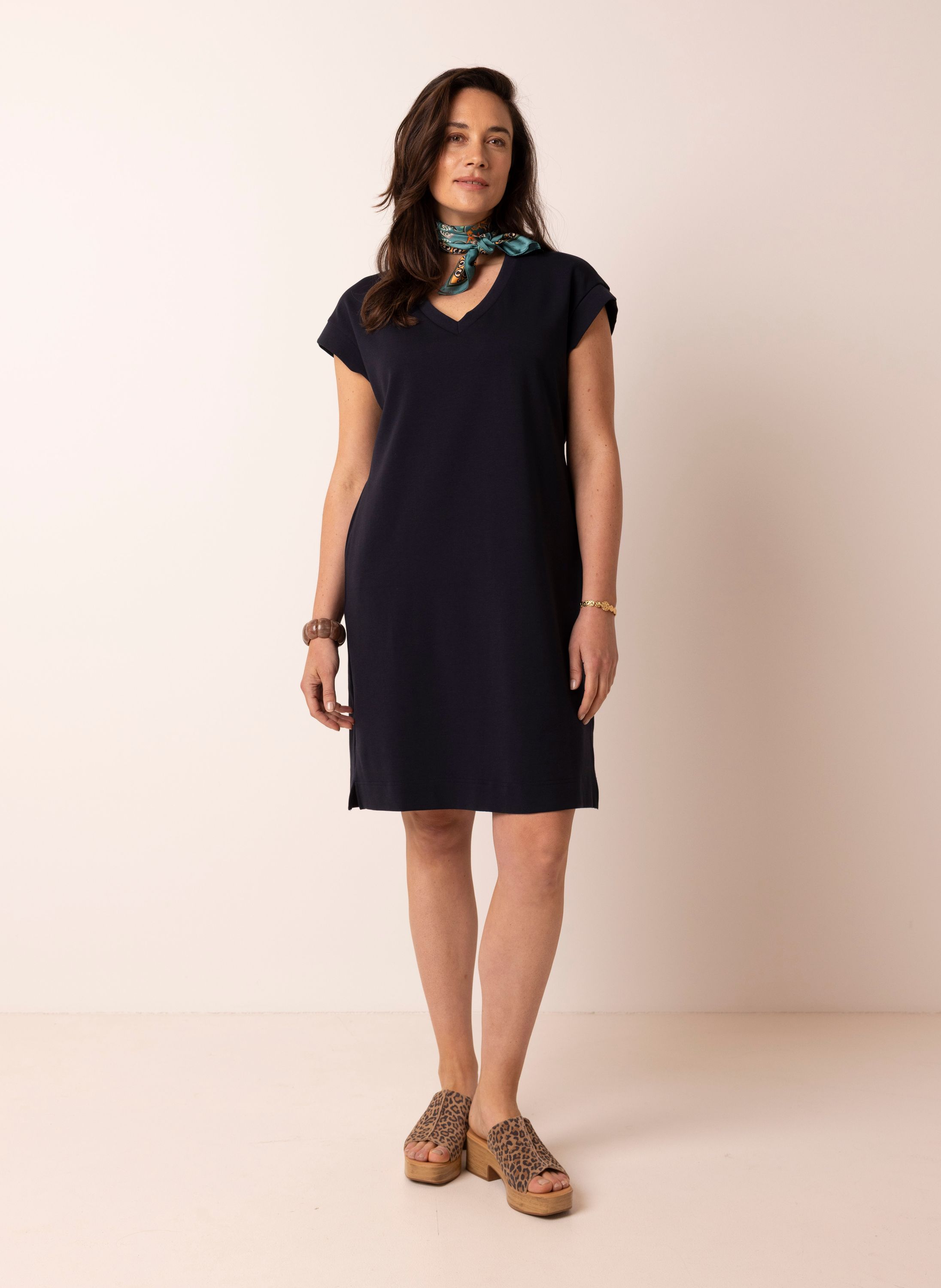Deze midi jurk met V-hals en korte mouwen heeft een vrouwelijke uitstraling.