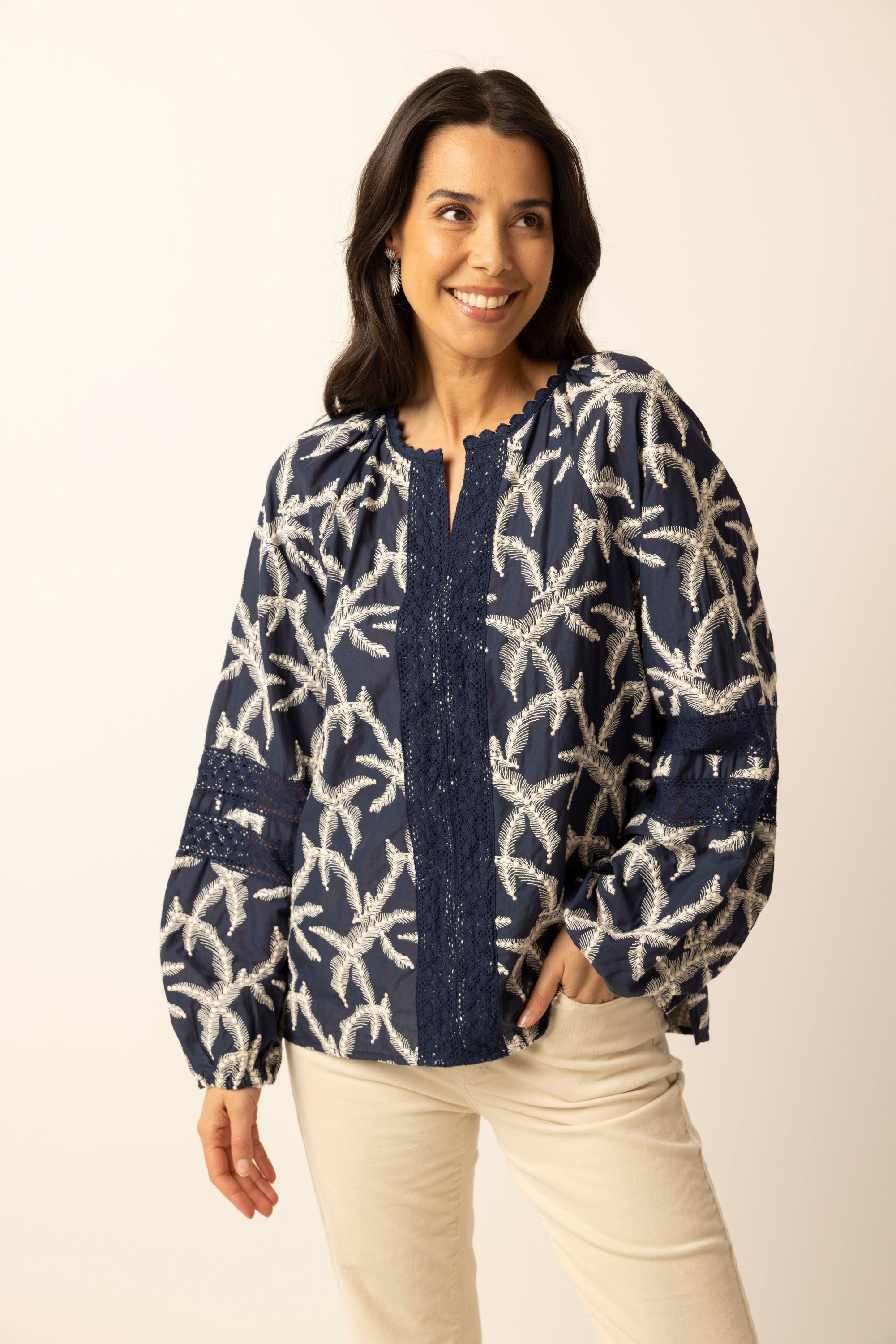 Deze blouse met V-hals en lange mouwen is afgewerkt met kanten details en borduursels voor een vrouwelijke look.