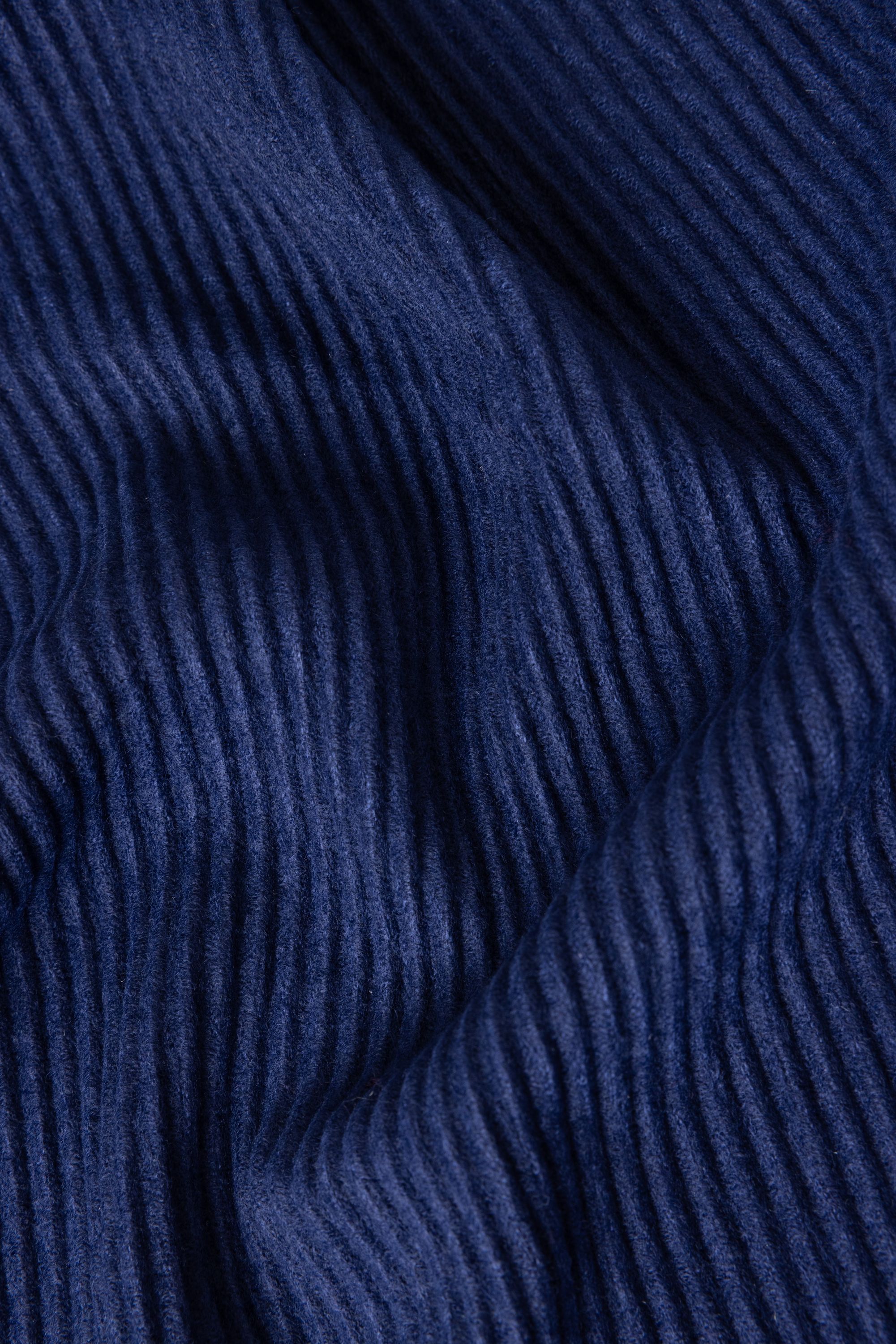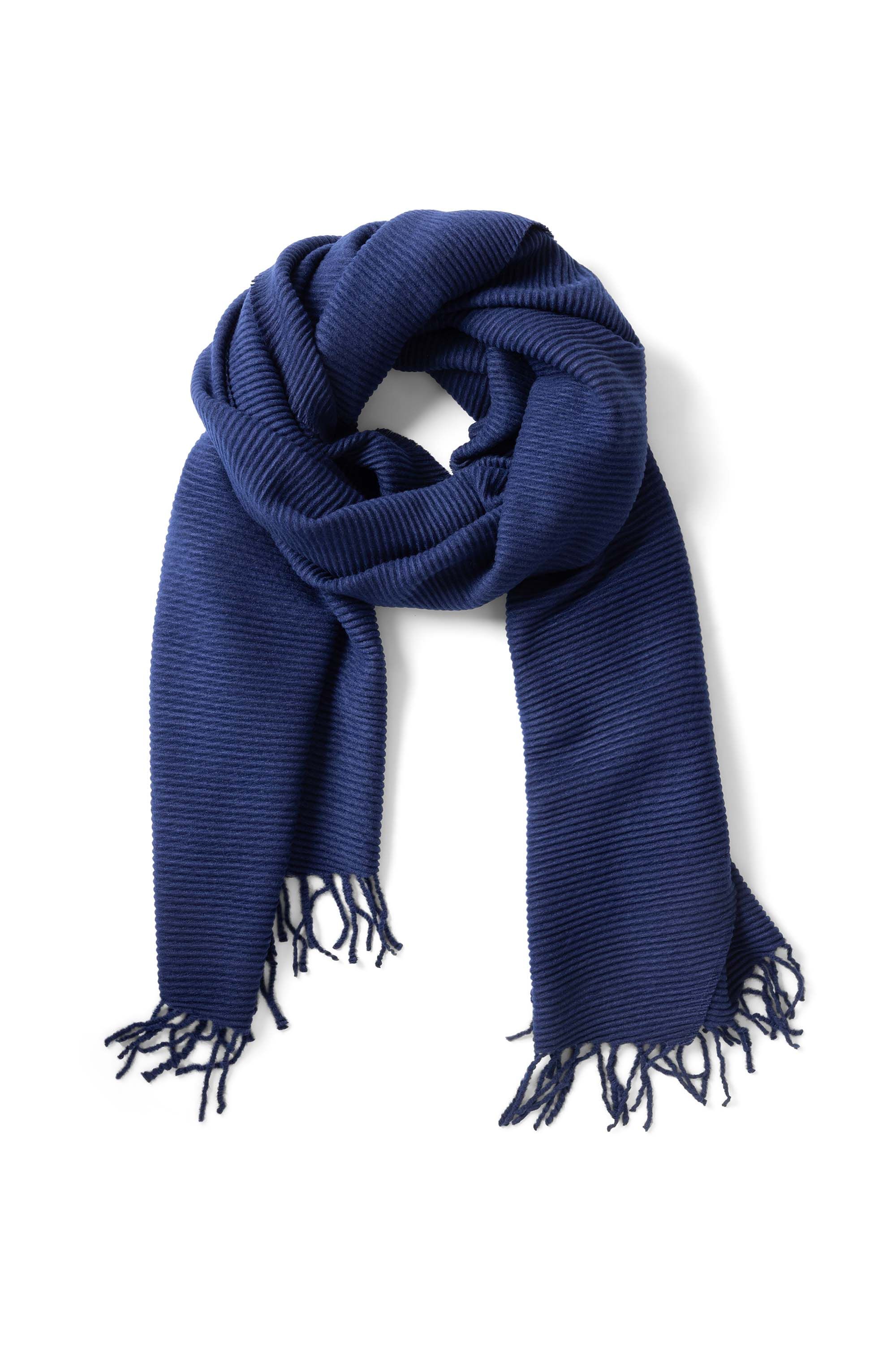 Donkerblauwe gebreide sjaal met geribde structuur en franjes