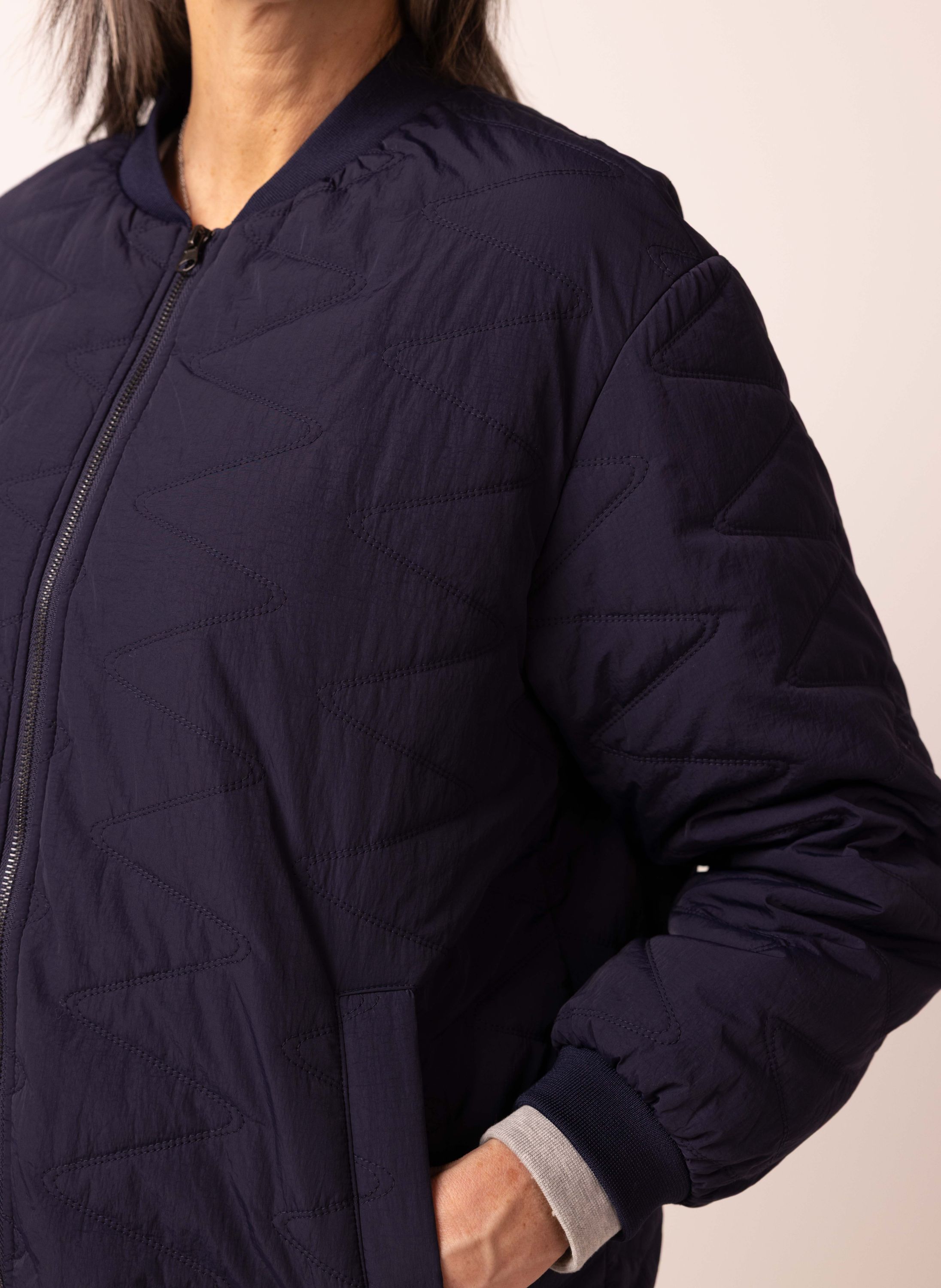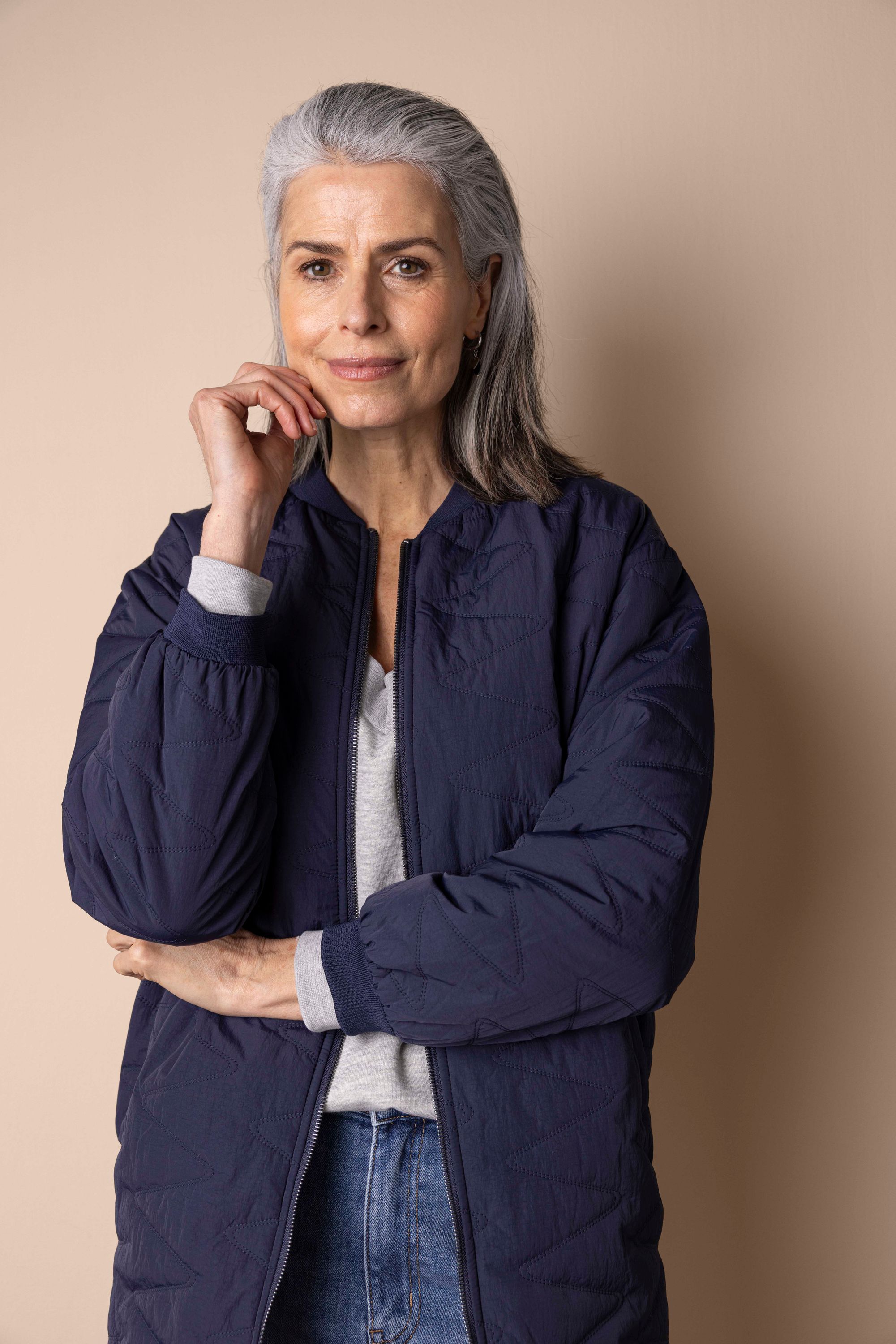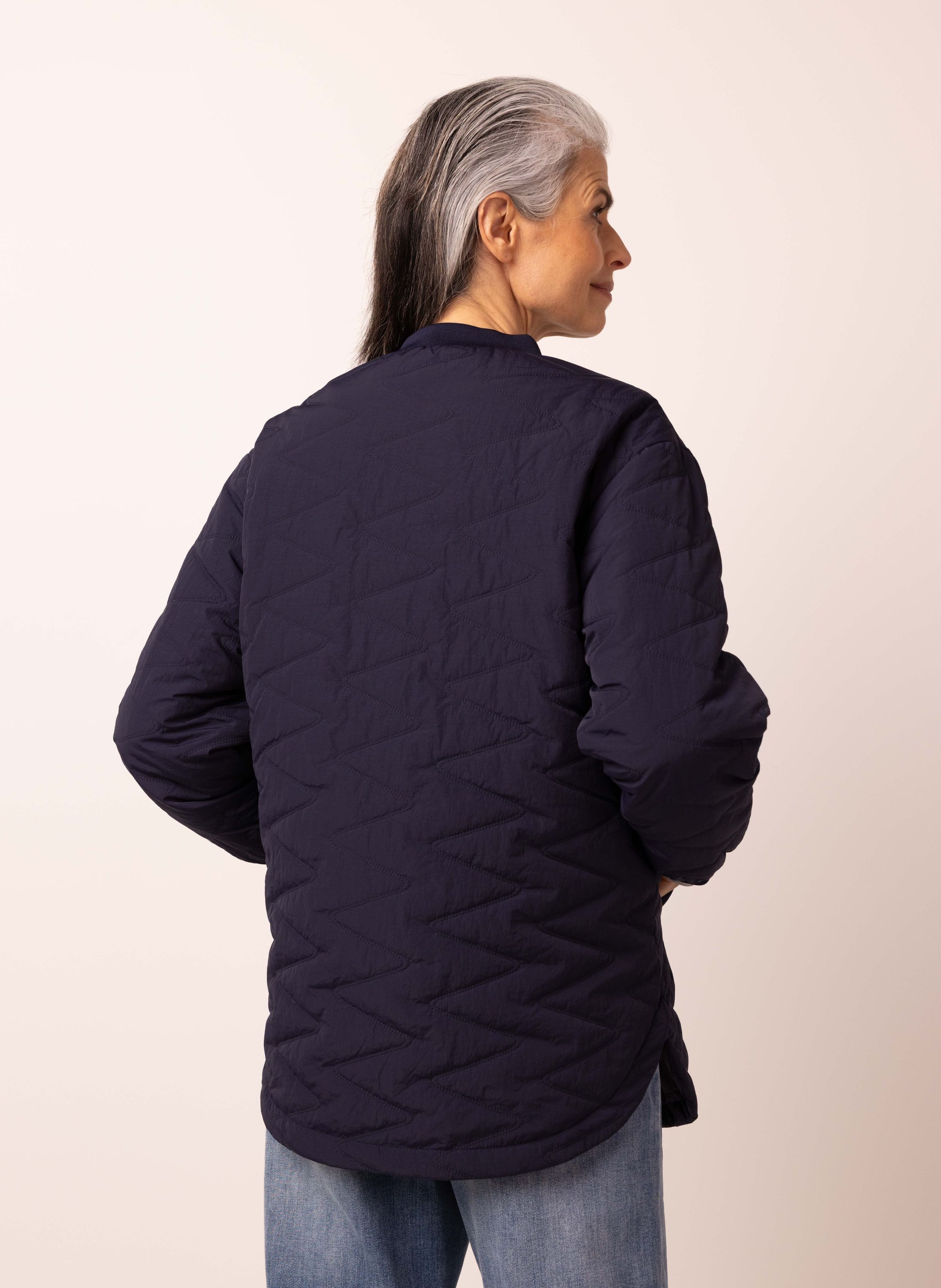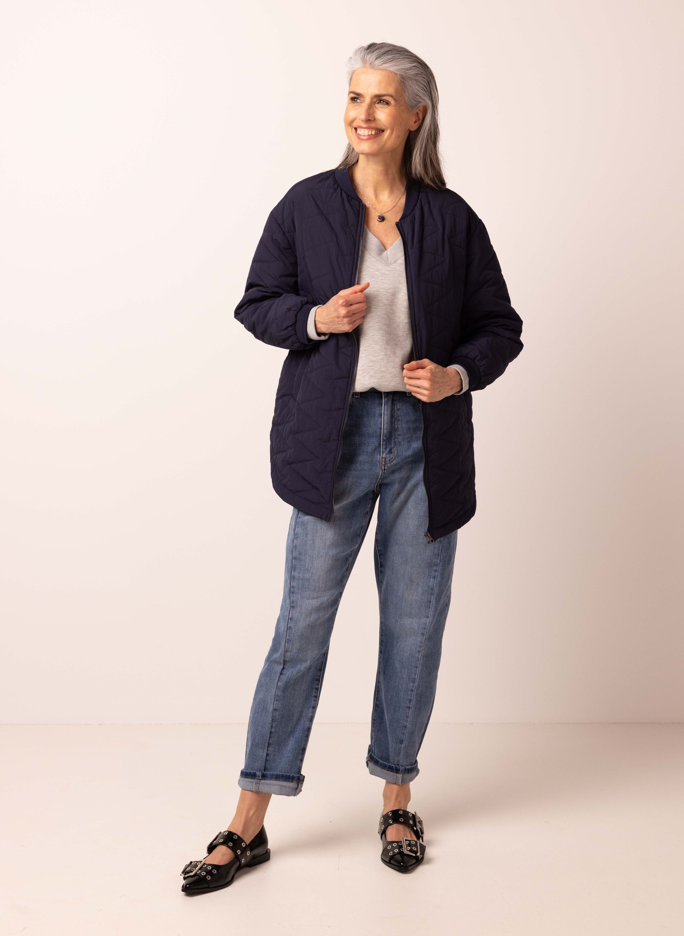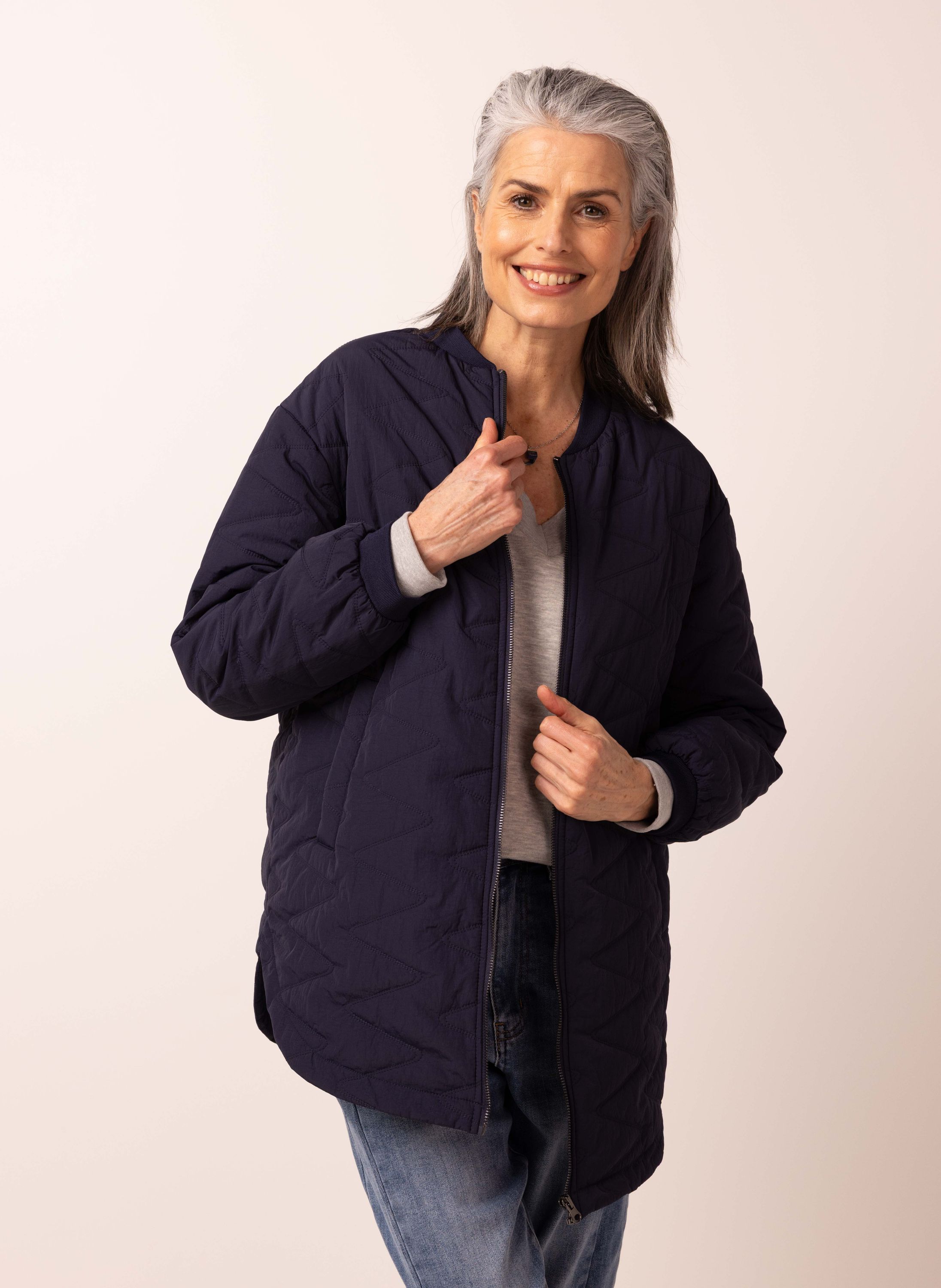 Halflange jas met ronde hals, ritssluitiing en lange mouwen.