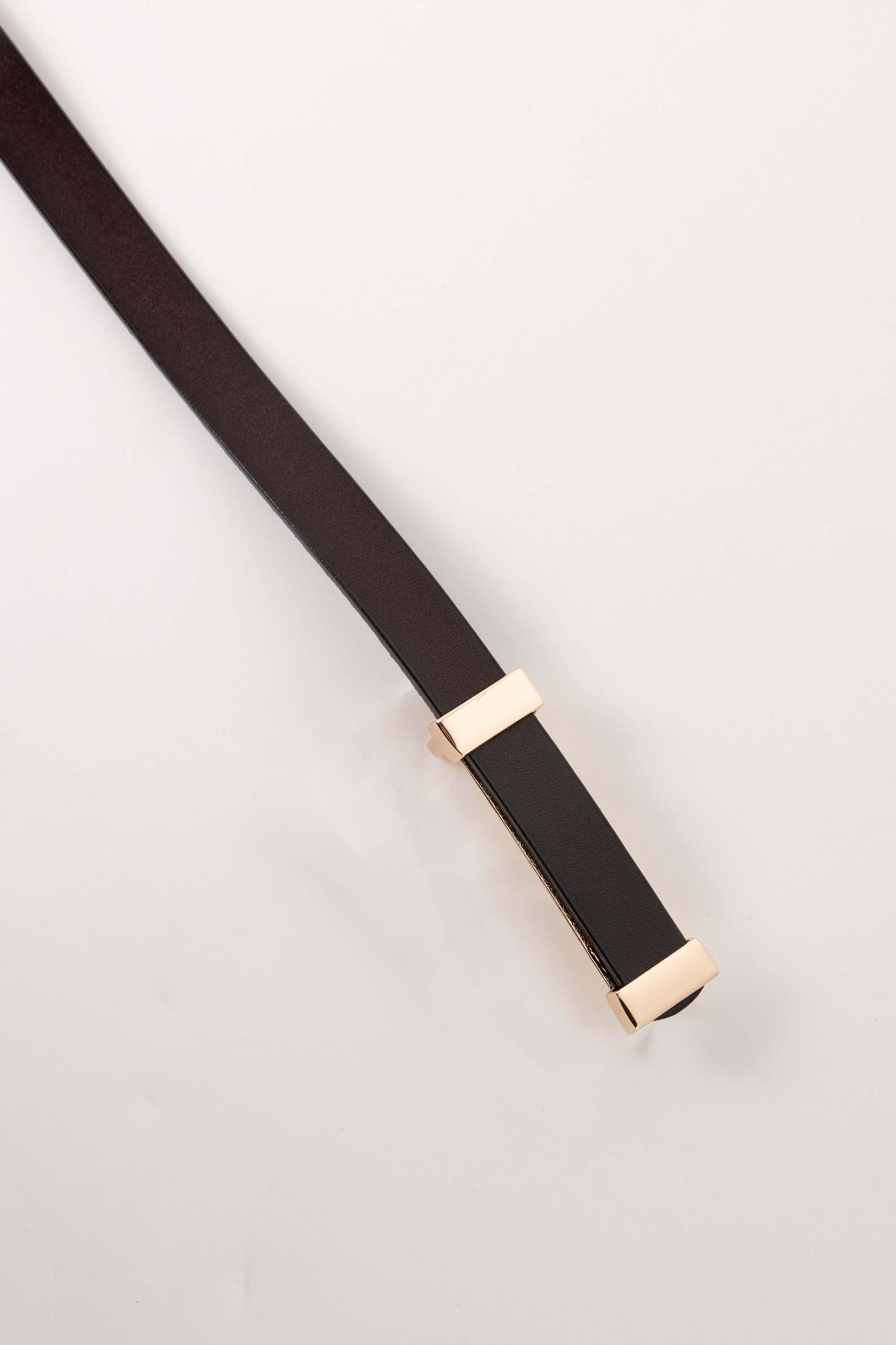 Deze smalle riem met goudkleurige gesp is een subtiele toevoeging aan je outfit. Afmeting: S: 95 cm, M: 105 cm, L: 115 cm, XL: 125 cm.
