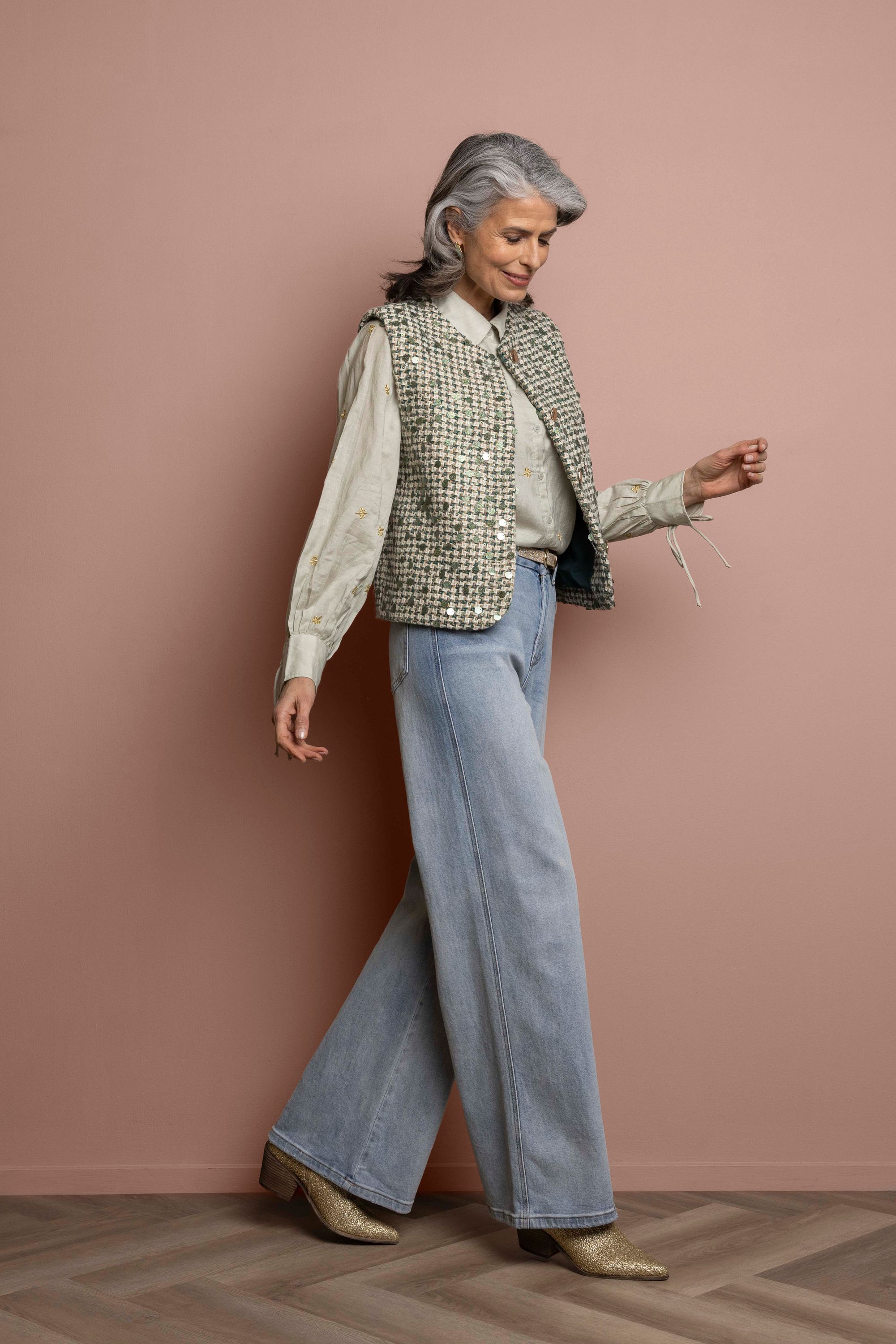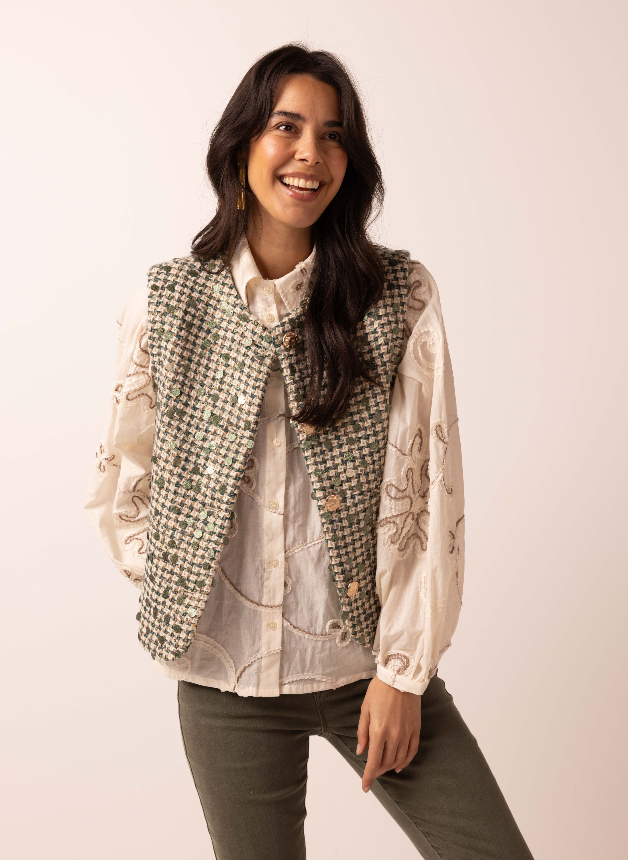 Dit mouwloze gilet met ronde hals heeft een goudkleurige knoopsluiting en decoratieve zakken aan de voorzijde.