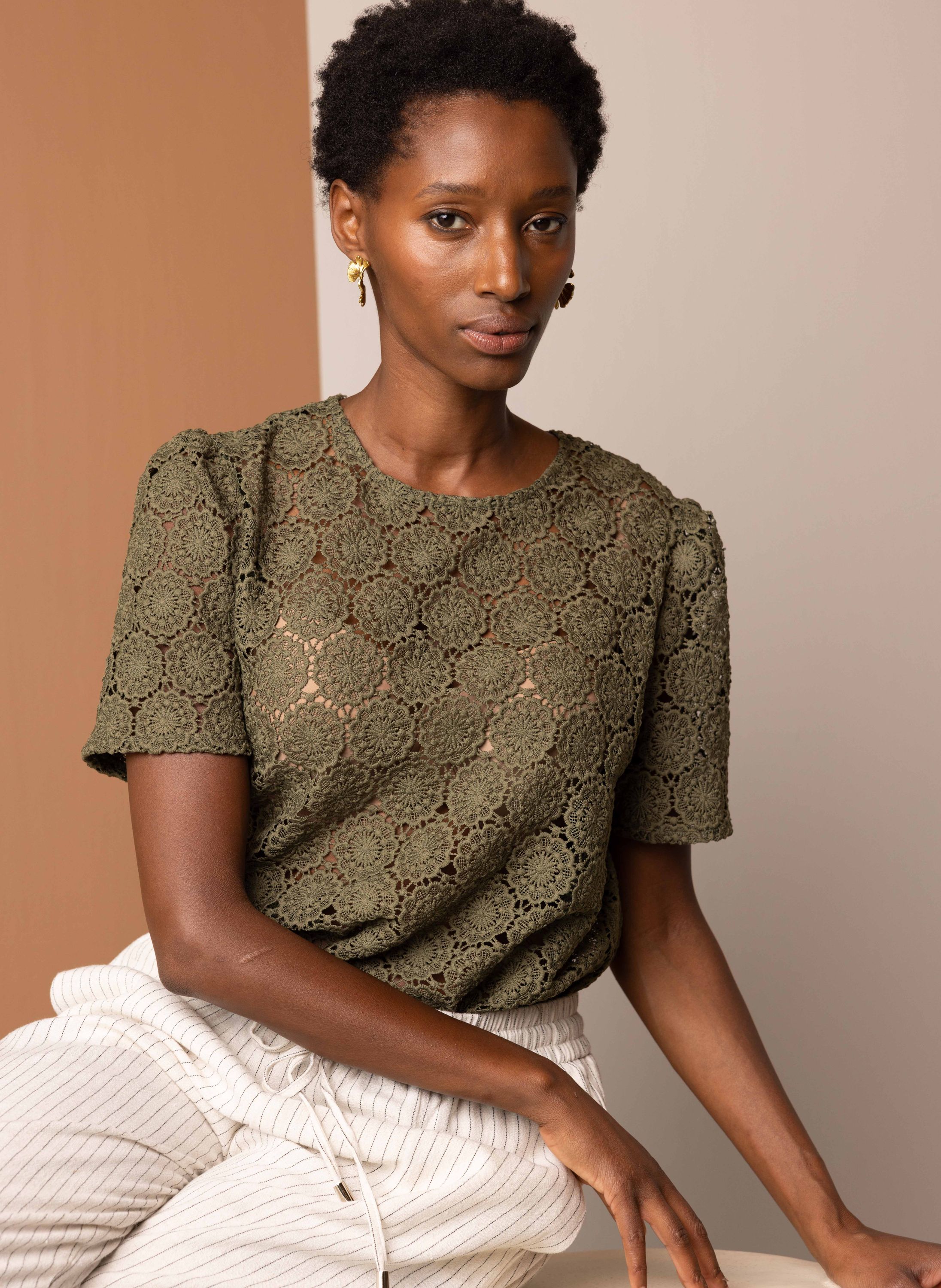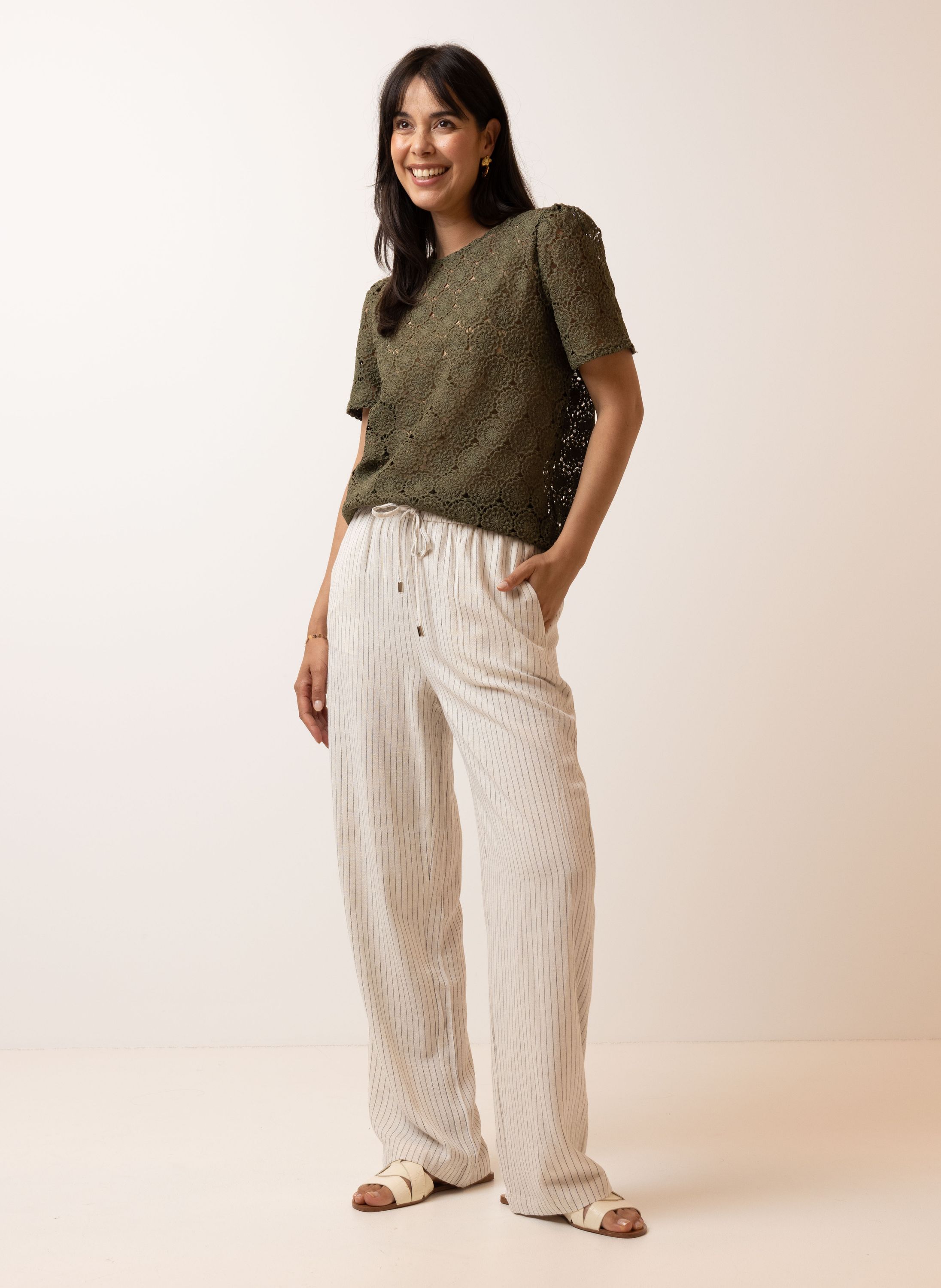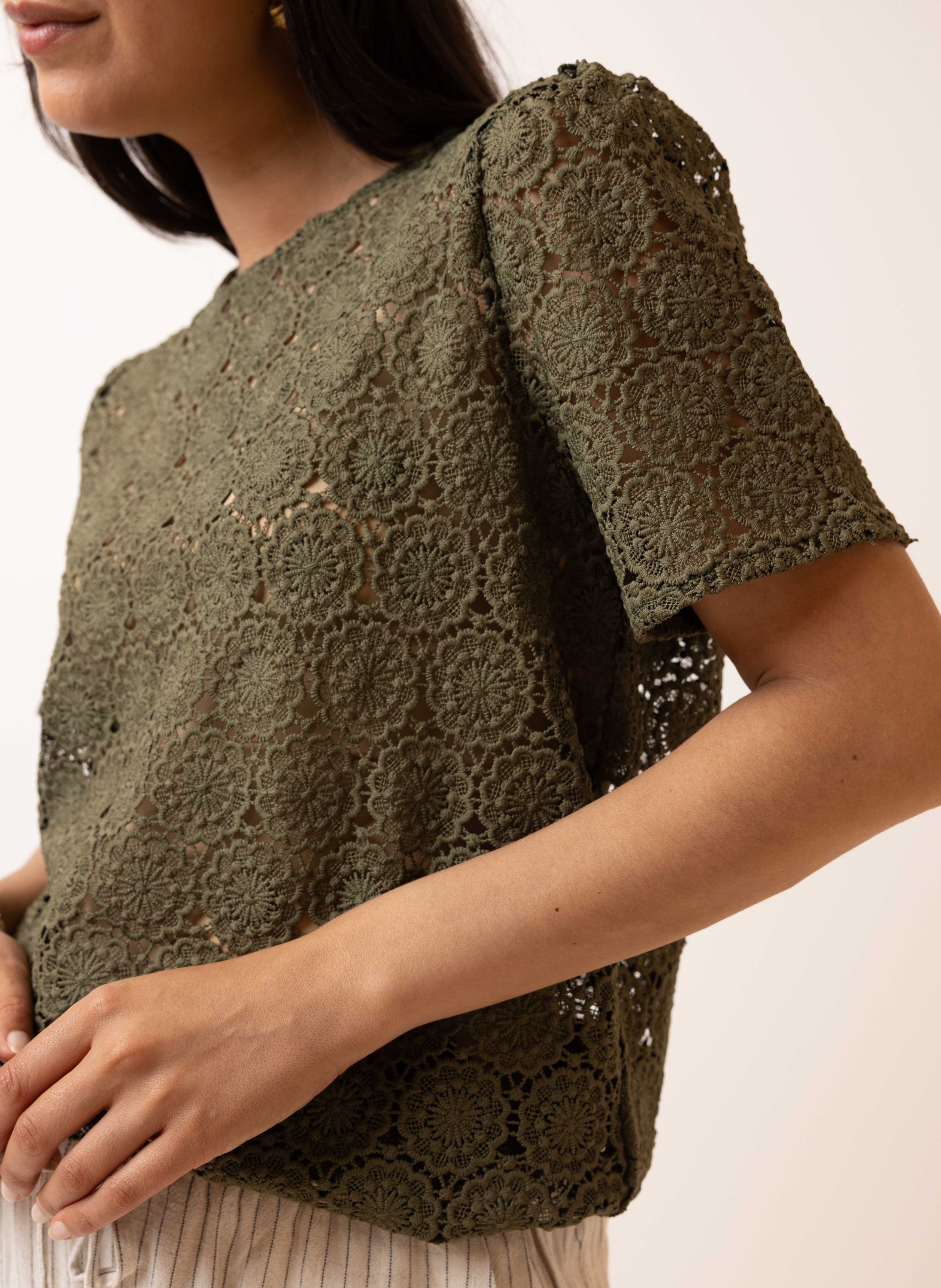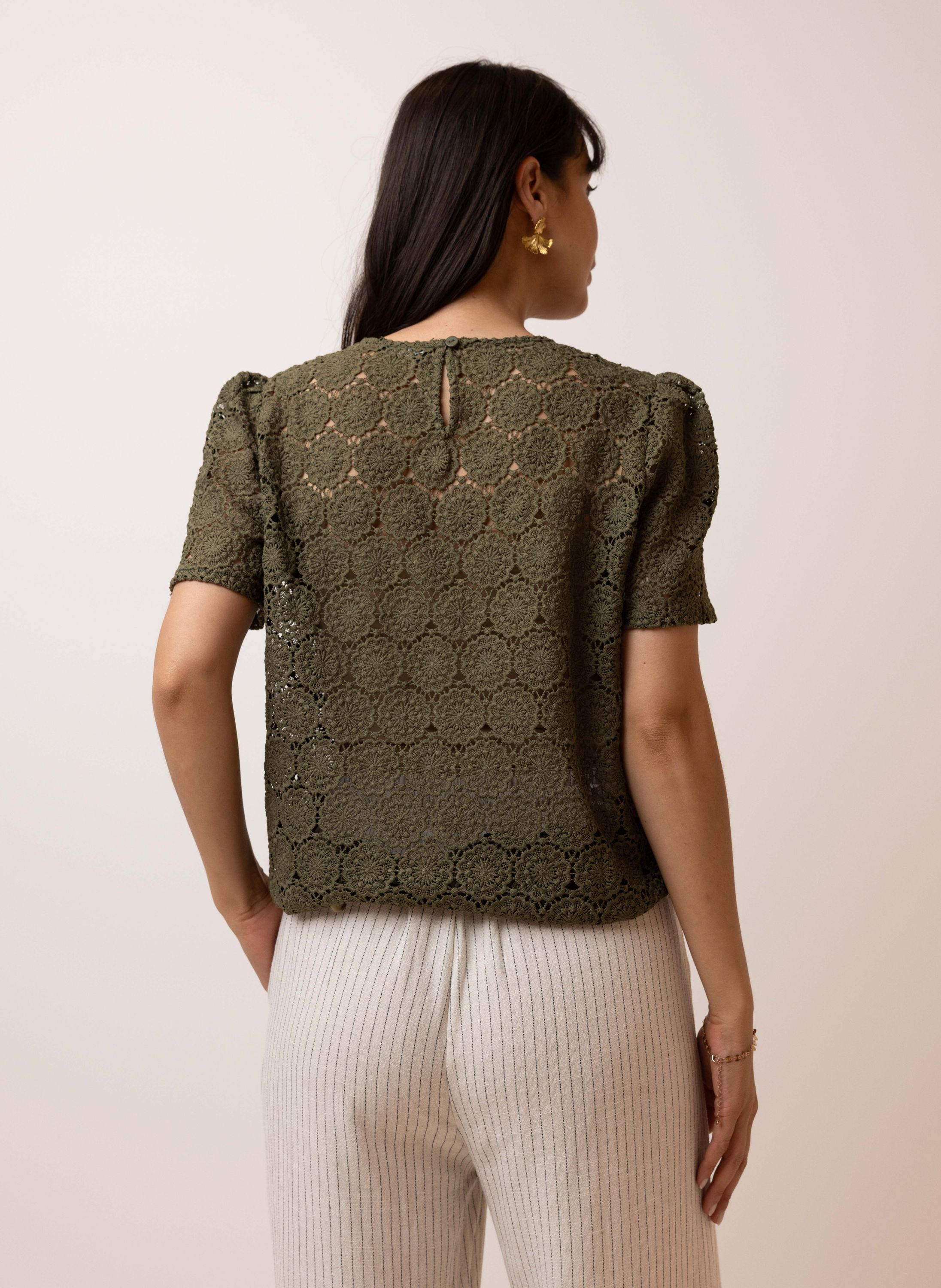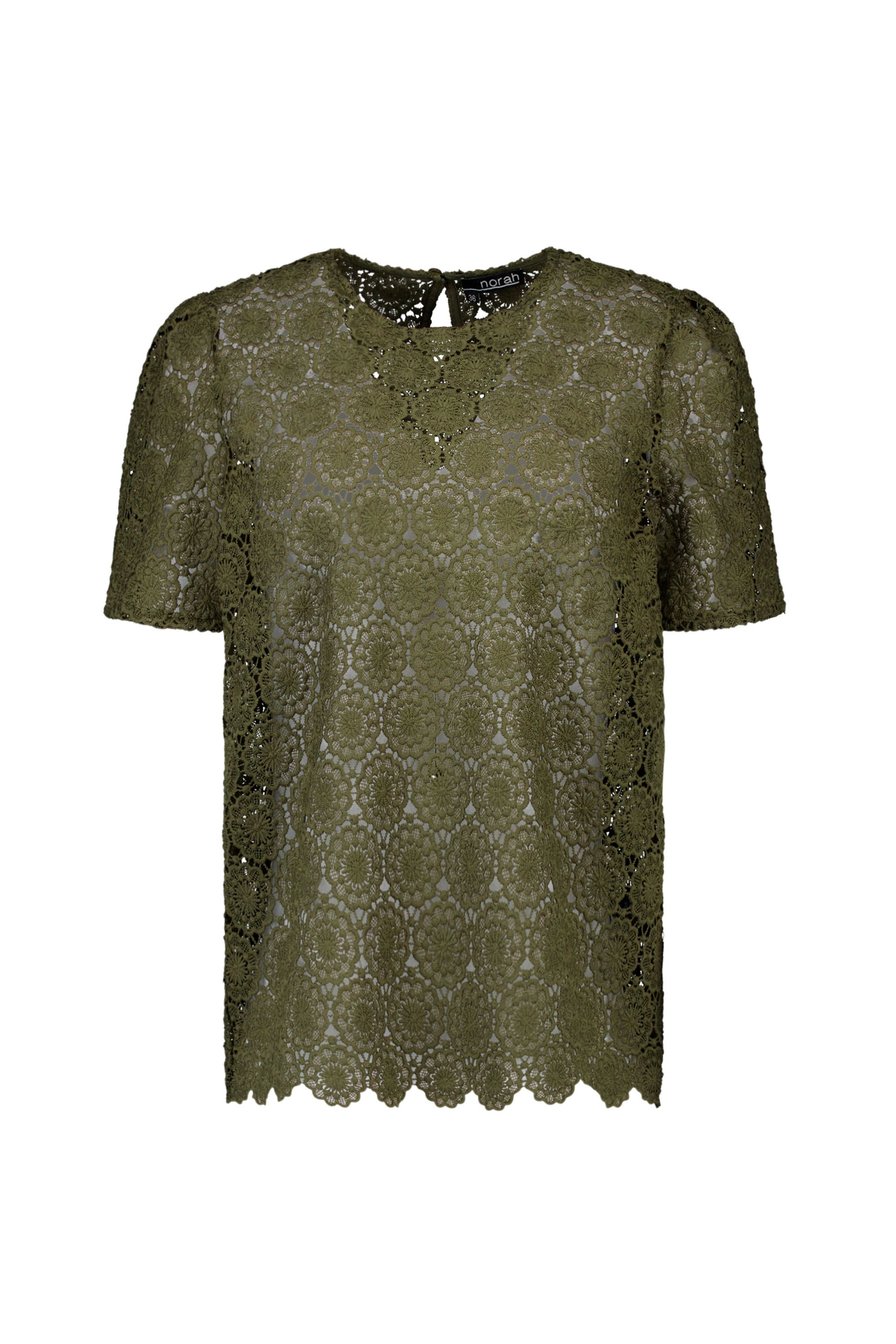 Dit kanten shirt met ronde hals en korte mouwen schijnt licht door. We adviseren je er een Marianne top onder te dragen.