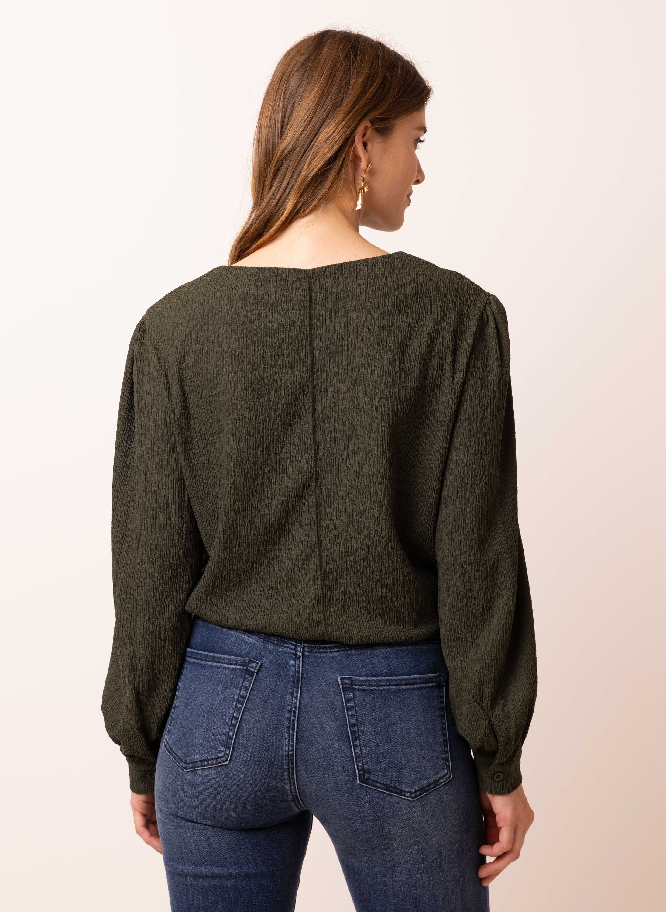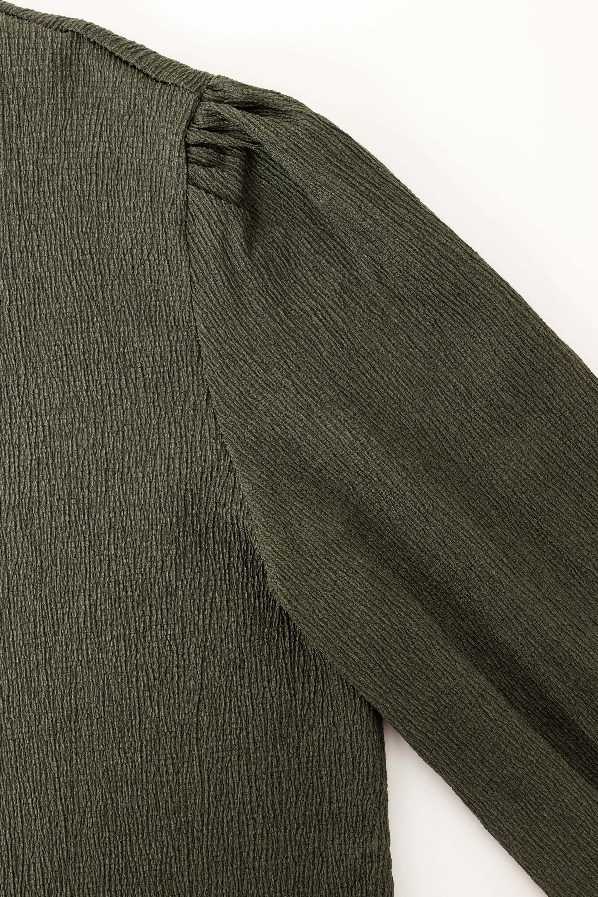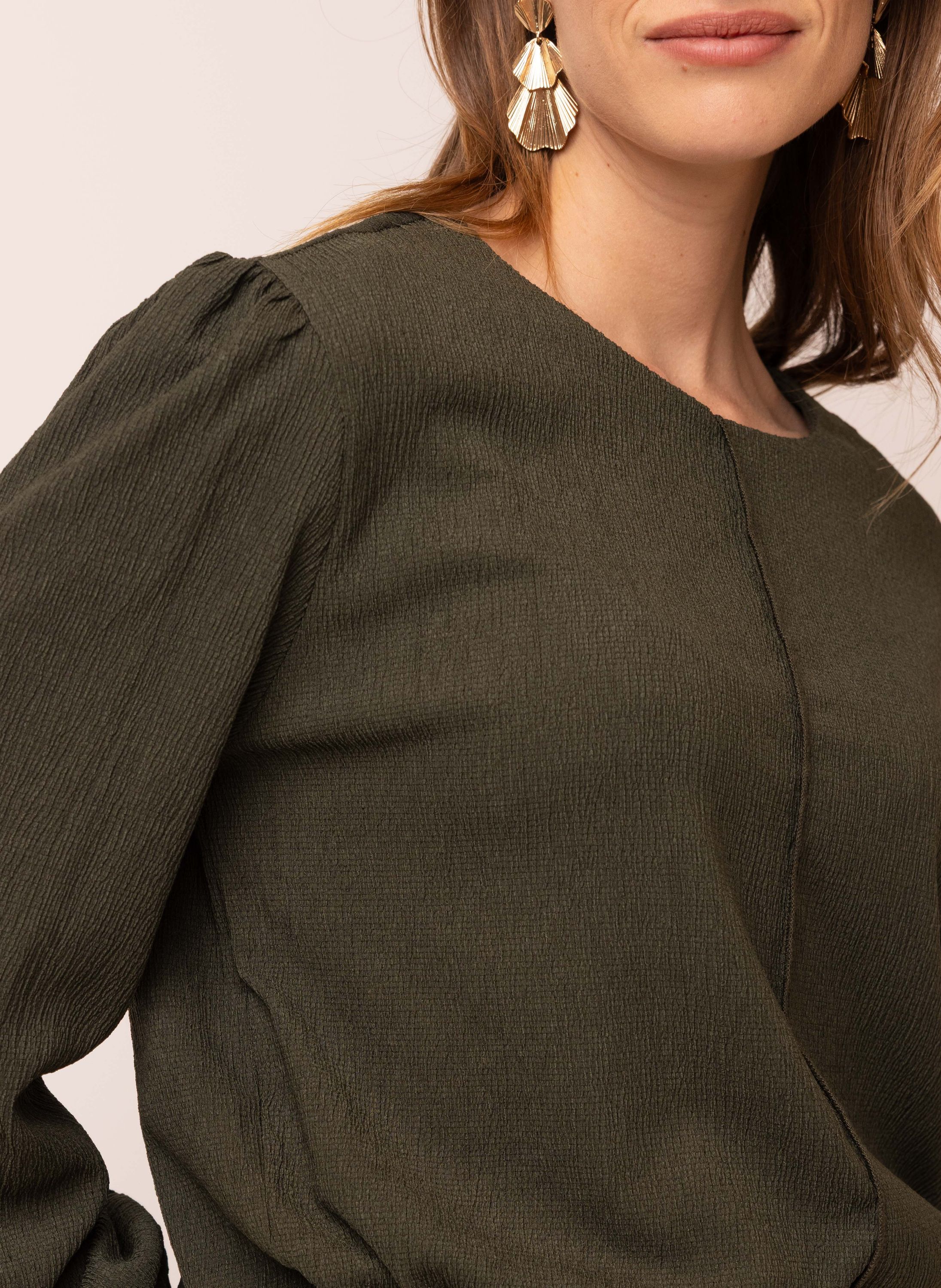 Dit shirt met ronde hals, lange pofmouwen en een naad in het midden van de voor- en achterzijde heeft een vrouwelijke uitstraling.