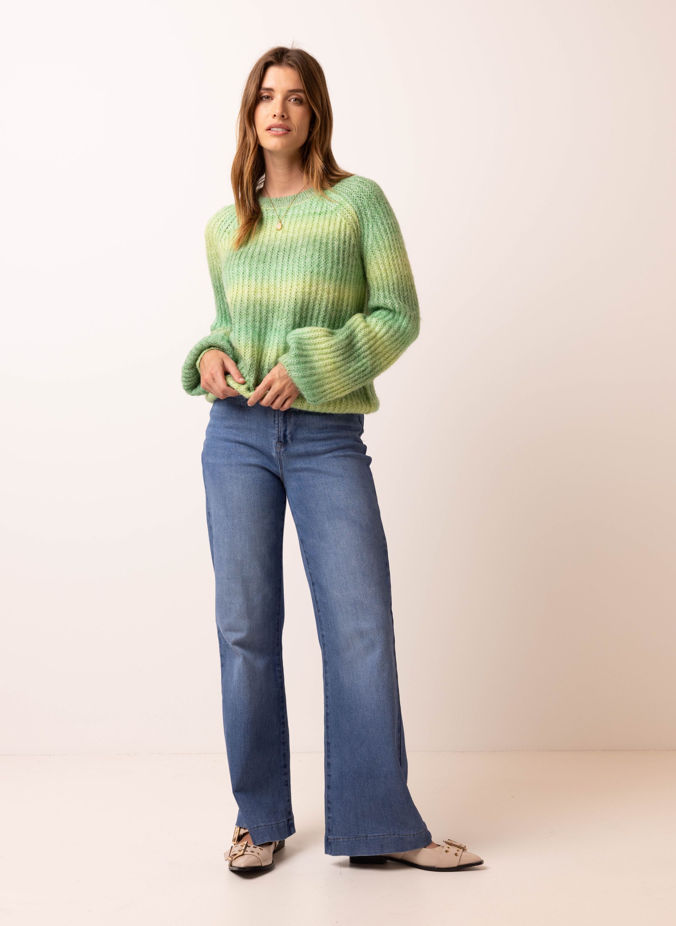 Deze gebreide trui met ronde hals en lange mouwen heeft een vrolijk streeppatroon in gele en neutrale tinten en geeft je look een frisse touch.