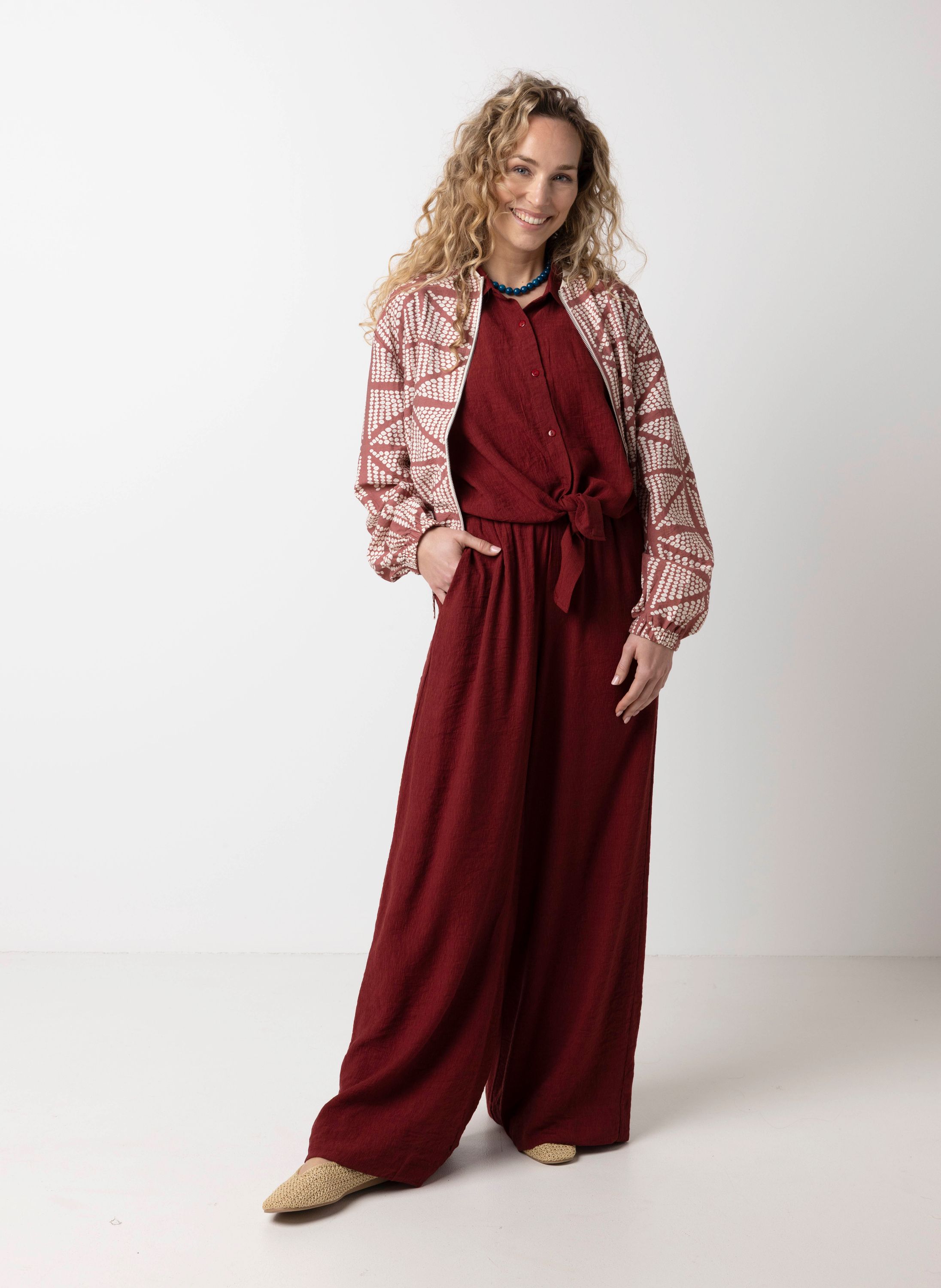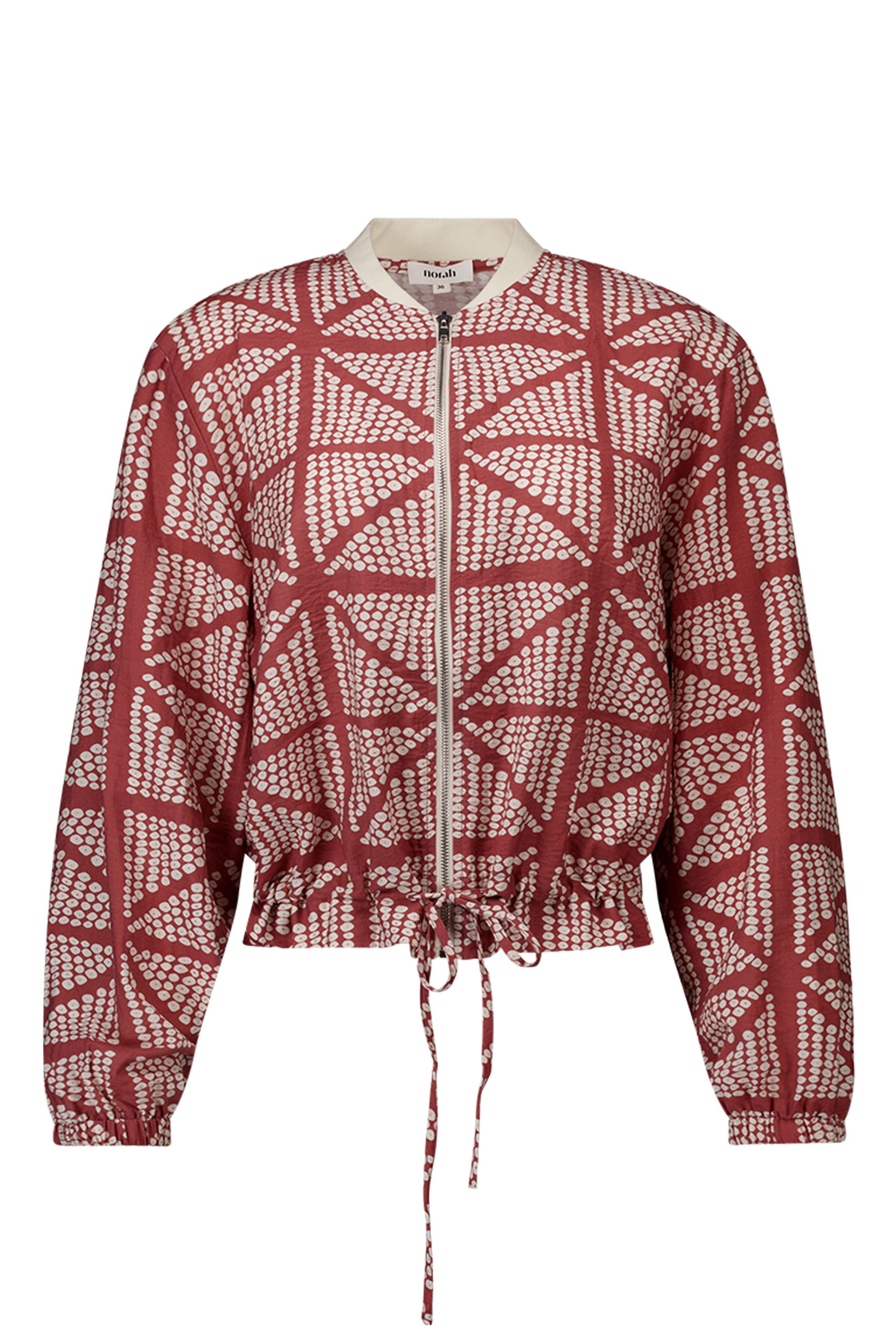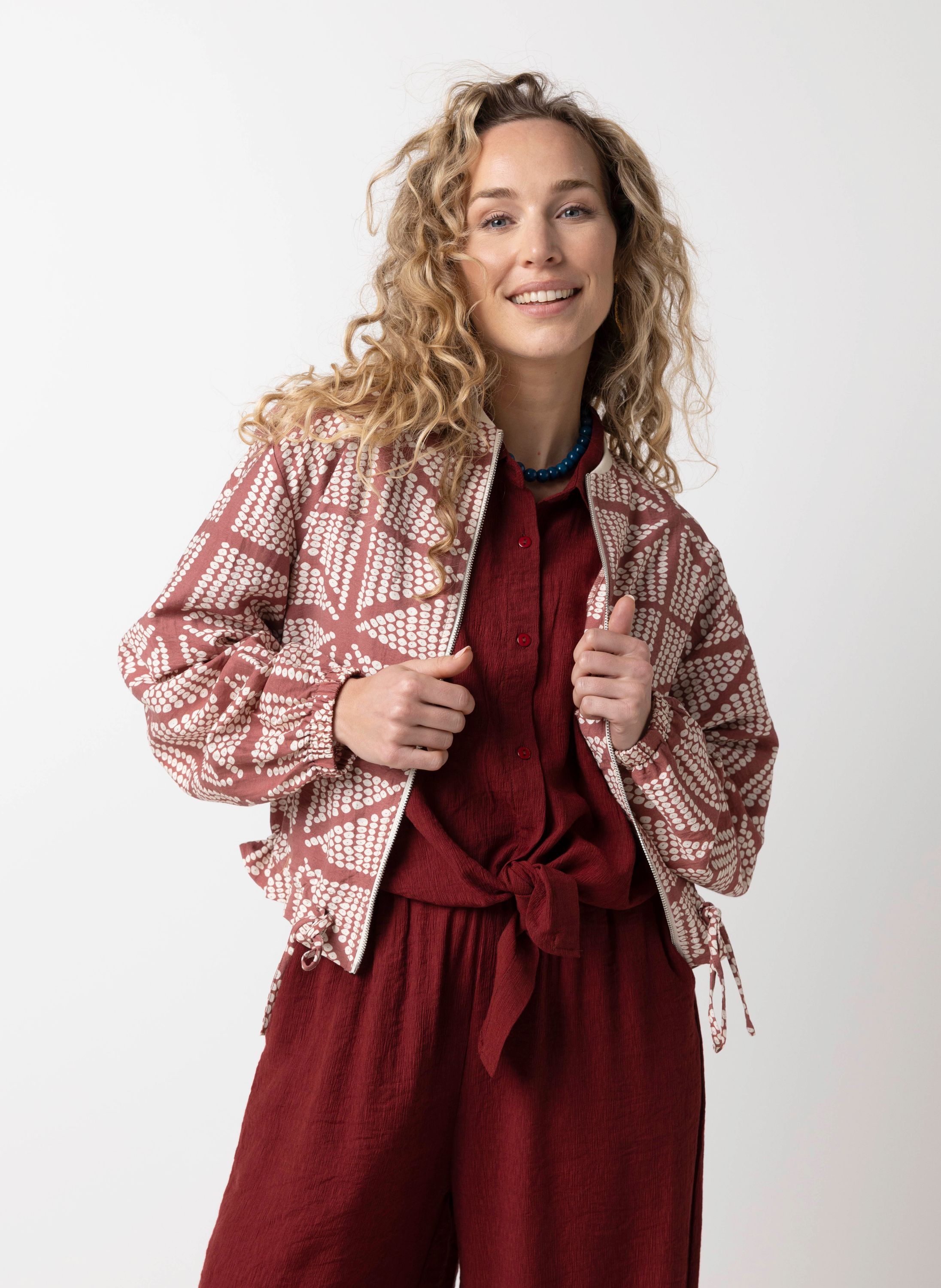 Dit jasje met ronde hals, knoopsluiting, lange mouwen en strikkoord aan de onderzijde heeft een speels detail.