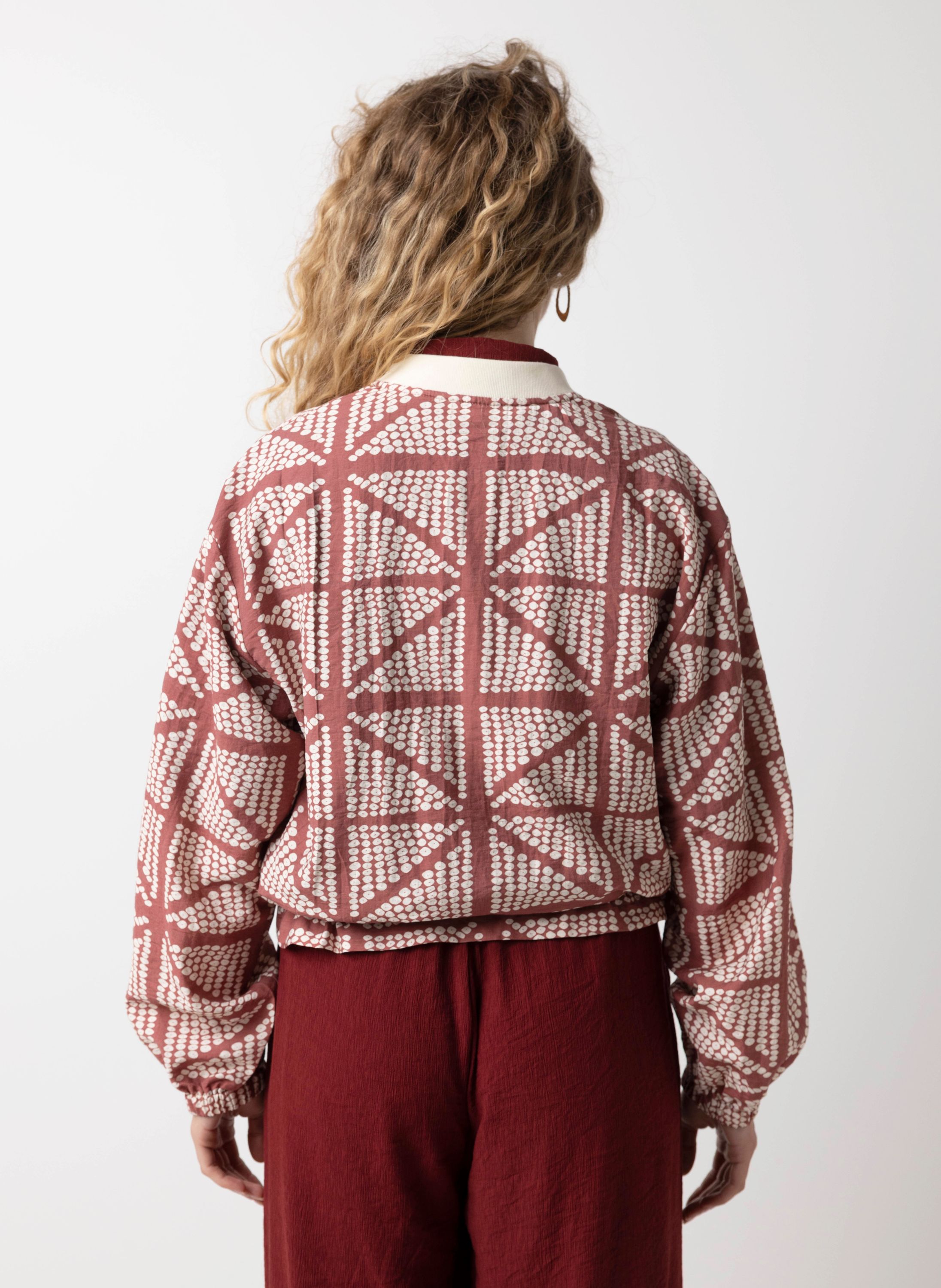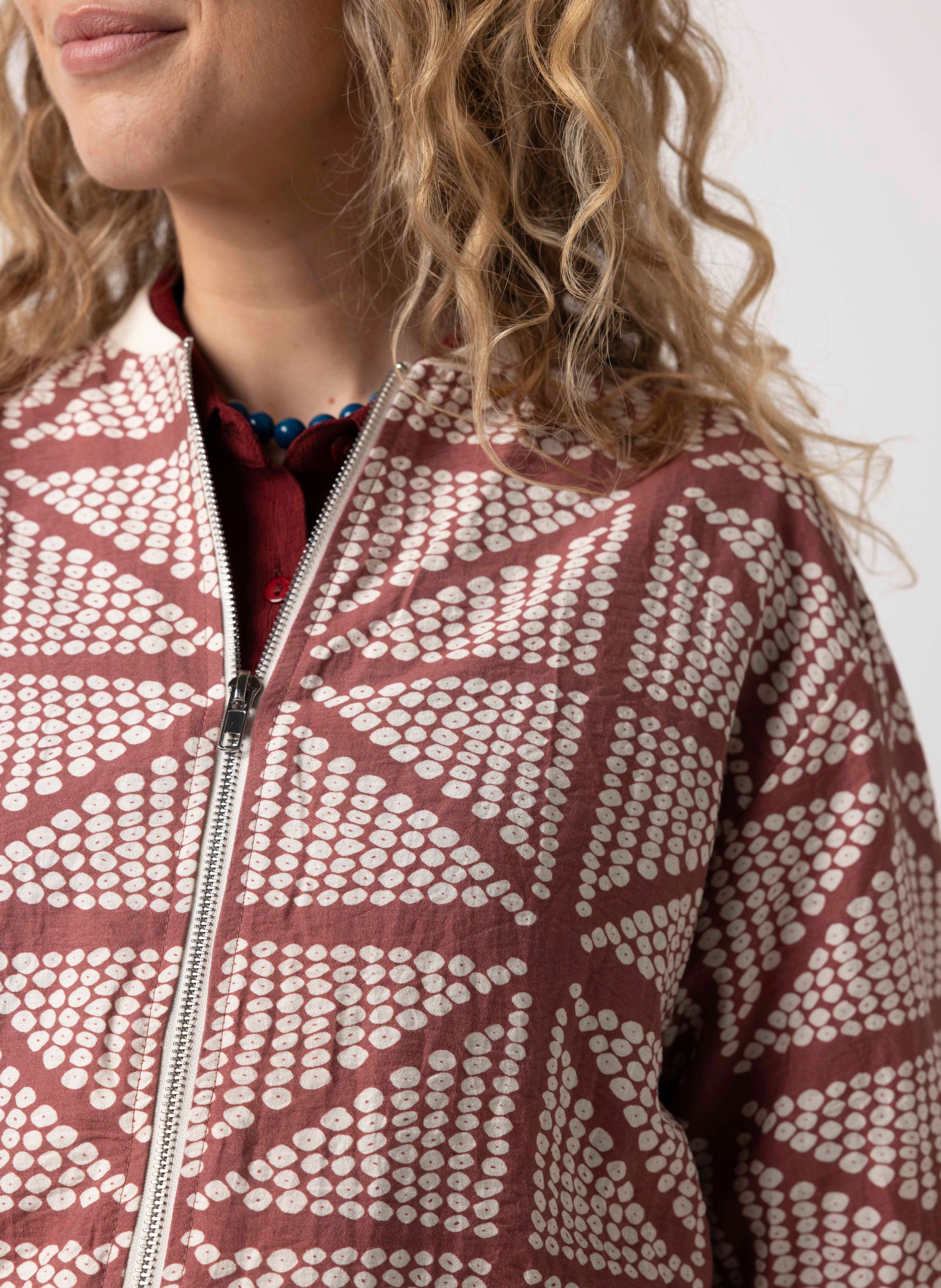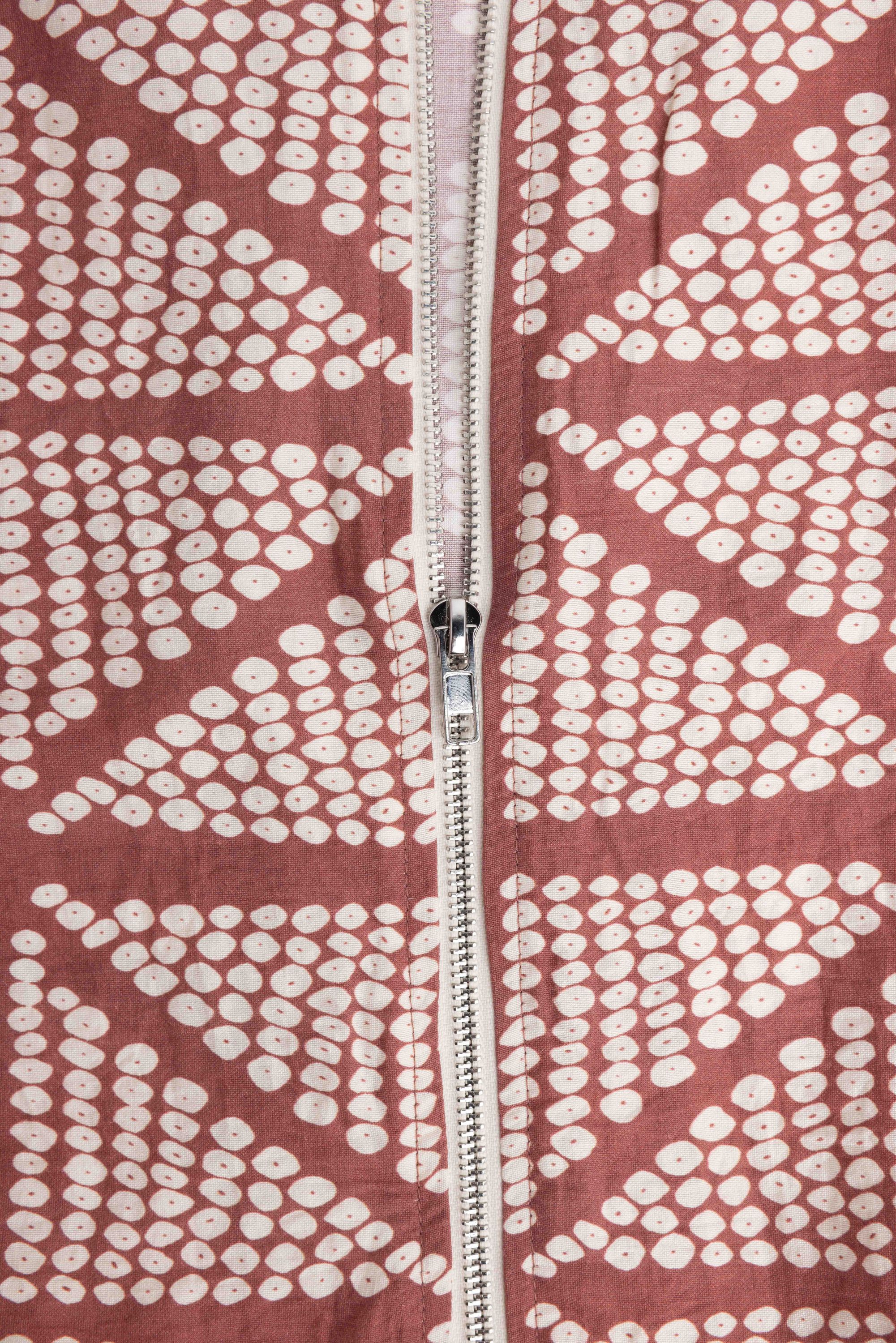 Dit jasje met ronde hals, knoopsluiting, lange mouwen en strikkoord aan de onderzijde heeft een speels detail.