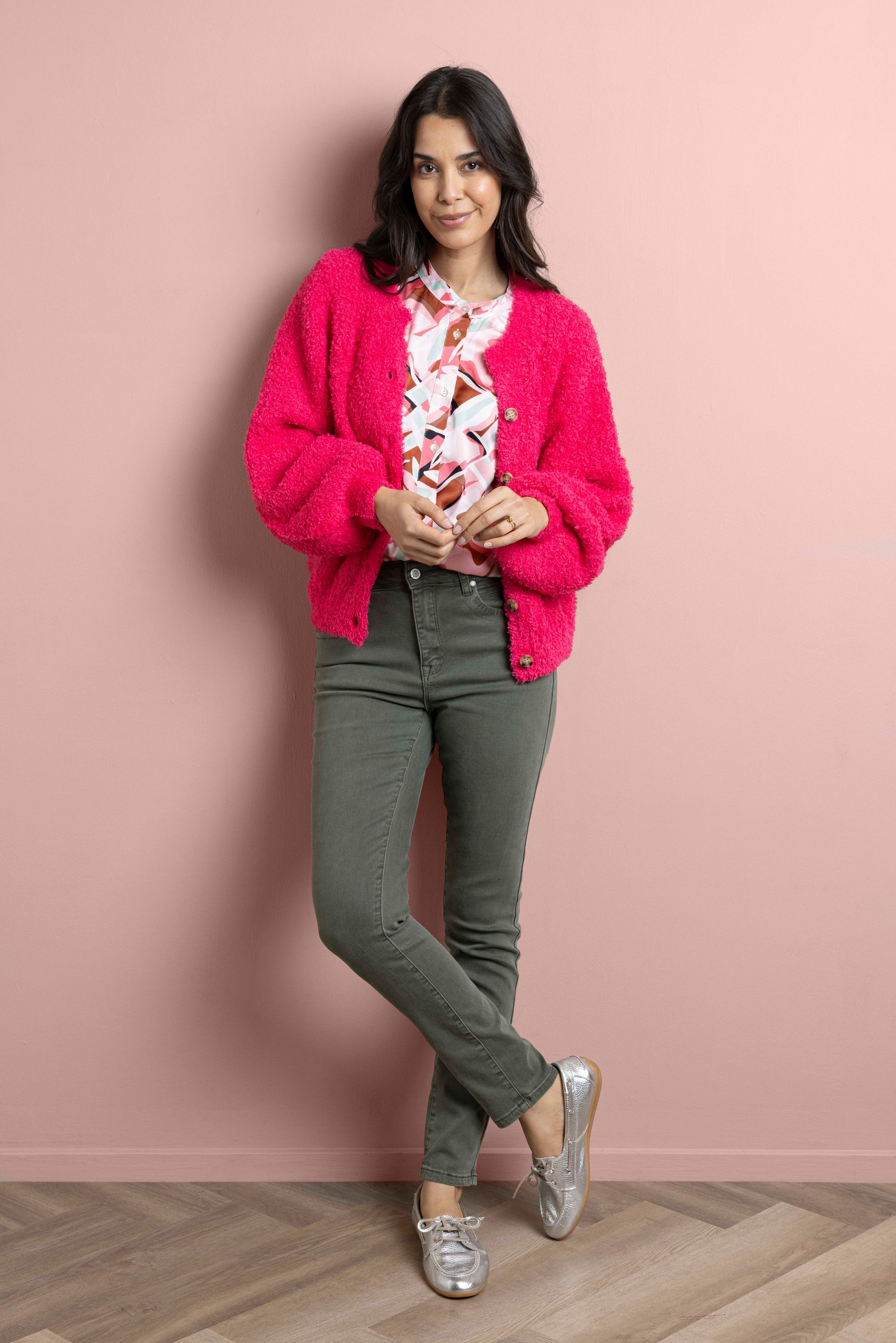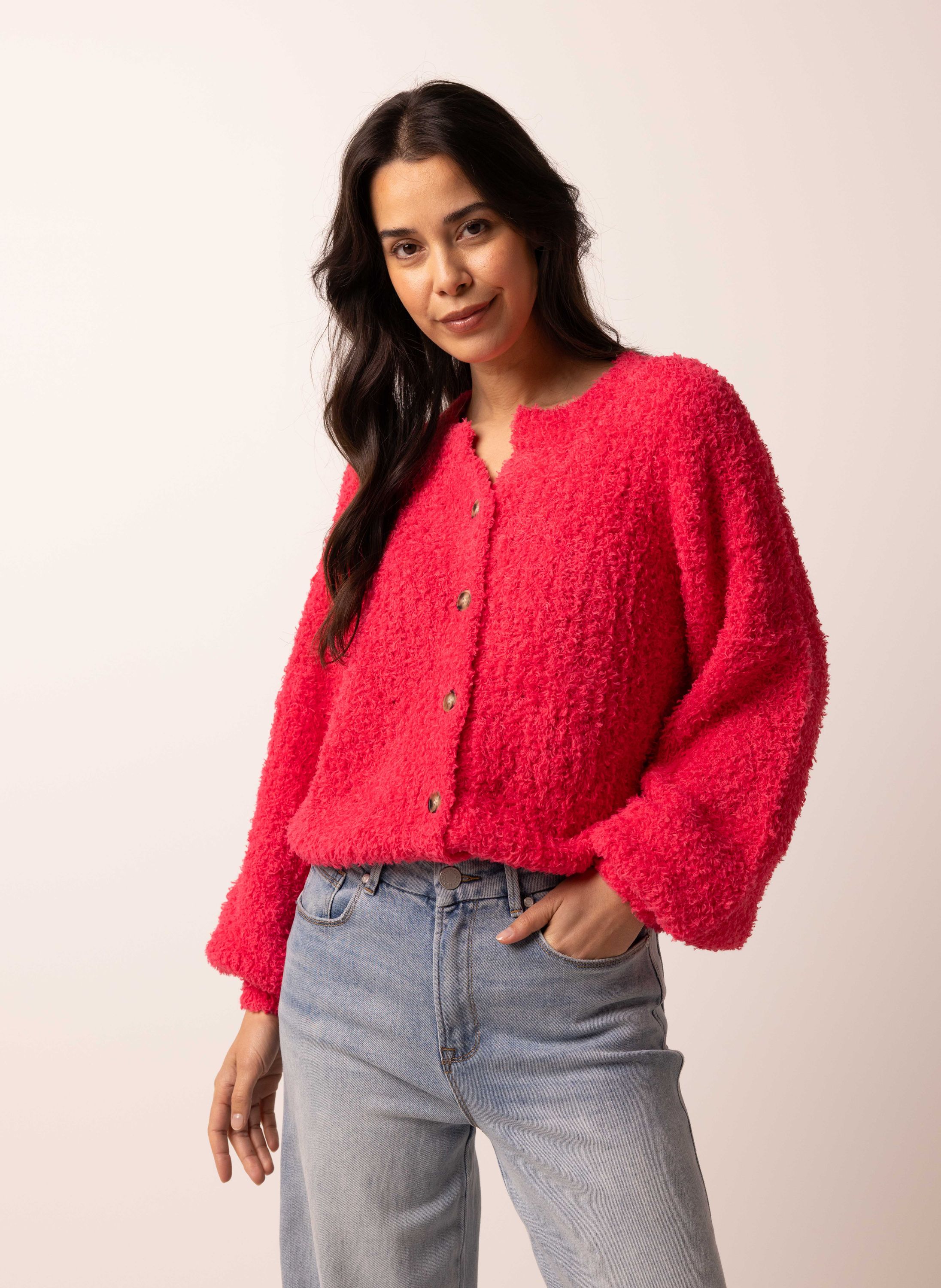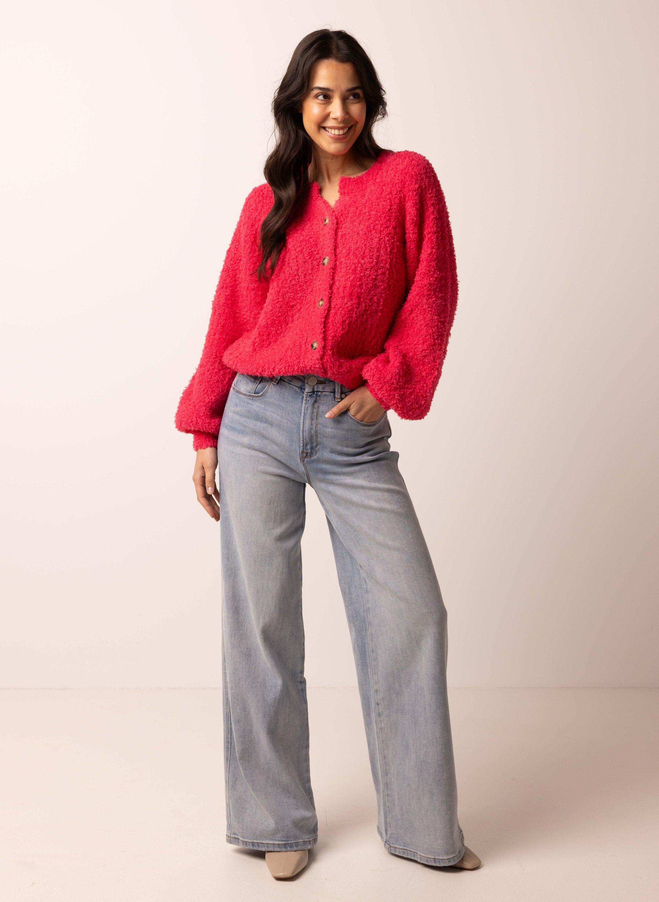 Dit zachte vest met V-hals en knoopsluiting is gemaakt van een stretchy stof en heeft lange ballonmouwen voor een vrouwelijke touch.