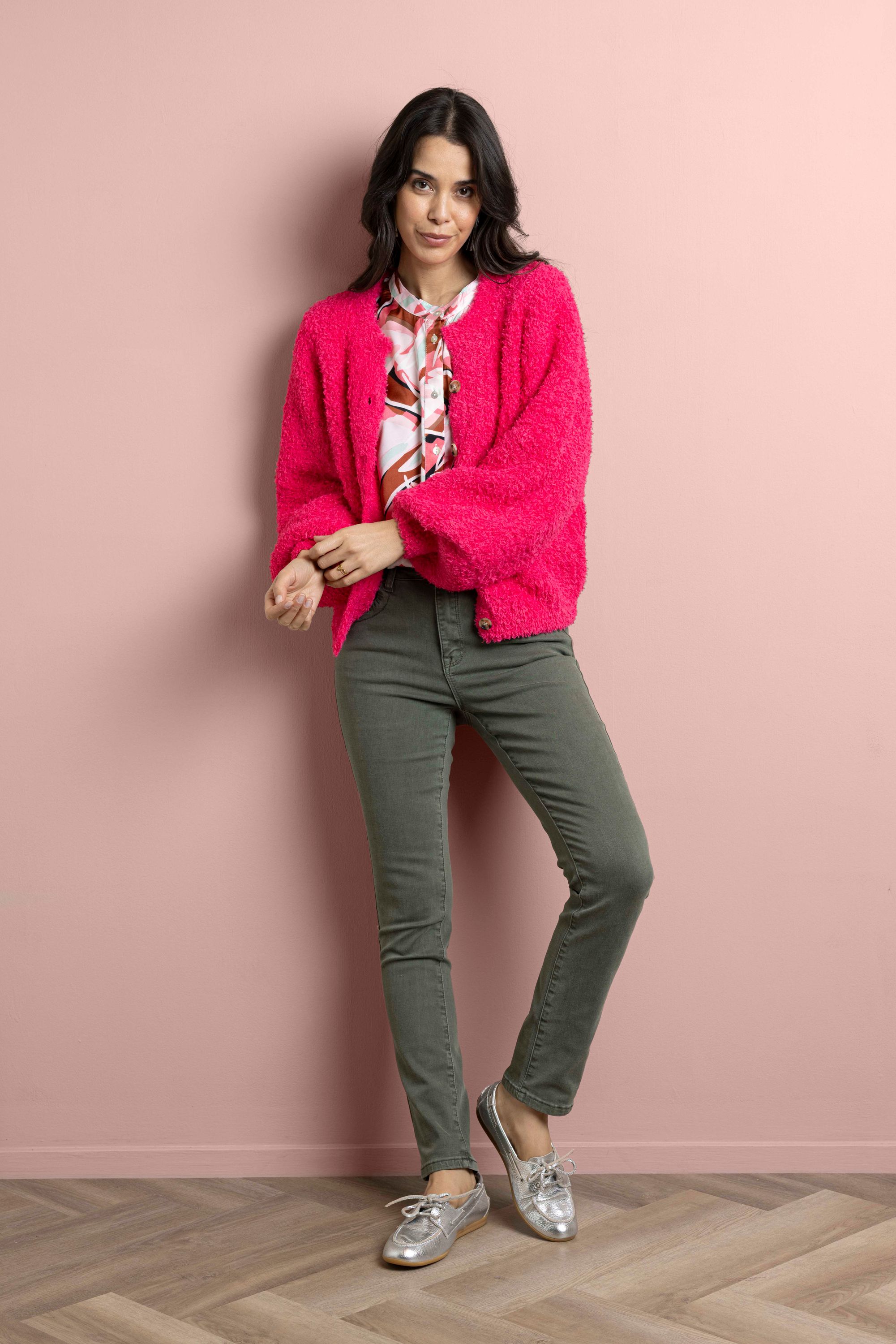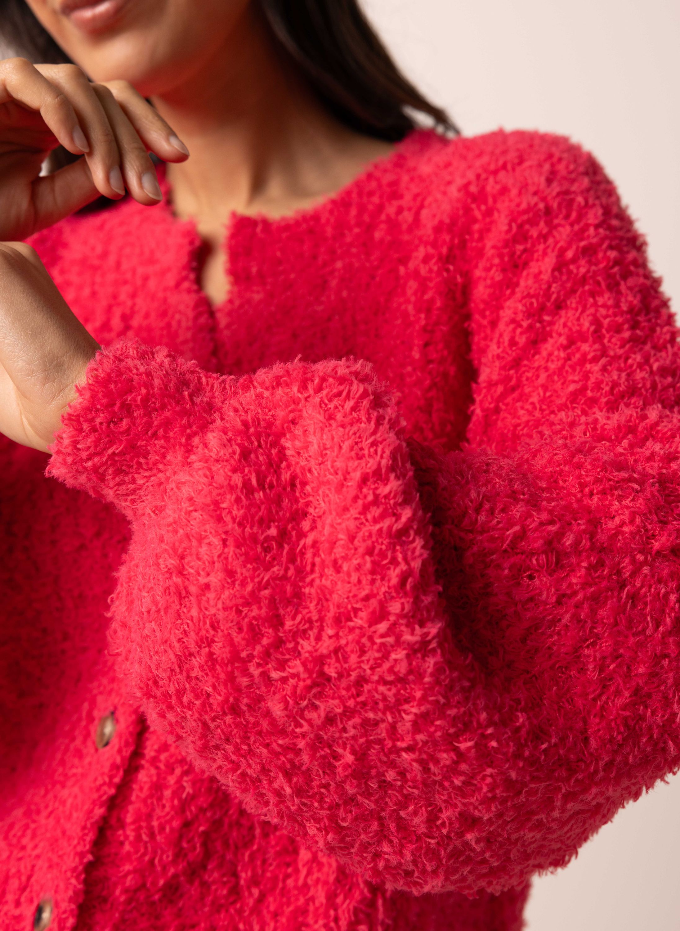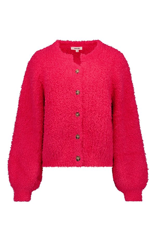 Dit zachte vest met V-hals en knoopsluiting is gemaakt van een stretchy stof en heeft lange ballonmouwen voor een vrouwelijke touch.
