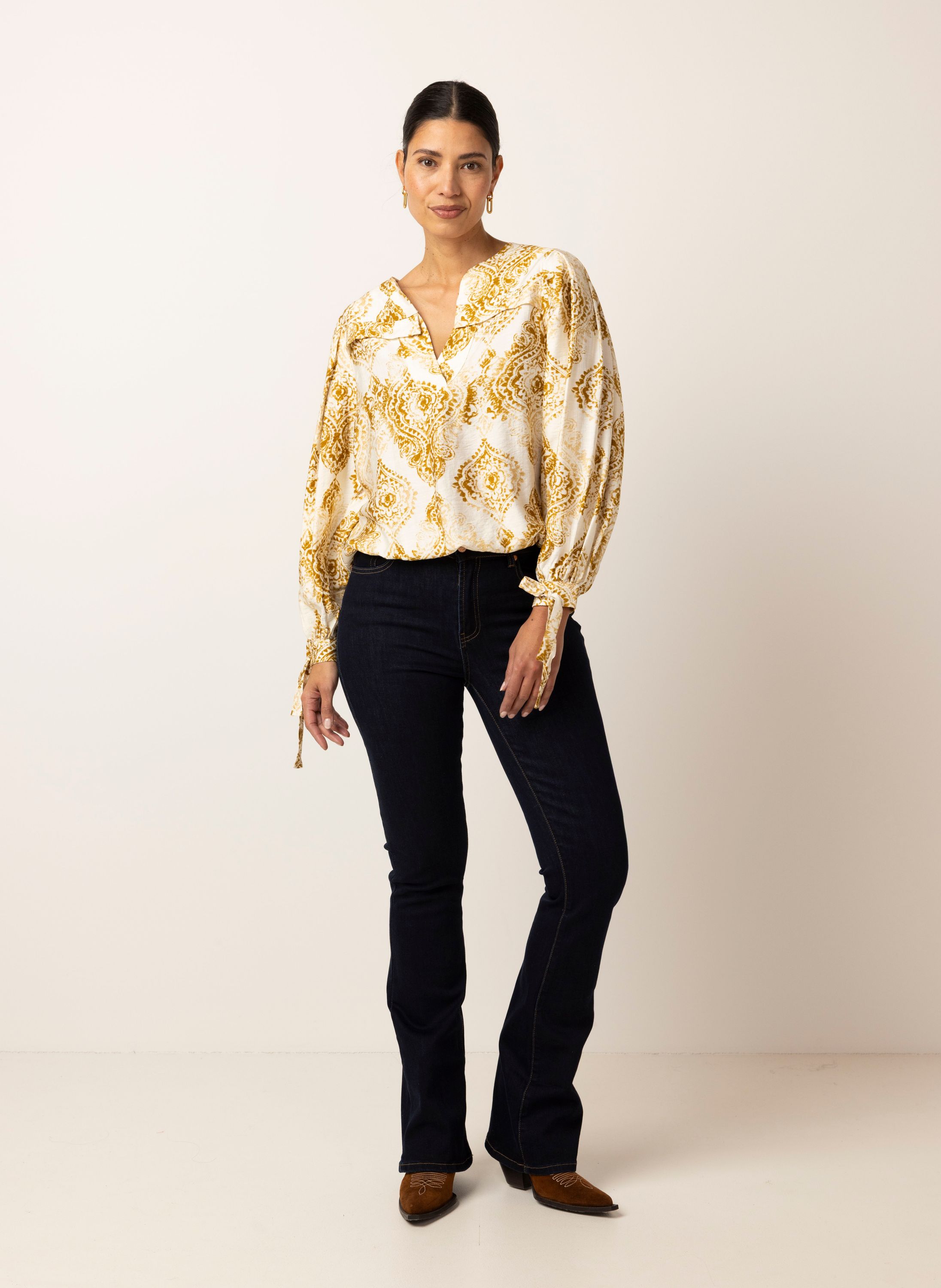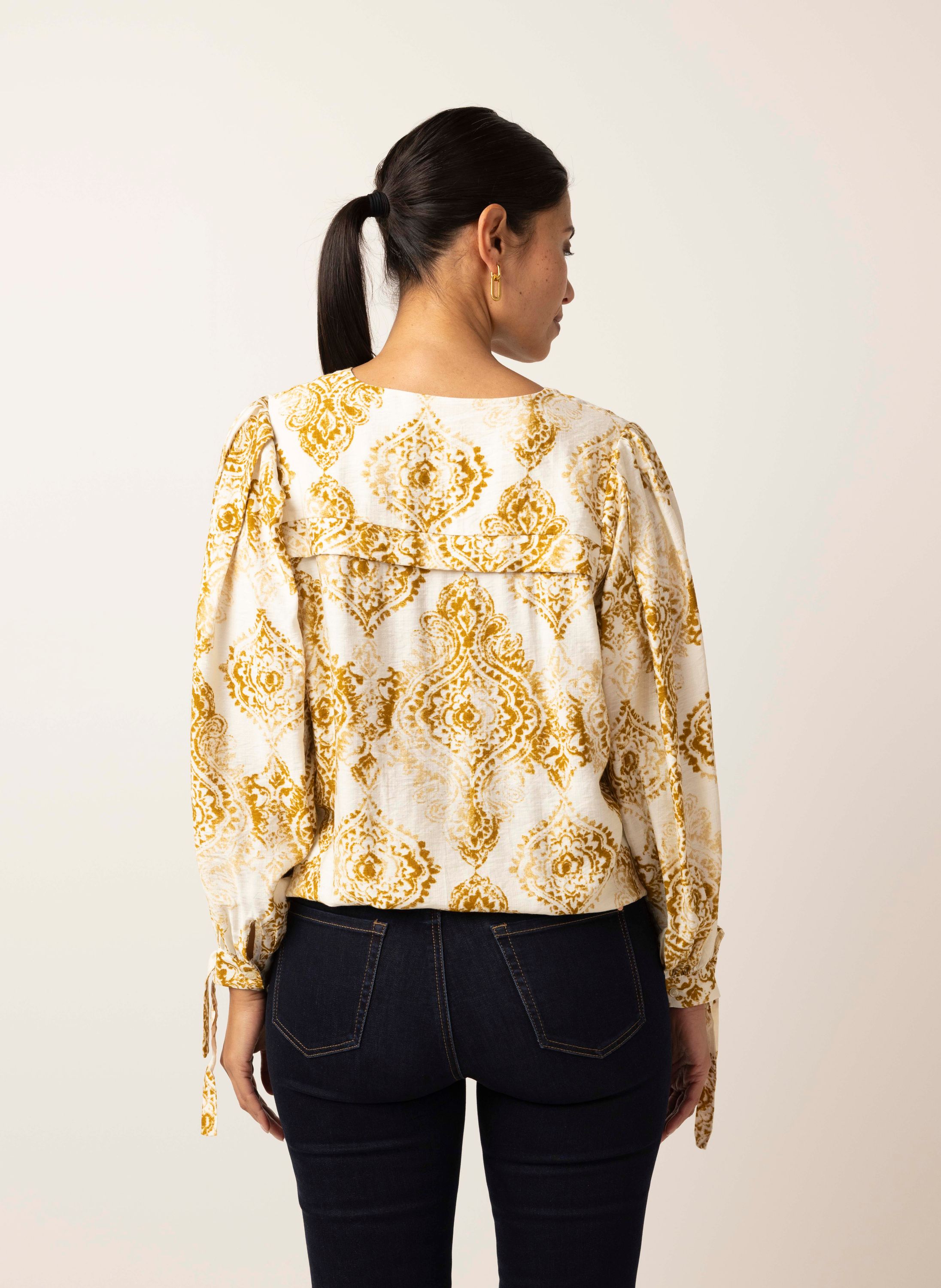 Deze blouse heeft een V-hals, lange pofmouwen met decoratieve strik en een elastische band aan de onderzijde. Dit item is exclusief verkrijgbaar in geselecteerde winkels en online. Controleer de winkelvoorraad om de beschikbaarheid in een winkel bij jou in de buurt te bekijken.