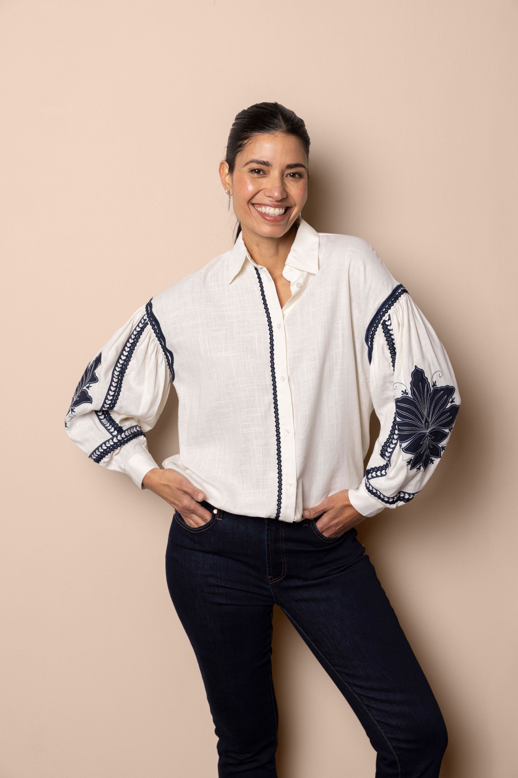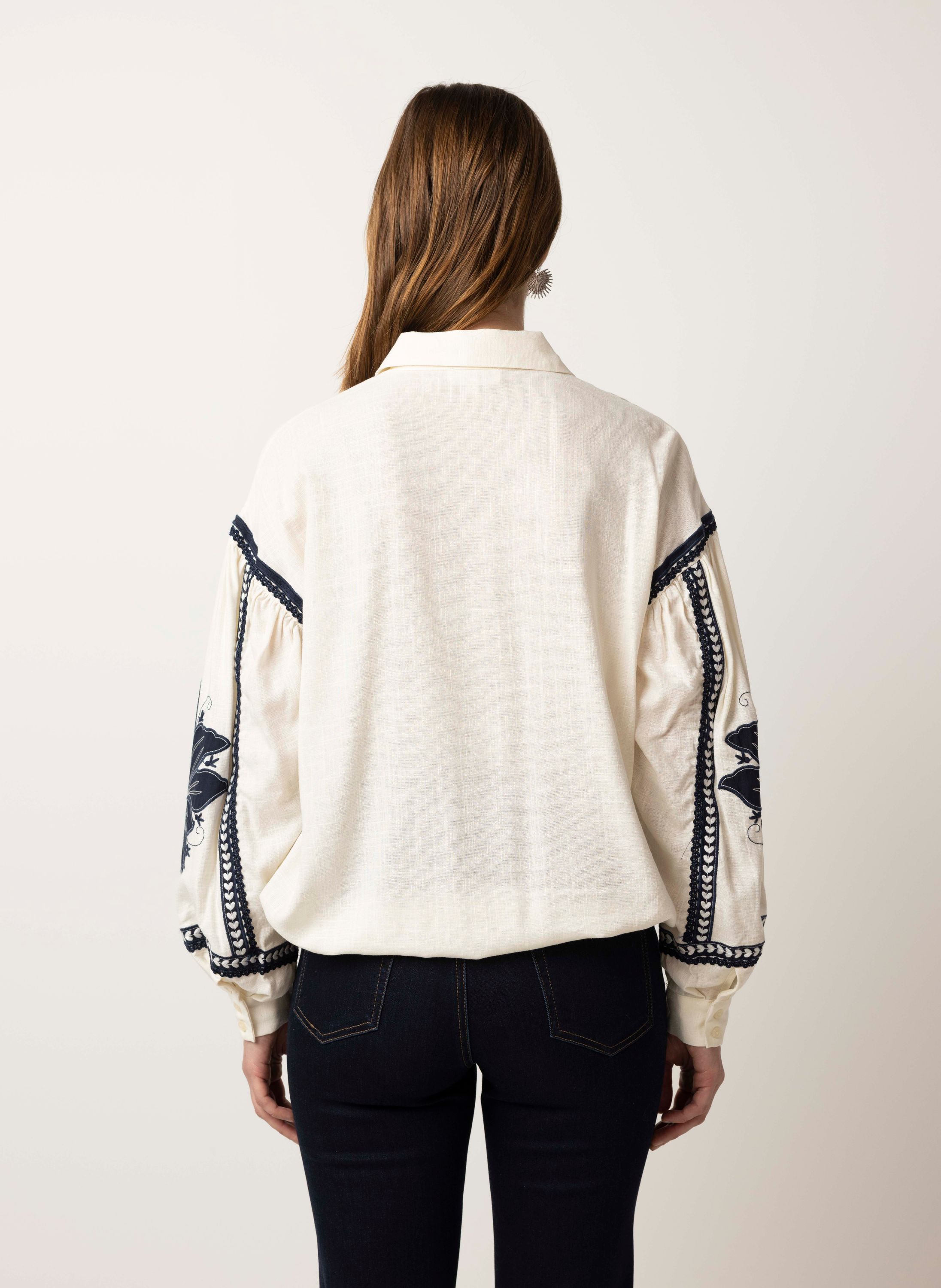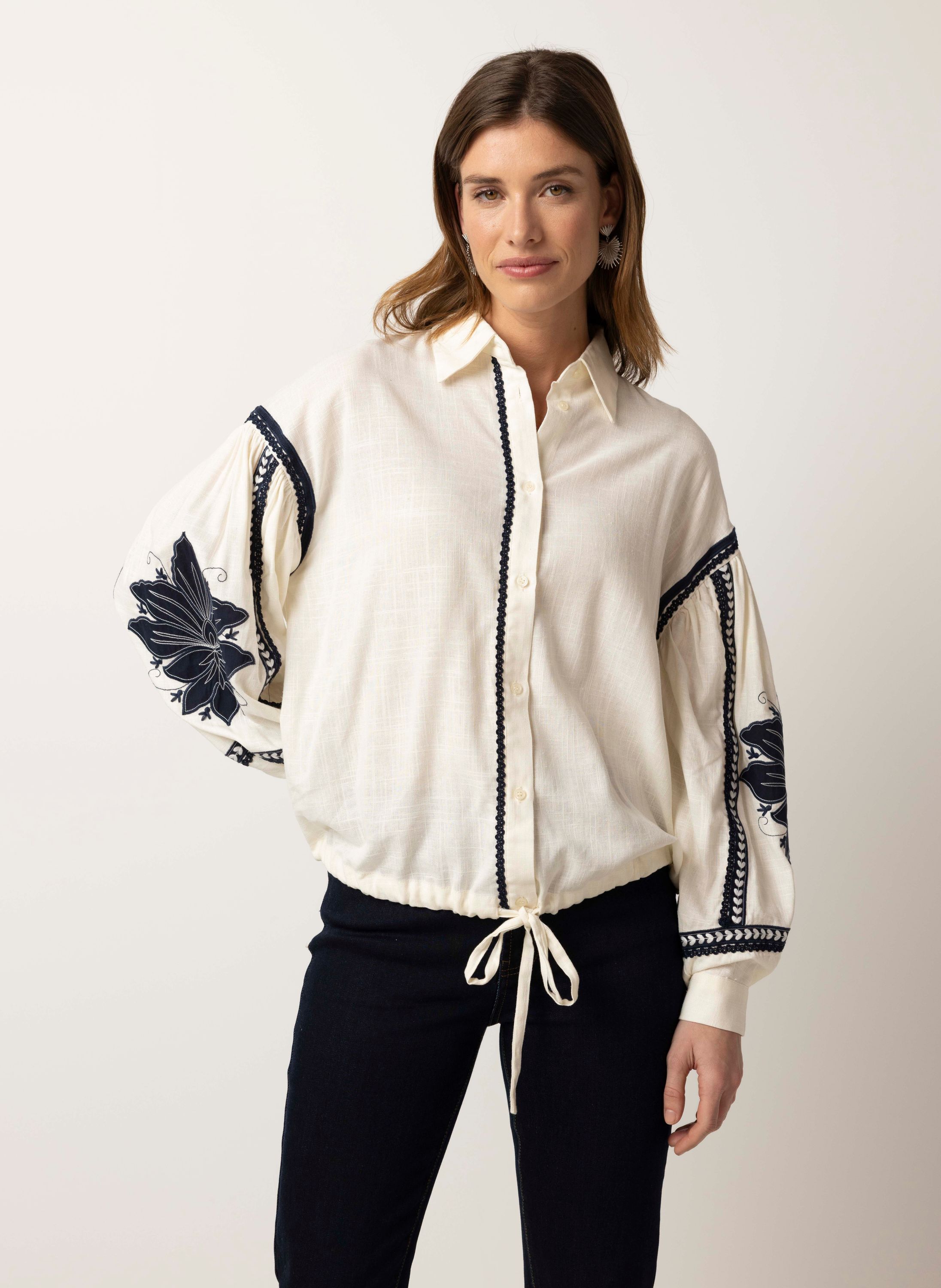 Deze blouse met klassieke kraag heeft lange ballonmouwen en een trekkoord aan de onderzijde.