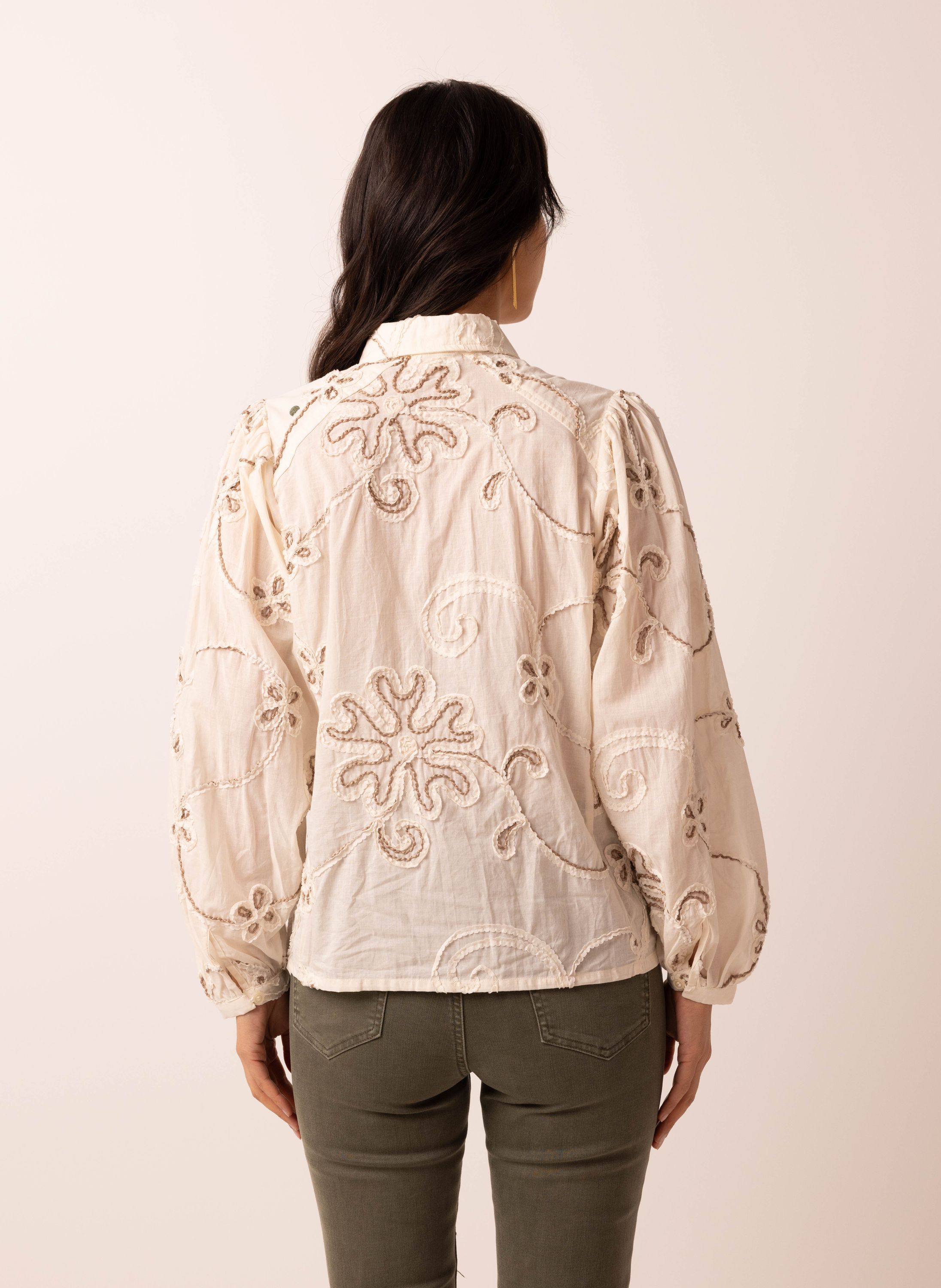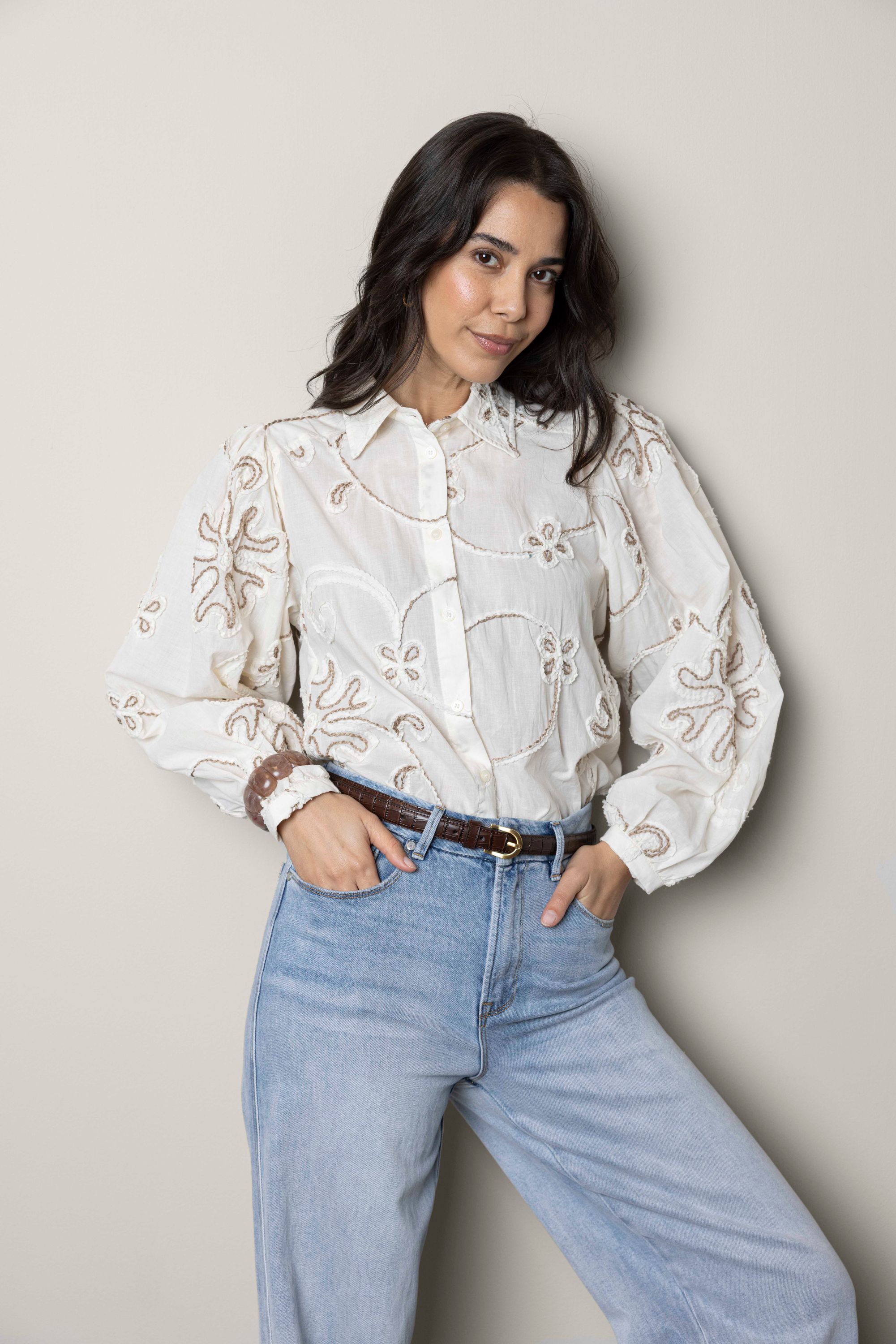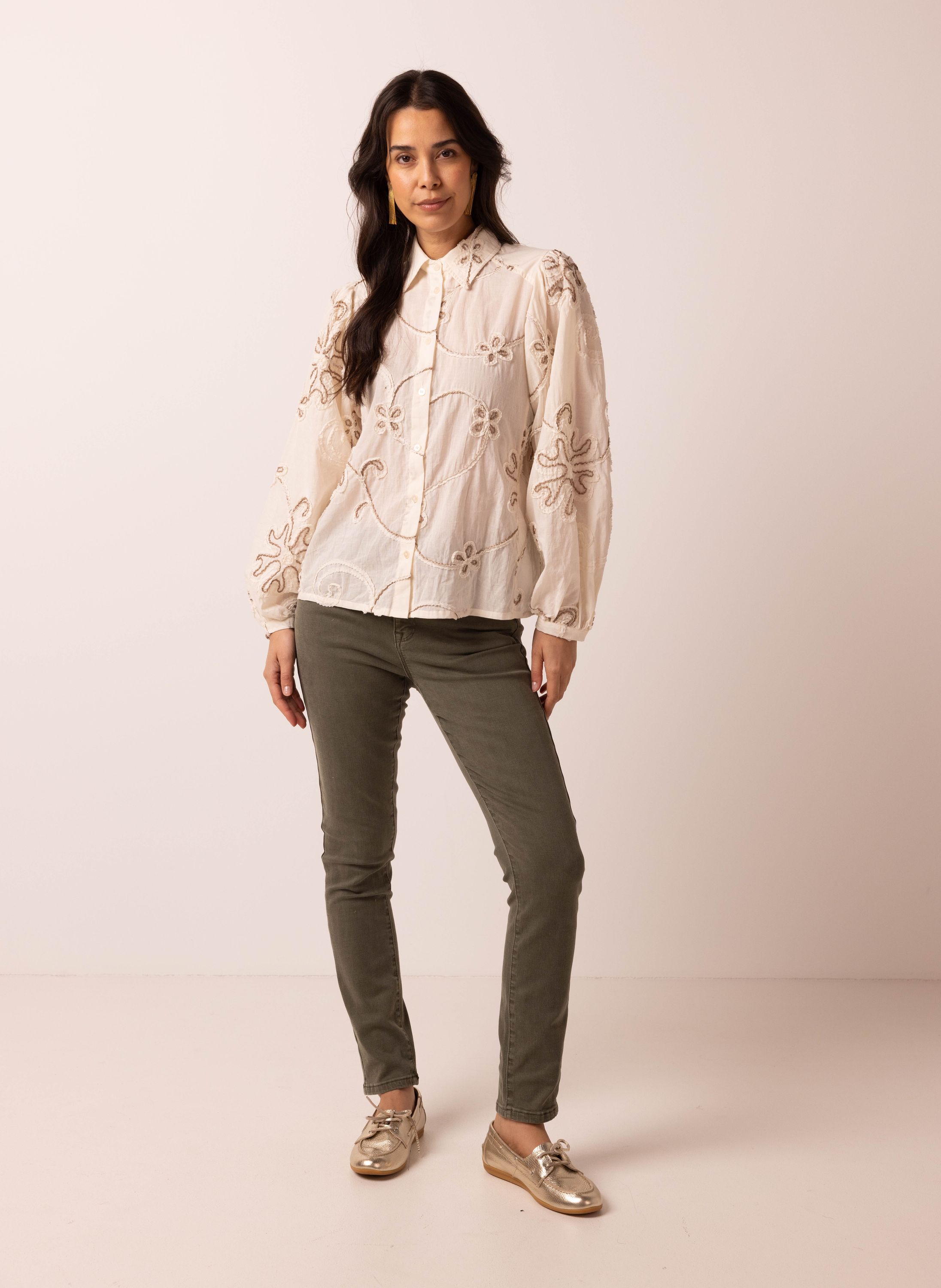 Deze blouse met kraag heeft een knoopsluiting en halflange pofmouwen met elastische boorden en een geborduurd patroon.