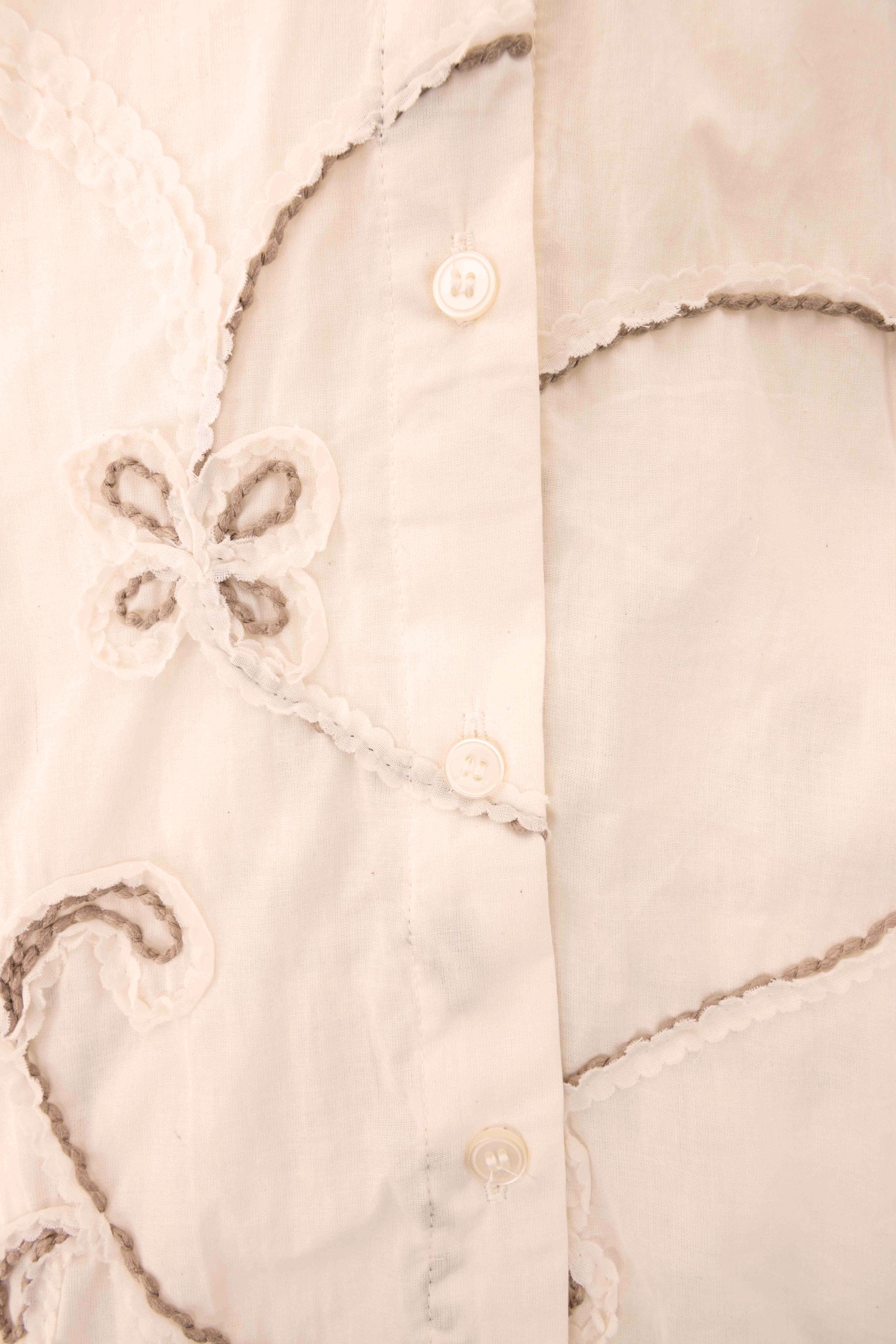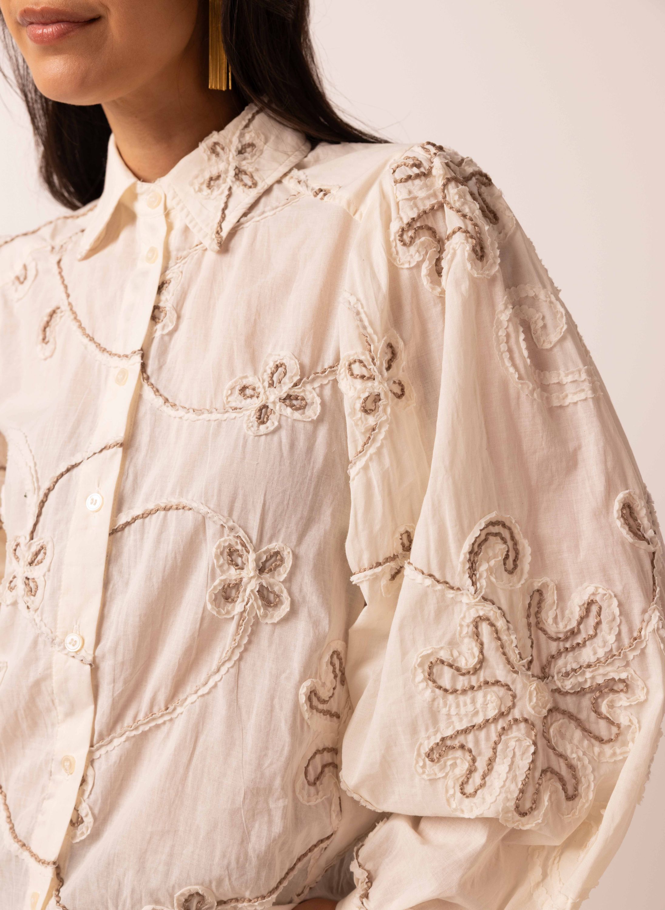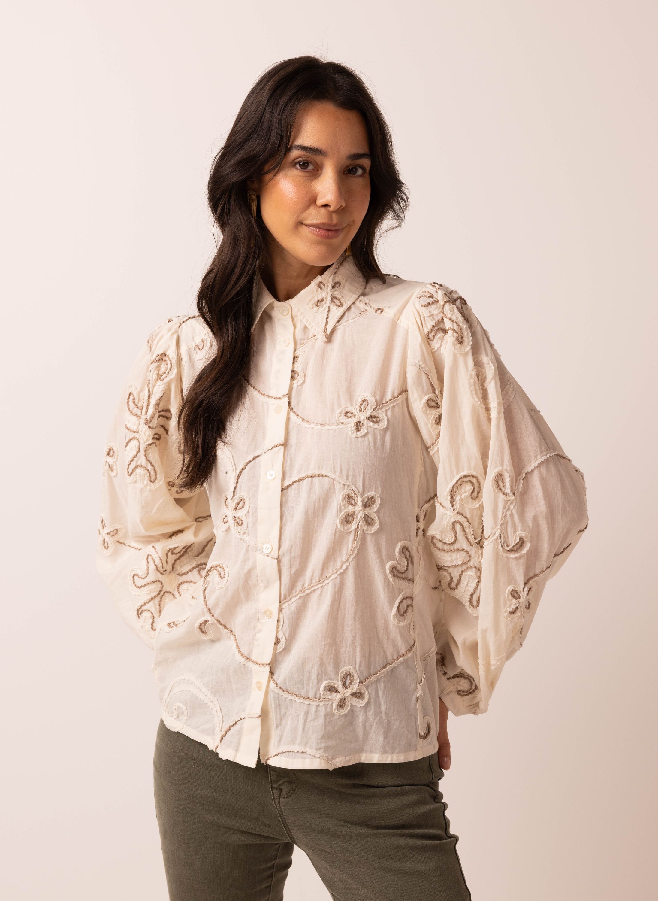 Deze blouse met kraag heeft een knoopsluiting en halflange pofmouwen met elastische boorden en een geborduurd patroon.
