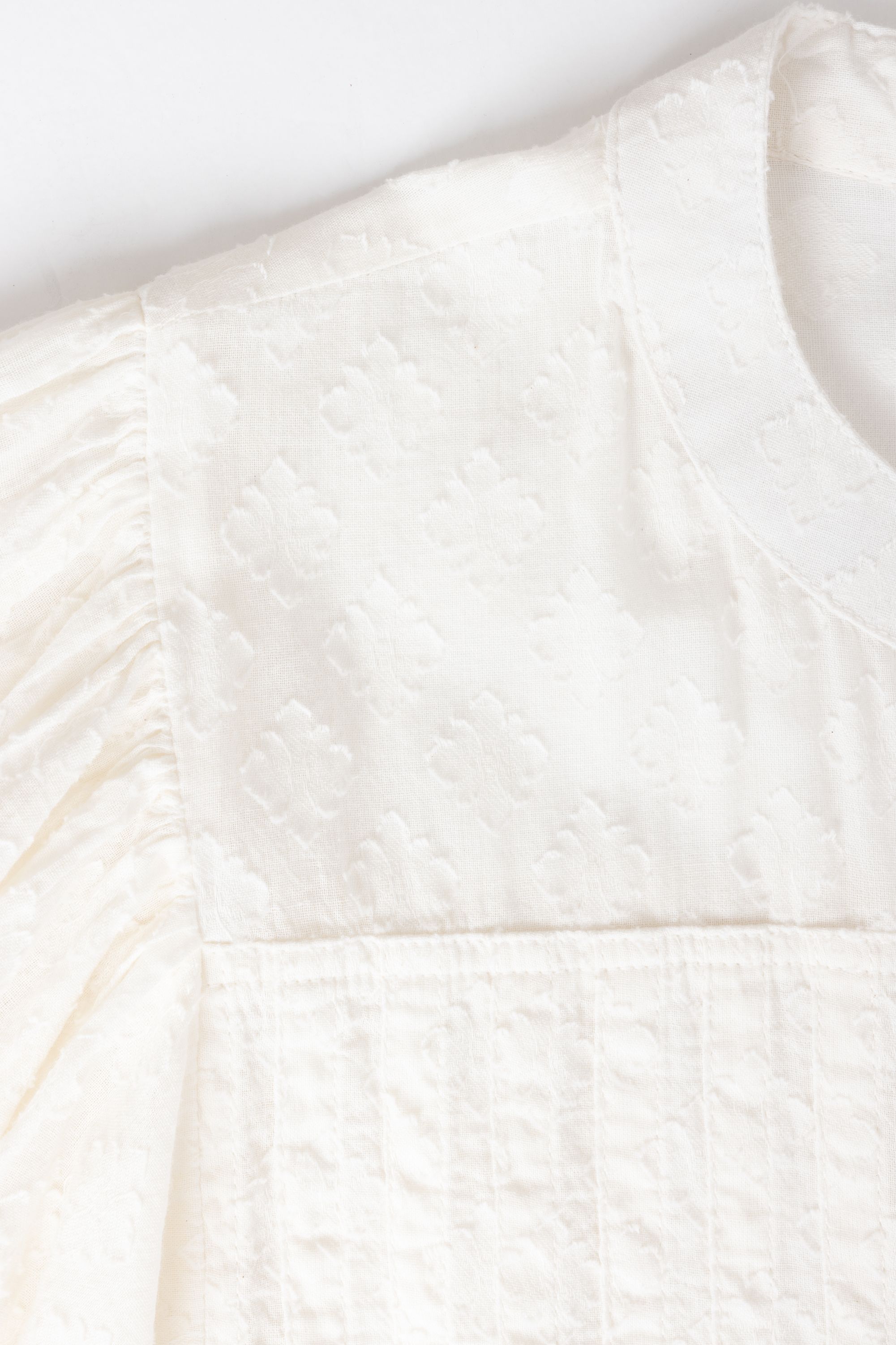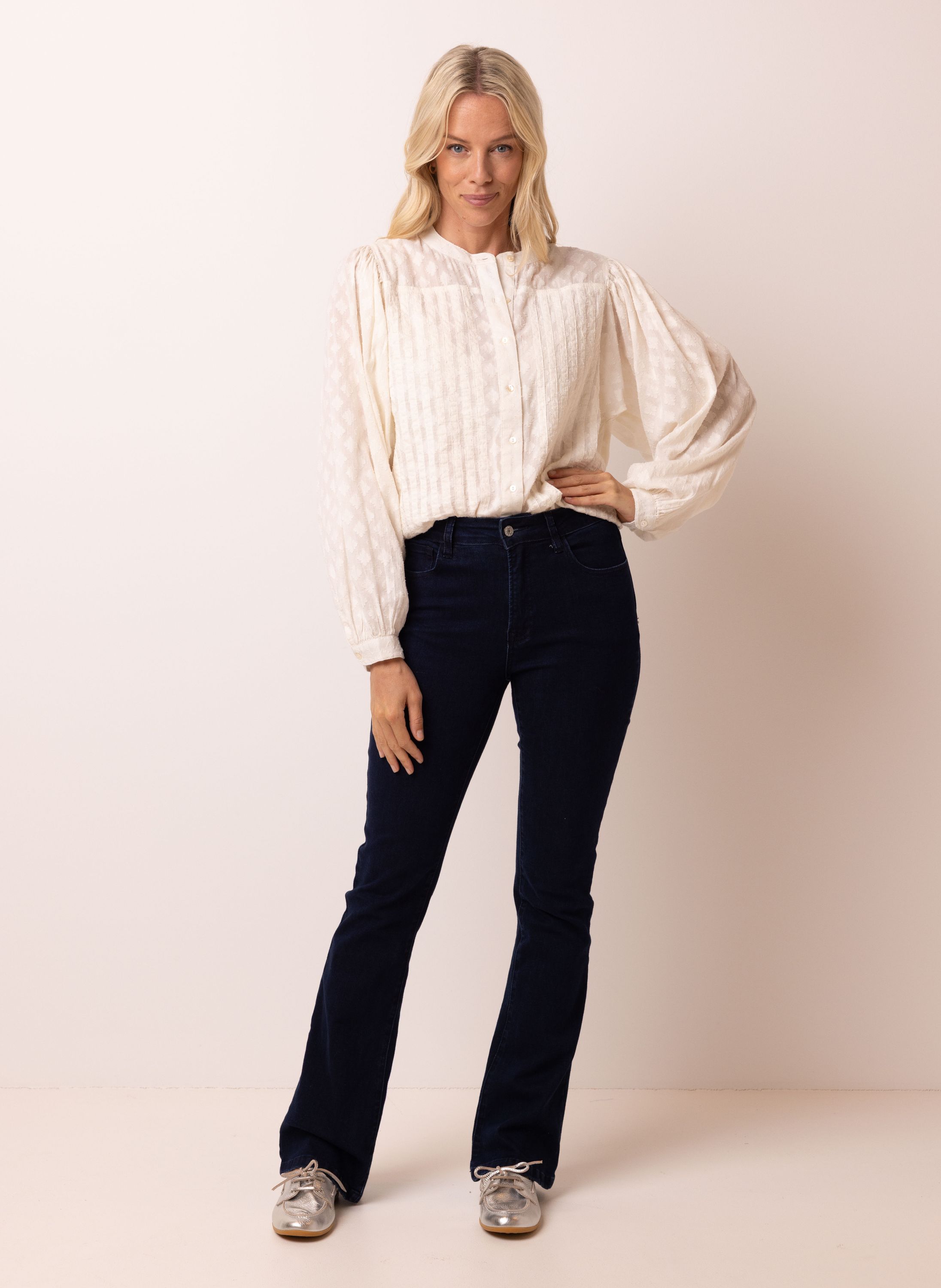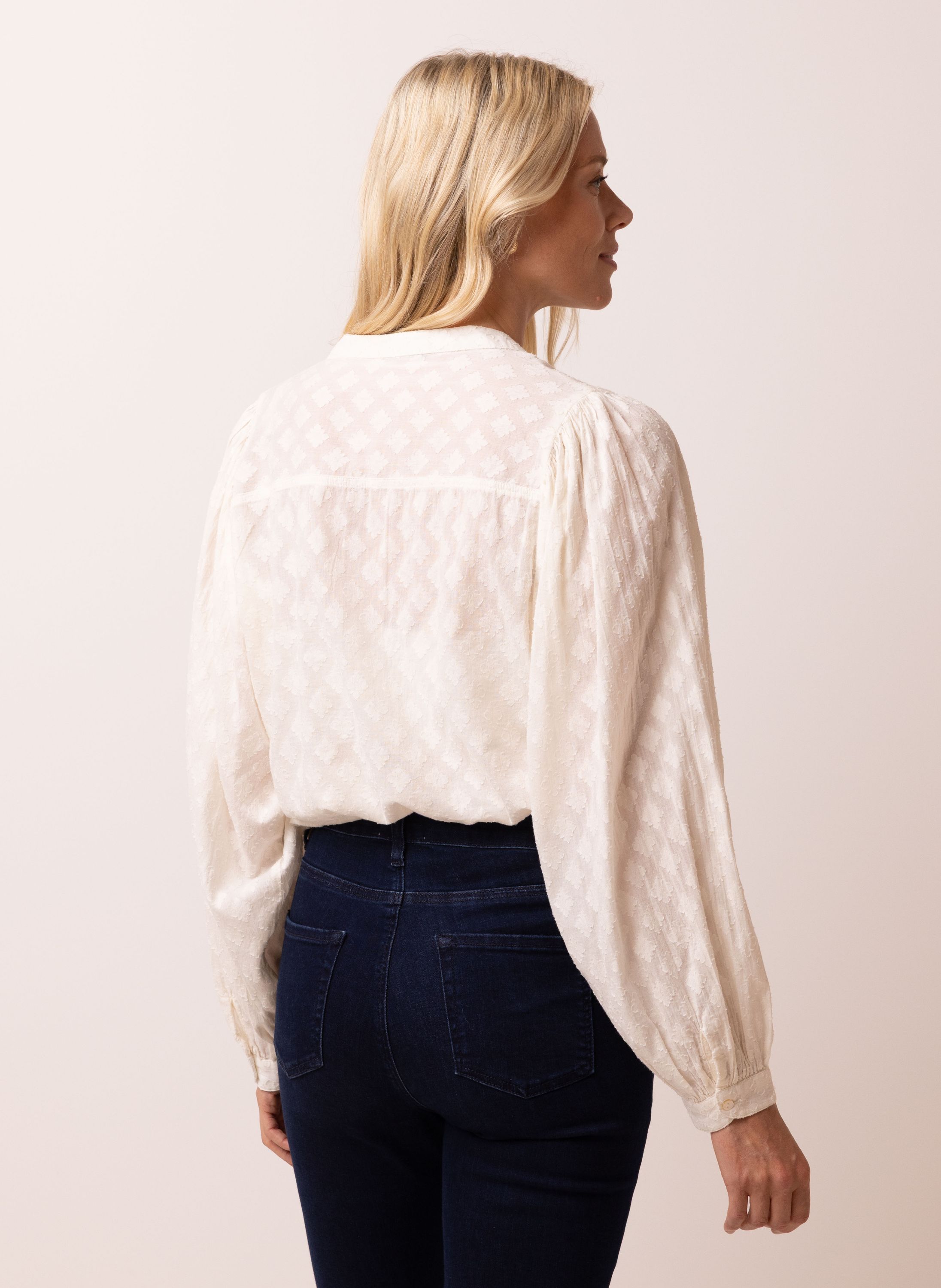 Deze katoenen blouse met V-hals heeft een knoopsluiting, lange pofmouwen en een fijne structuur. De blouse schijnt licht door. We adviseren je er een Marianne top onder te dragen.