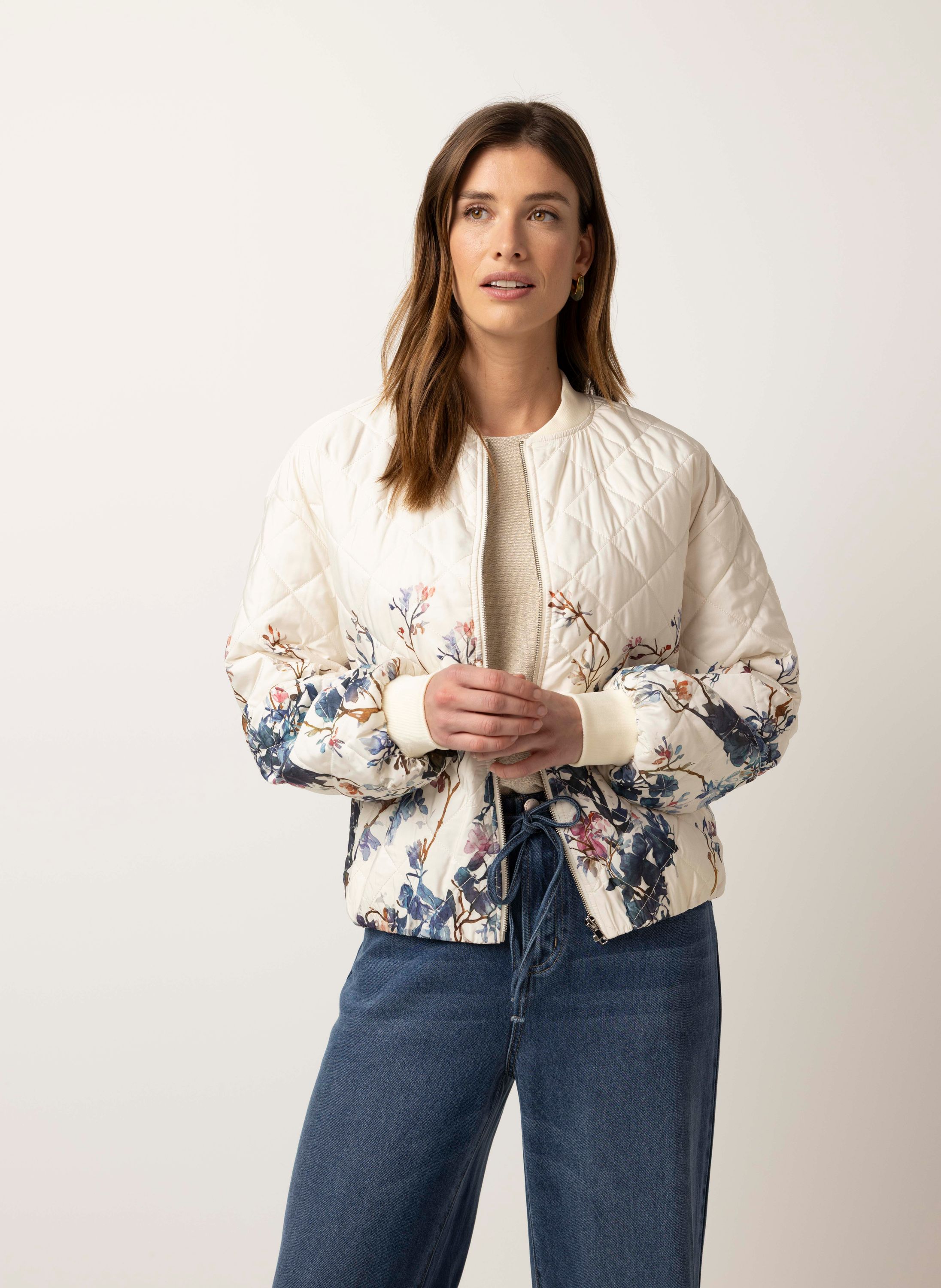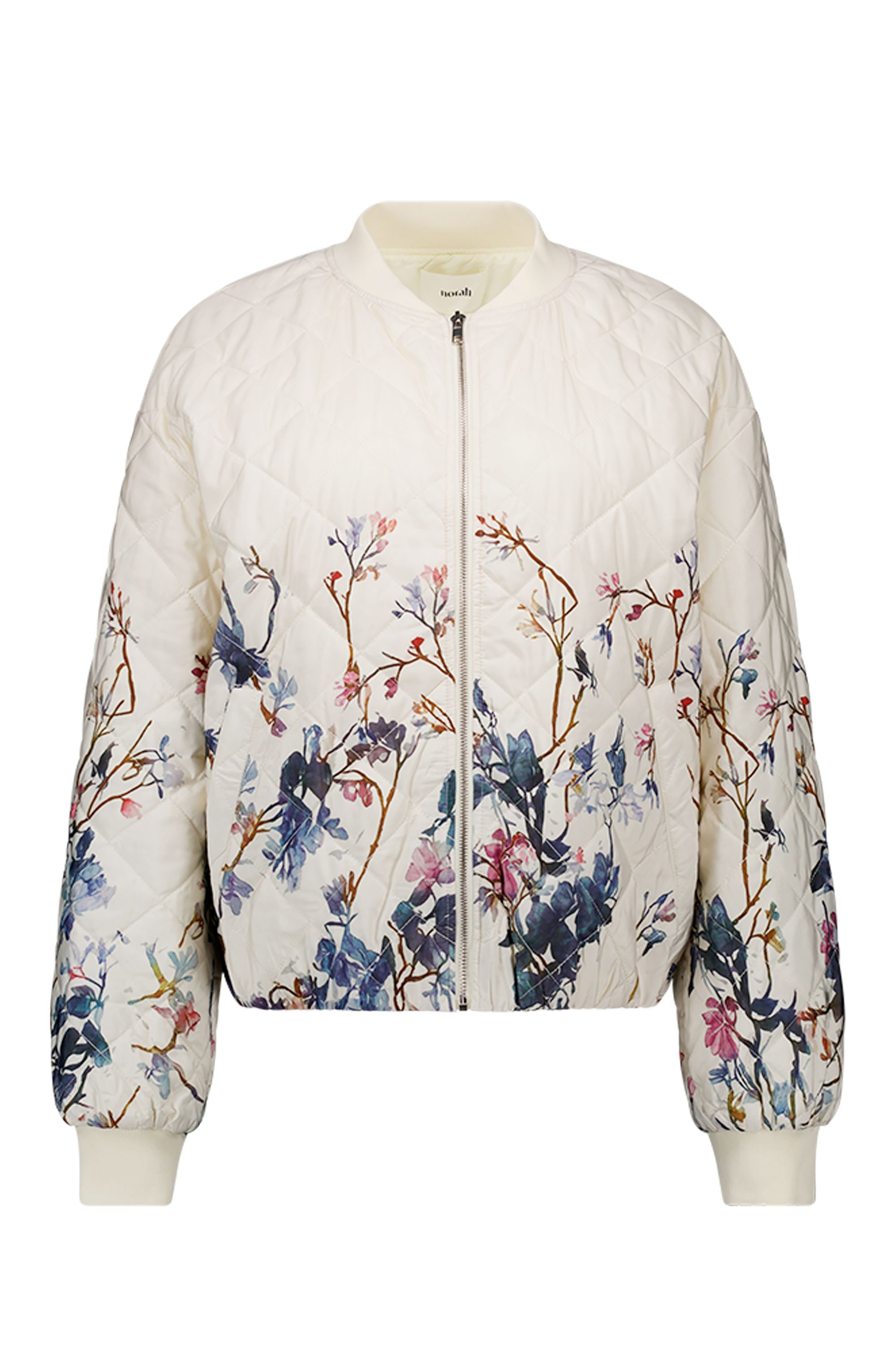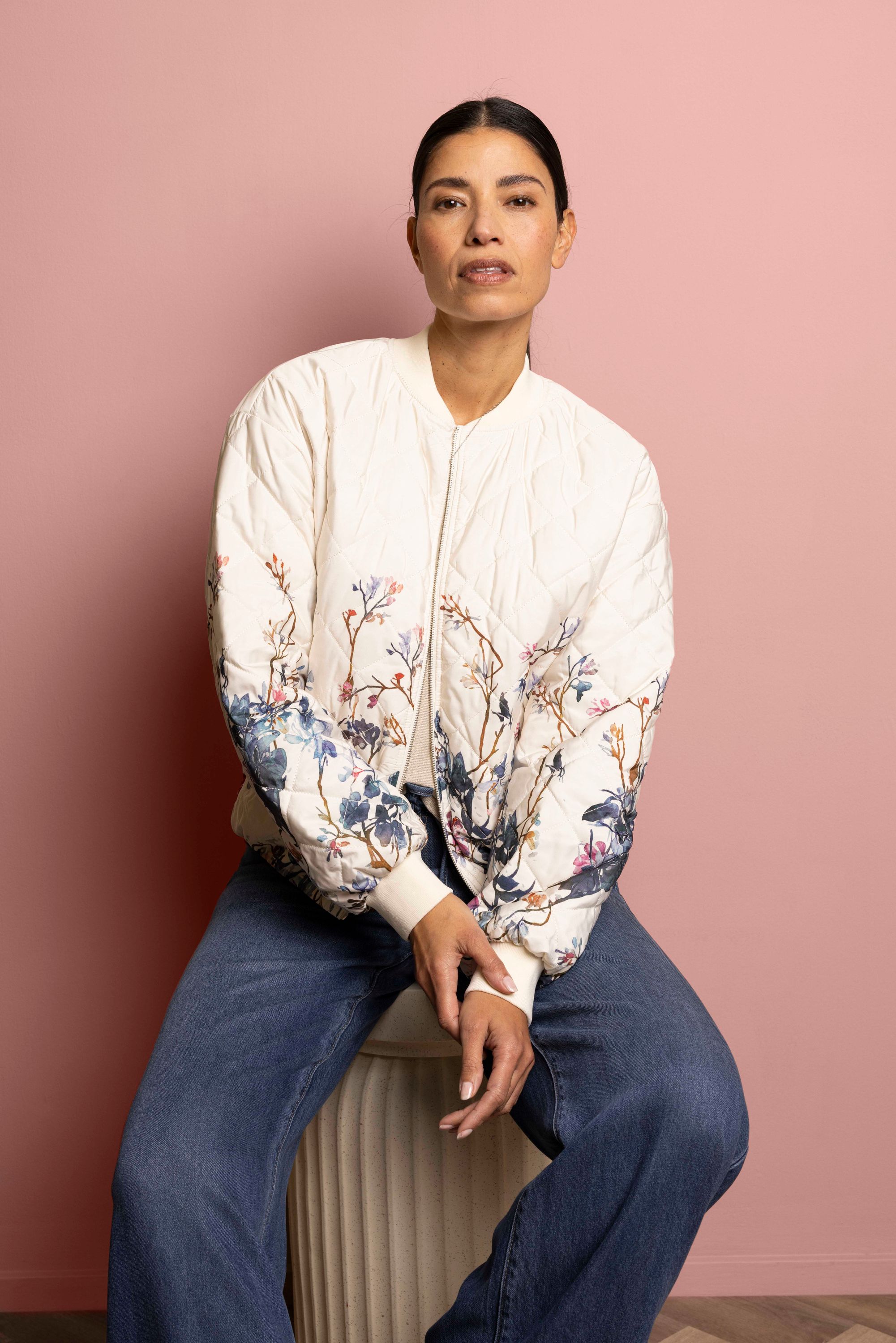 Deze bomberjas heeft een subtiele bloemenprint voor een vrouwelijke uitstraling. De ronde hals, ritssluiting, steekzakken en boorden aan de mouwen en onderzijde zorgen voor een comfortabele pasvorm. Ideaal als stijlvol tussenjasje voor het seizoen.