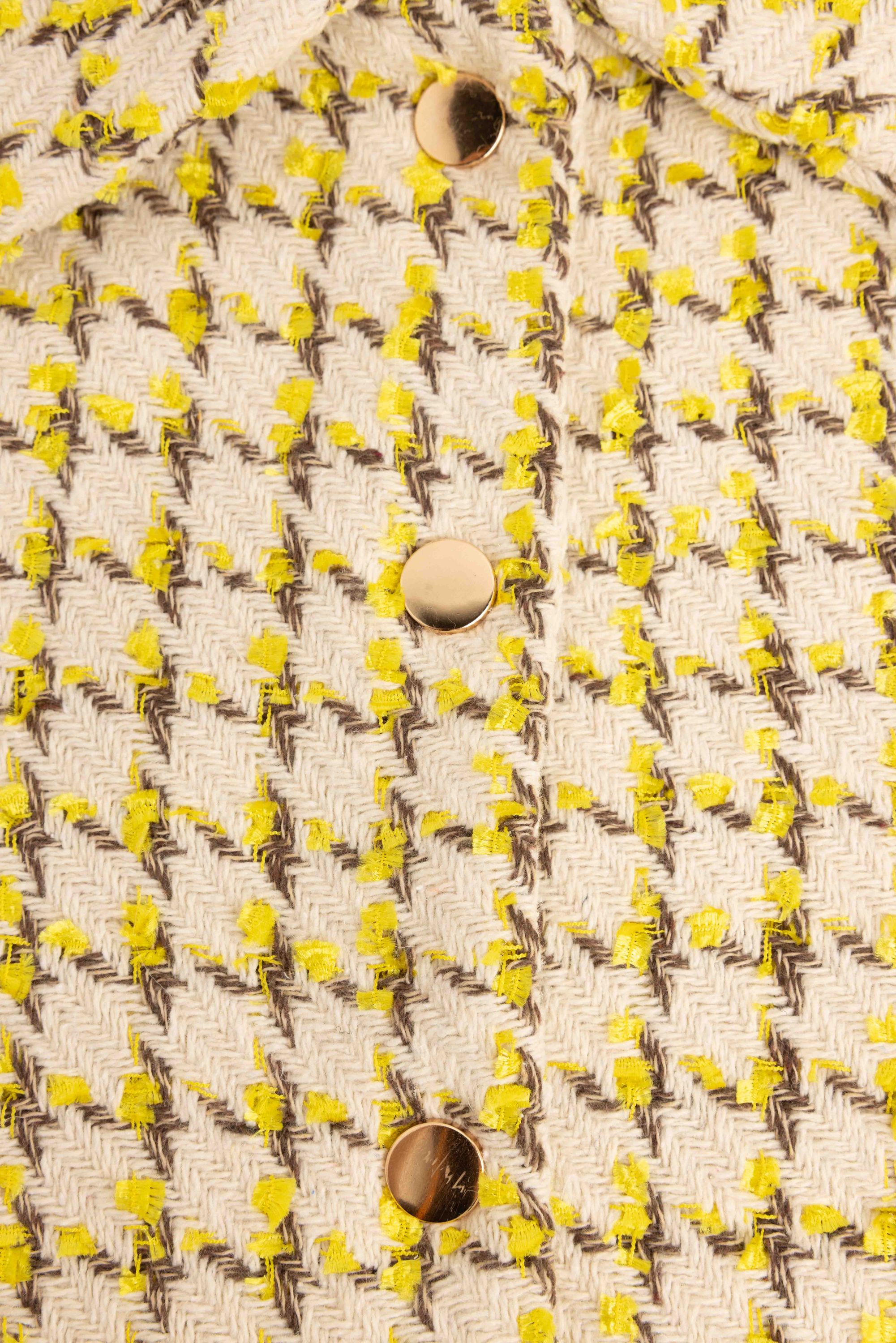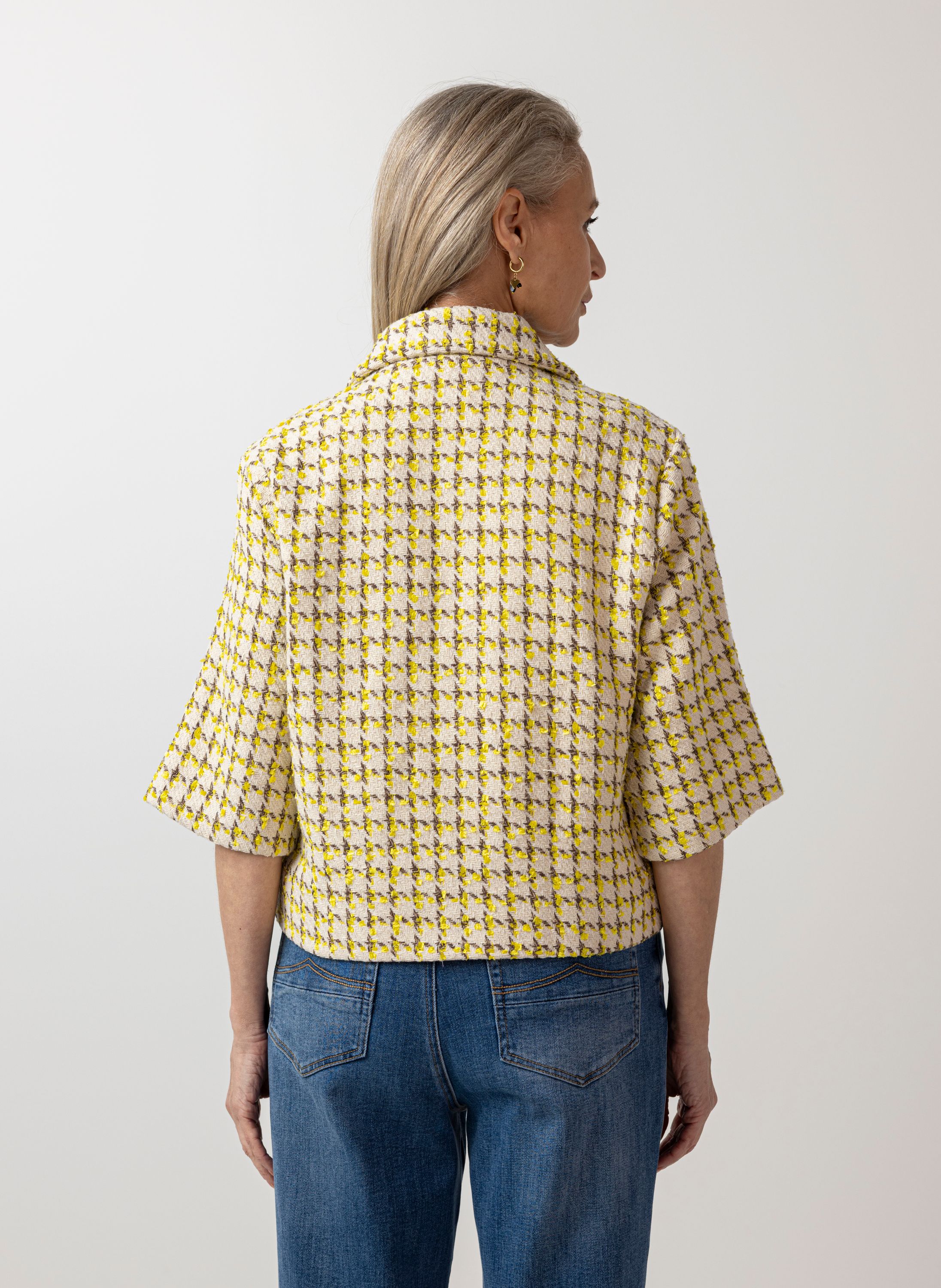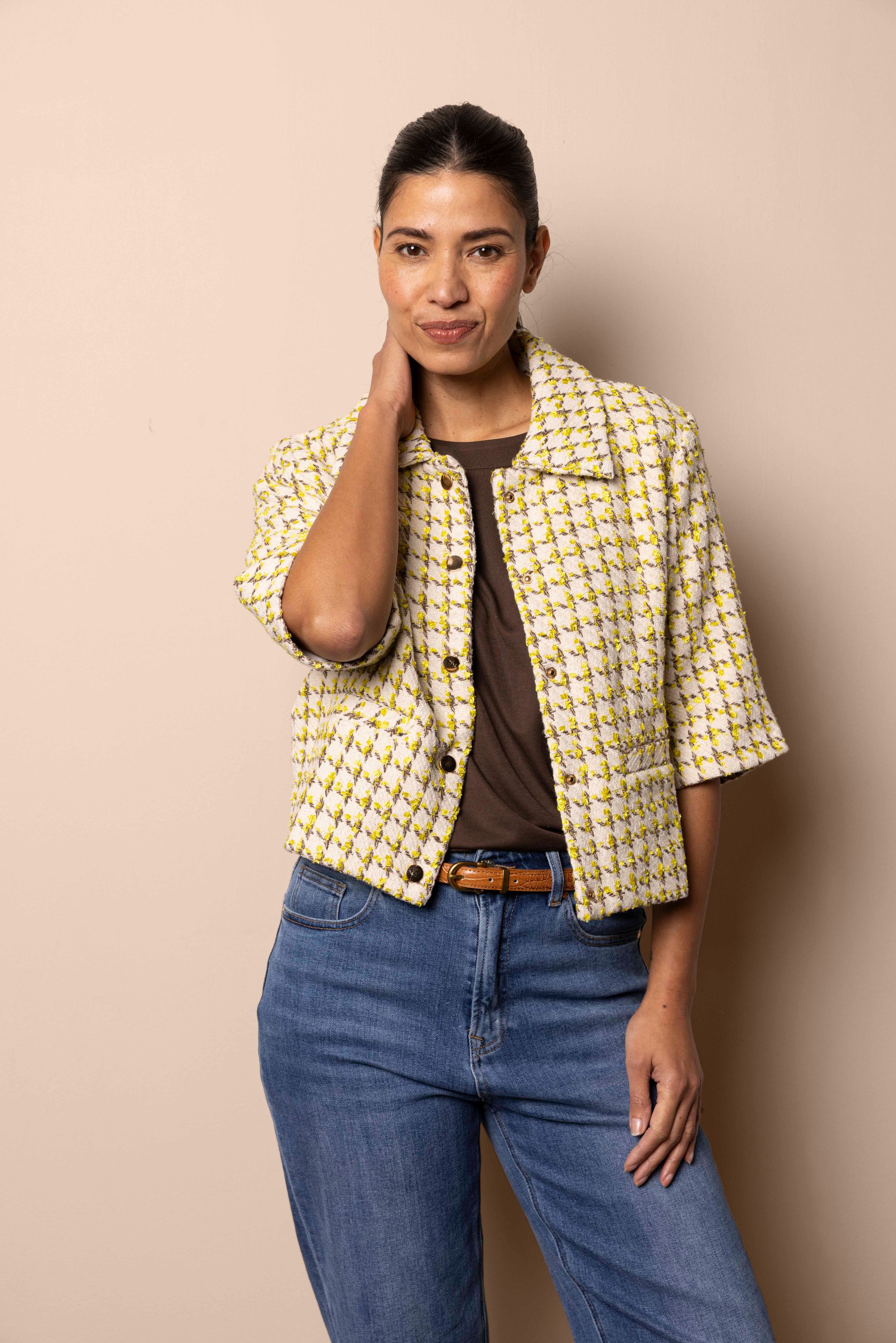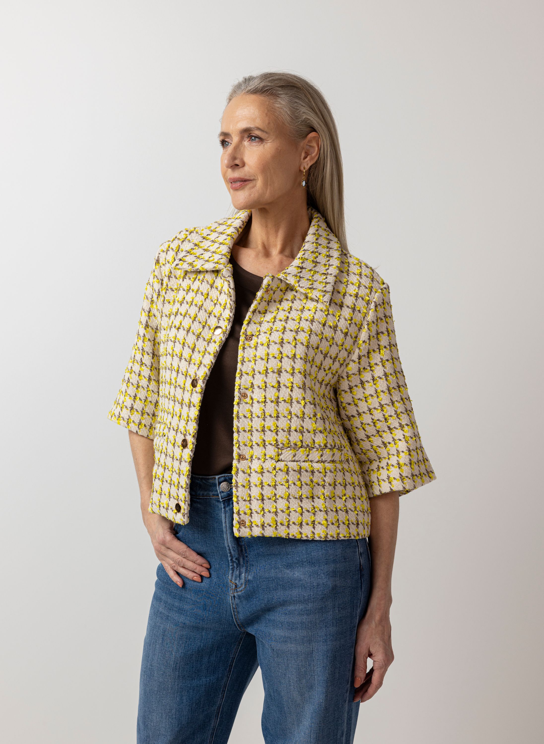 Dit jasje met klassieke kraag heeft halflange mouwen, een goudkleurige knoopsluiting en decoratieve zakken.