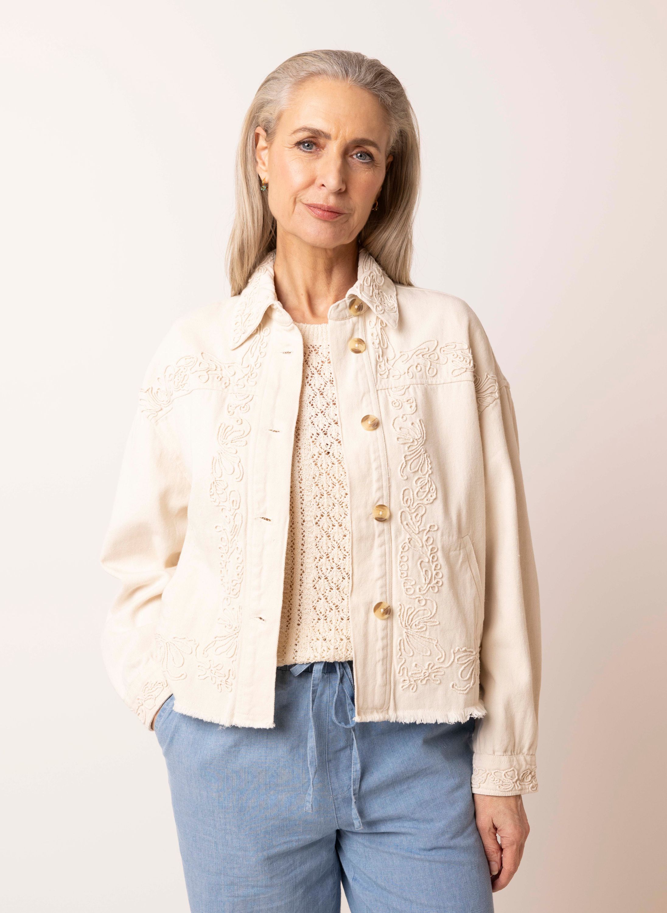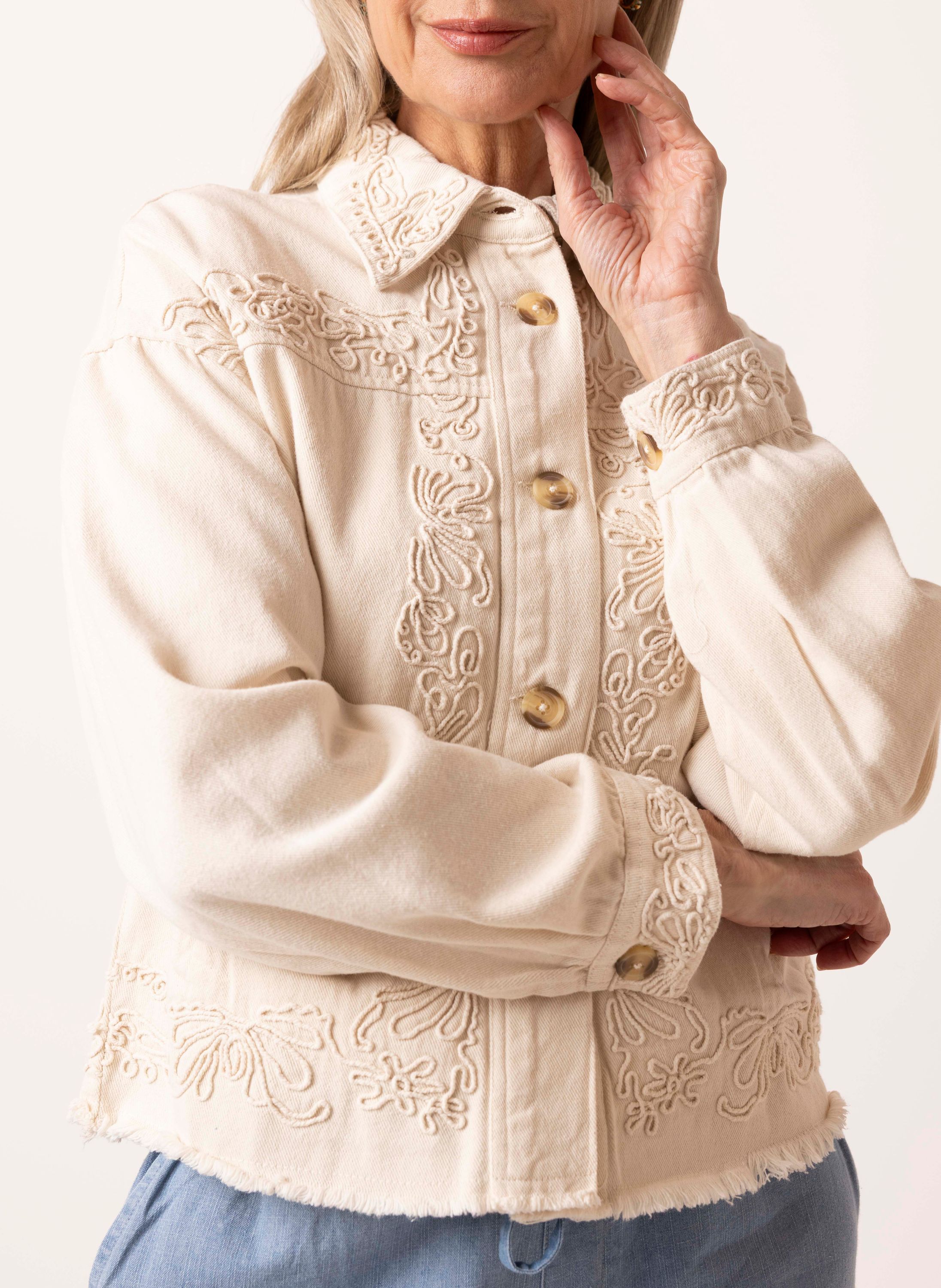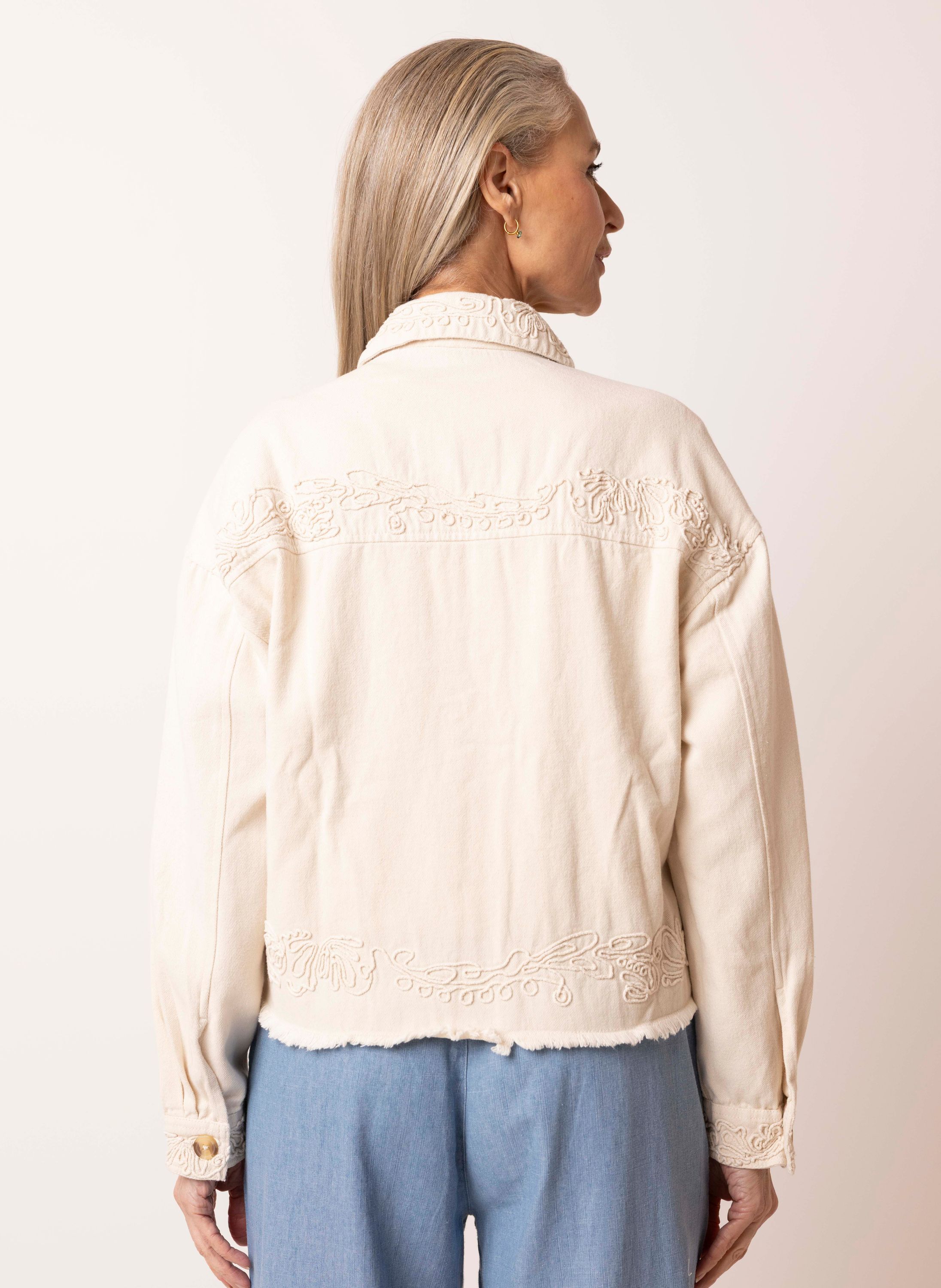 Deze denim jas met klassieke kraag, lange mouwen, knoopsluiting, borduursels en rafelrand aan de onderzijde heeft een stoere uitstraling.